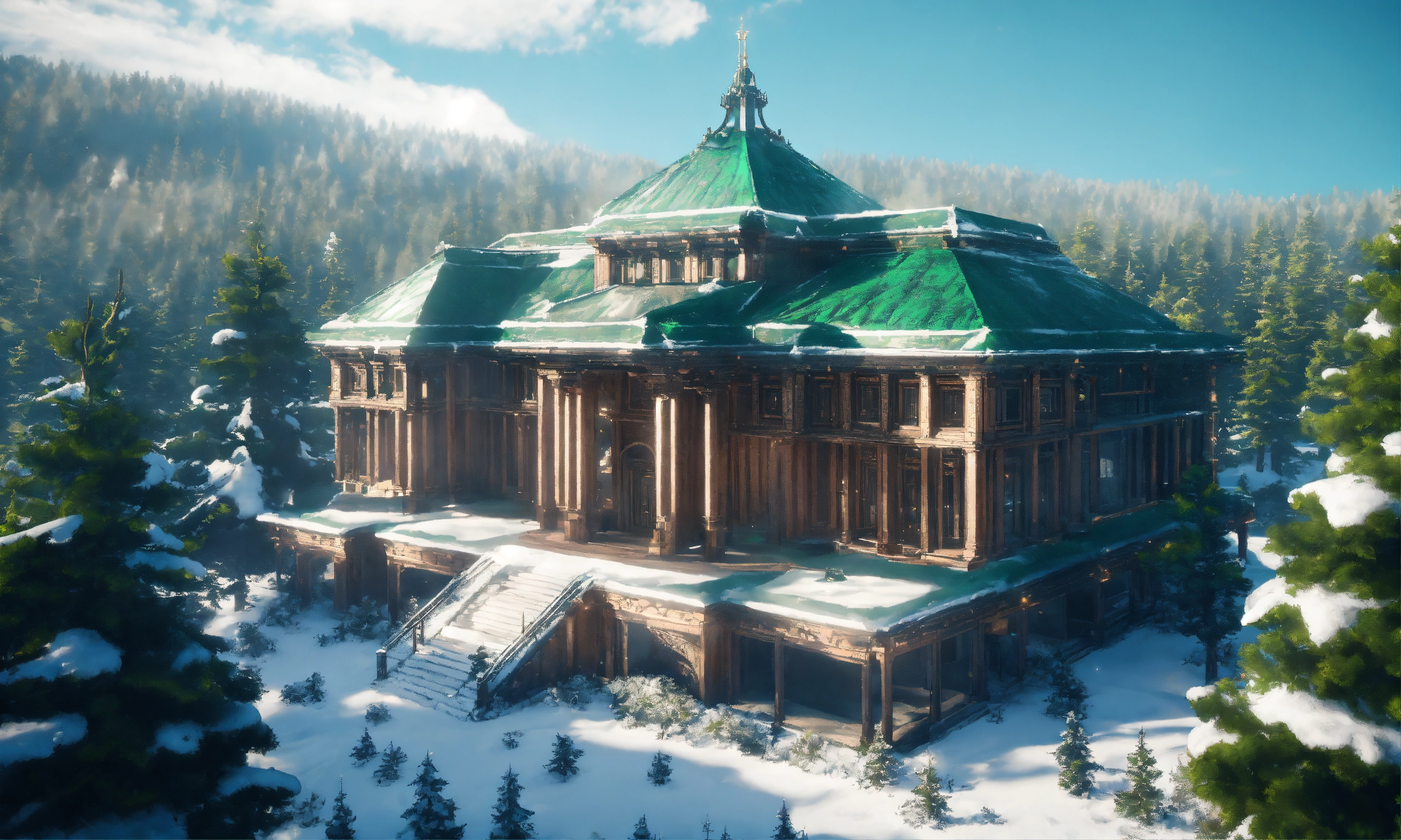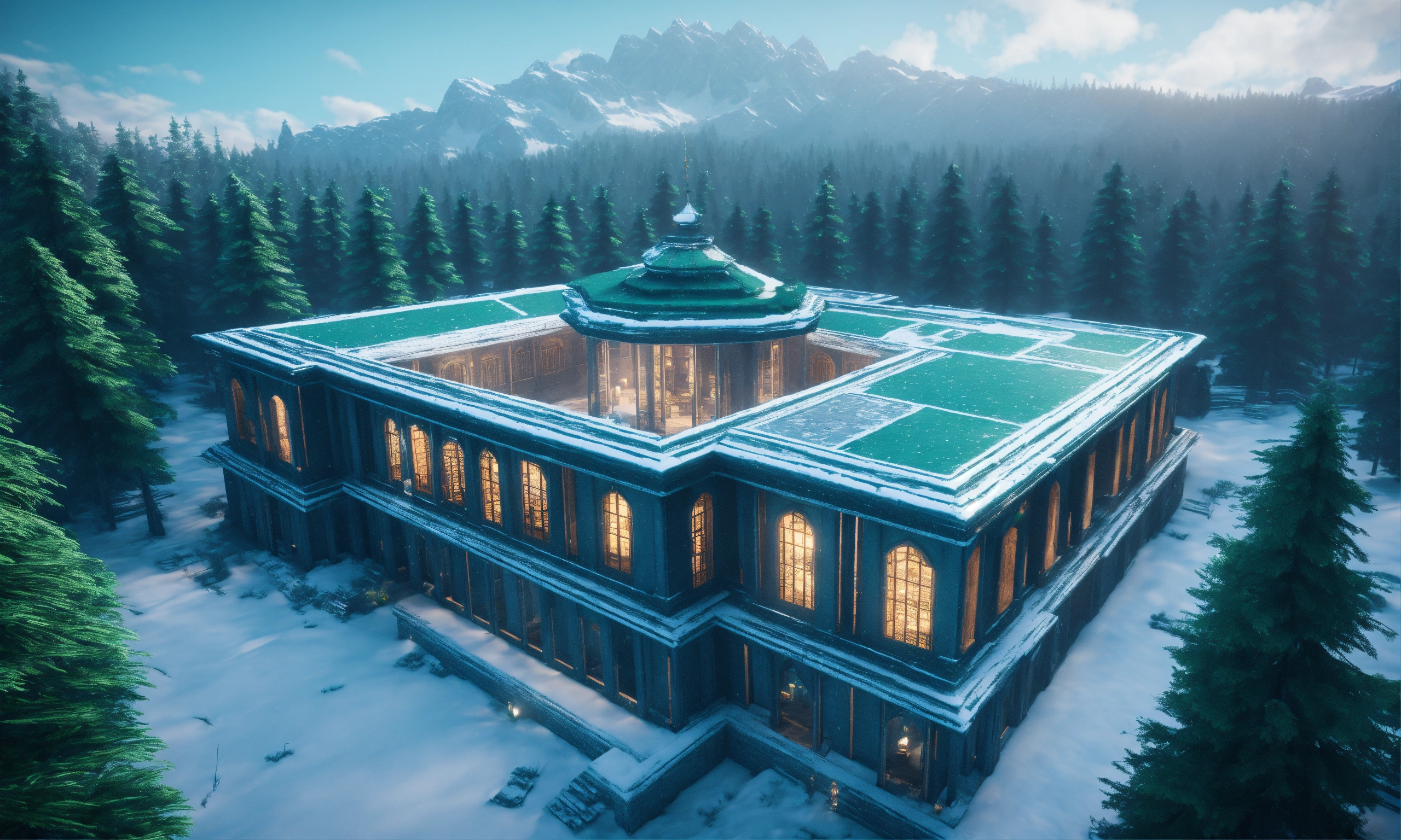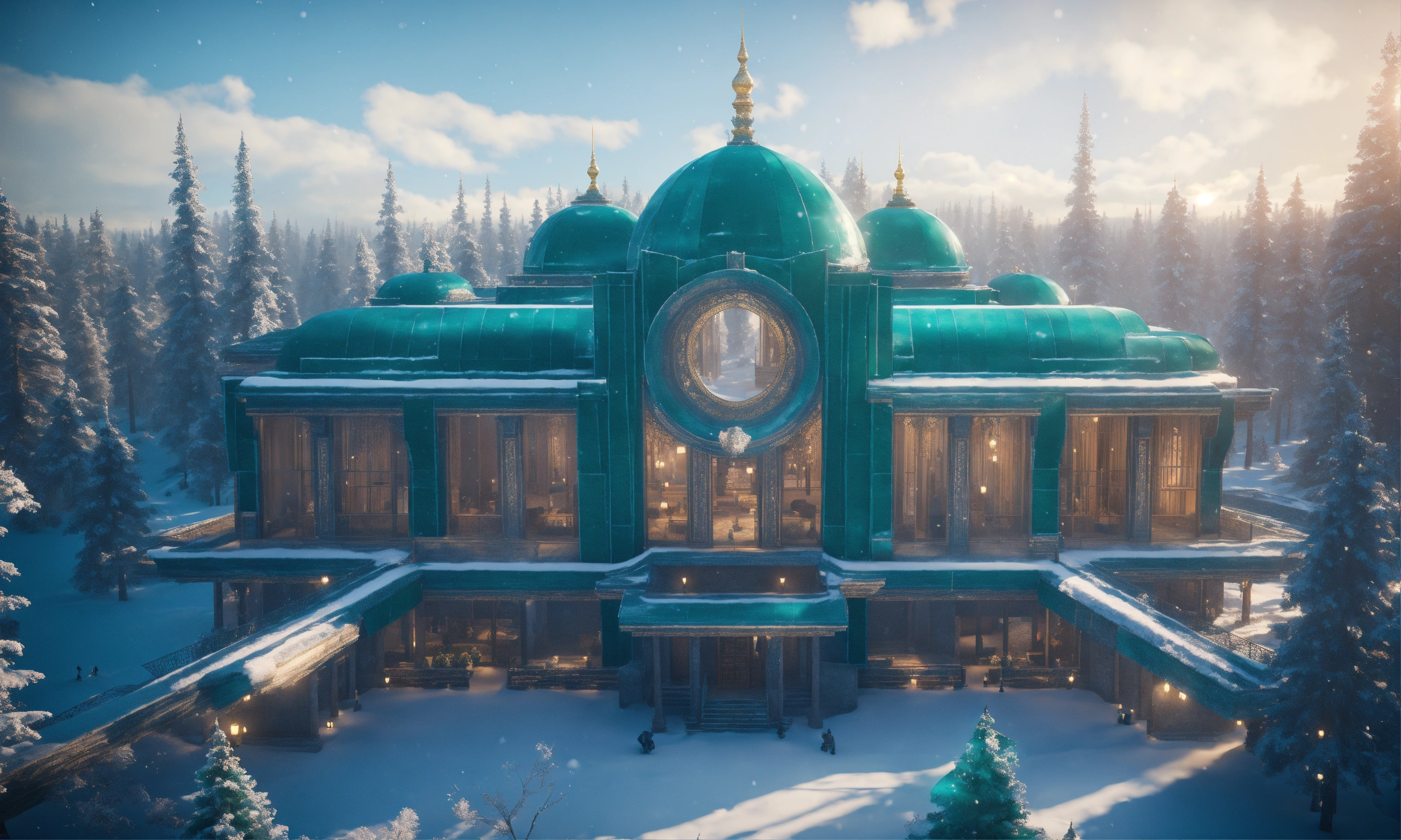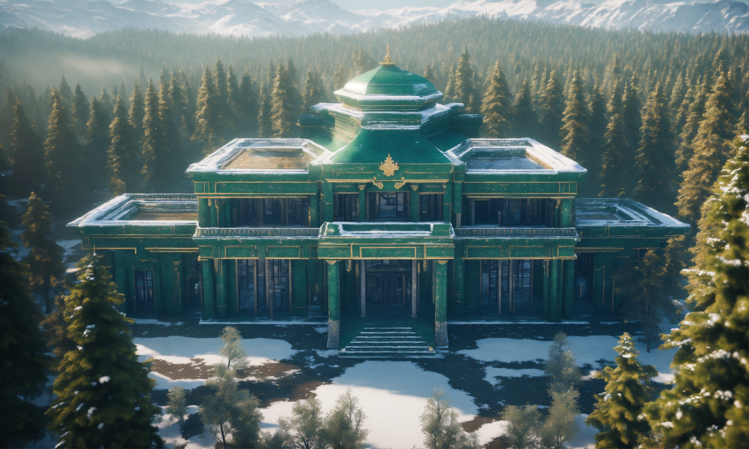 Overhead view of a jade royal sci fi palace in winter in a beautiful pine forest, symmetrical building, russian architecture, 8k, unreal engine