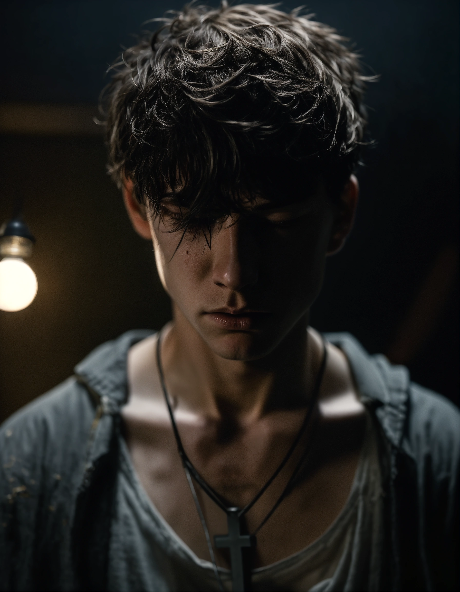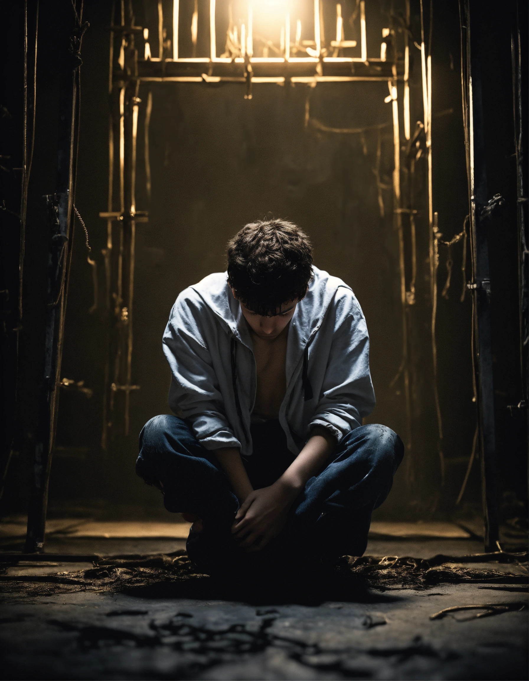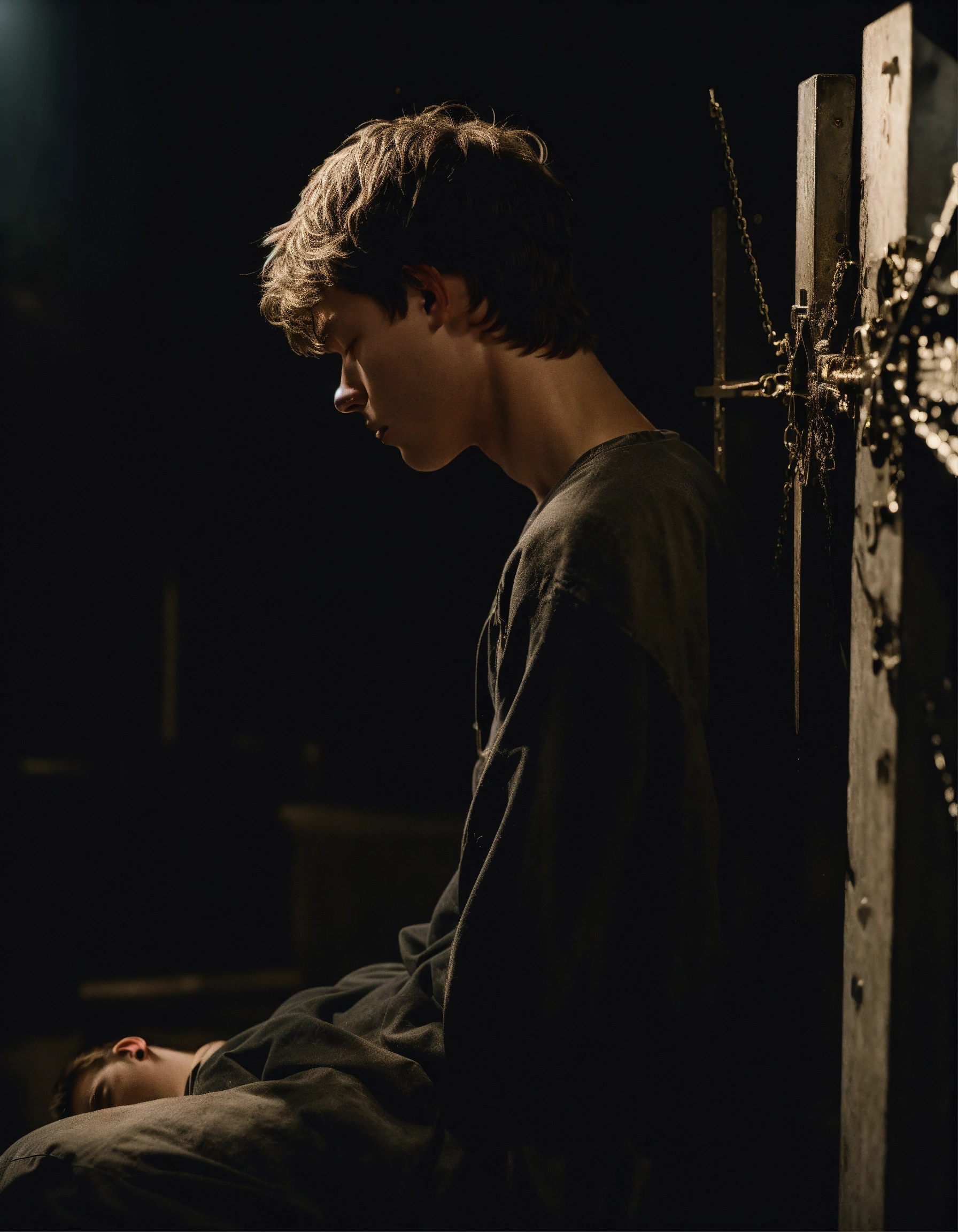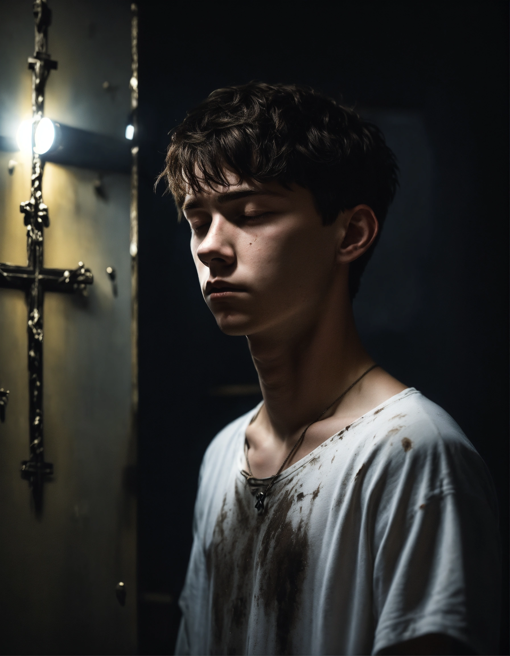 A realistic photograph of a white 18-year-old boy, with his head down, with a depressed expression, black messy short hair, with his head down, crucified on a metal x, in a very dark room, white illumination, hyperdetailed, hyperrealistic, 8 k