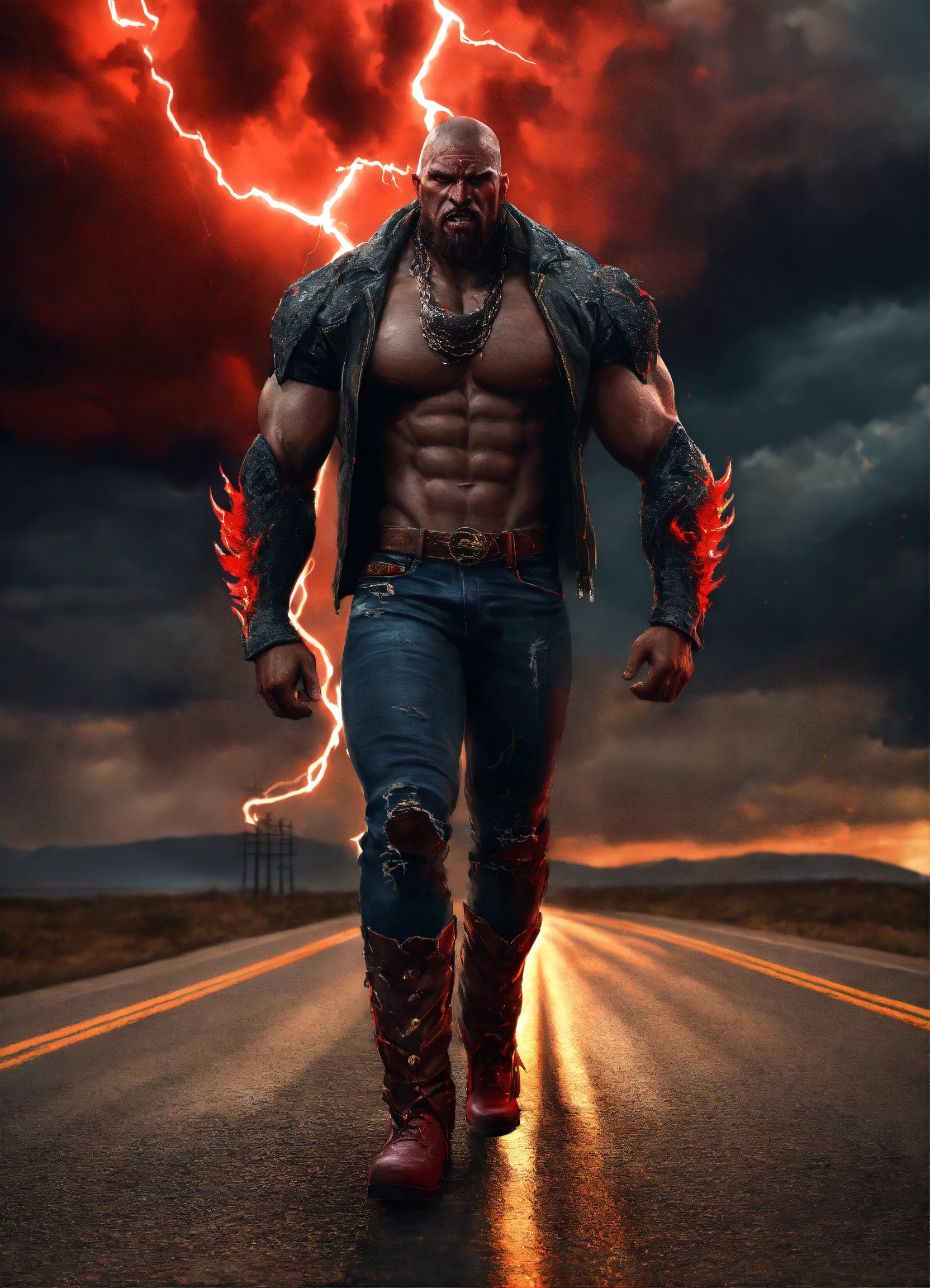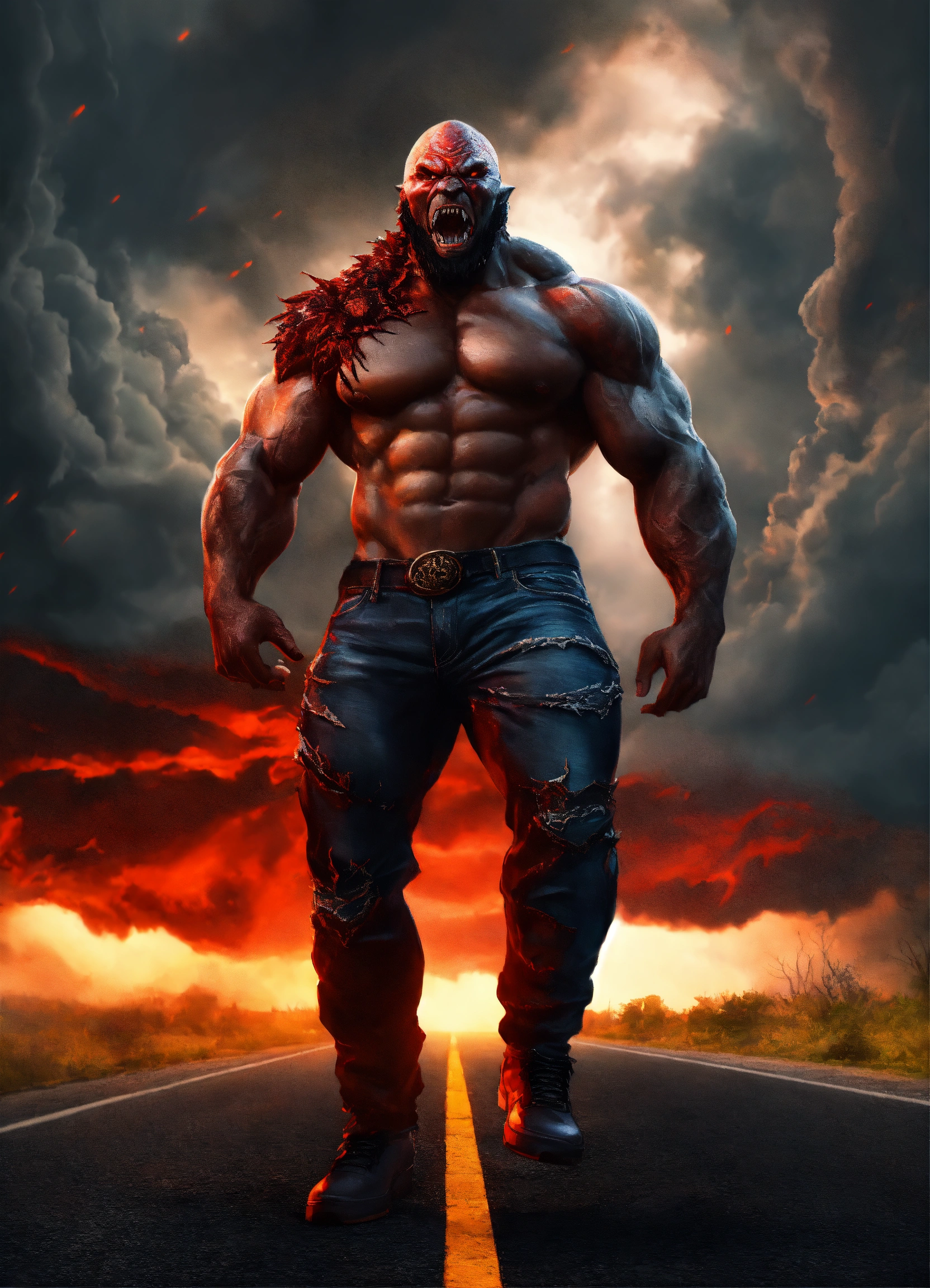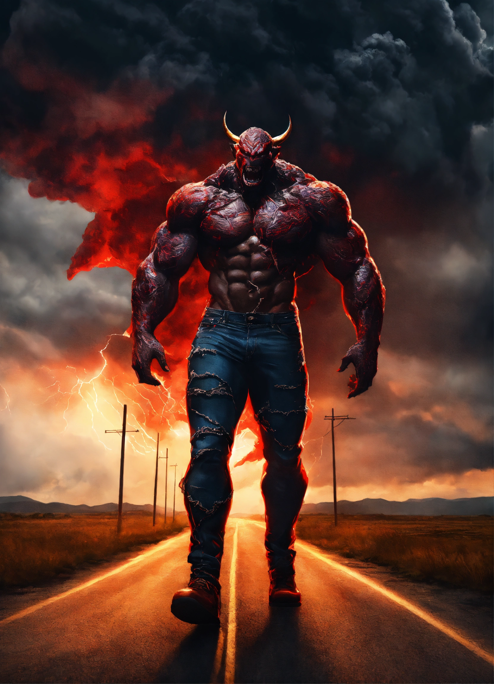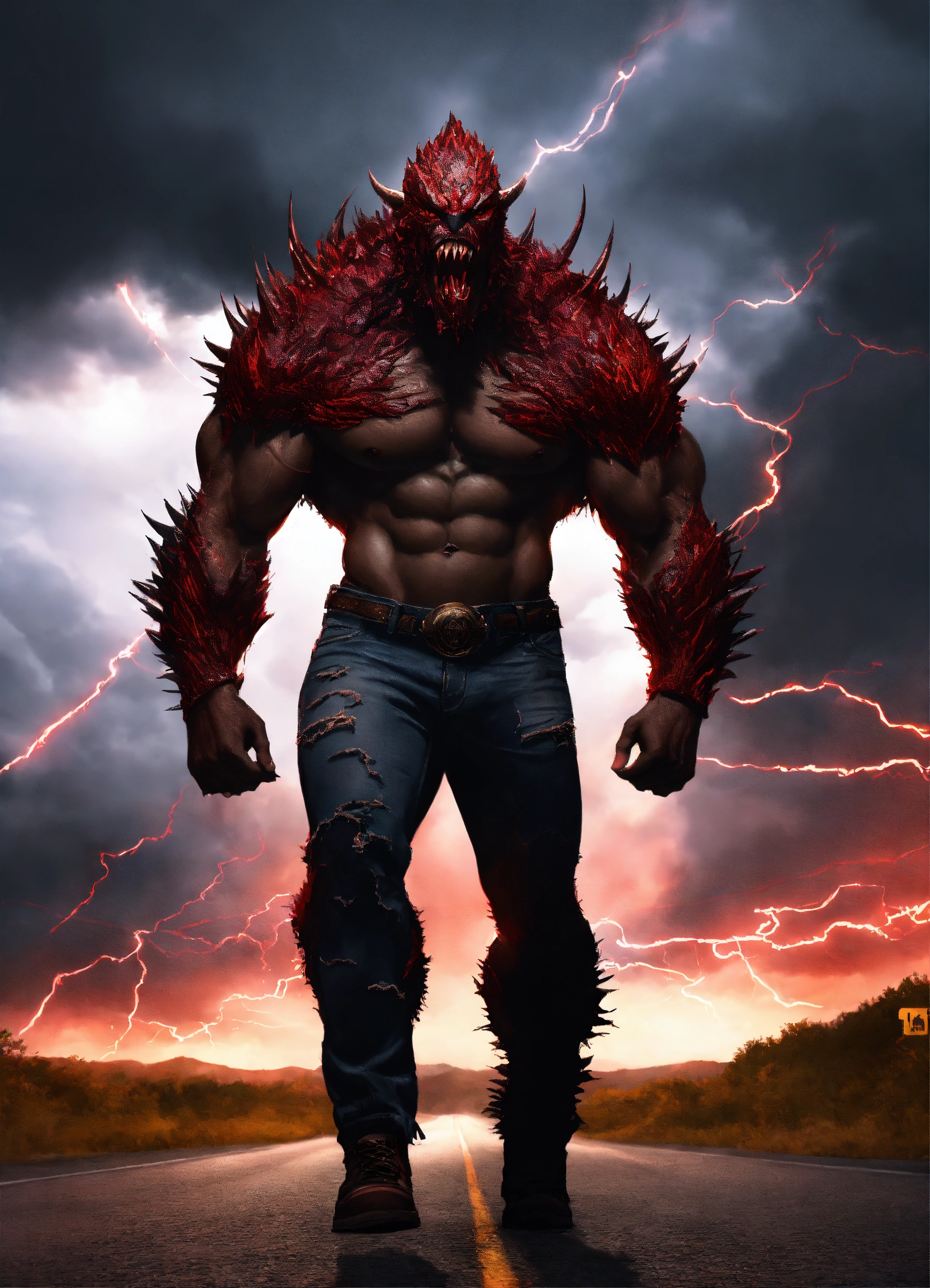 Full body eight foot evil black god monster, male god, big strong muscular scaly skin jagged teeth dangerous, clothed in a jeans walking down a lonely road with red lightning and dark clouds behind her, high detail, realistic photo, high detail, digital painting, cinematic, stunning, hyper-realistic, sharp focus, high resolution 8k, insanely detailed