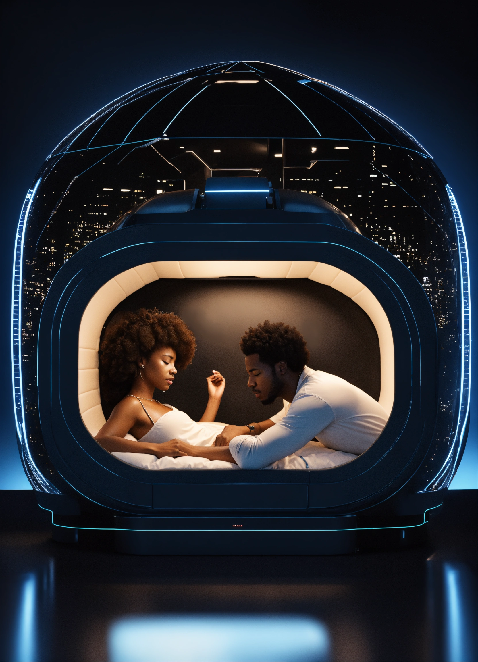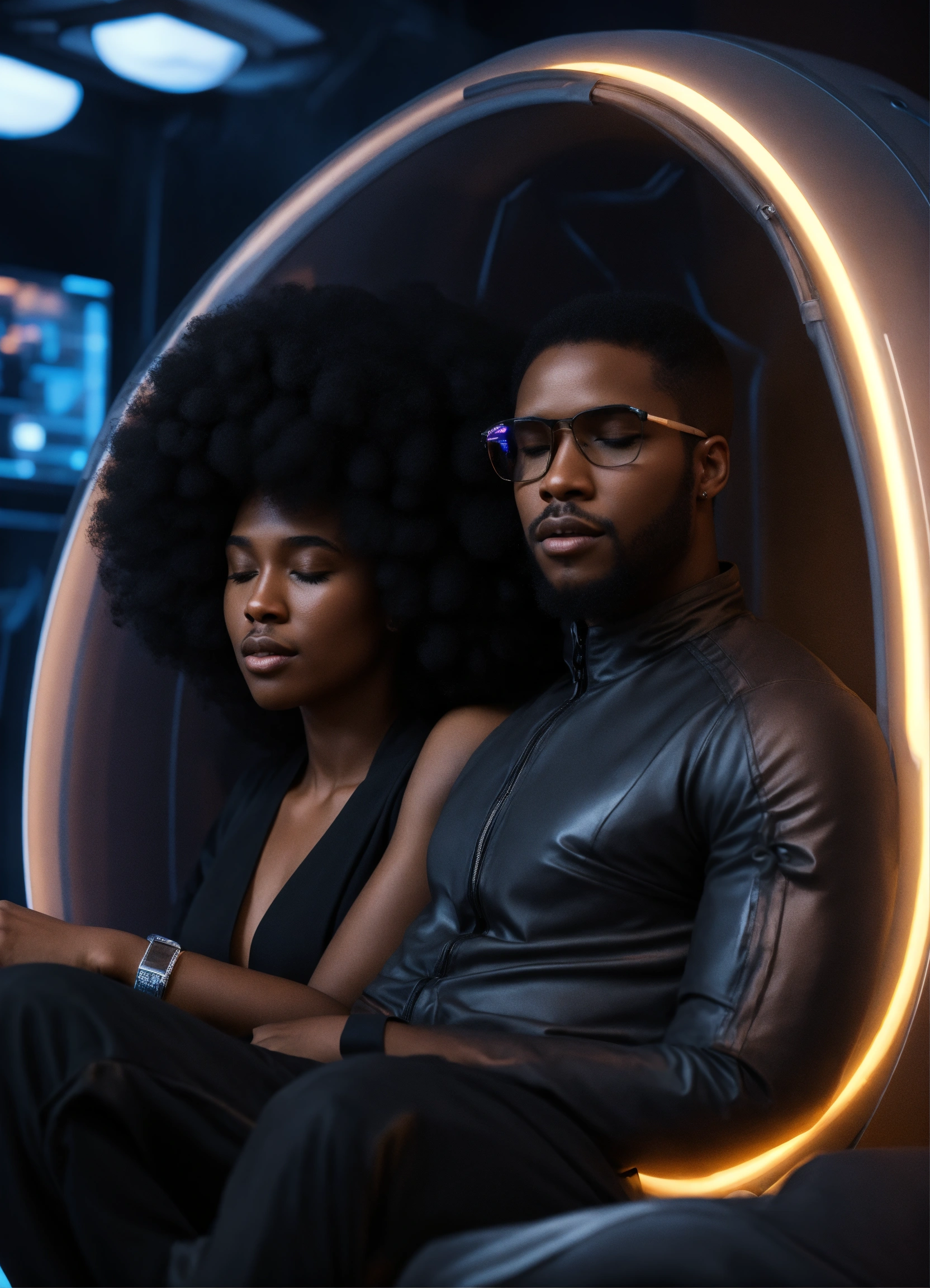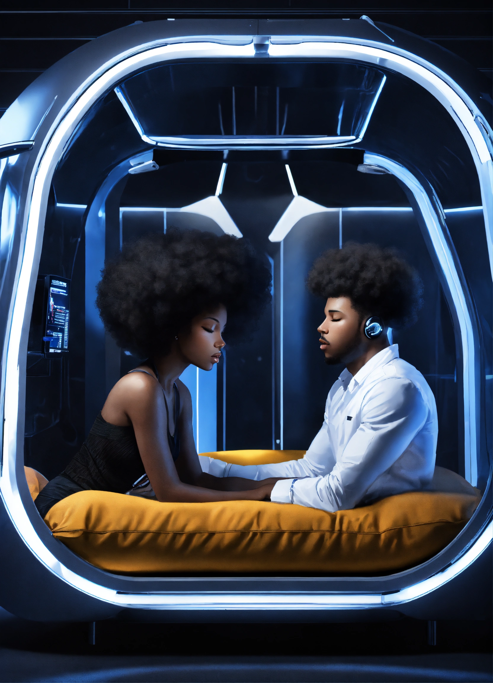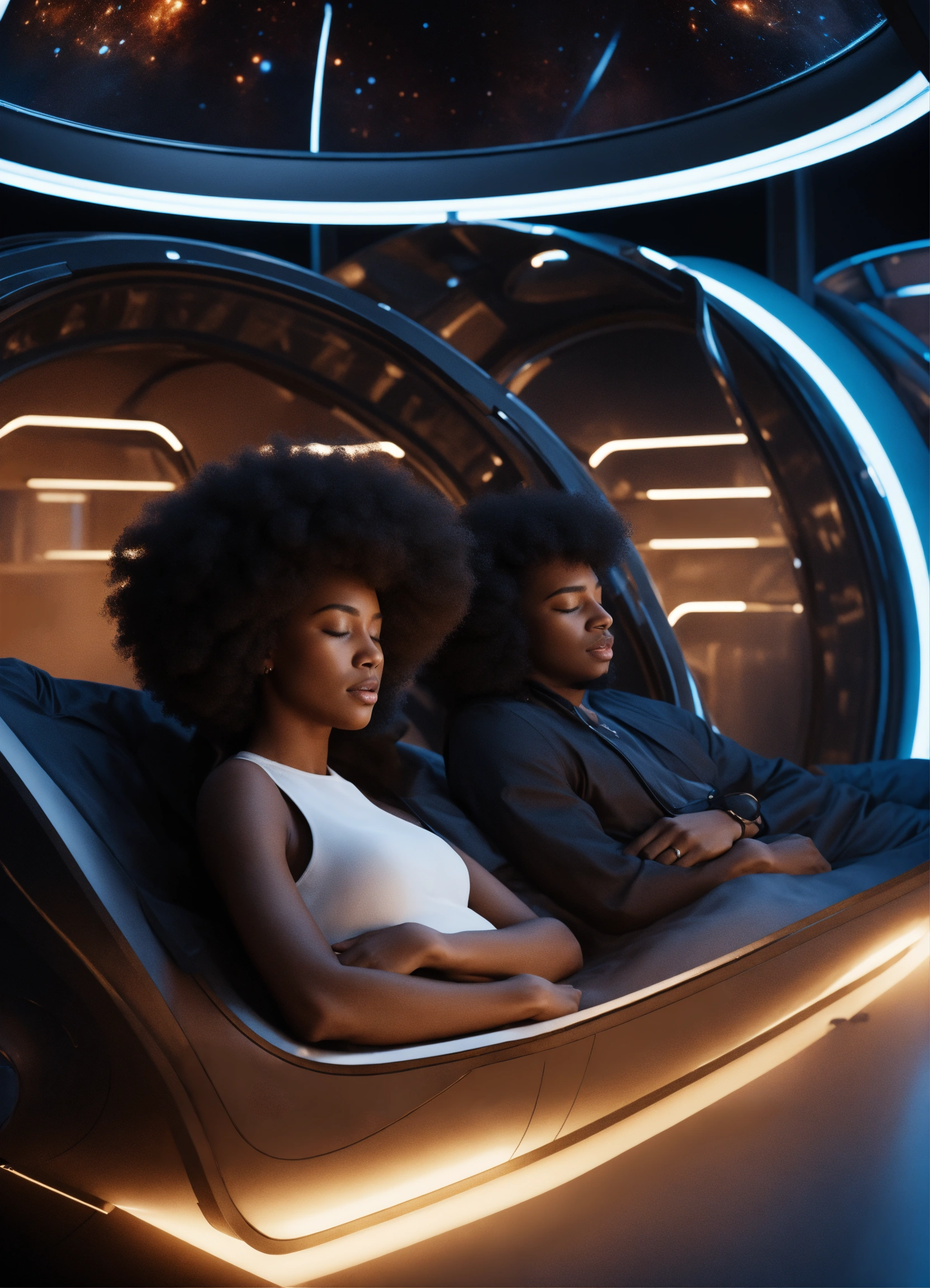 A black woman and black man with afros, sleeping inside two futuristic sleeping pods, 4k render, hyperrealistic, black background