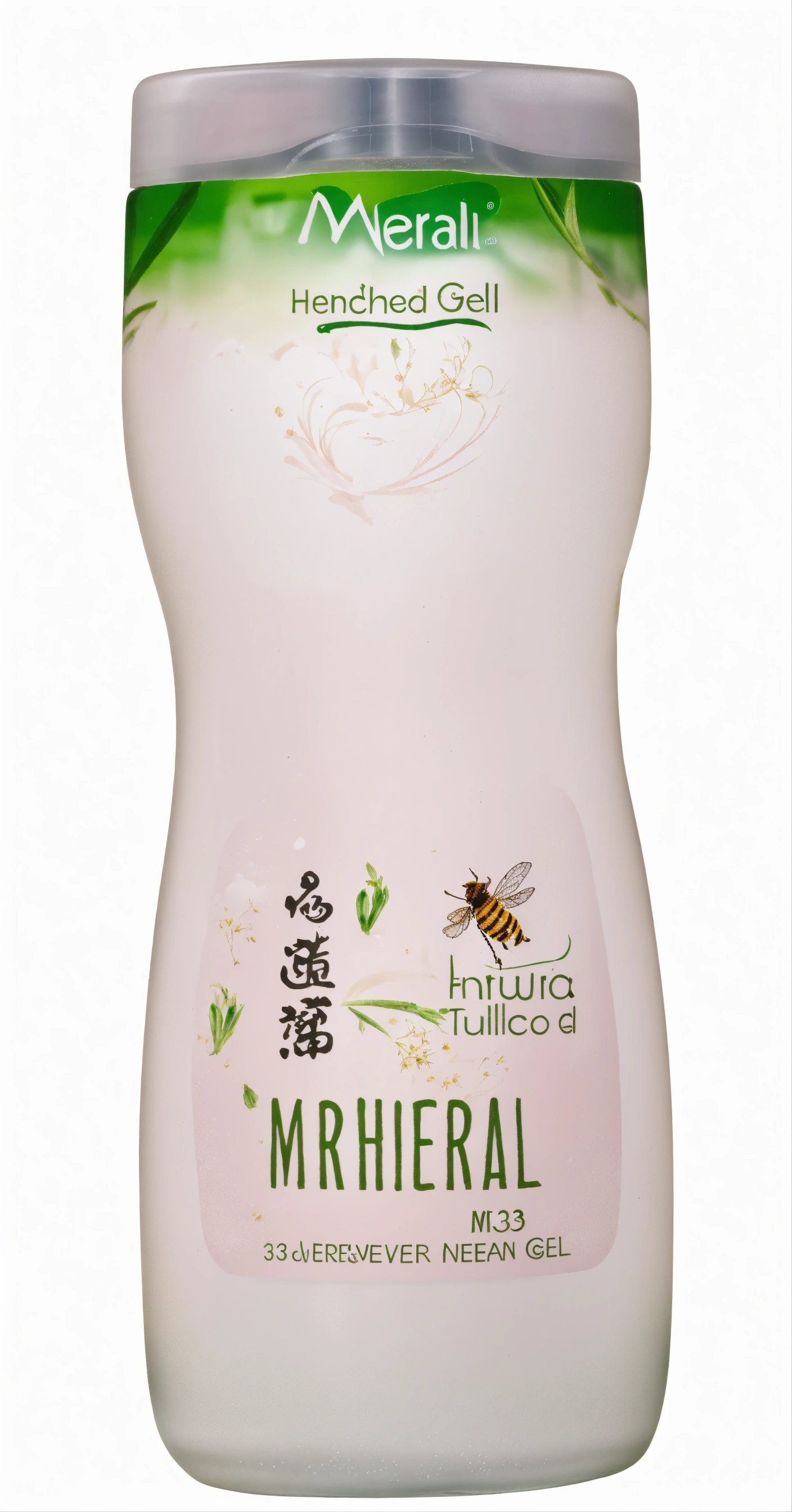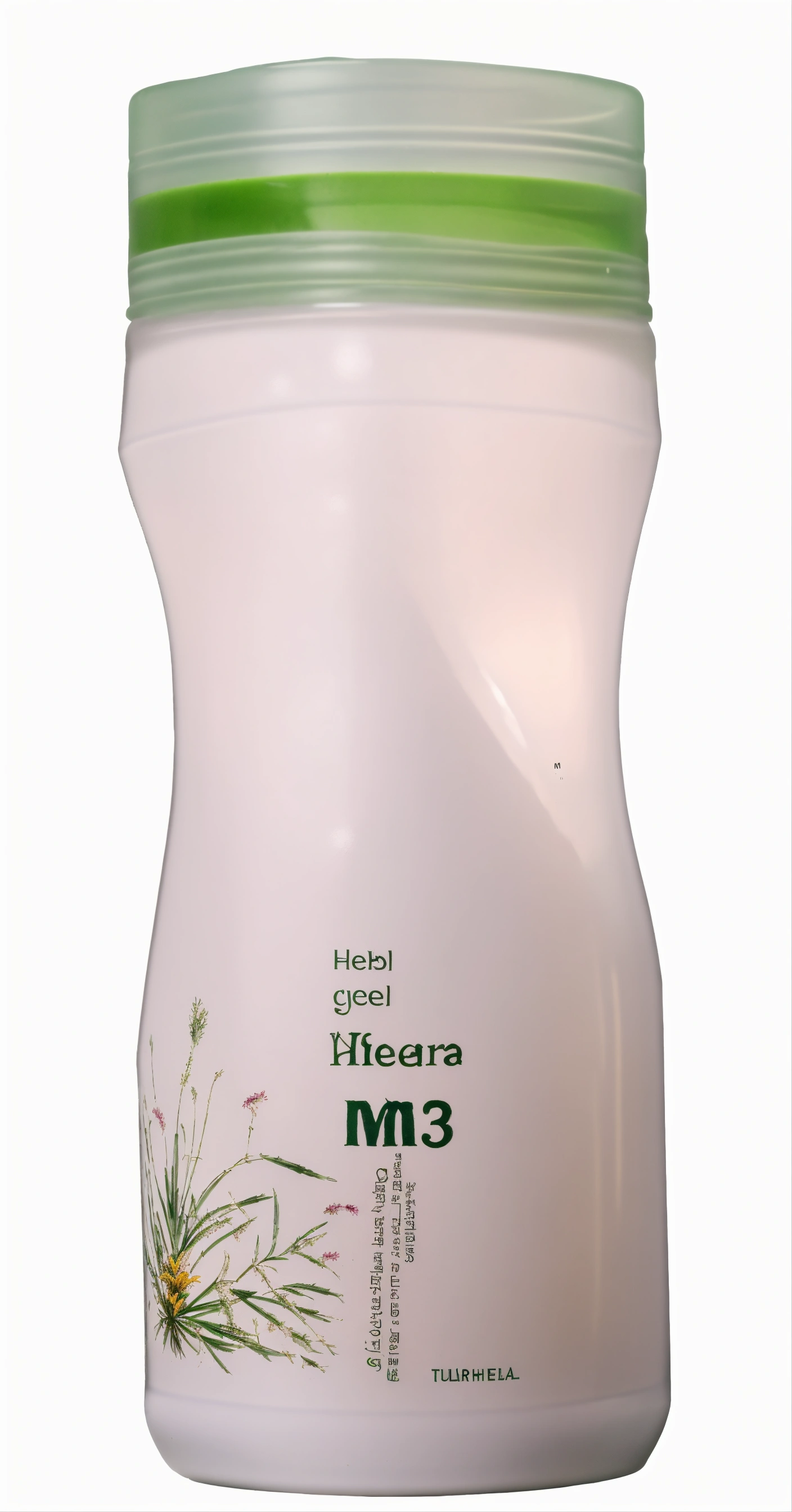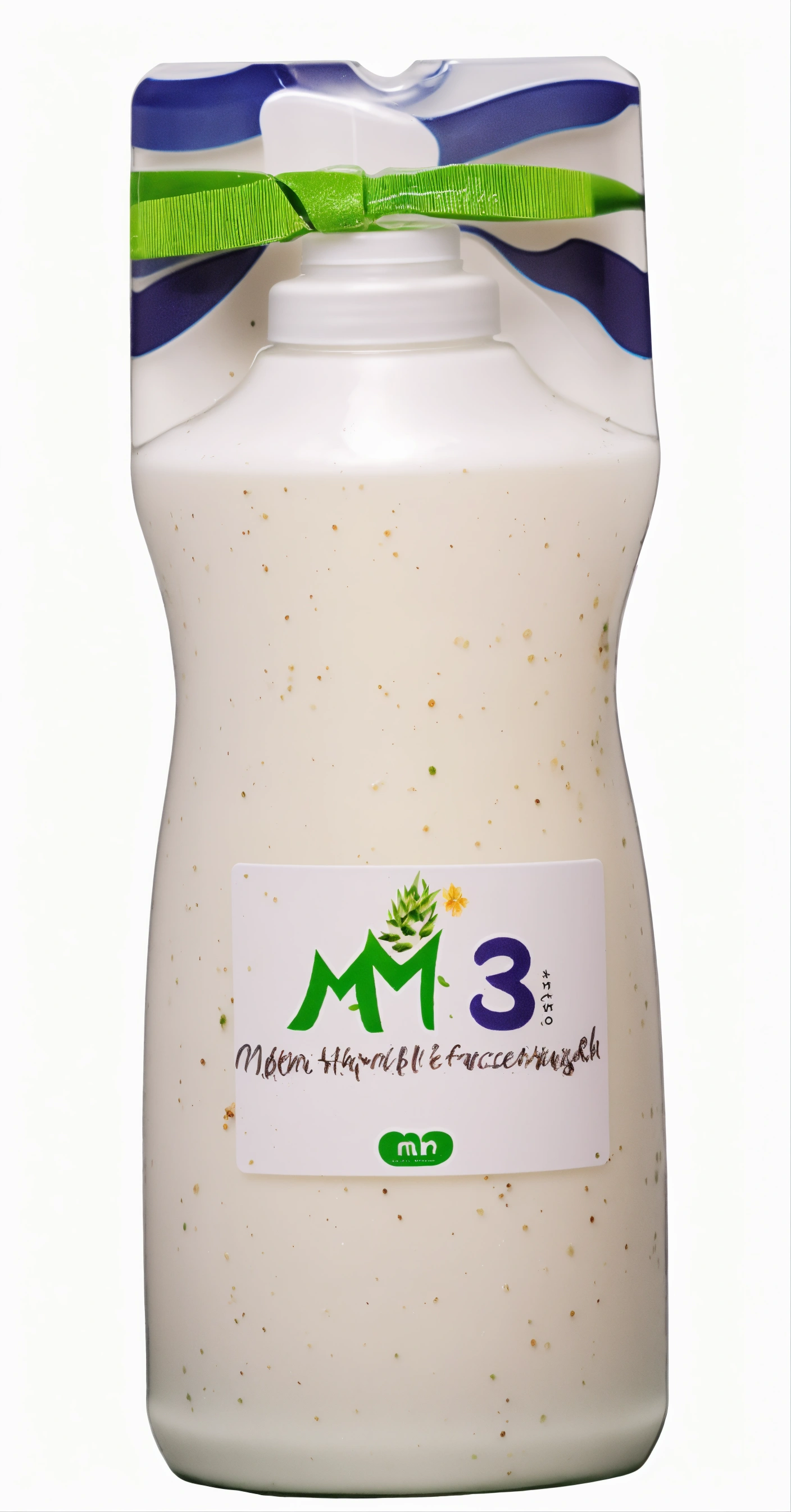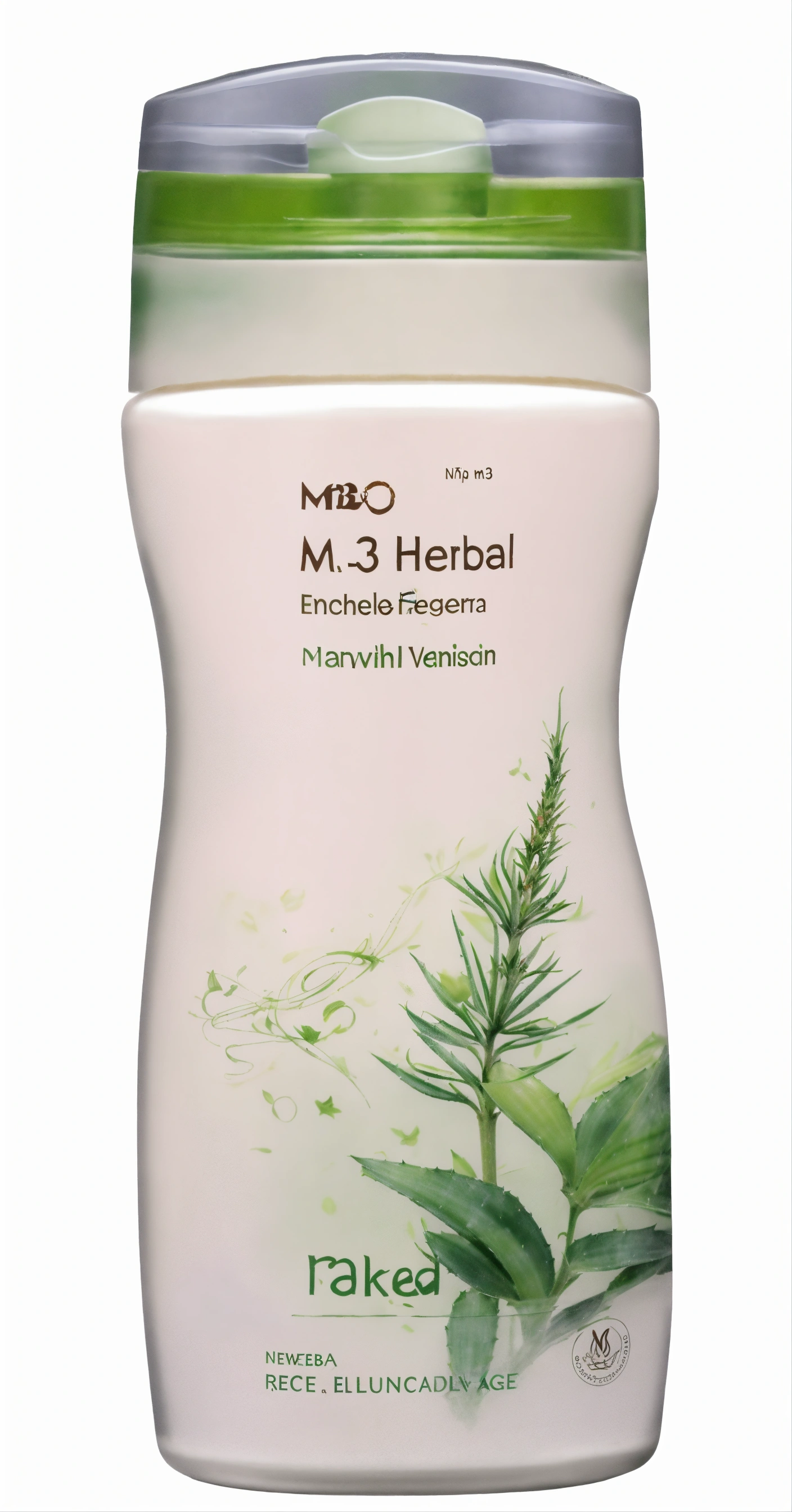 Create a label on the bottle for herbal facewash enriched with aloevera gel, rice, neam, tulsi, honey, vitamine-e, glycerin. brand name is "m3herbal" with hand-drawn illustrations.