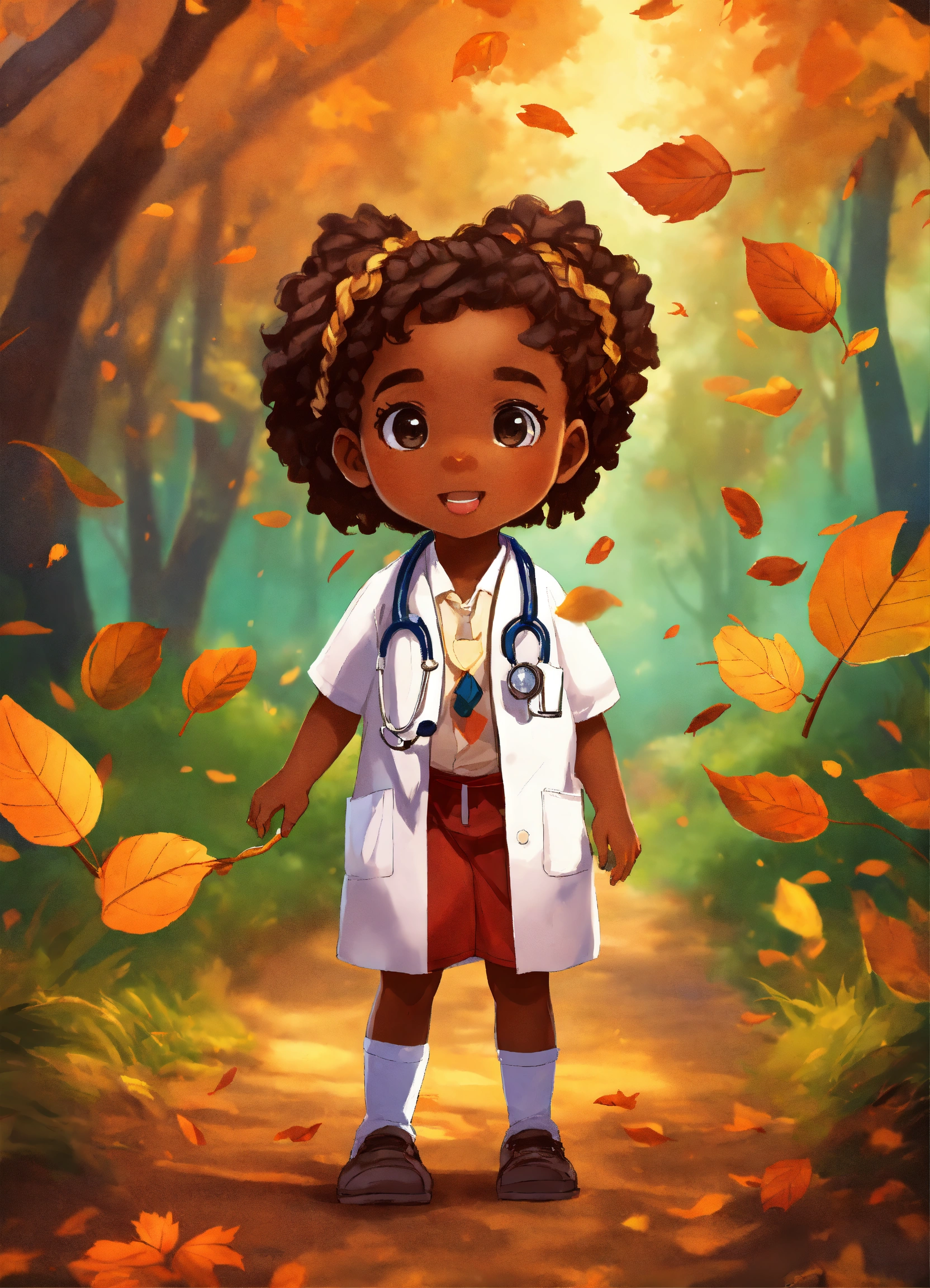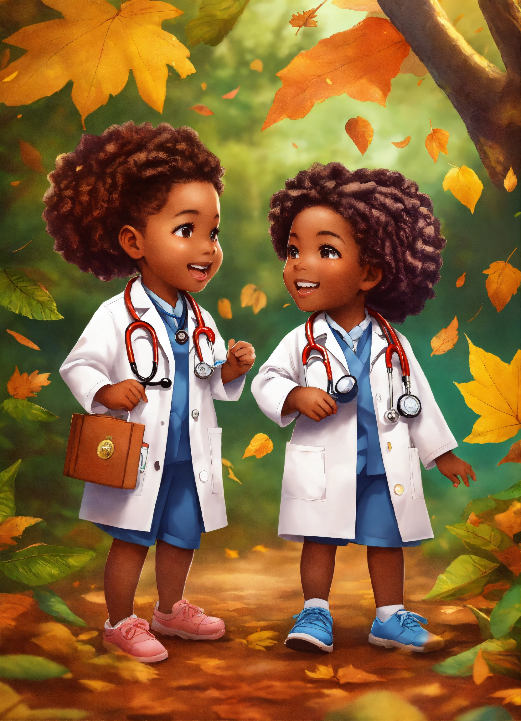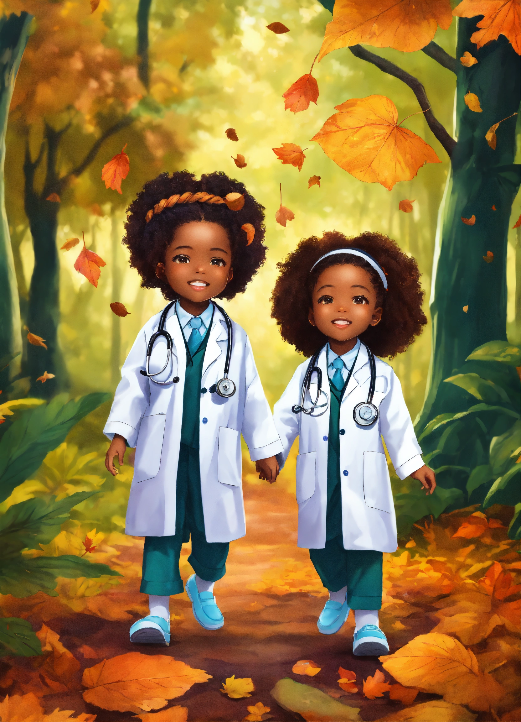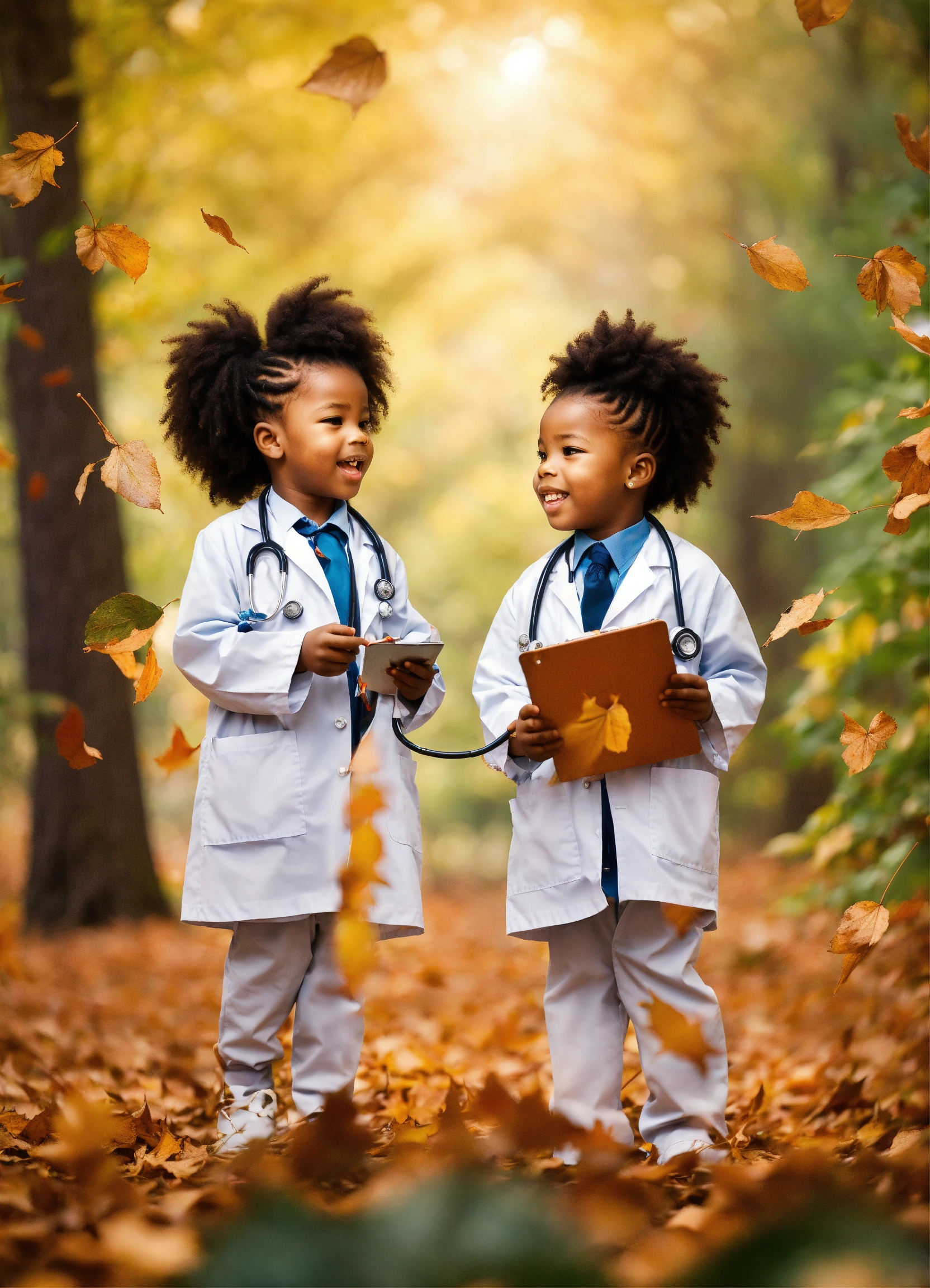 Very beautiful african american preschoolers with braided hair in their hair dressed as doctors, playing in a lush forest under a background of falling leaves.