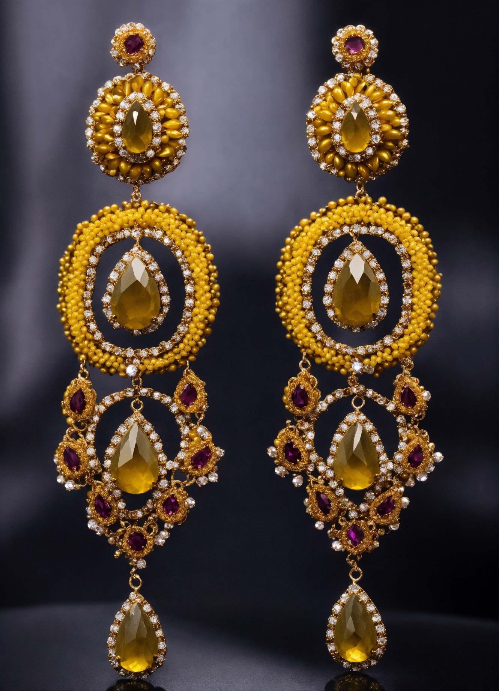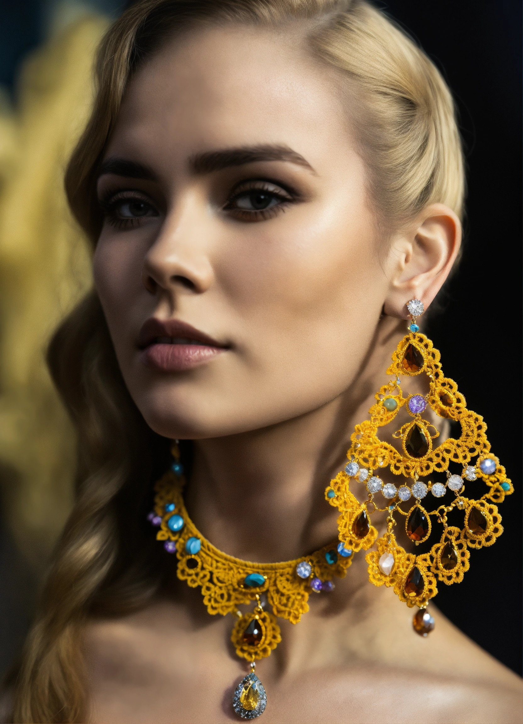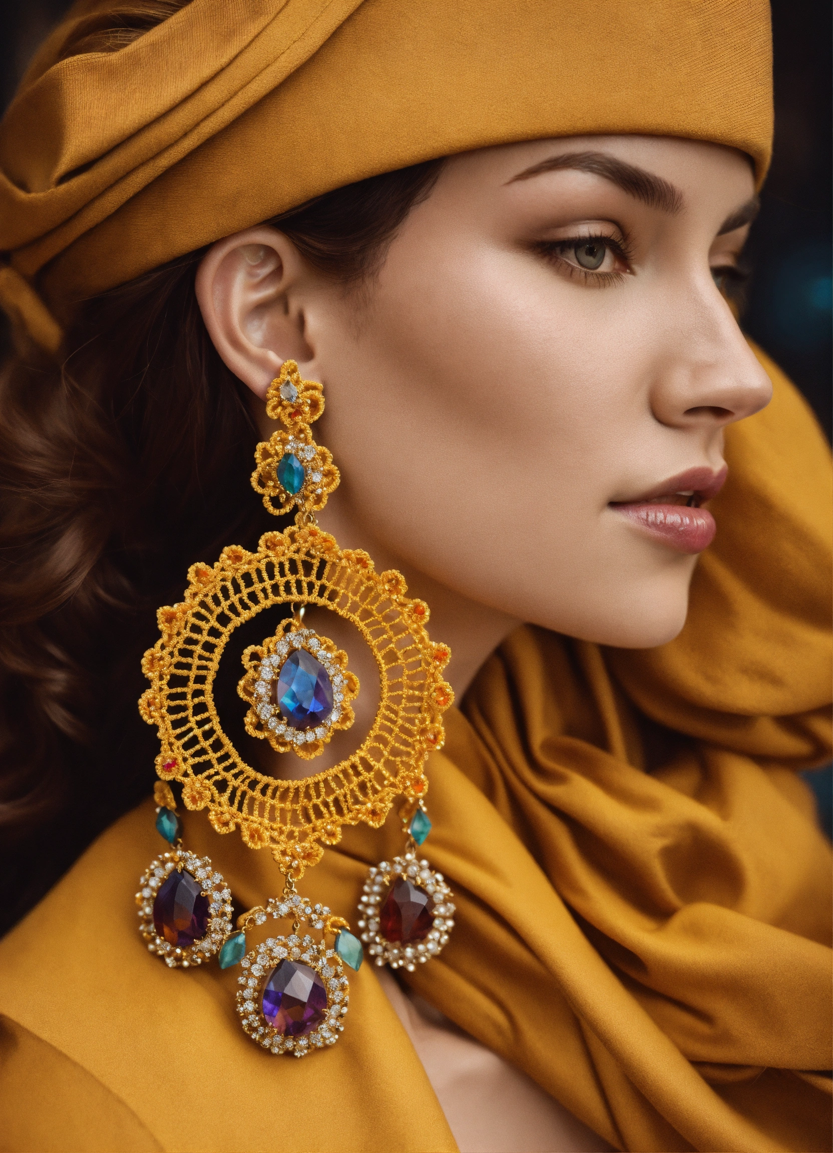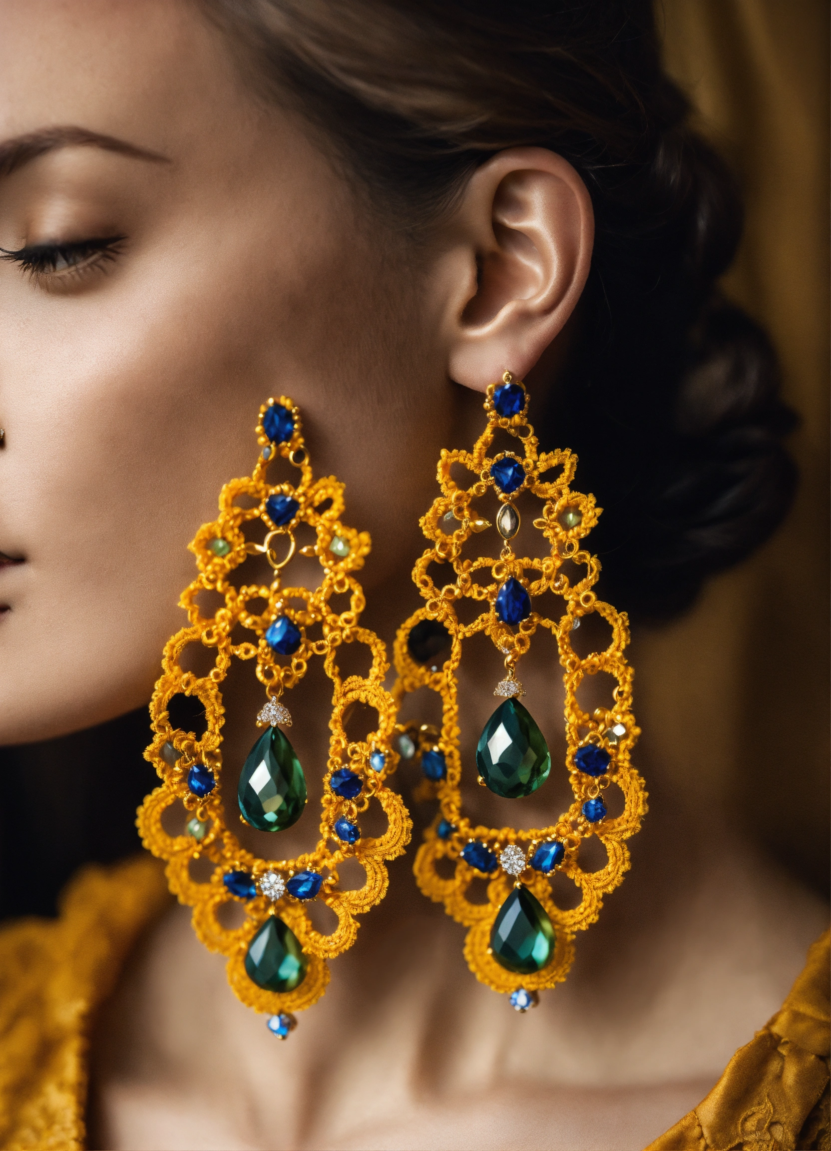 Luxurious detaled mustard color tatted lace earrings decorated with precious stones and crystals in the style of liam sharp, dutch tradition, webcam, gail simone, mark seliger, 8k, high resolution