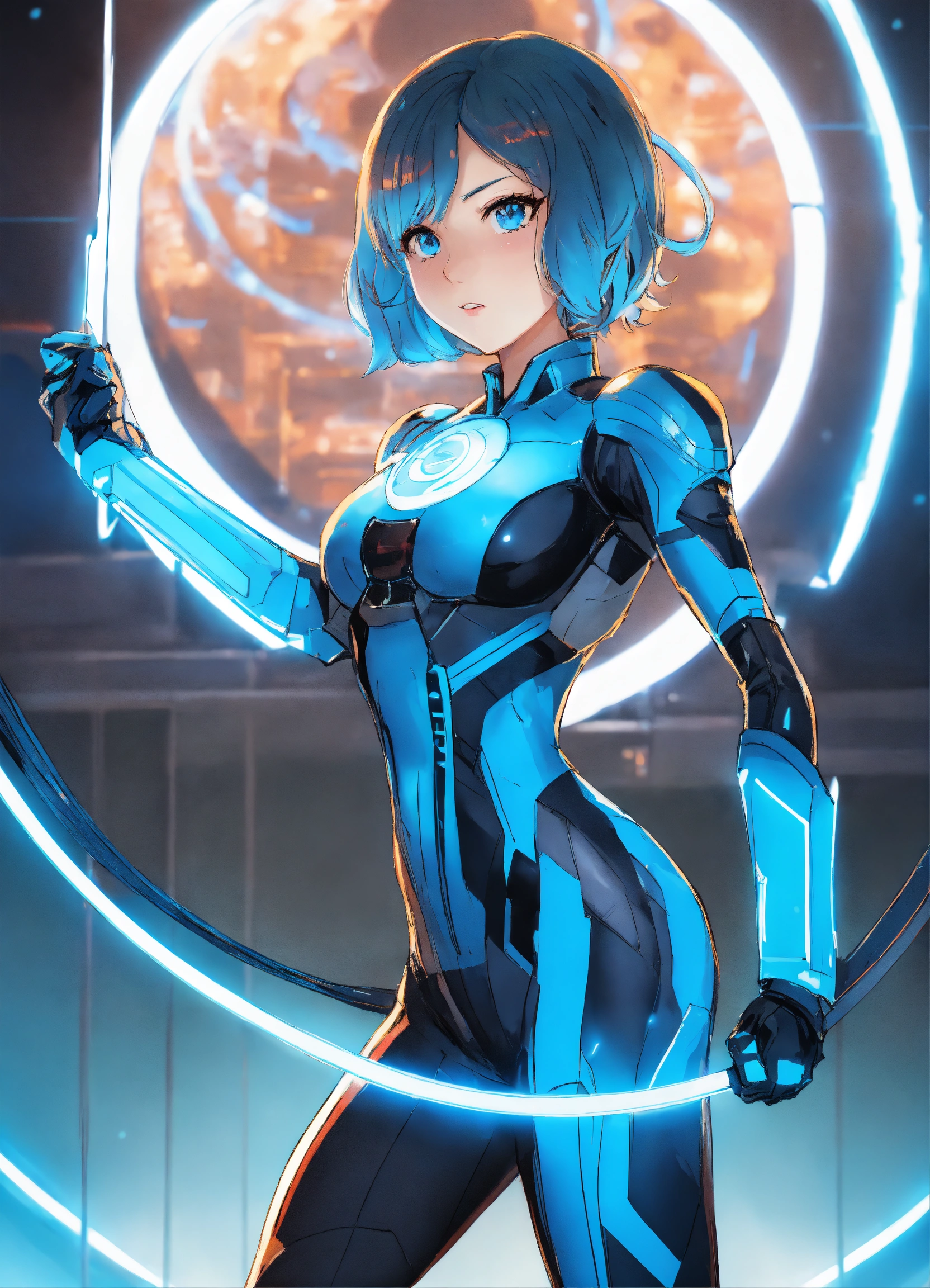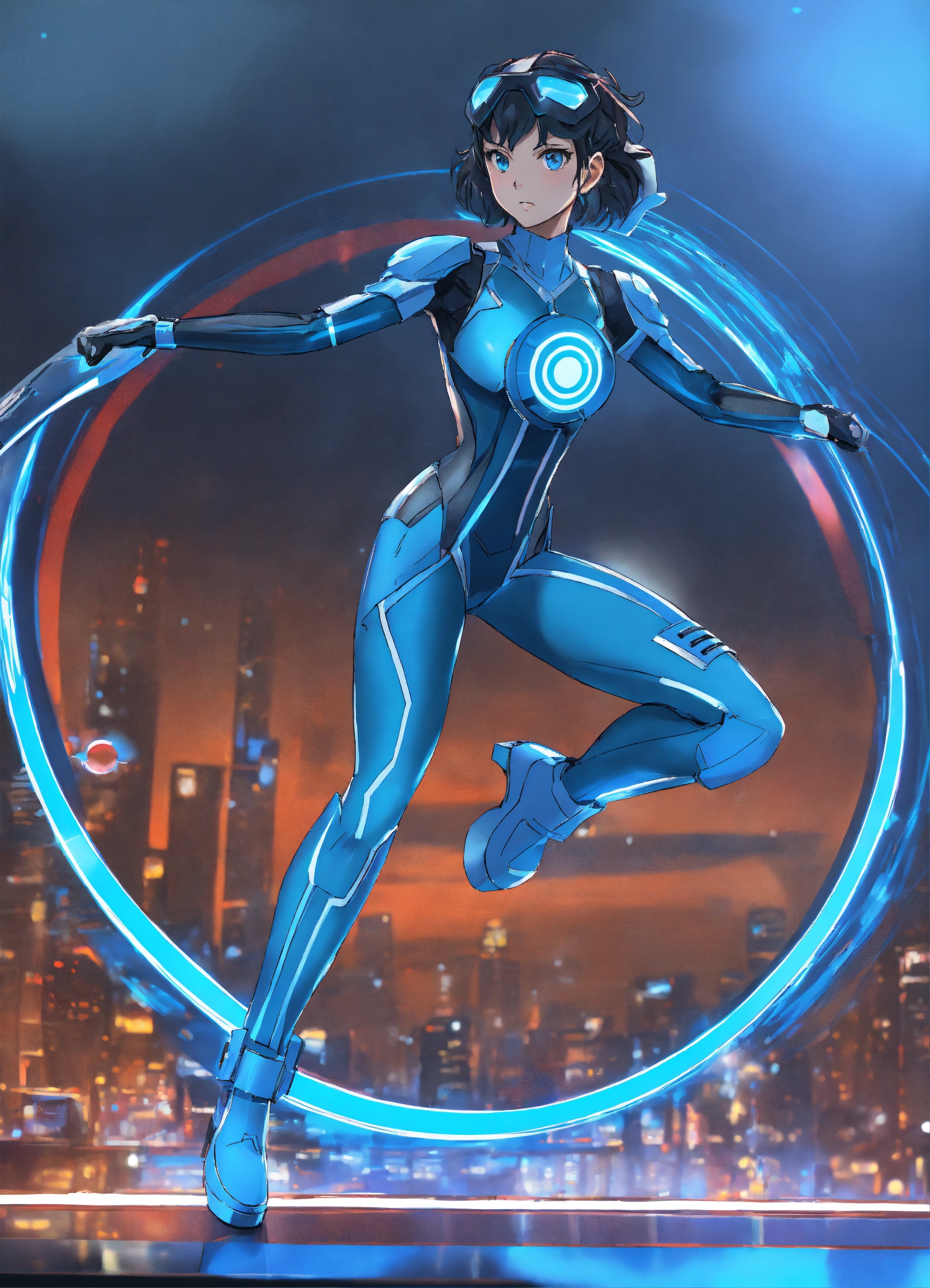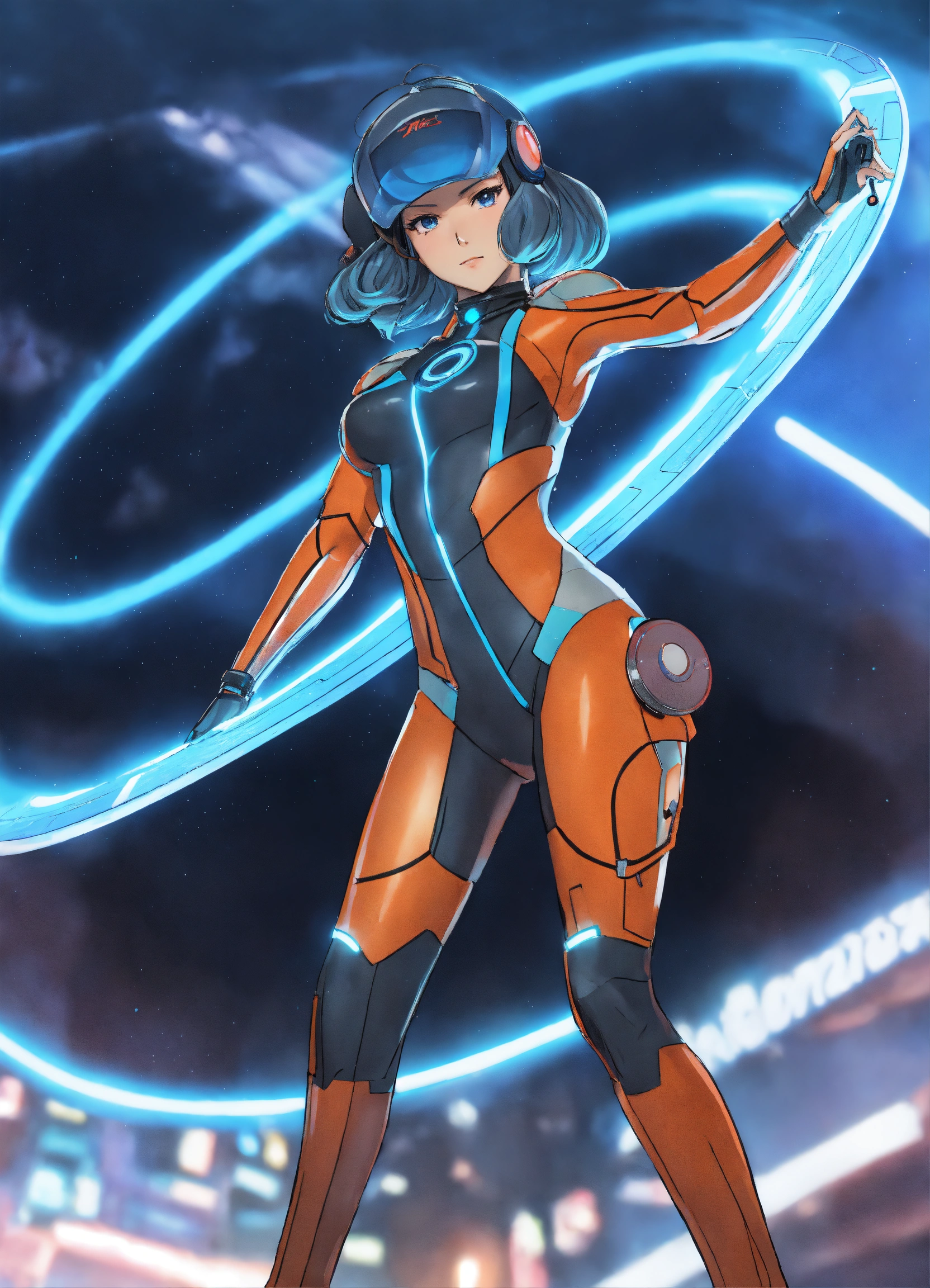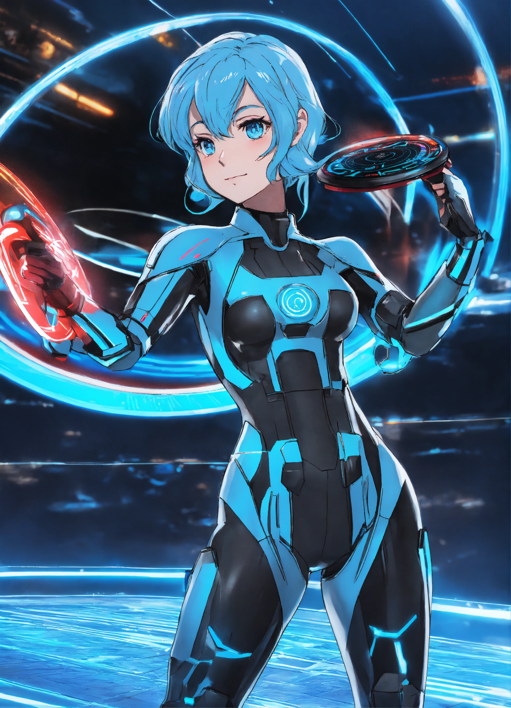 2020s anime tron woman blue holding a disc