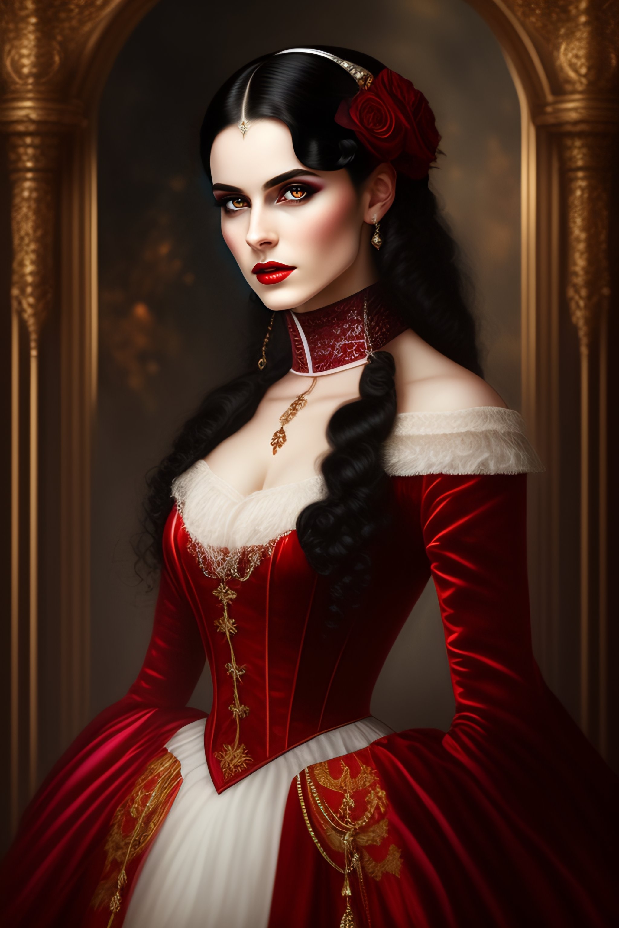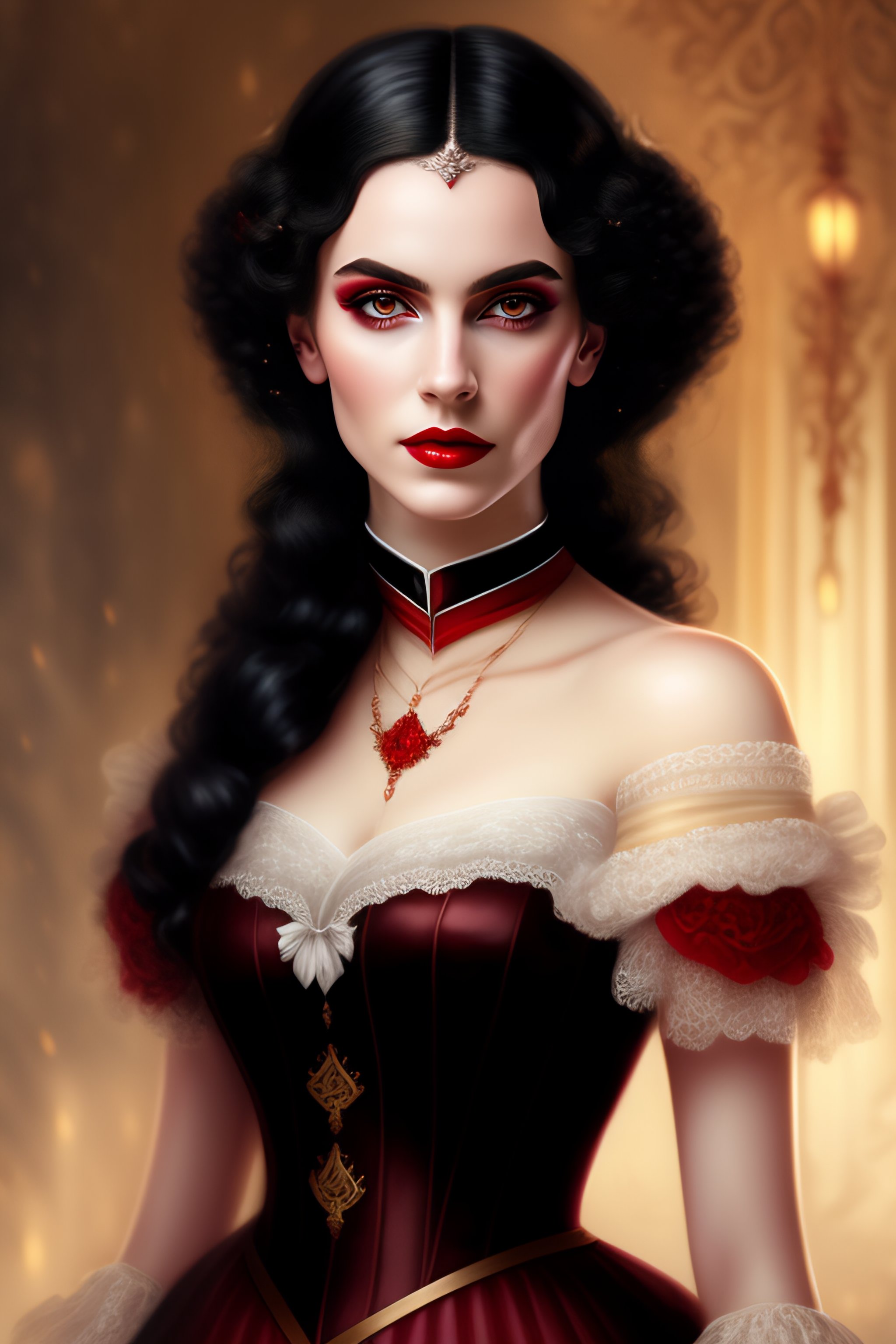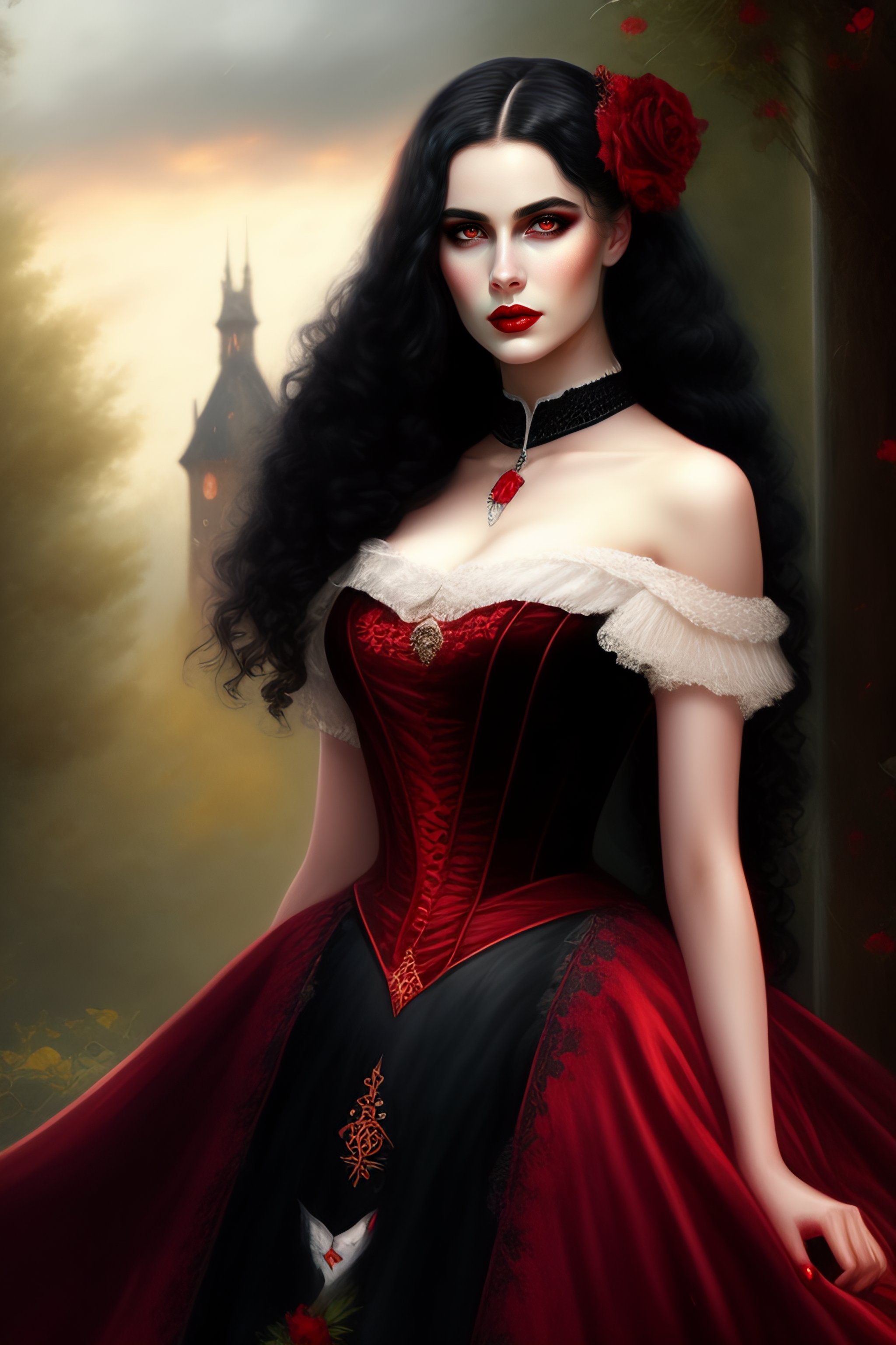 Young, beautiful vampire woman, pale skin, black hair, eyes red, full-body portrait, wearing victorian era dress, detailed face, fantasy setting.