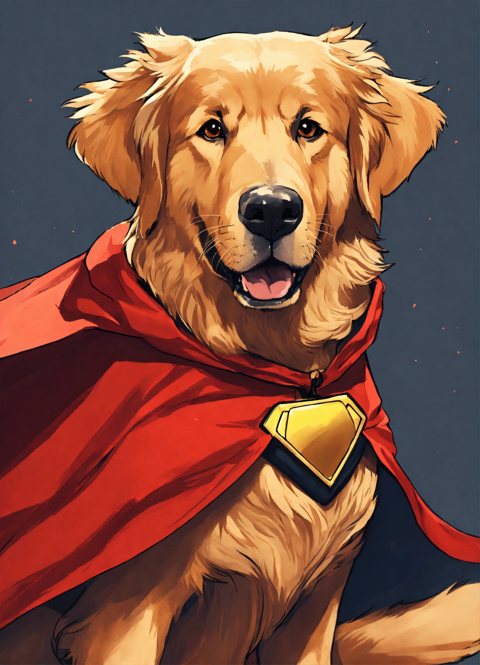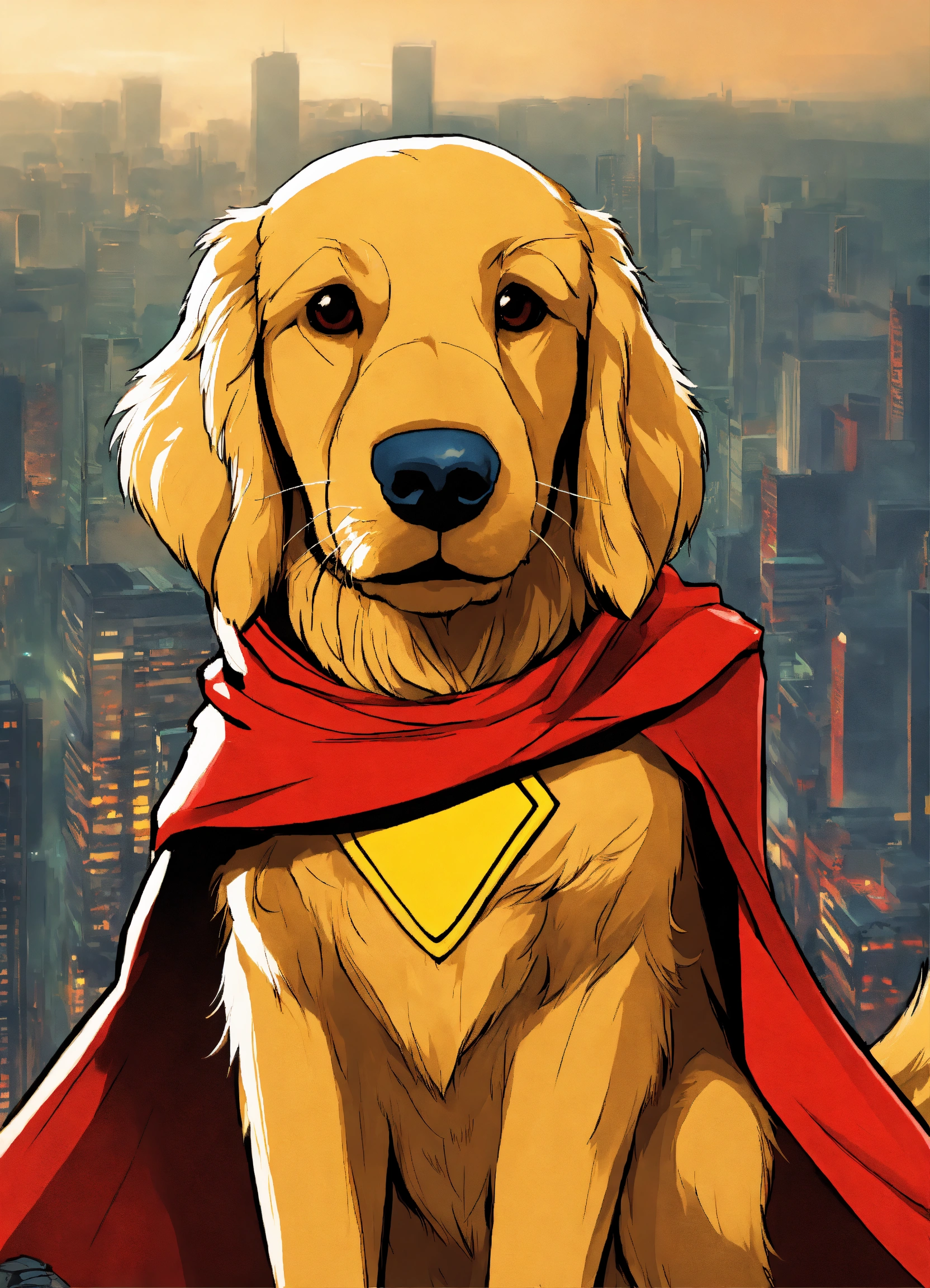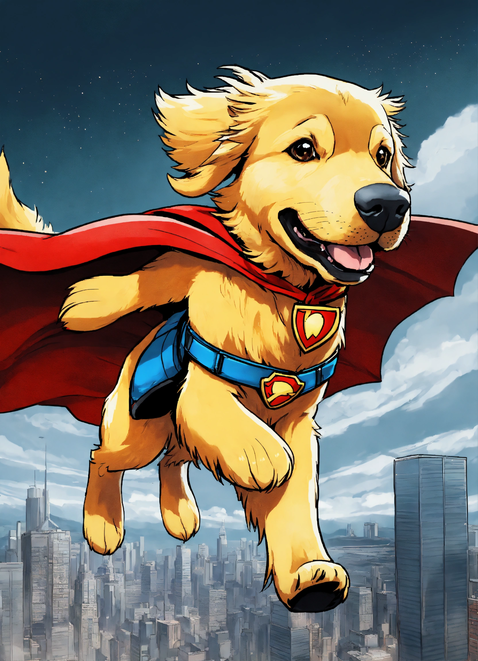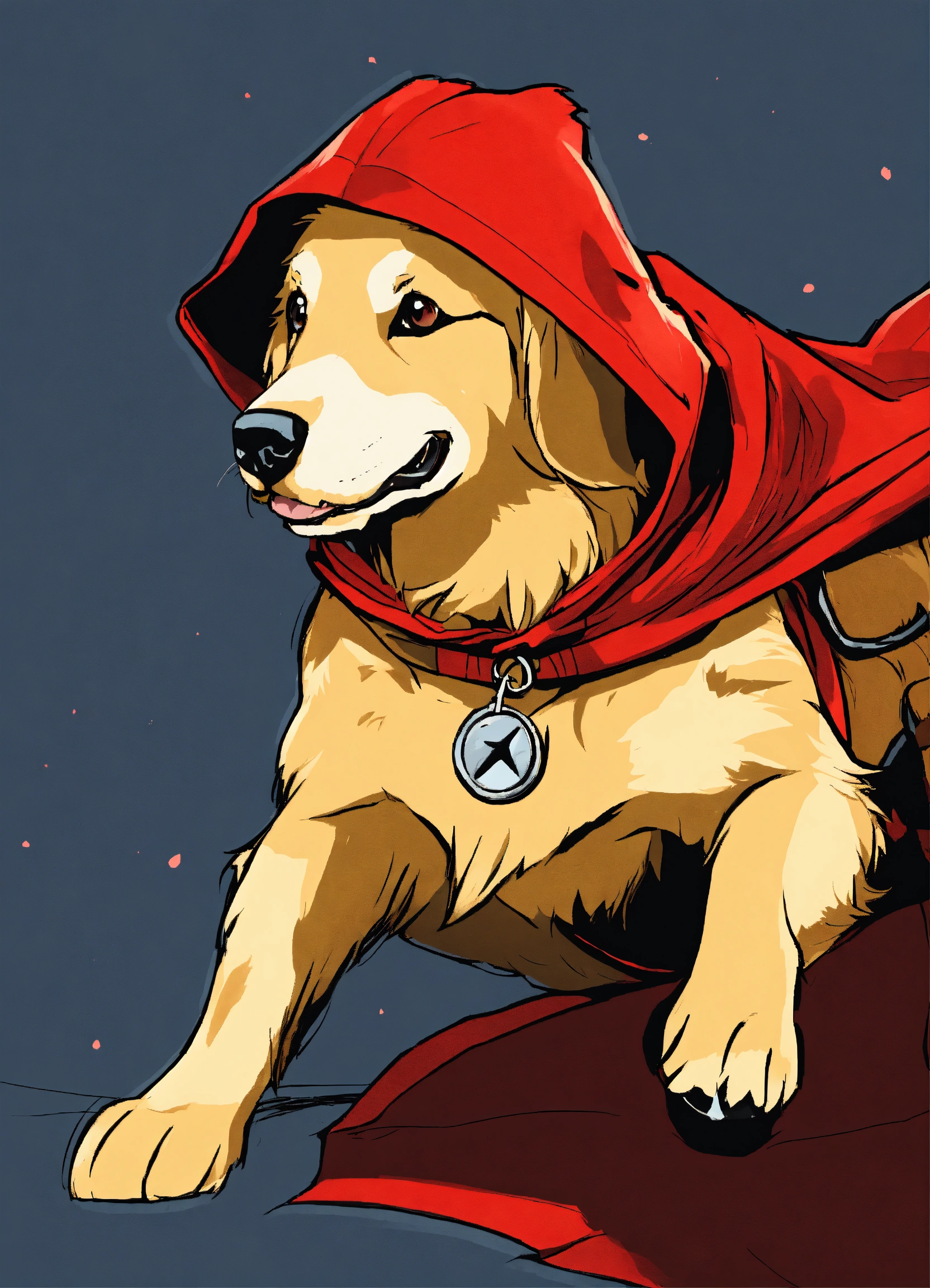 I would like a manga style cartoon of a golden retriever super hero with no background. i want the dog to have a red hood, flying.