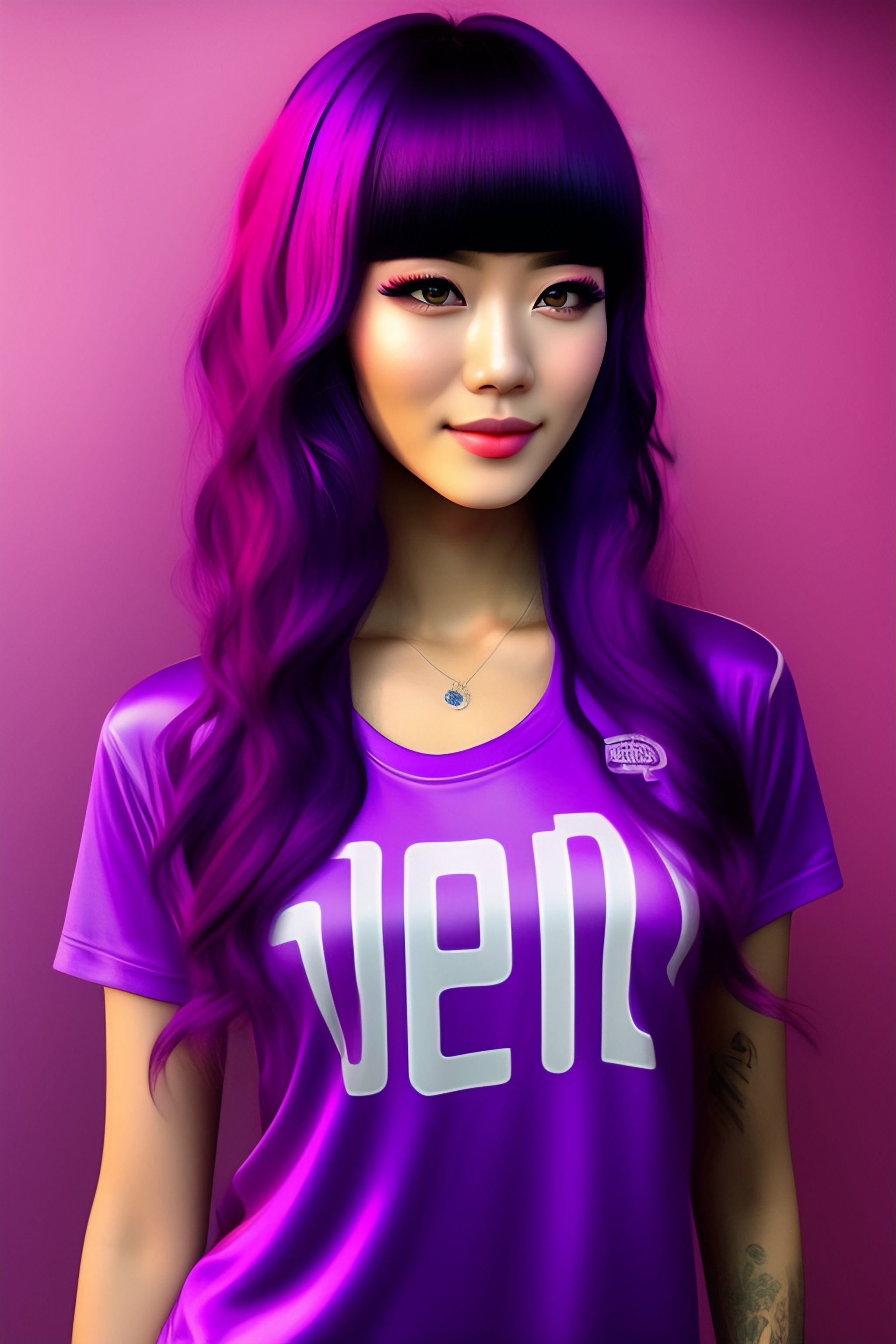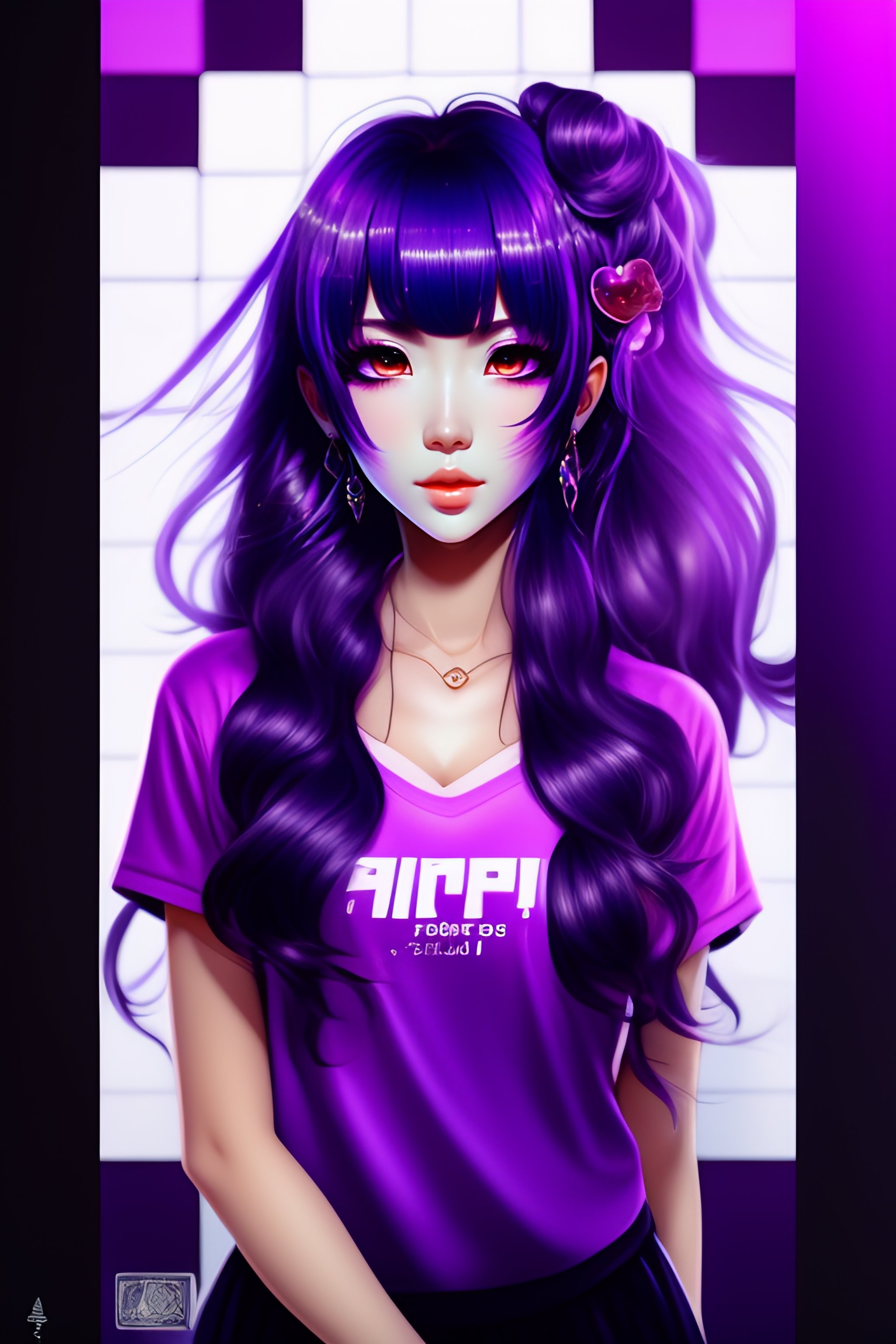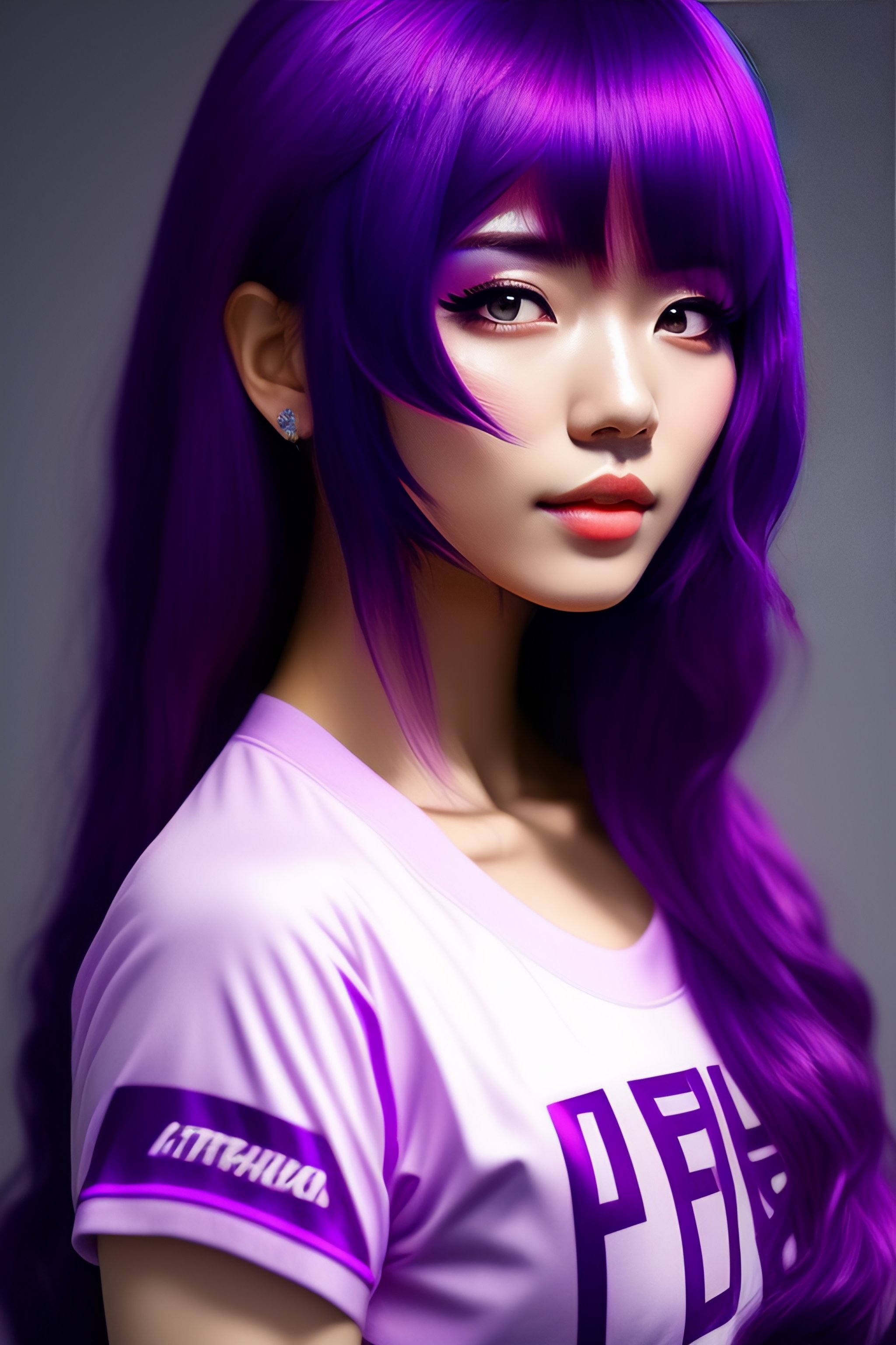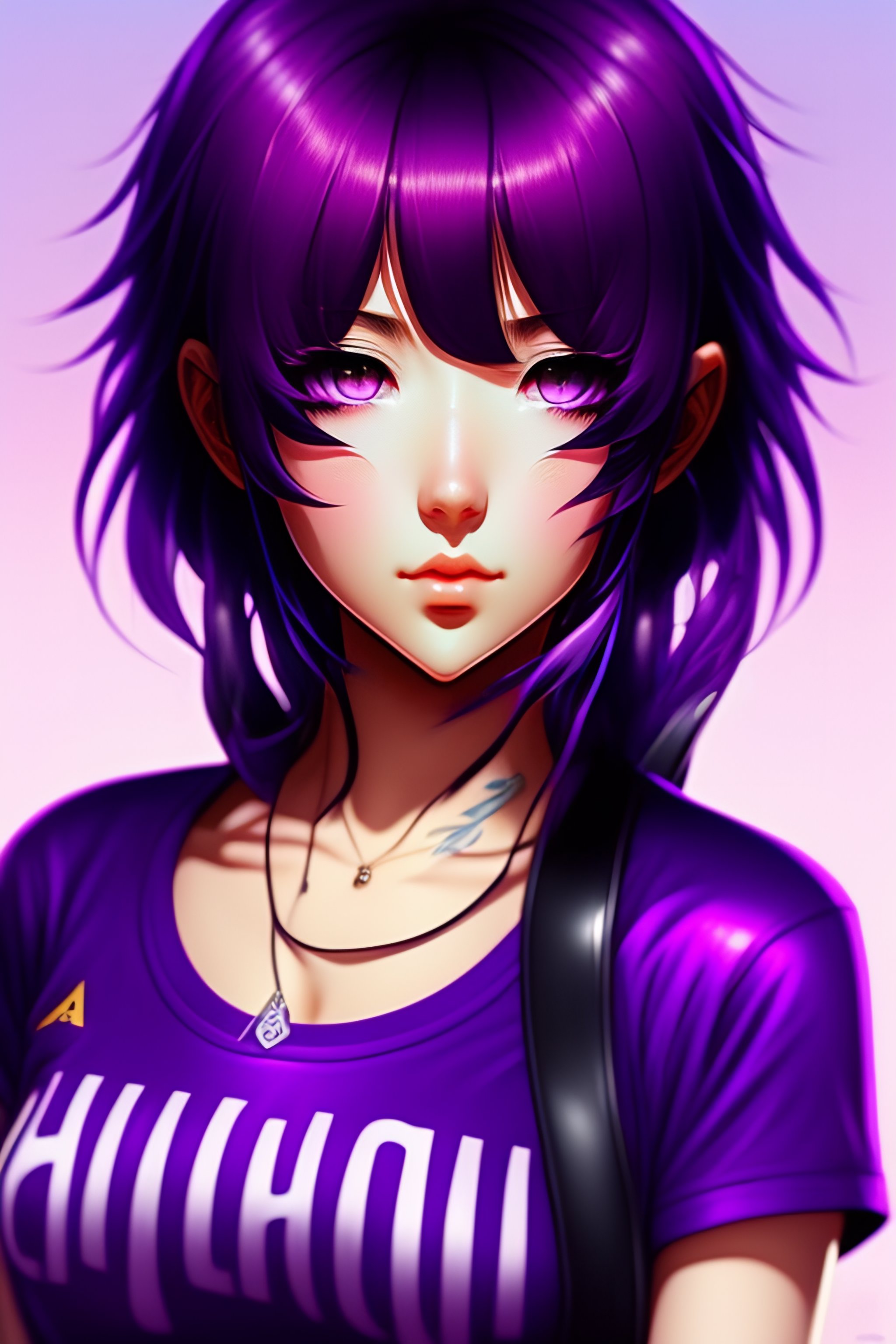 Anime girl, 19 years old, magenta-violet hair, bangs style hair, magenta-violet eyes, wearing violet t-shirt
