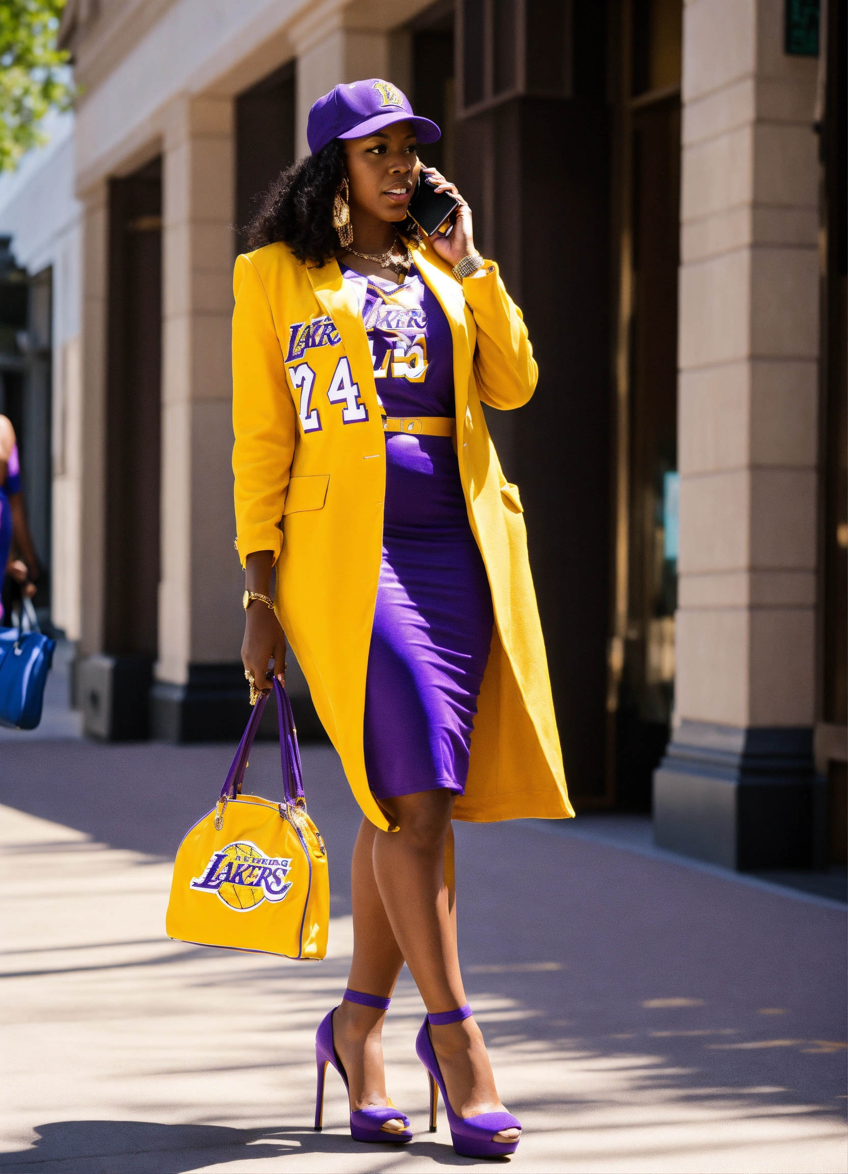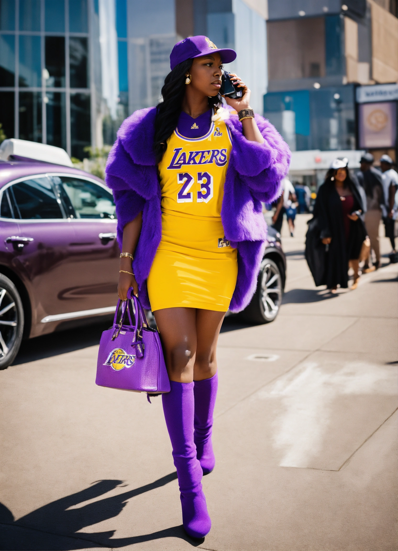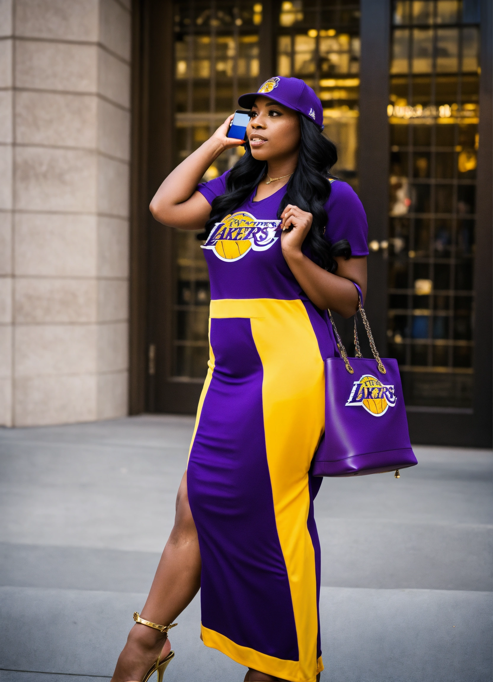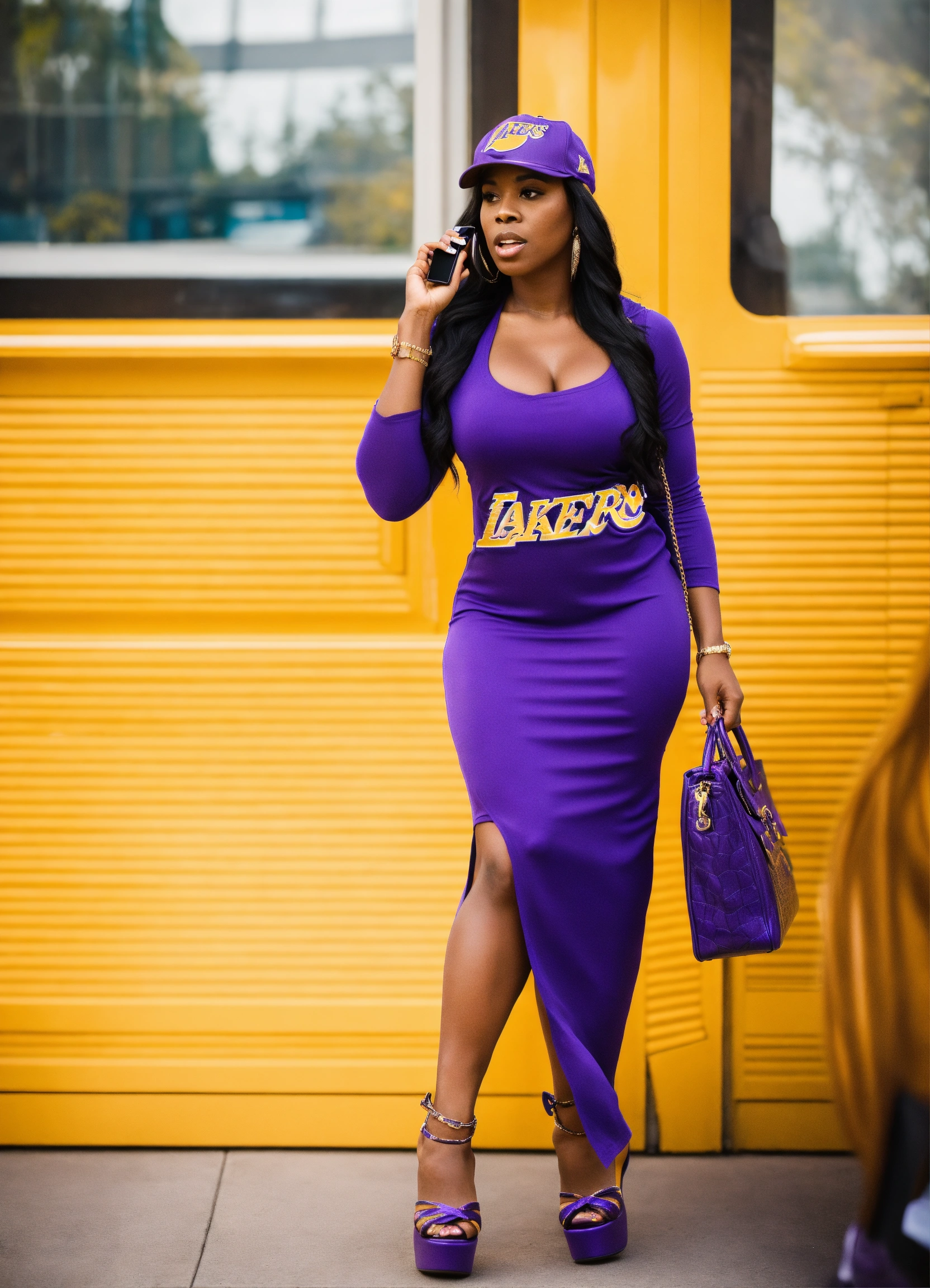 A black woman in a lakers jersey dress with high heels that match the jersey, she is wearing a ball cap with the lakers logo on it, she is carrying a purple birkin bag and talking on her cell phone