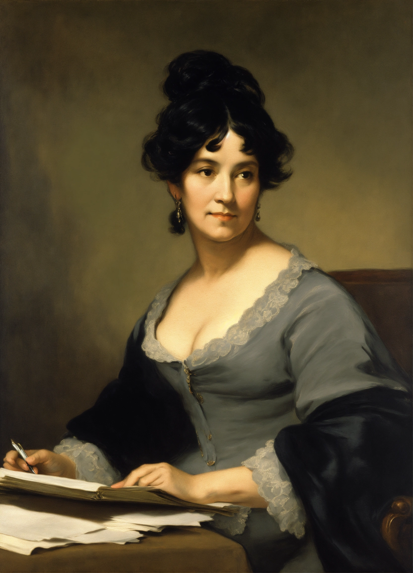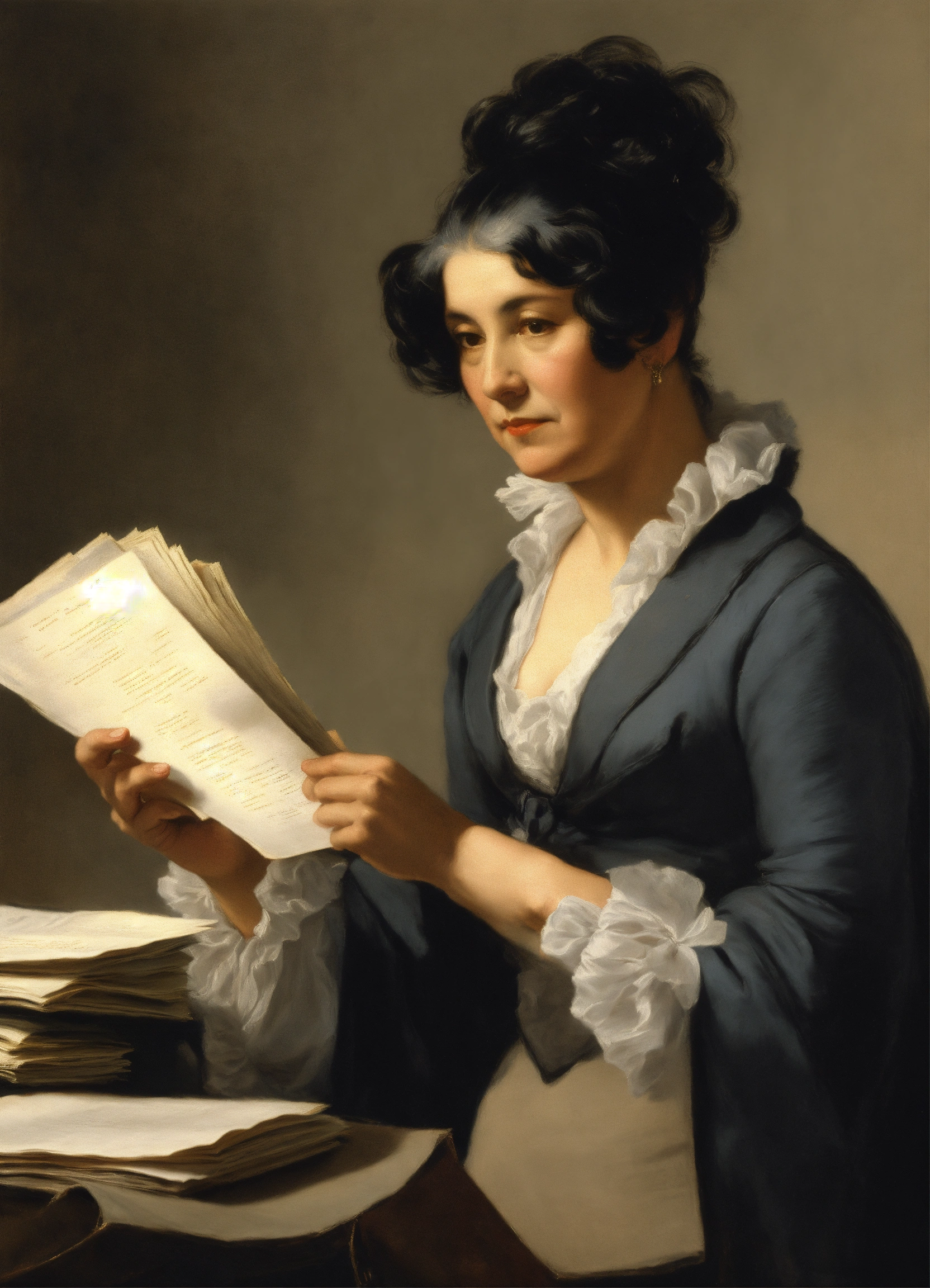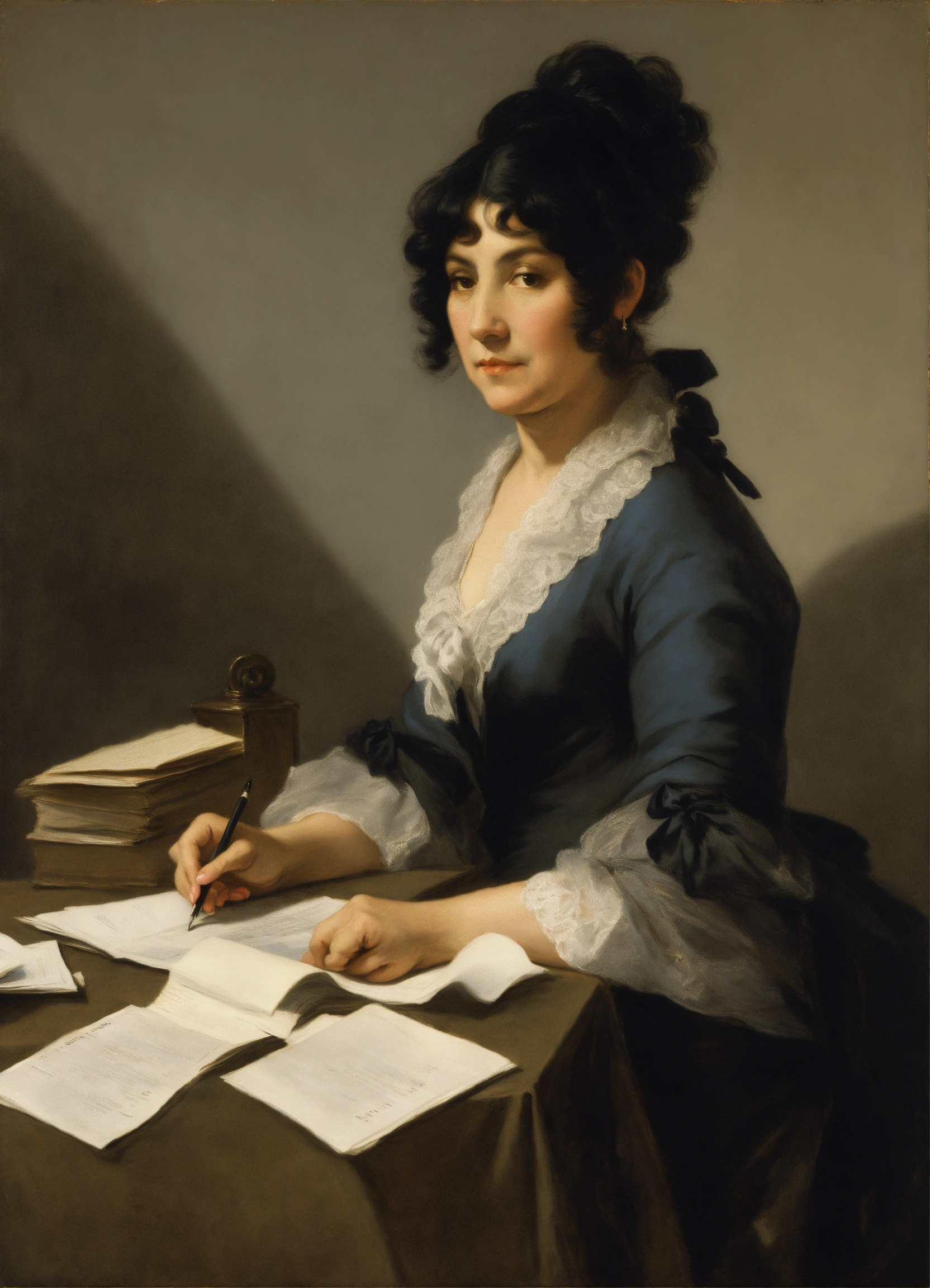 Artwork by francisco goya middle-aged woman with gray and black hair the shape and appearance look good for the age, dressed in aristocratic clothes handing over documents to a spy