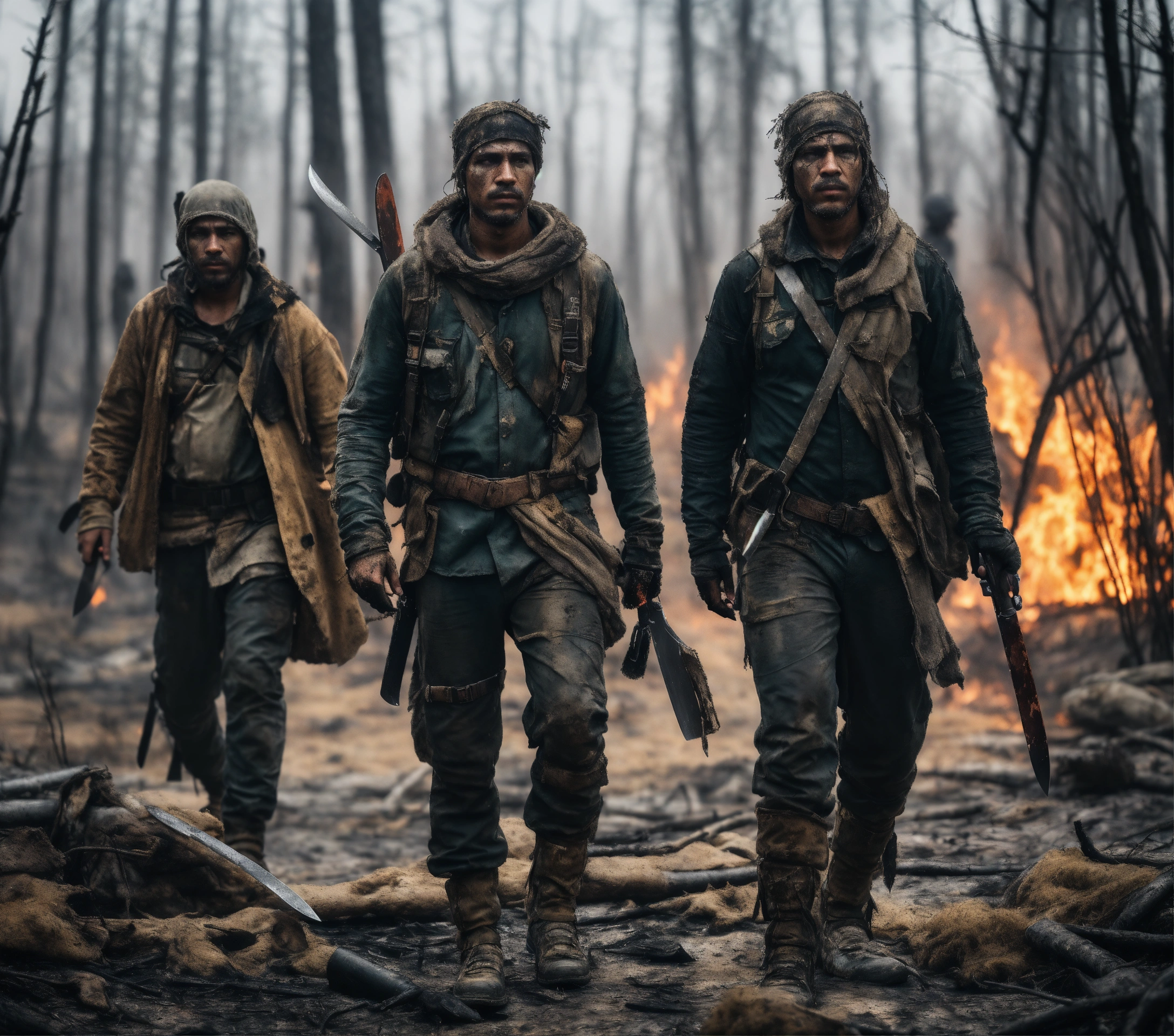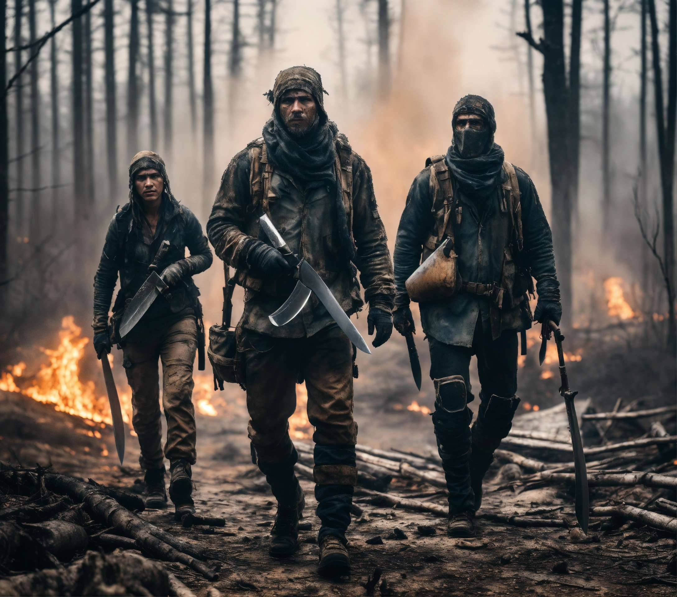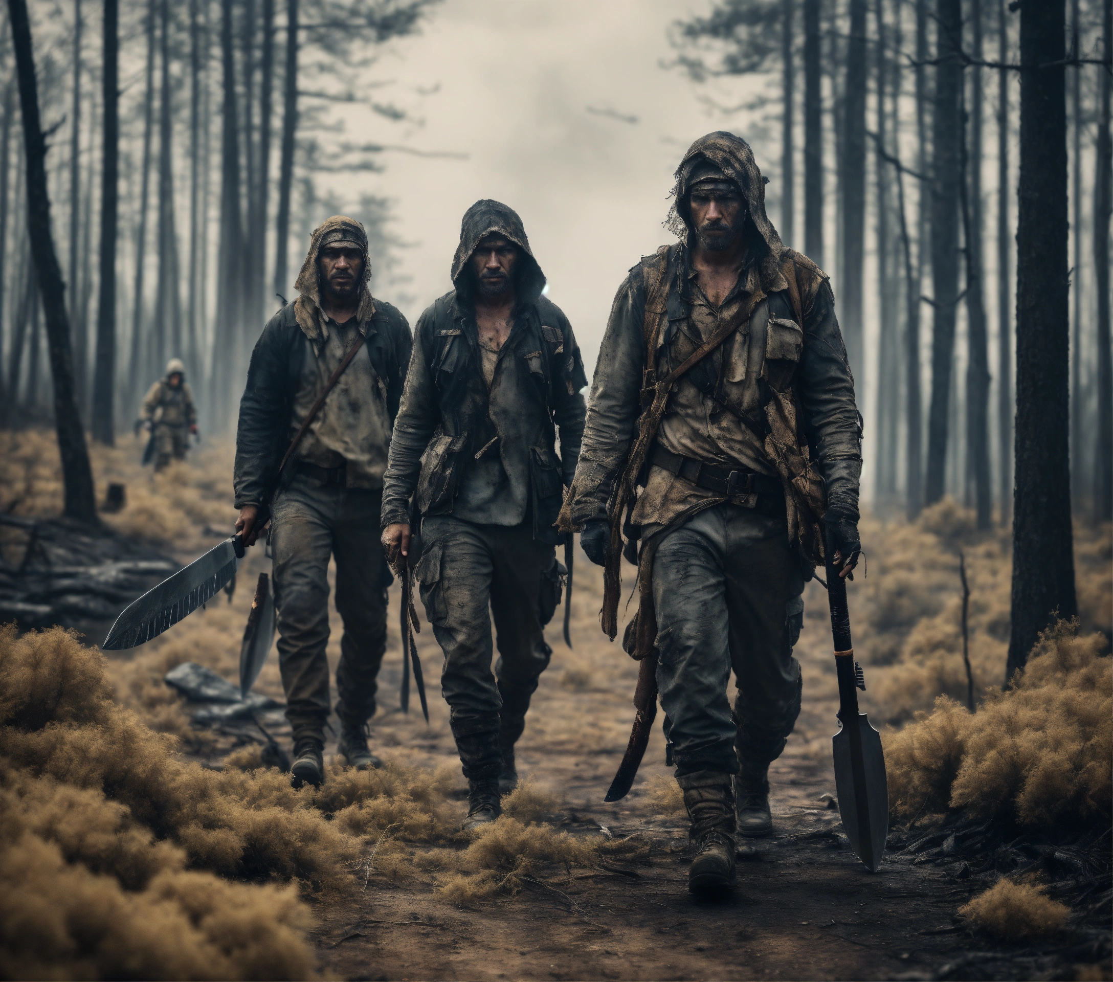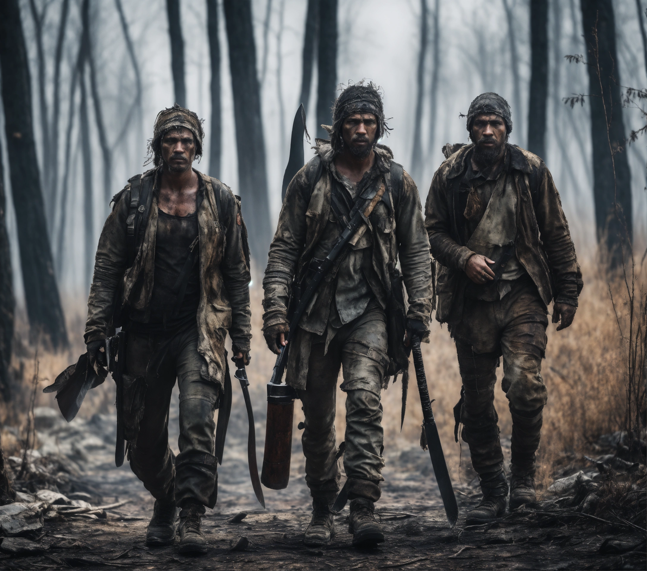 A realistic photo of three different survivors dressed in ragged post-apocalyptic clothing, carrying machetes and knives, walking in a gray burned sparse forest, hyperdetailed, hyperrealistic, 8k