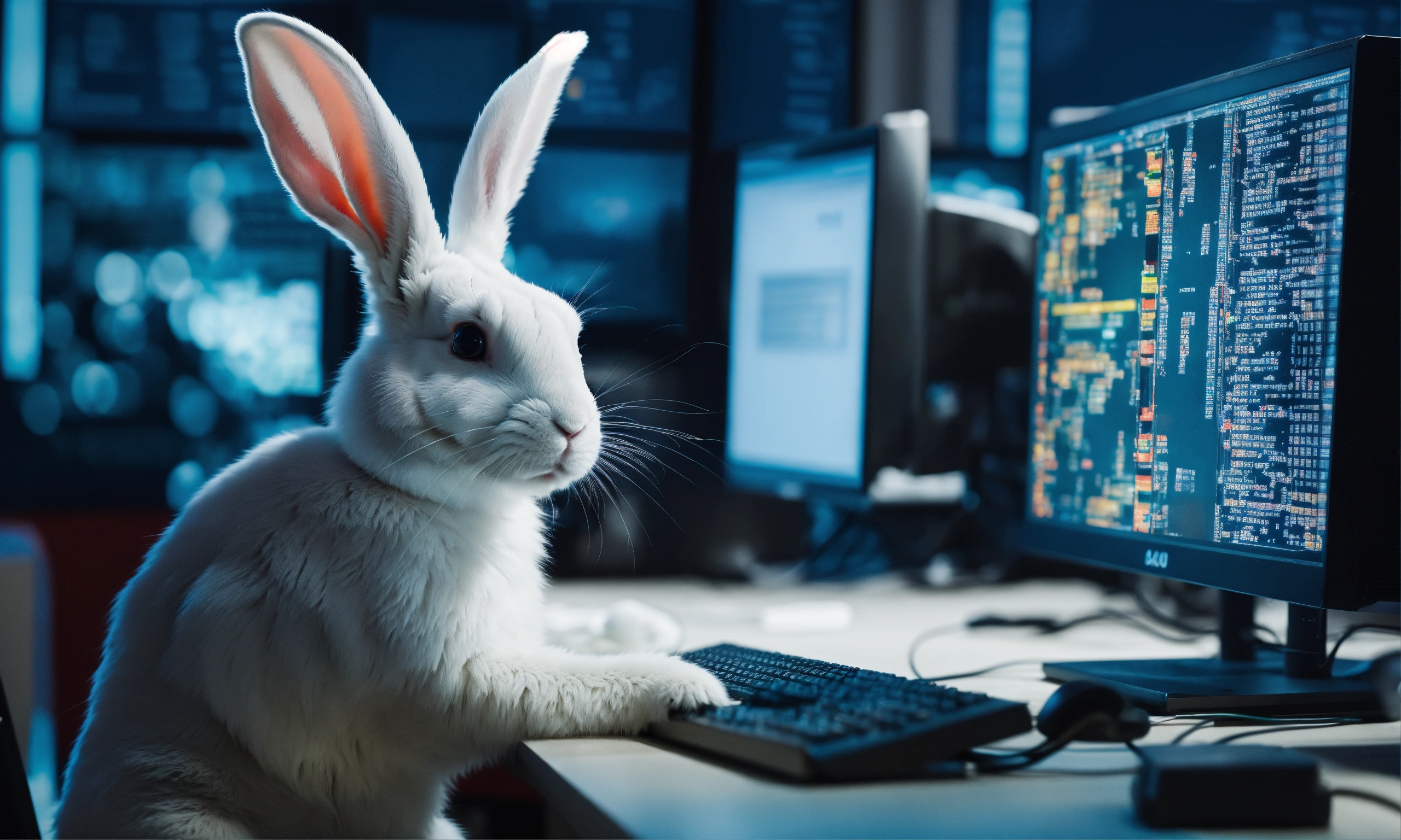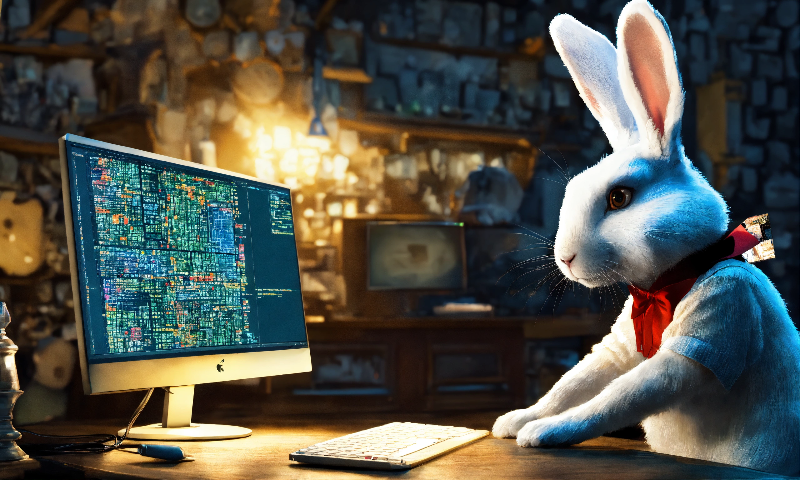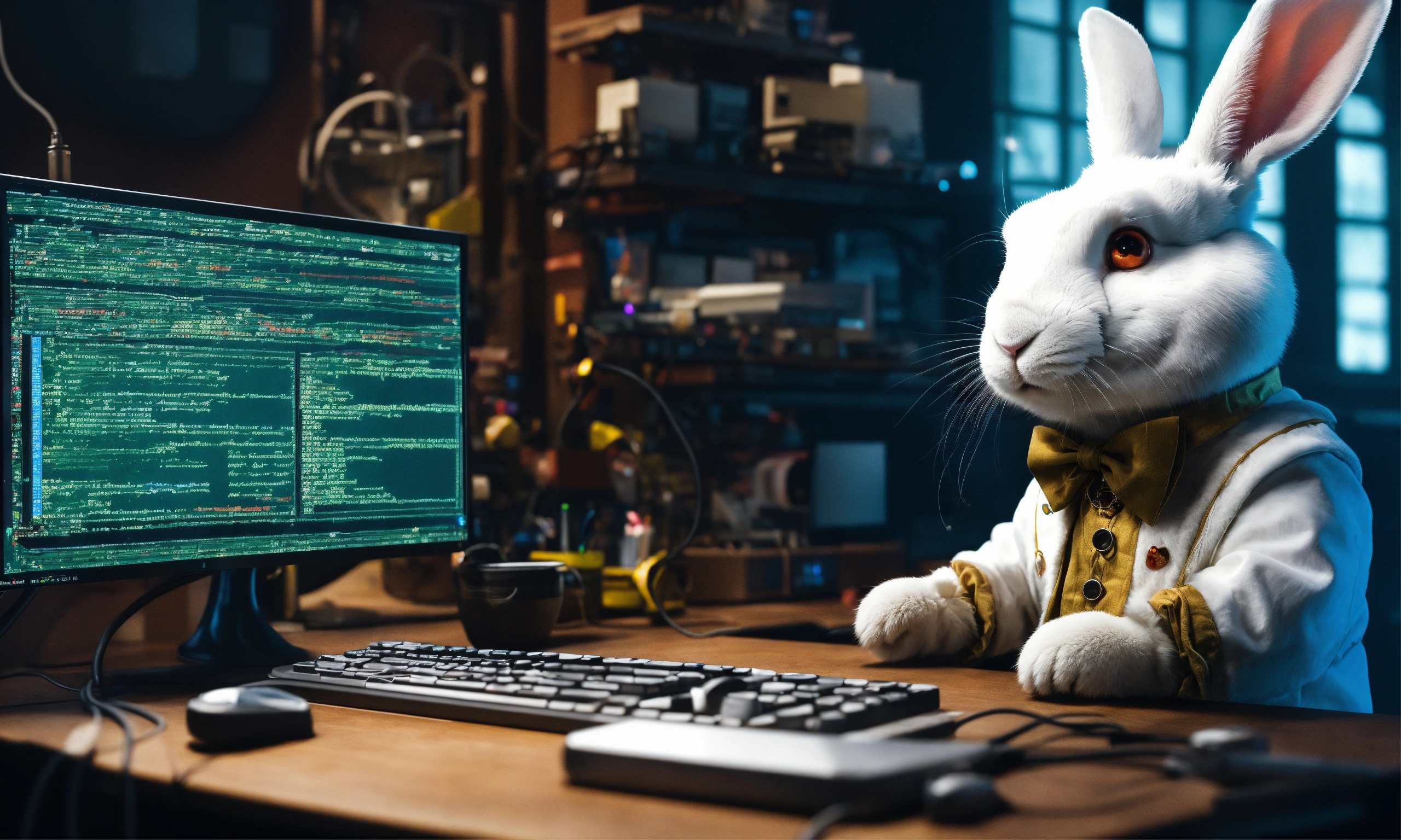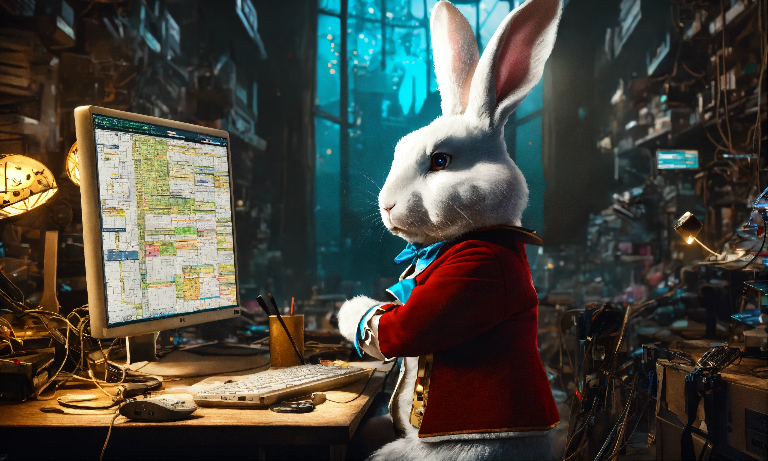 A white rabbit from alice in wonderland is a software developer, he has many computer monitors he is working on. one of the monitors shows a broken source code build
