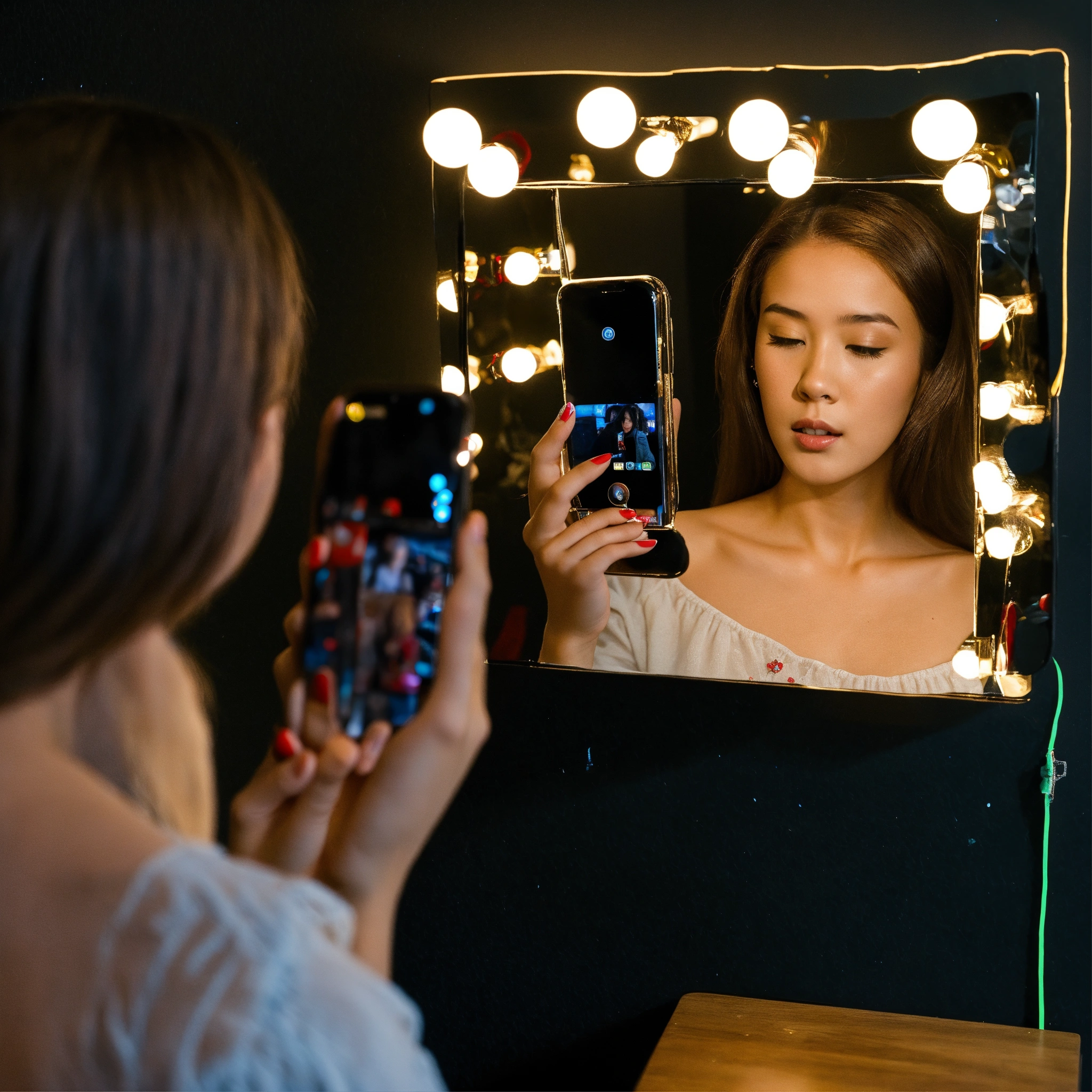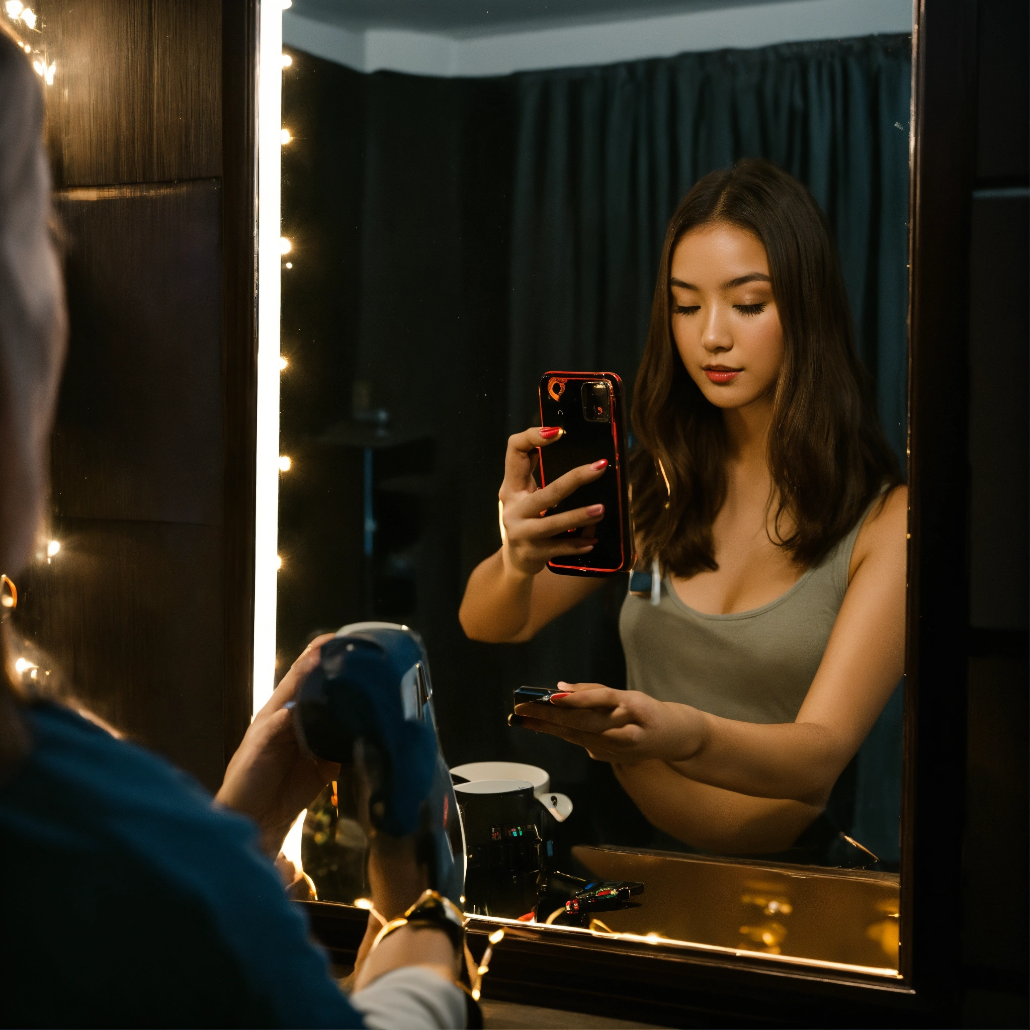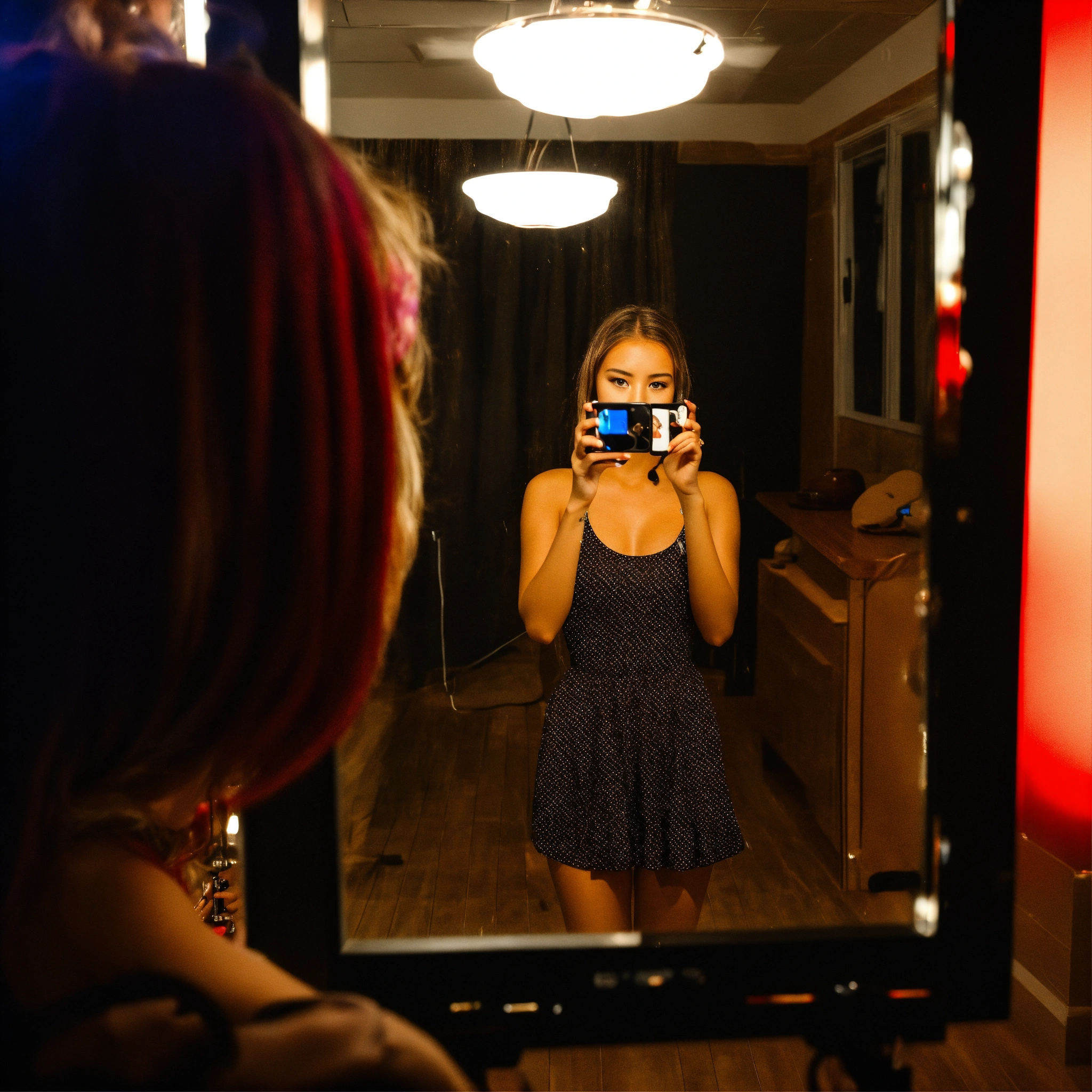 The girl decided to shoot videos on her phone in the mirror on the black background
