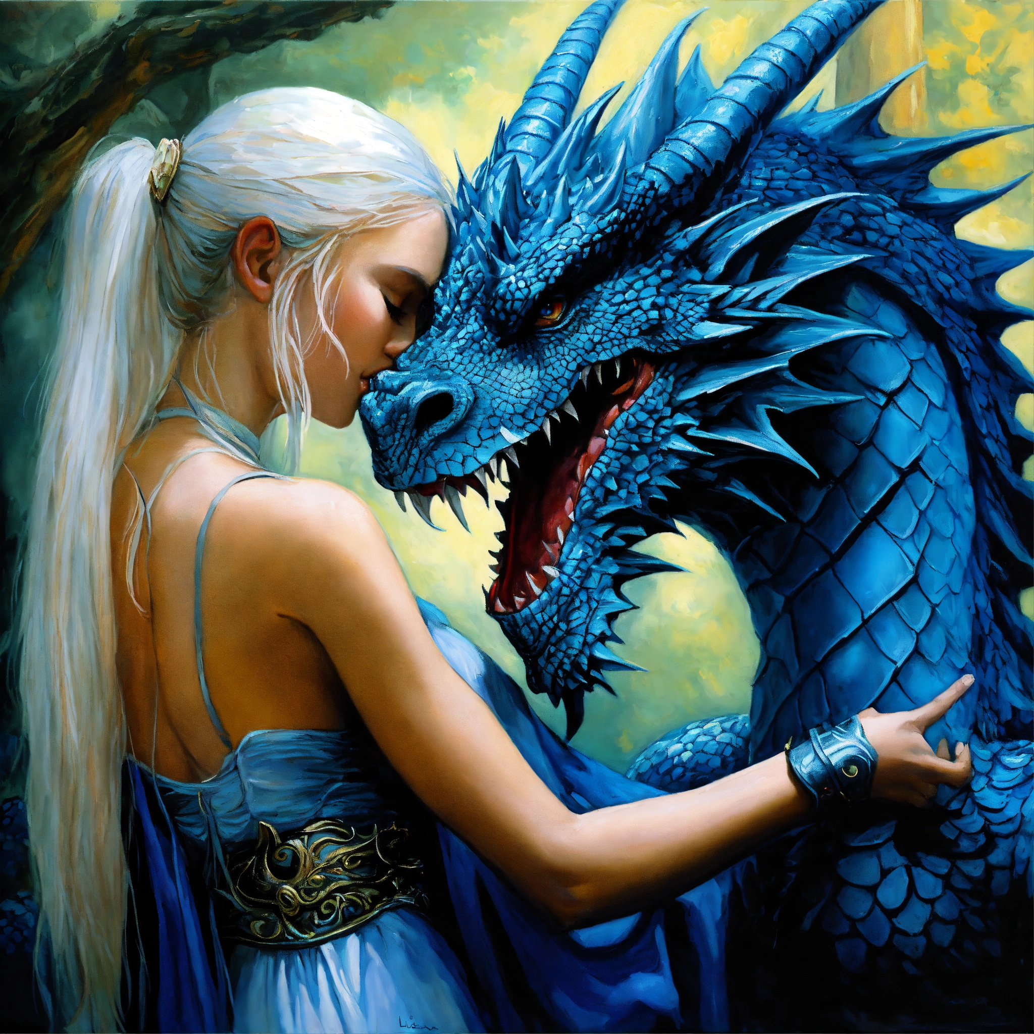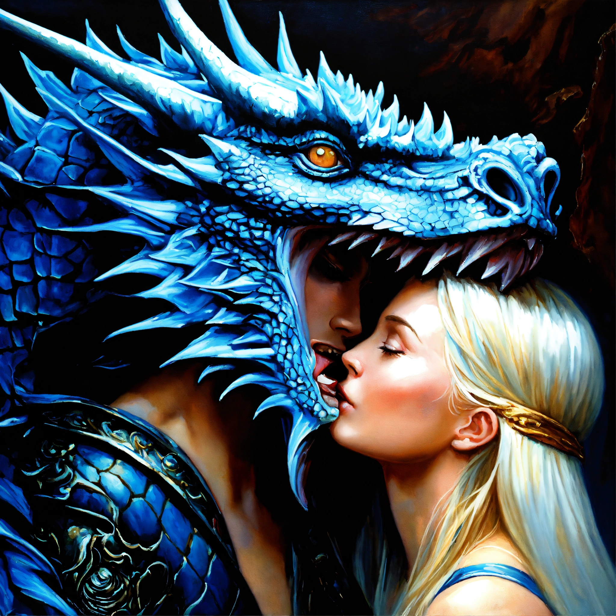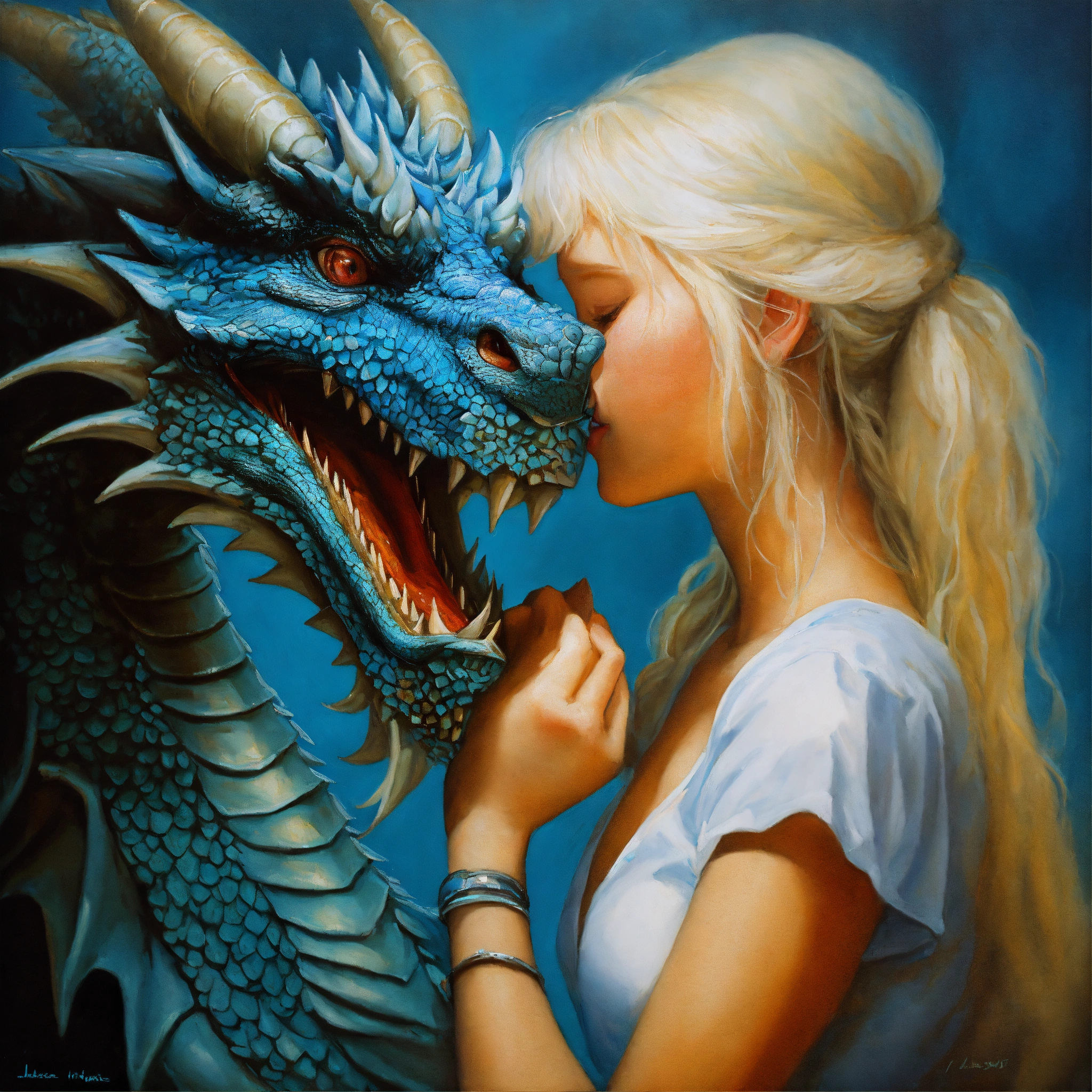Oil painting of a huge, magnificent two meter big blue dragon's head with a 15 year old white blonde elf girl lovingly hugging and kissing the dragon's head, the dragon's head is as big as the entire girl, ultra detailled, ultra realistic, in the style of luis royo