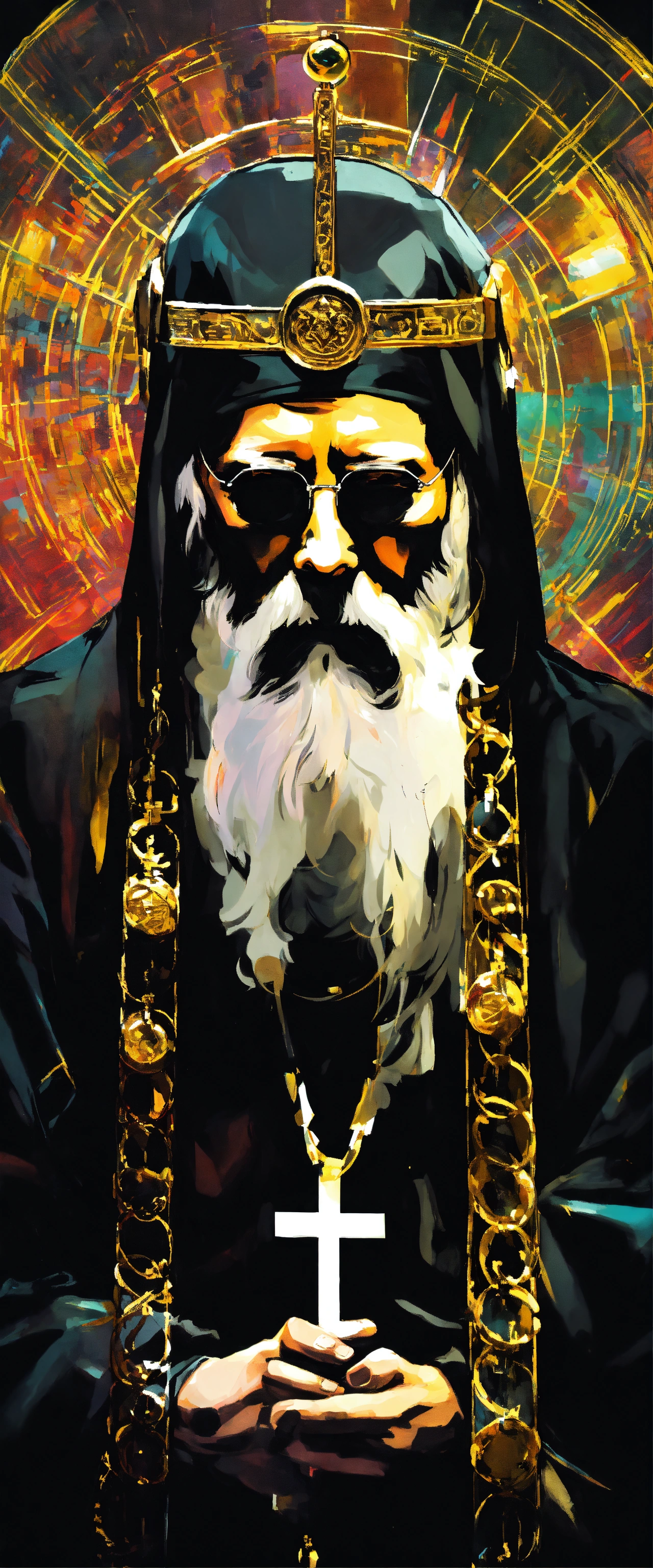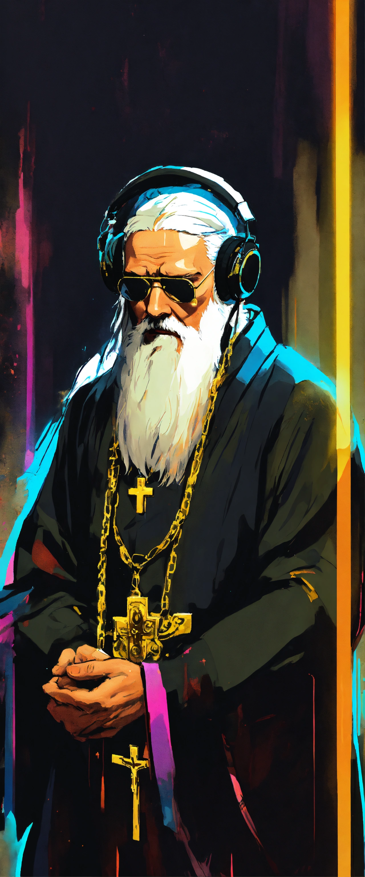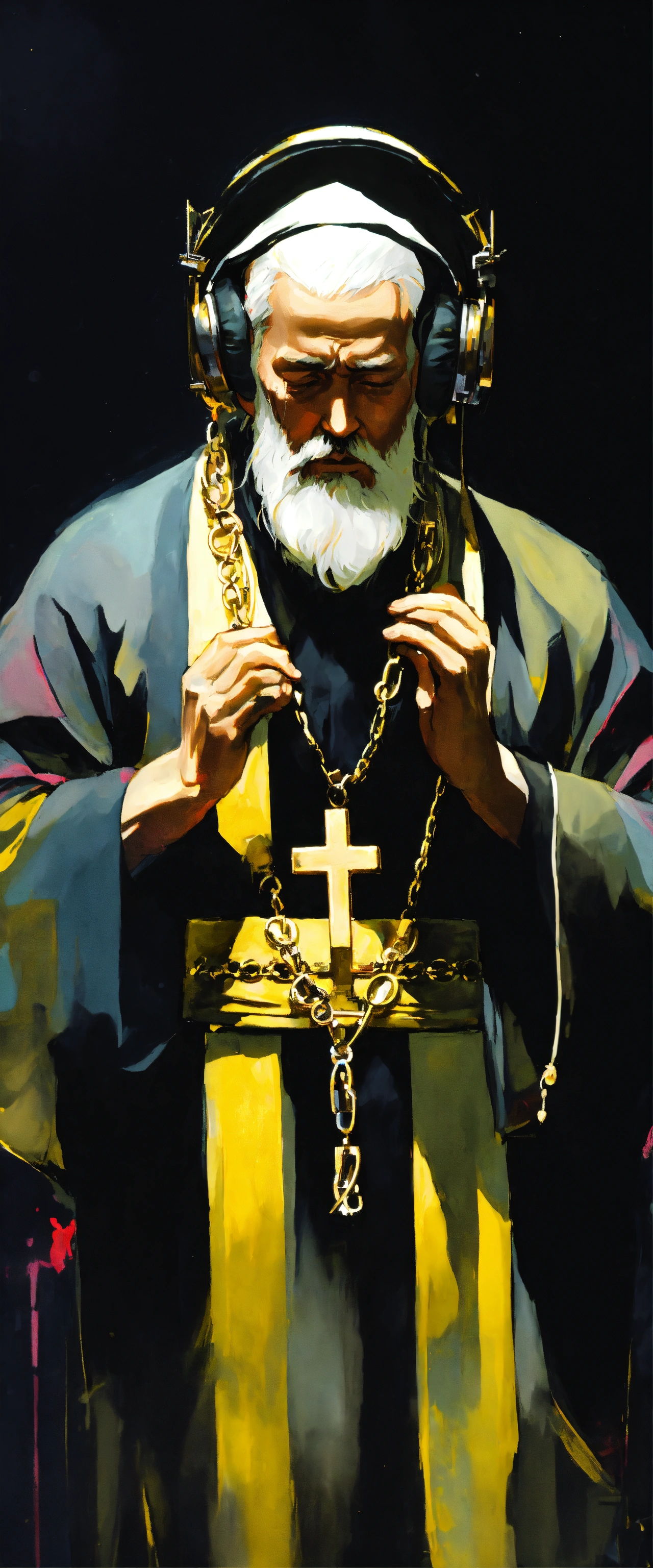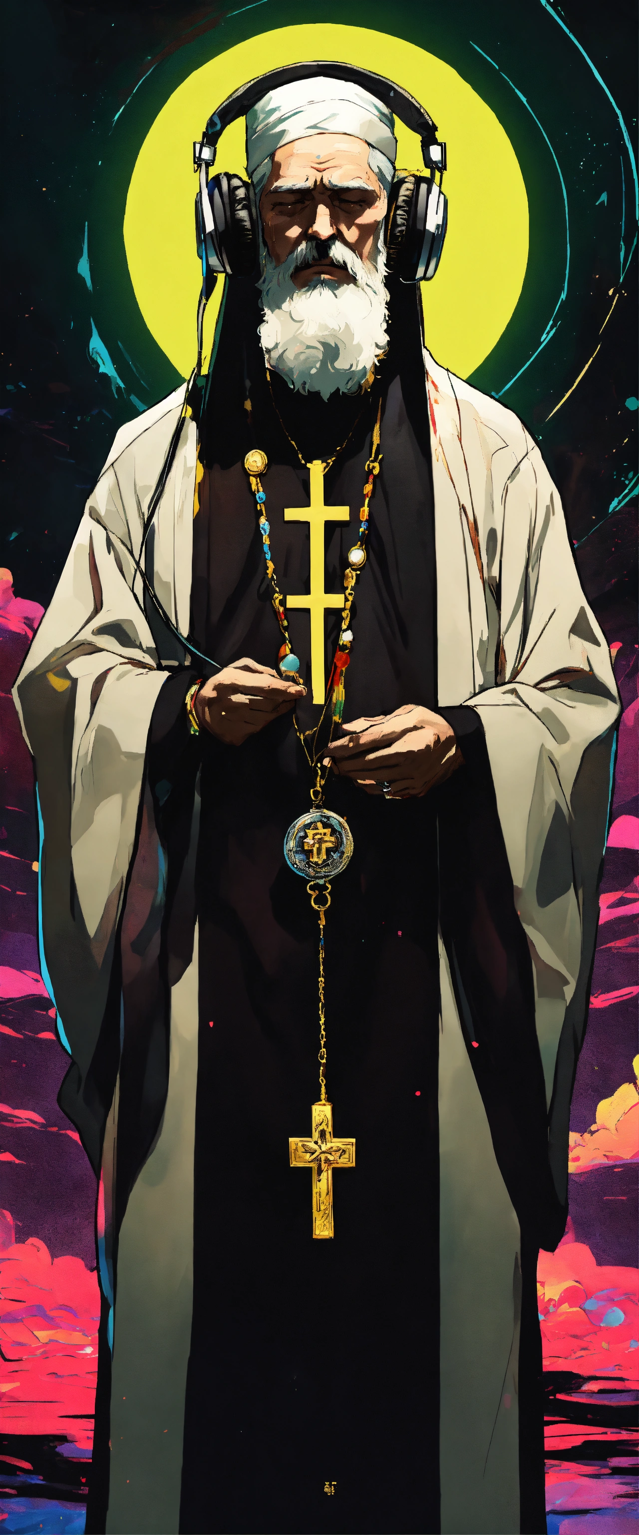 Orthodox priest with white beard listening to music with headphones and wearing sport tennis, and black tunic and gold cross necklease. crying un desperation to god, covering his face with his hand. in dark fantasy 80s cartoon style, neón colores, yoji shinkawa