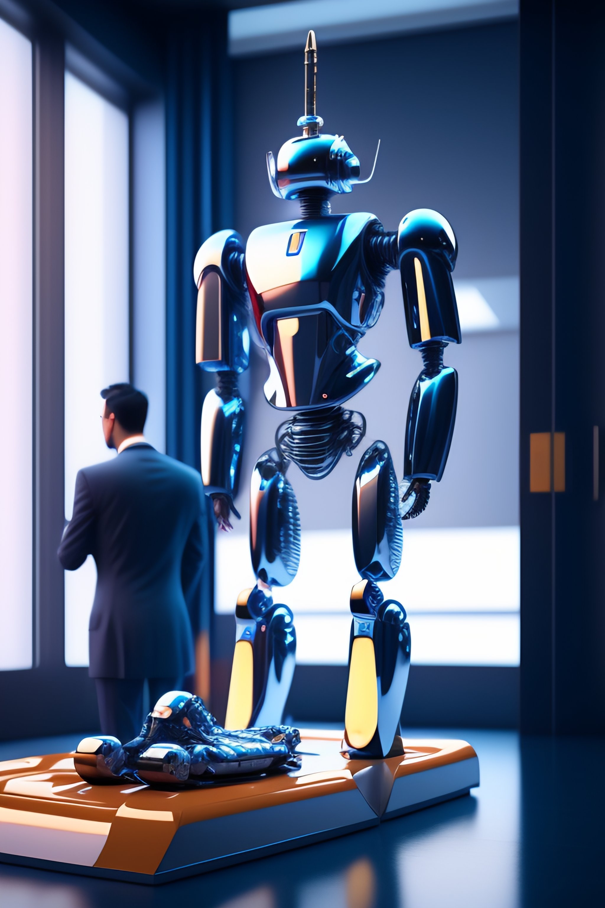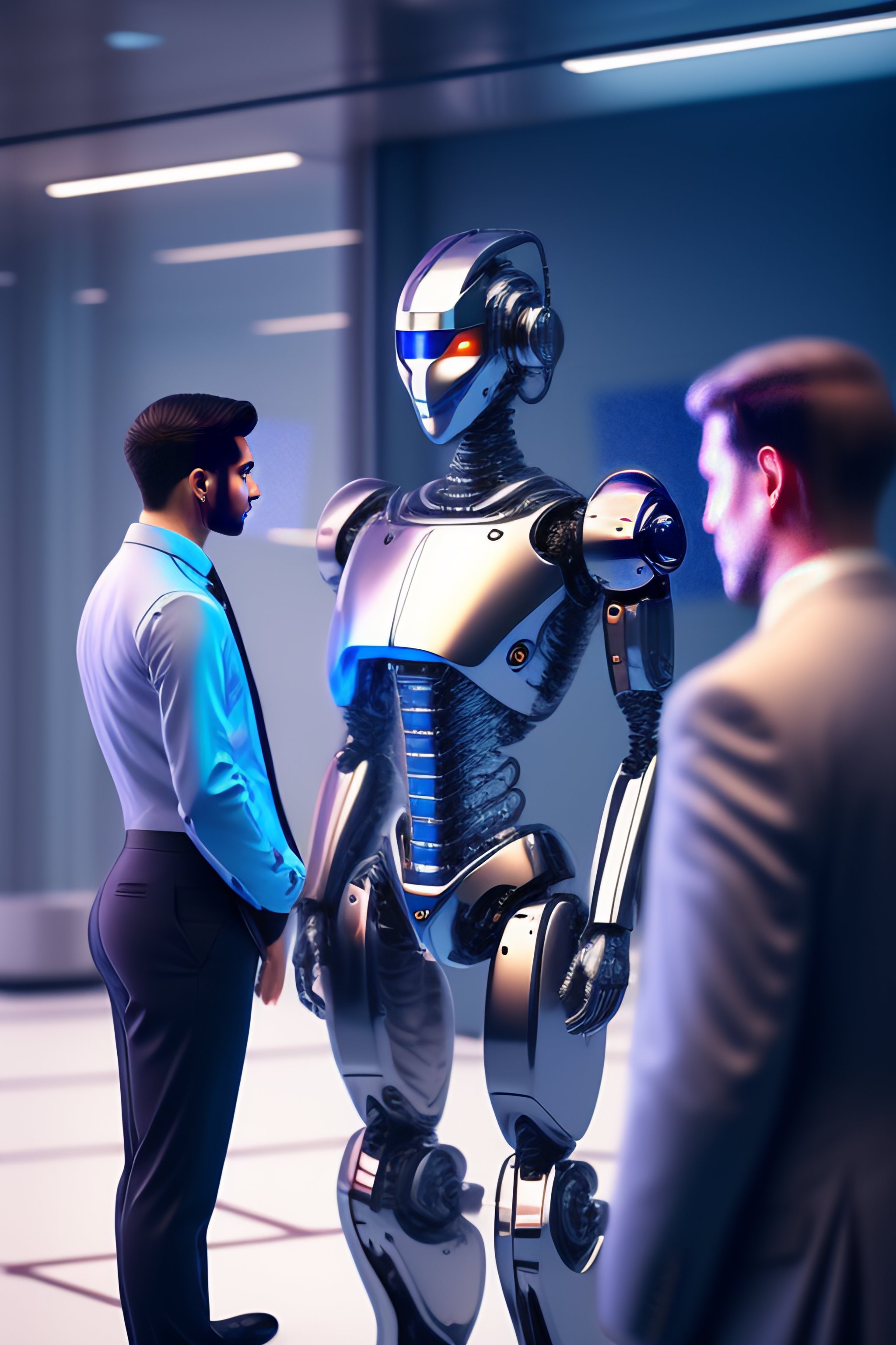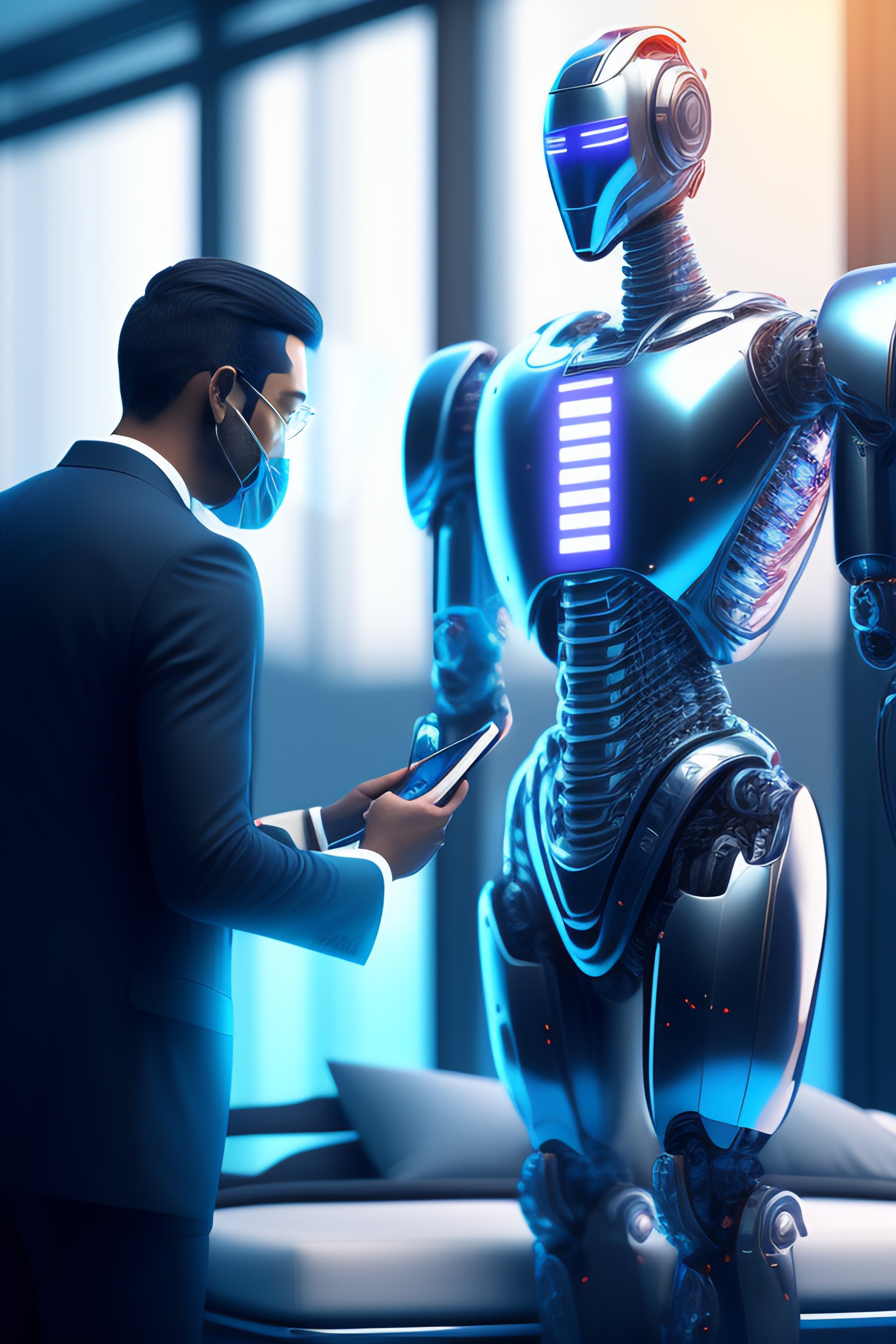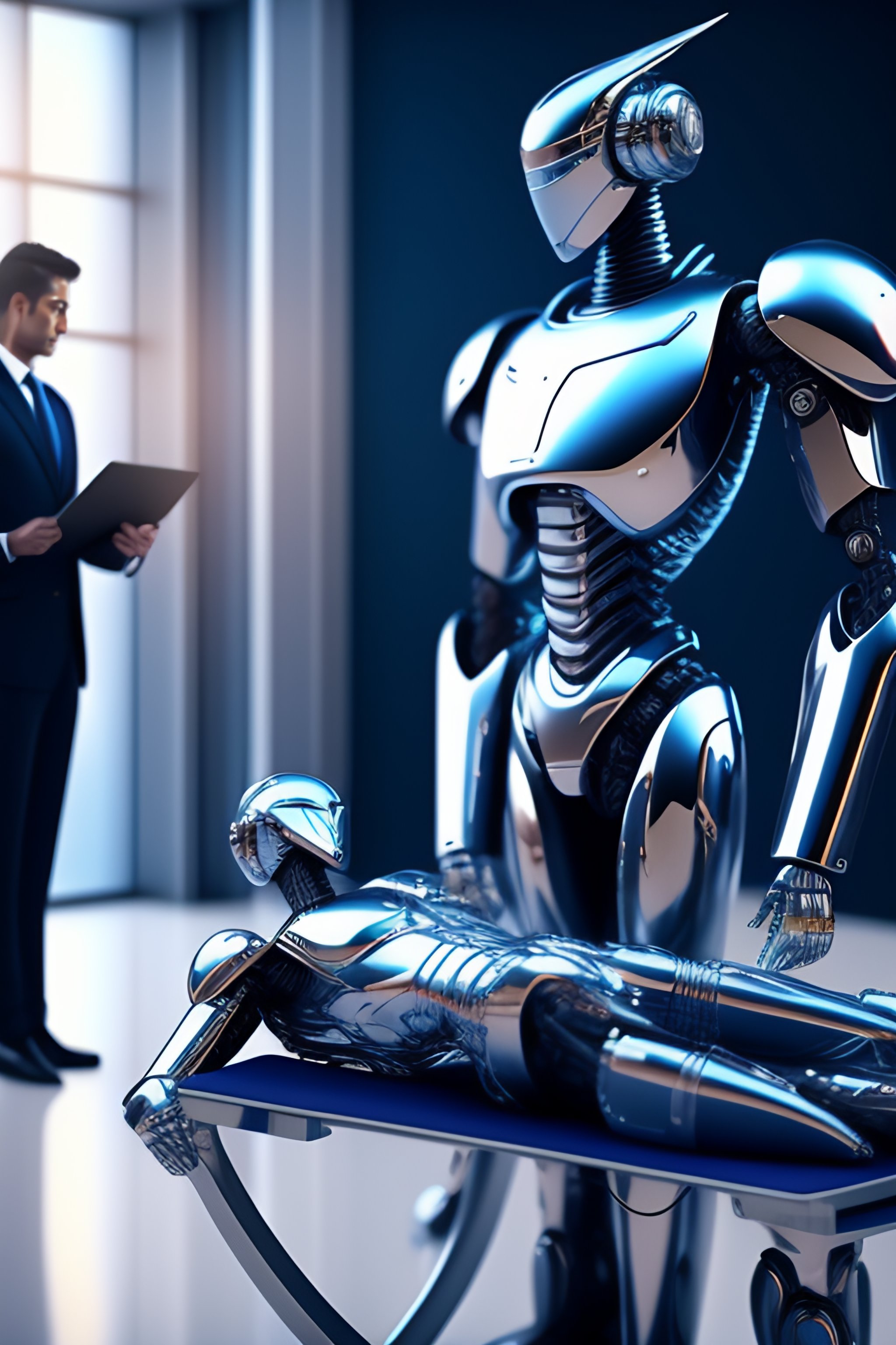 Robot doctor metallic and sophisticated, full body and center in image, in modern office consultation with human patient sick on stretcher and analysis equipment in background, highly detailed, photorealistic, artstation, sharp focus, detailed painterly digital art style, 8k octane beautifully detailed render, blue tones