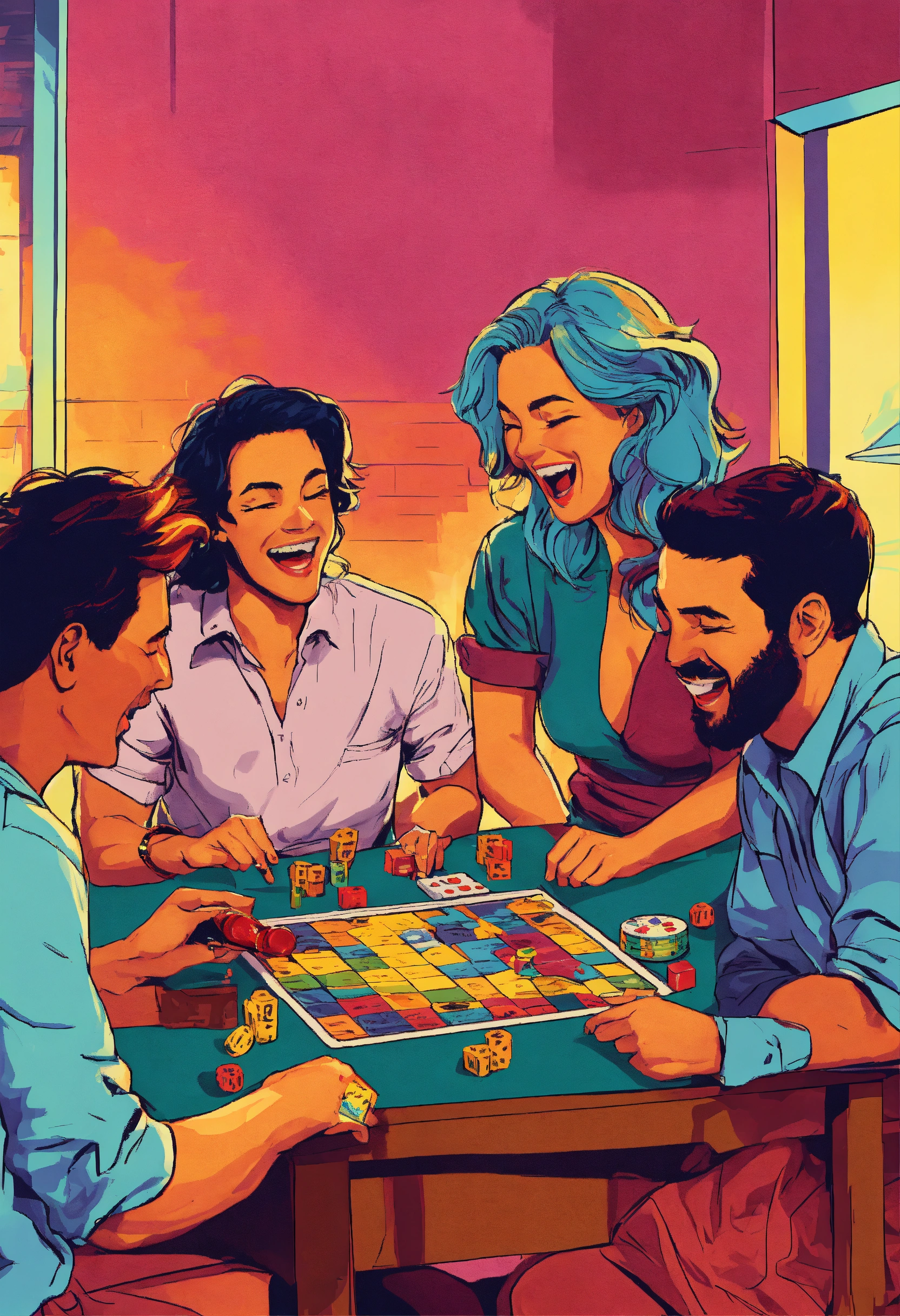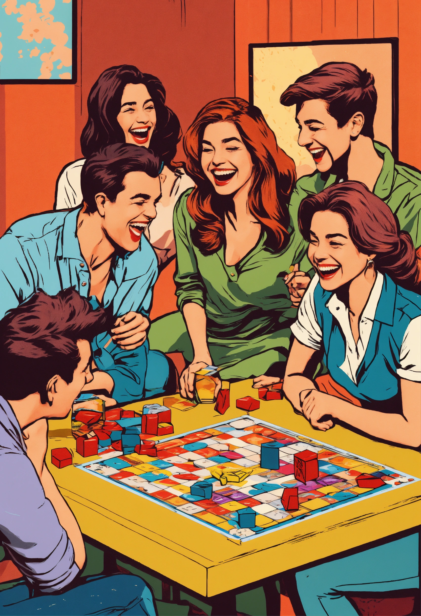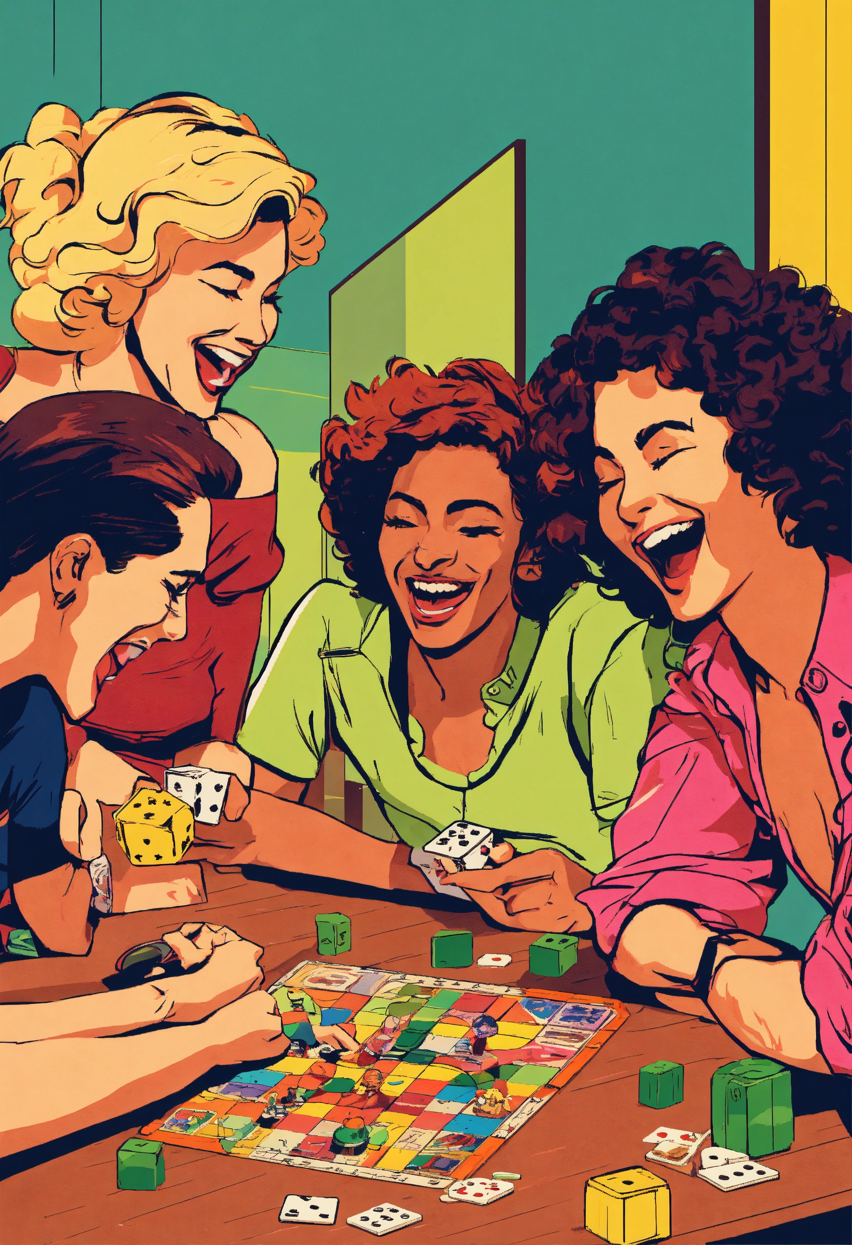 Several friends playing board game laughing without glasses pop art