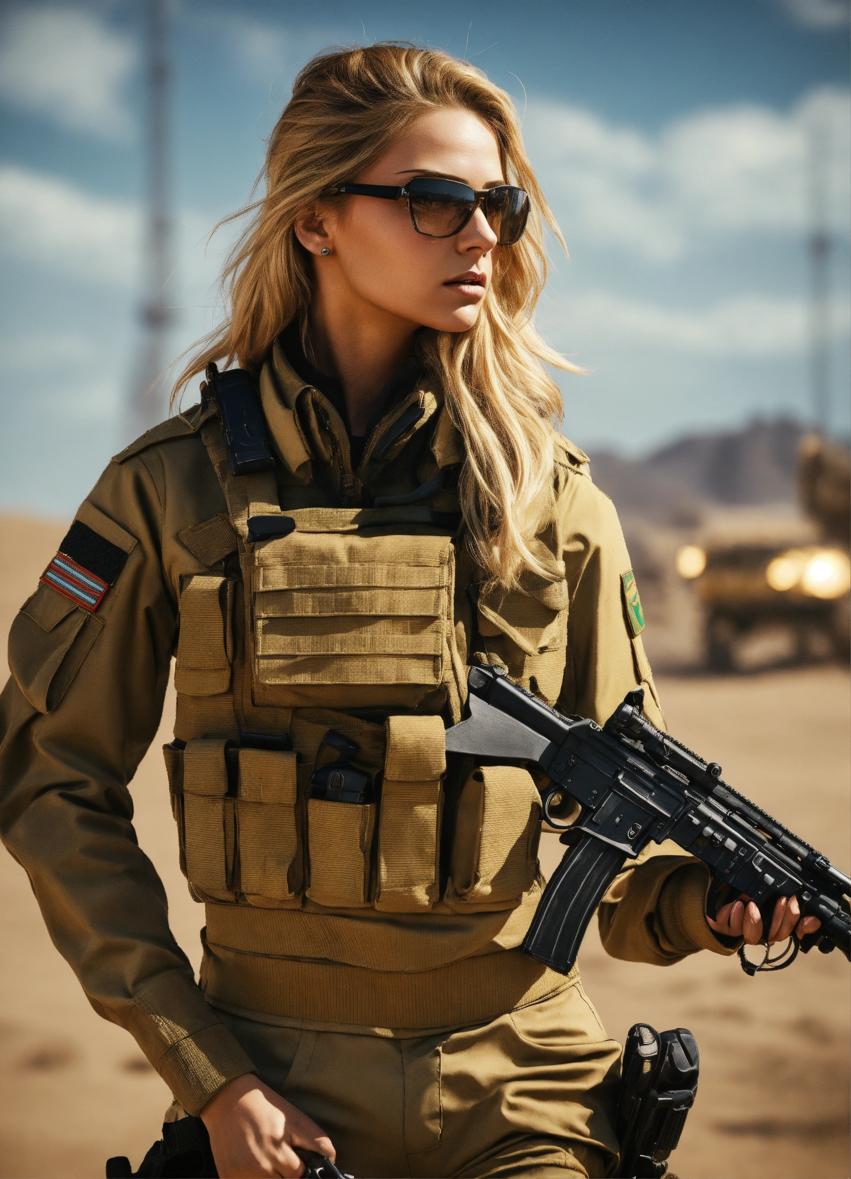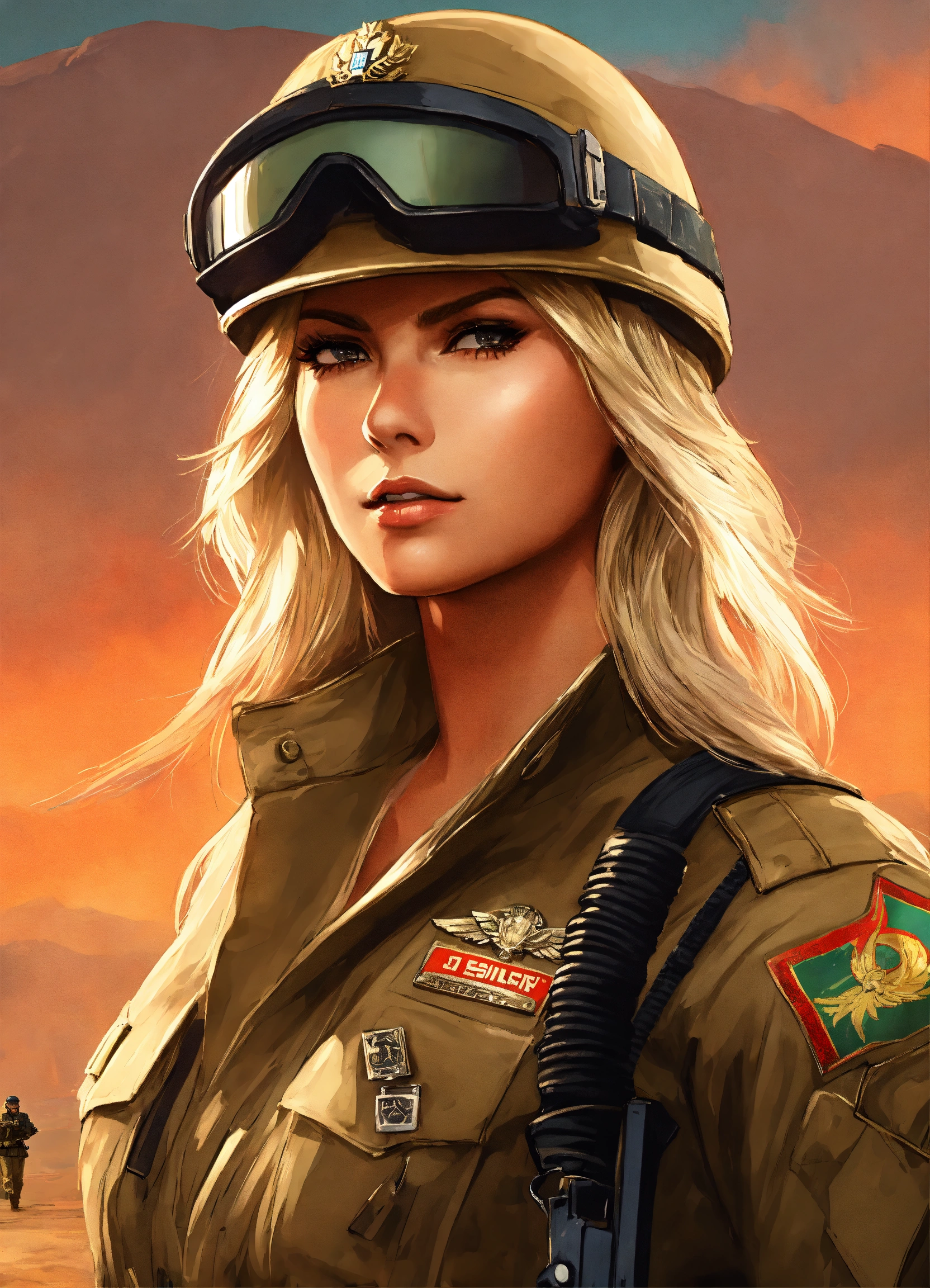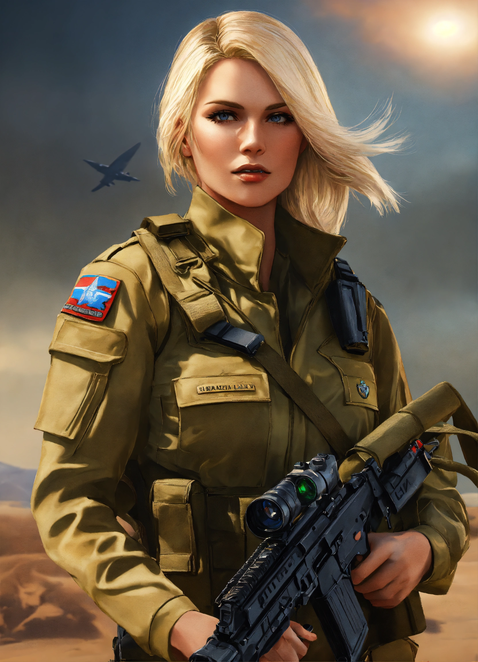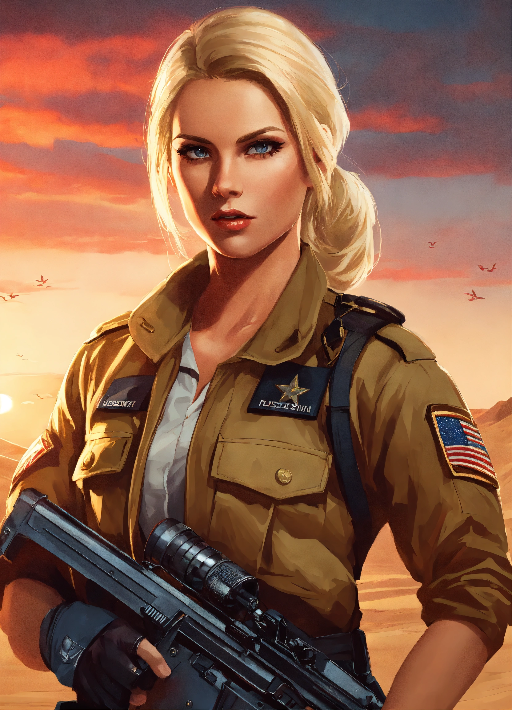 Female russin solider blonde female officer gorgeous but dangerous, leader in a desert, gta poster are style