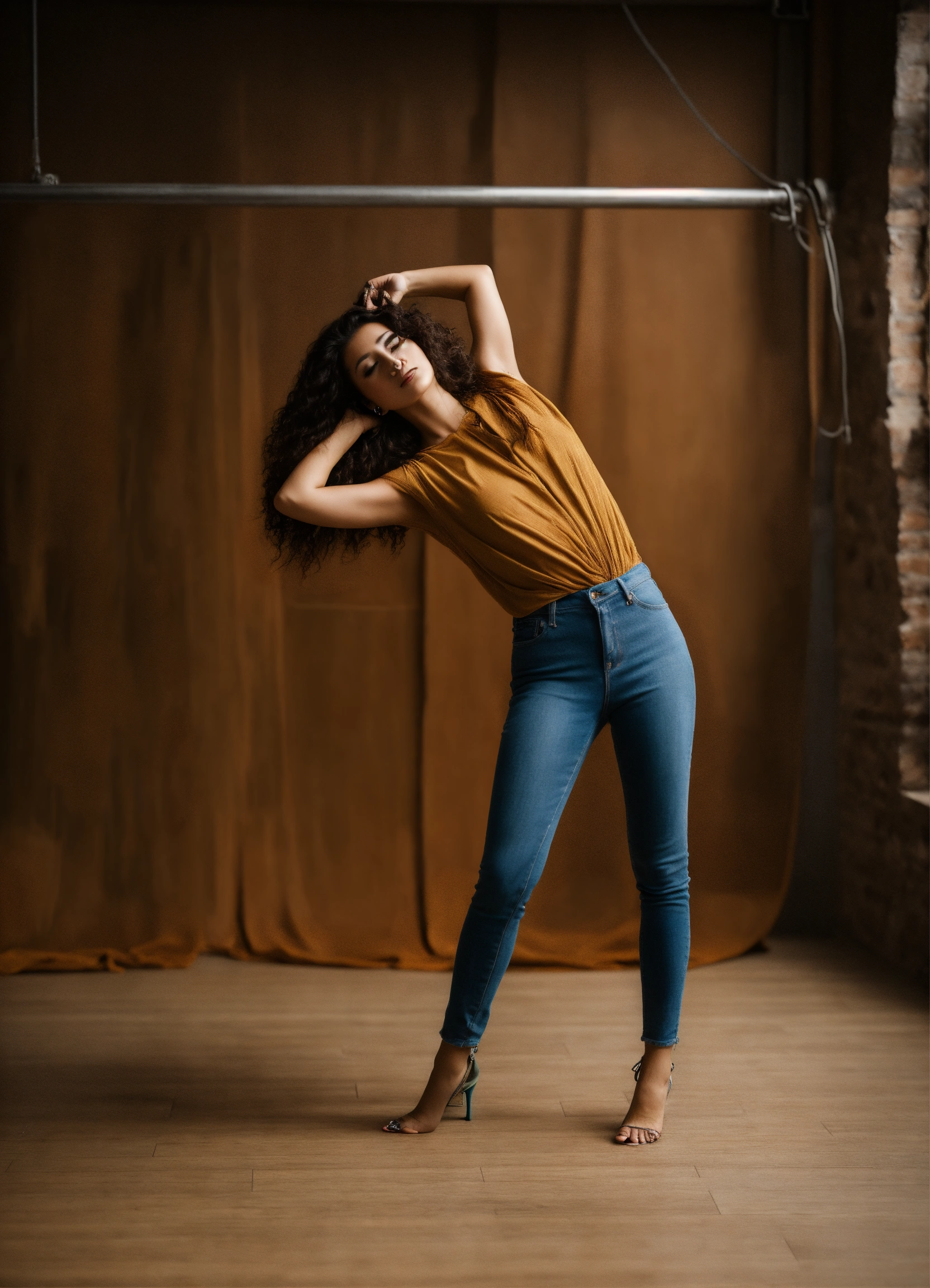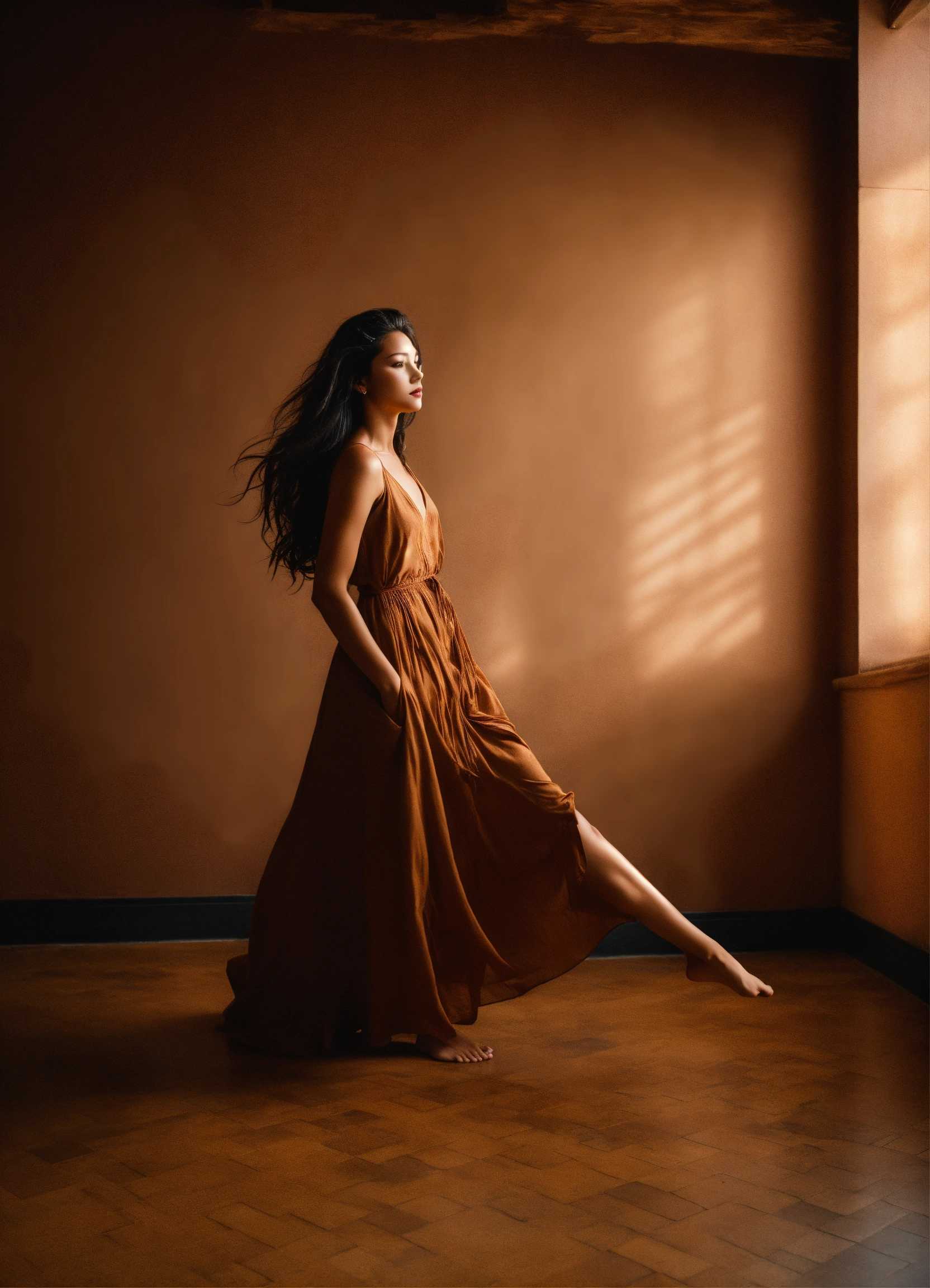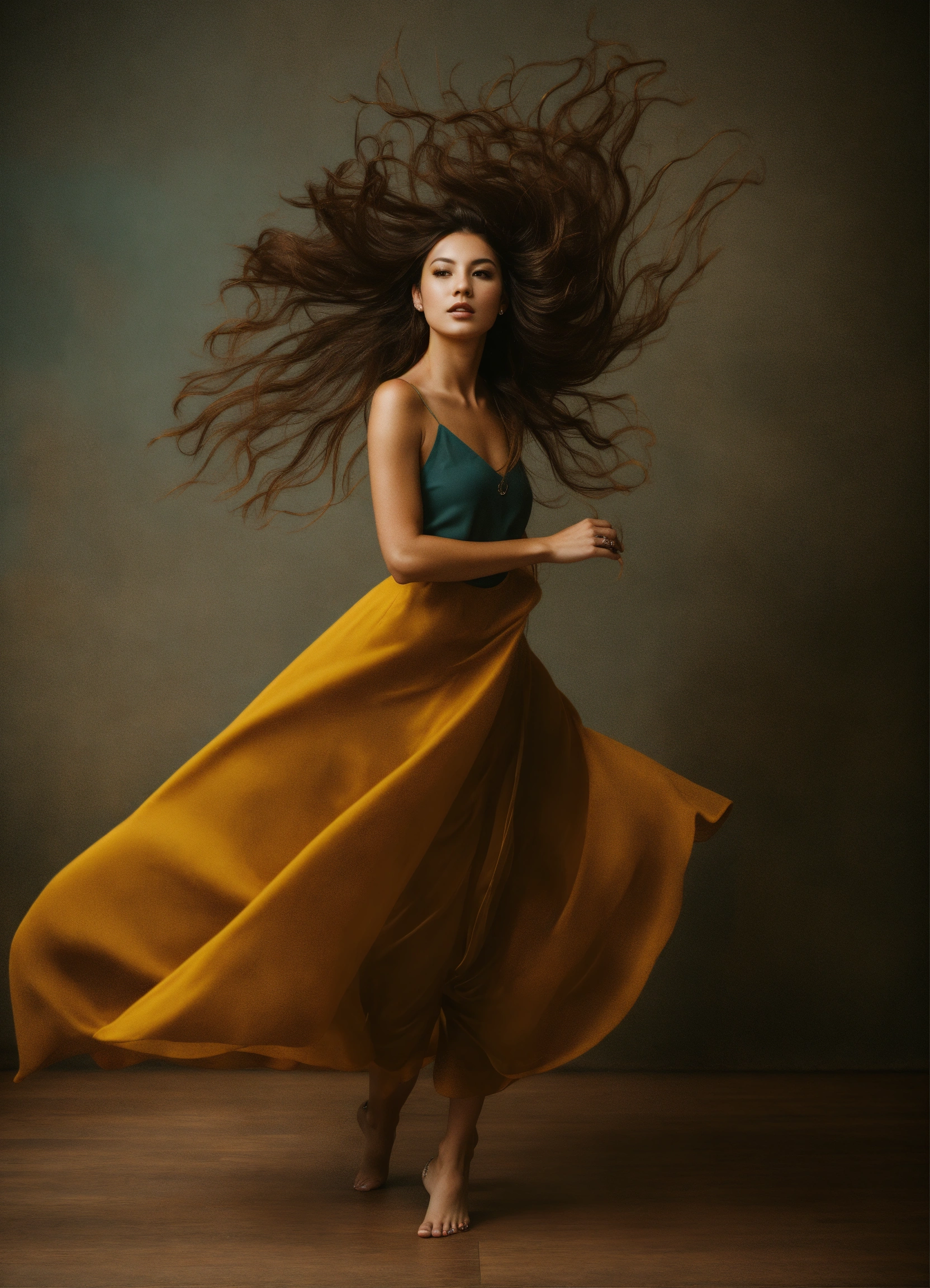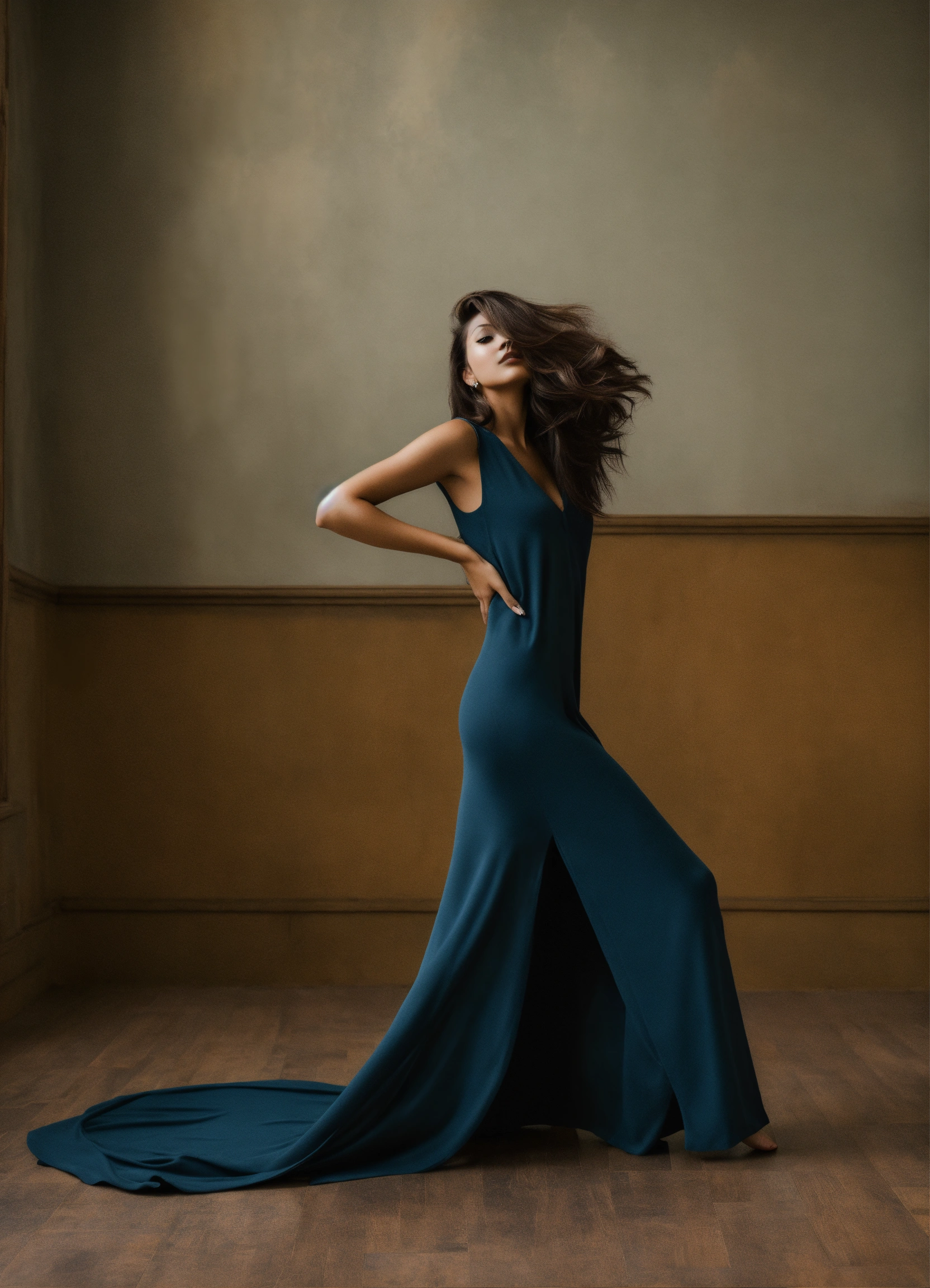 Woman with model pose posing standing, her hair reaching the floor and from the floor merging with the background and enveloping the woman