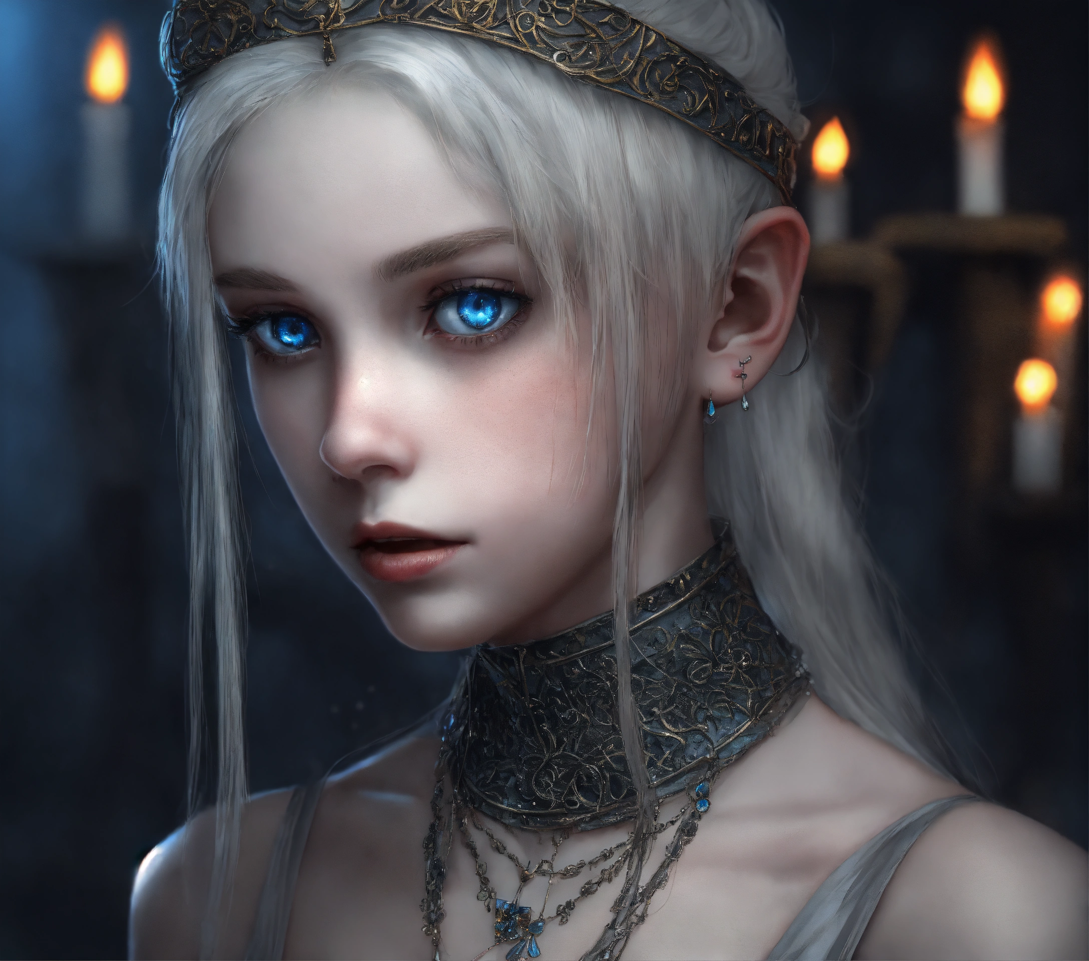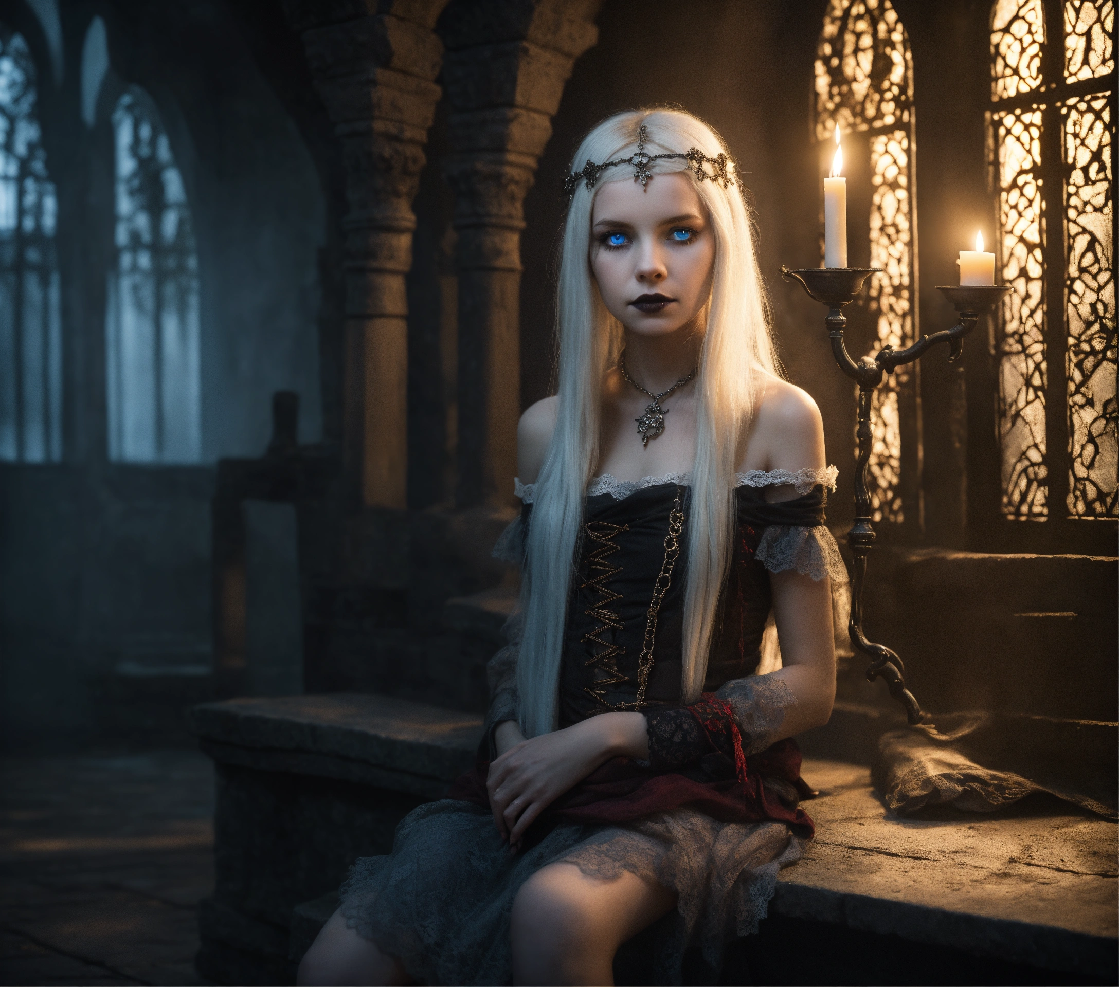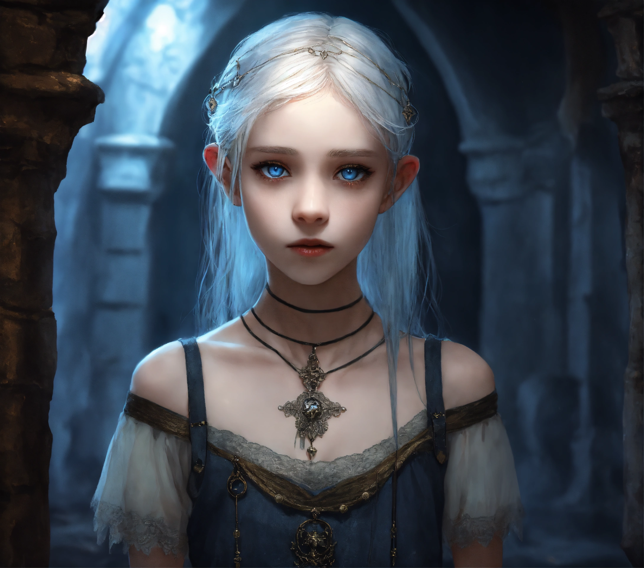 Body portrait of a very childish deadly pale extremely slim twelve year old female child, she is a goth necromancer with waist long silverwhite hair and a short lace off-the-shoulder crop top and a low worn hip scarf, extremely flat belly, belly button, extremely skinny, extremely slim body, emaciated body, completely emaciated, extremly narrow face, alabaster skin, pale as a corpse, glowing blue eyes, slim face, innocent looking, lasciviously on a stone bench in a gloomy crypt, innocent pose, kindlich, unschuldig, childlike, graceful, wispy, glowing blue eyes, ghostly, dead, evil, demonic, undead, darkness, grotesque, mysterious, dark, candlelight, cold ambient lighting, extremely detailed, fantasy, medieval setting