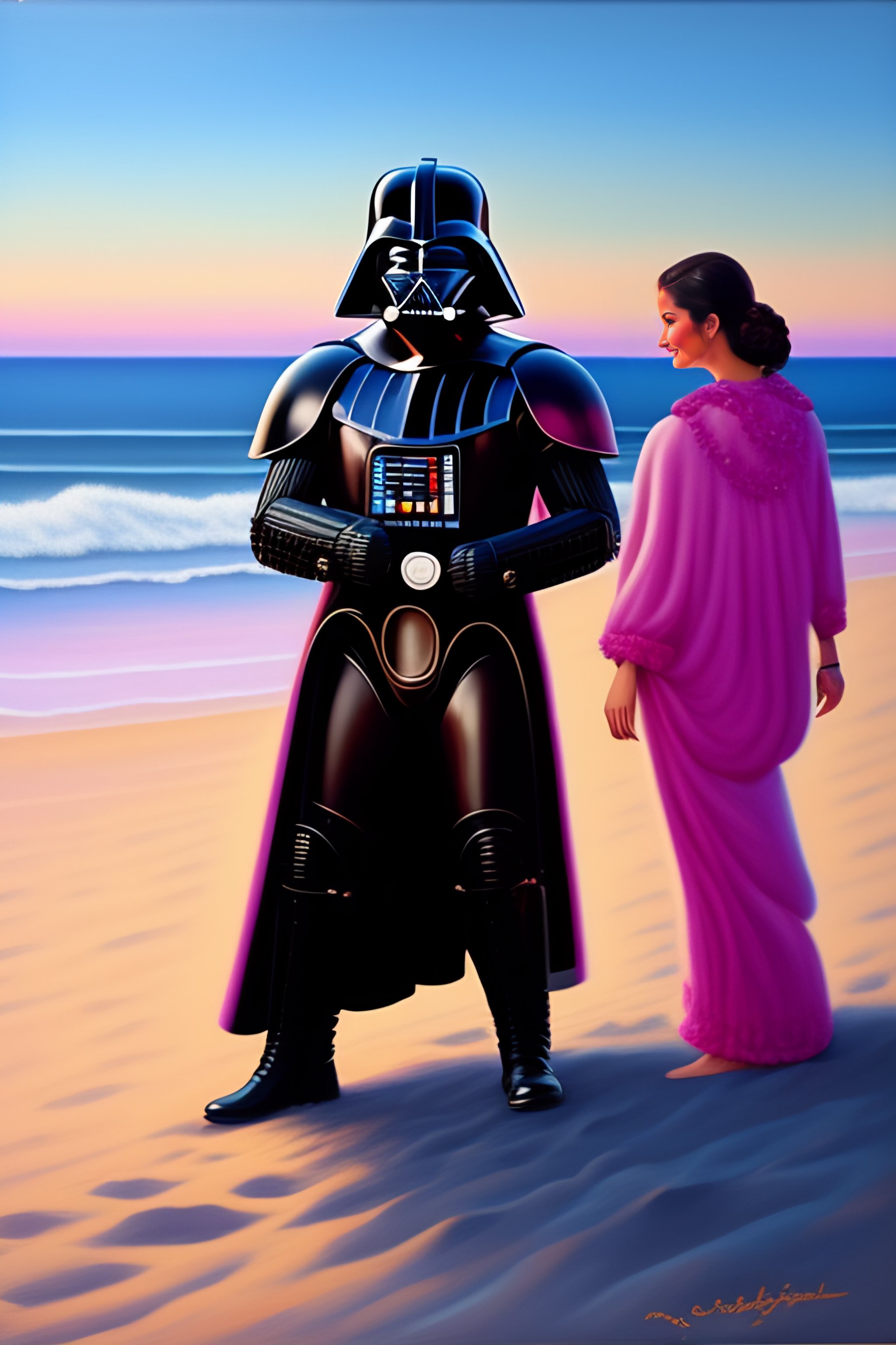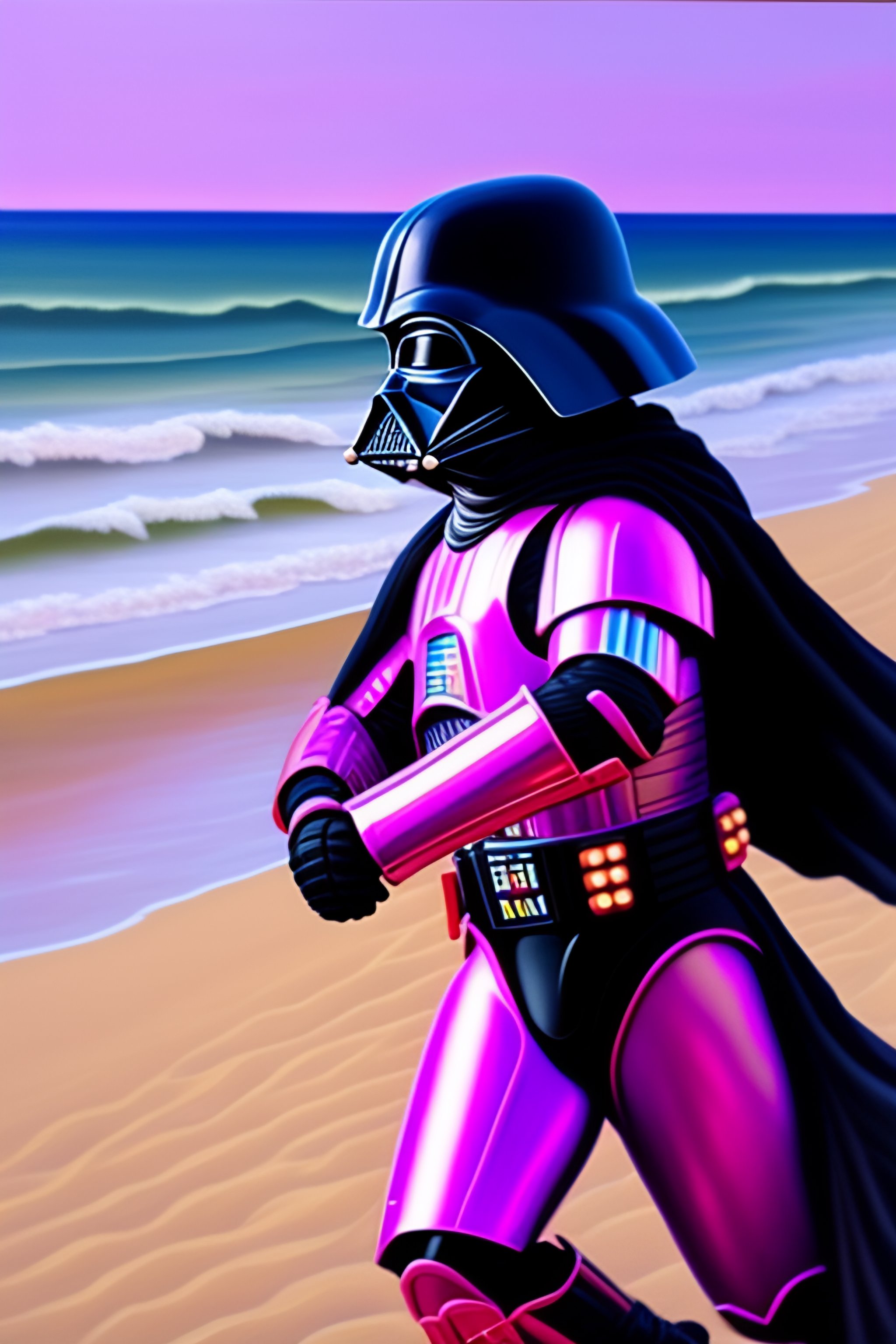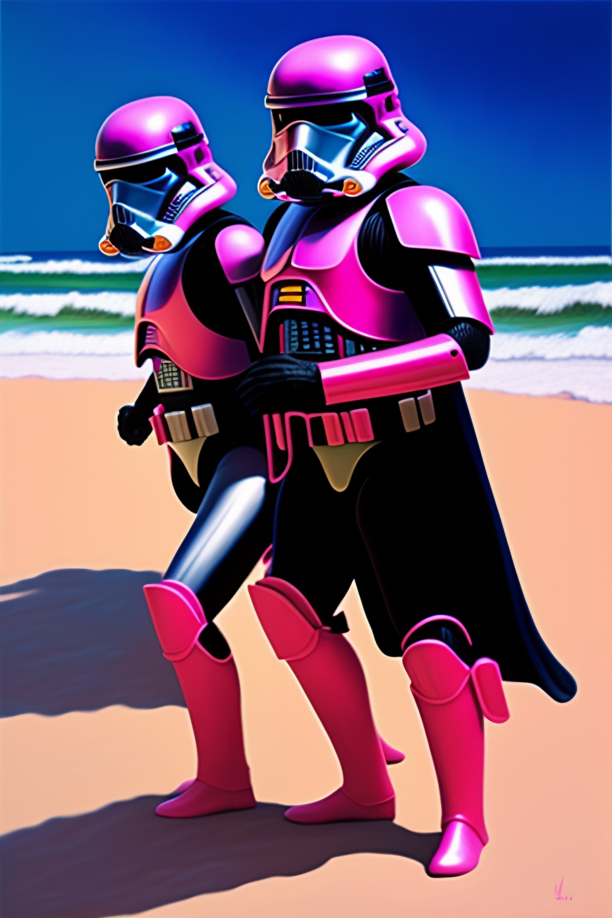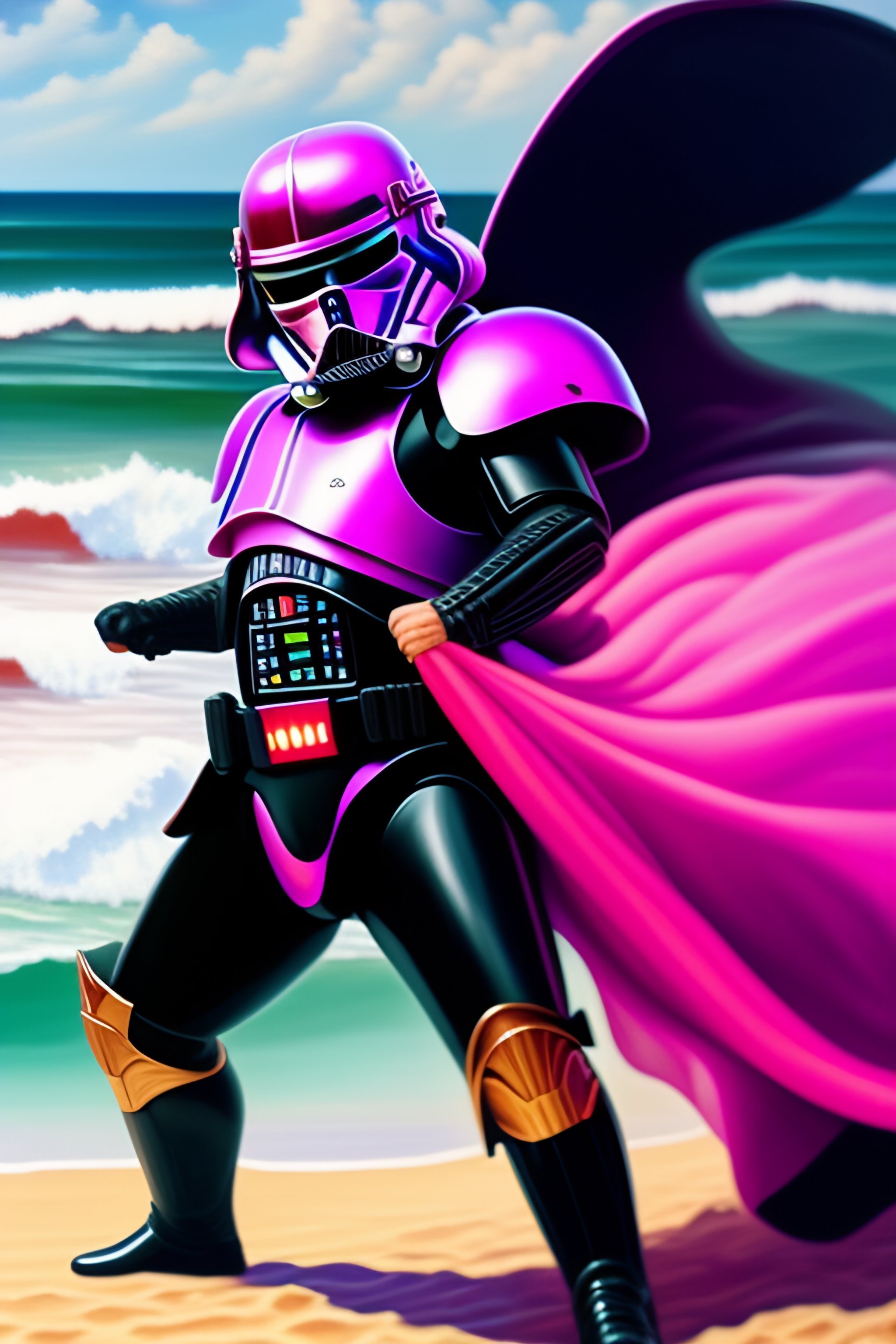 Darth vader dancing with stormtroopers at the beach, wearing a pink armour, oil painting, excellent quality, max details