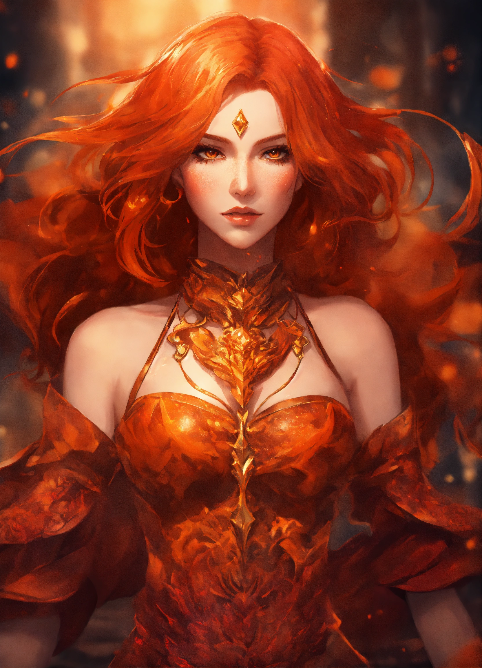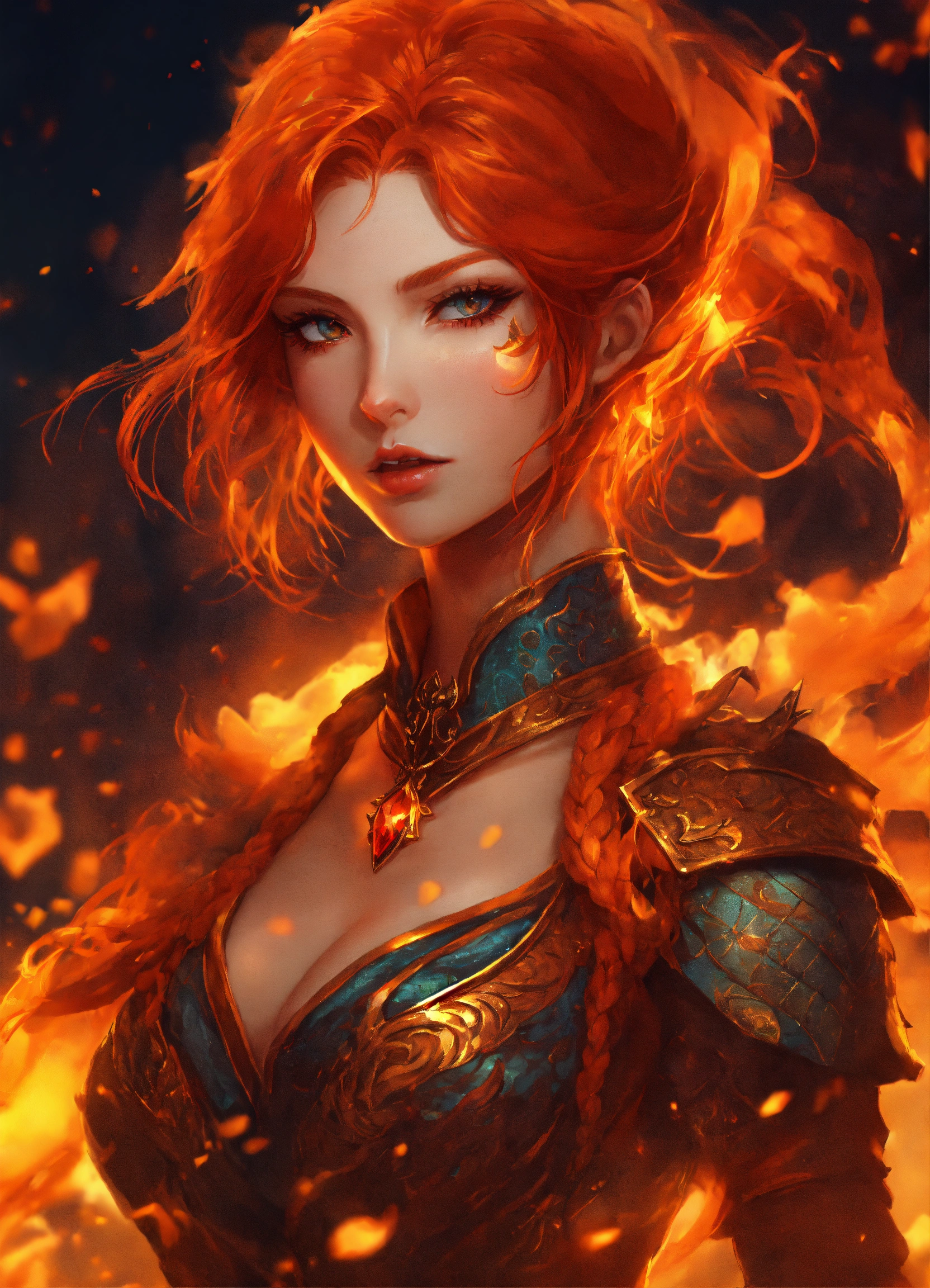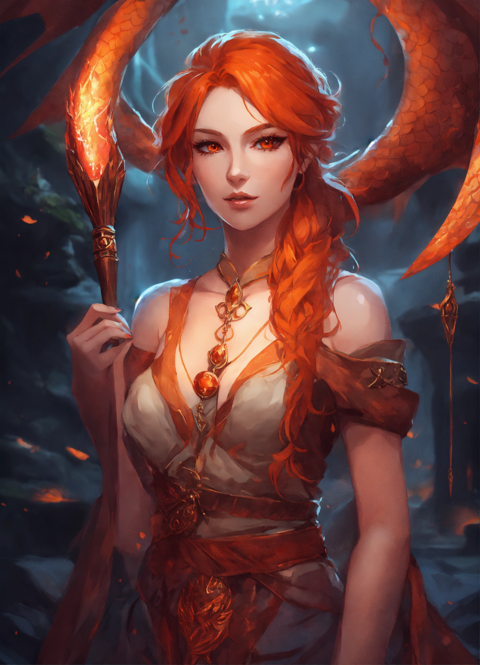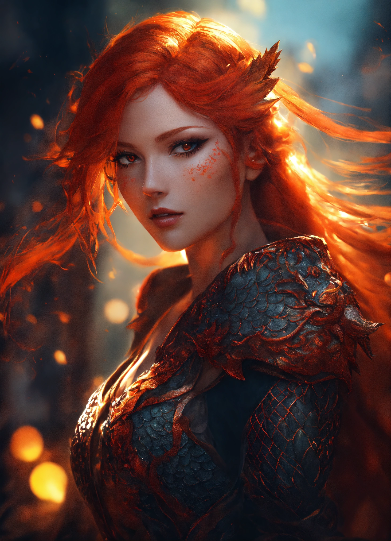 Draconic traits to draconic human woman with reddish orange hair, draconic claws with scales on hands, fantasy ambience, anime style