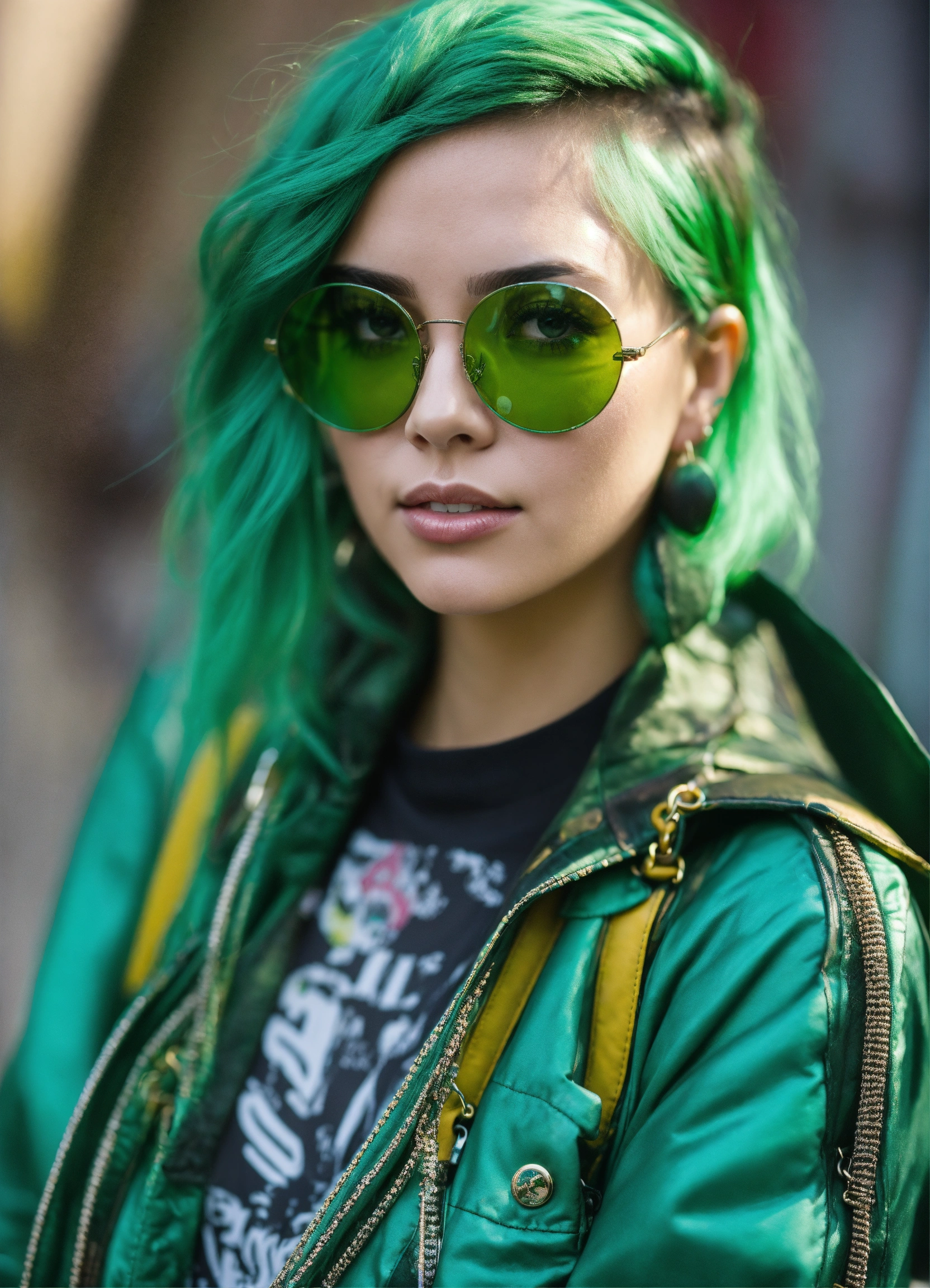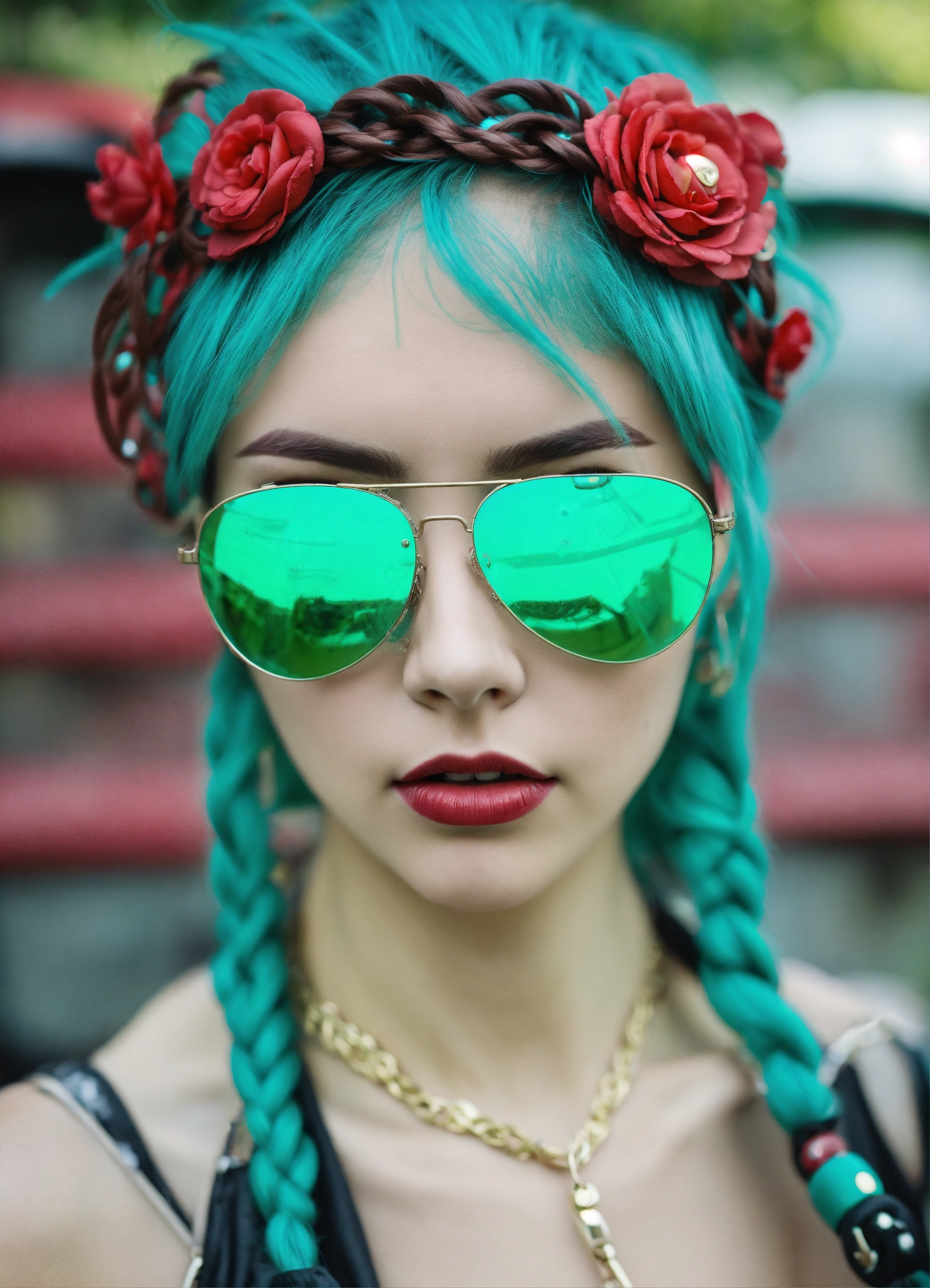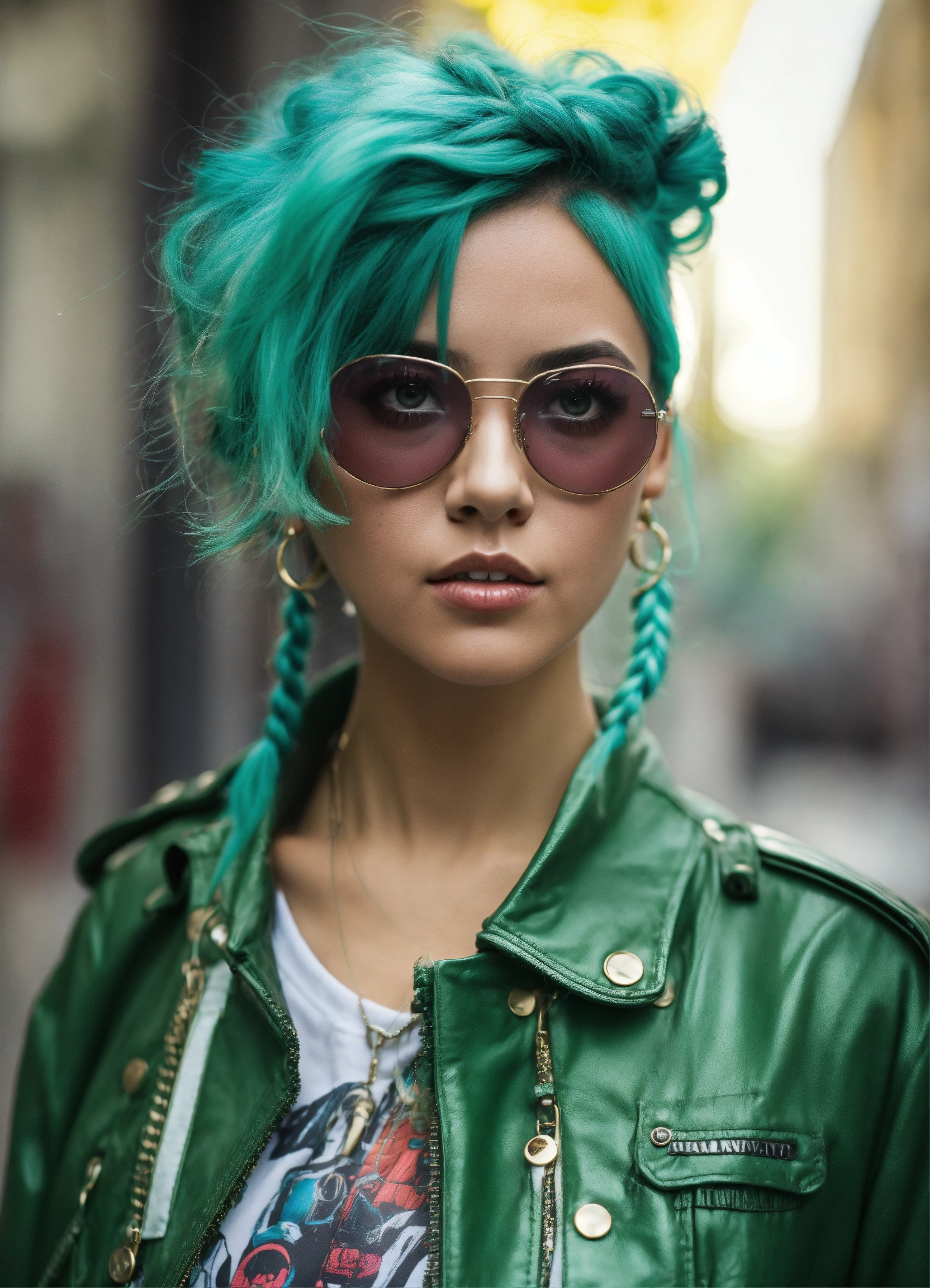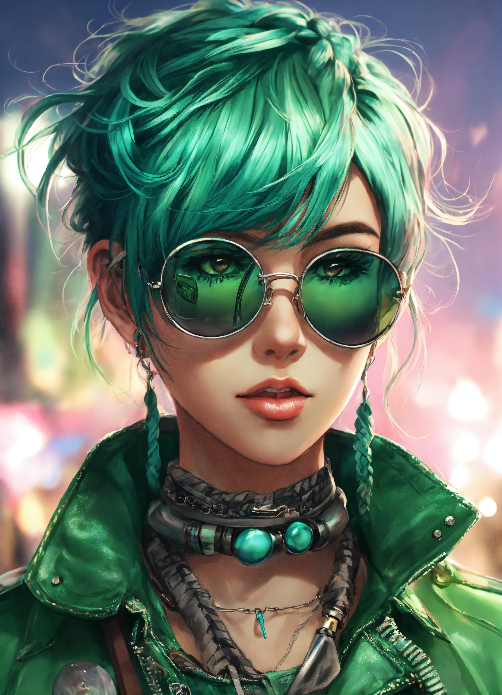 Mujer metalera, trenzas, lentes obscuros, chaqueta de cuero punk, estilo manga anime, tonos verde aqua