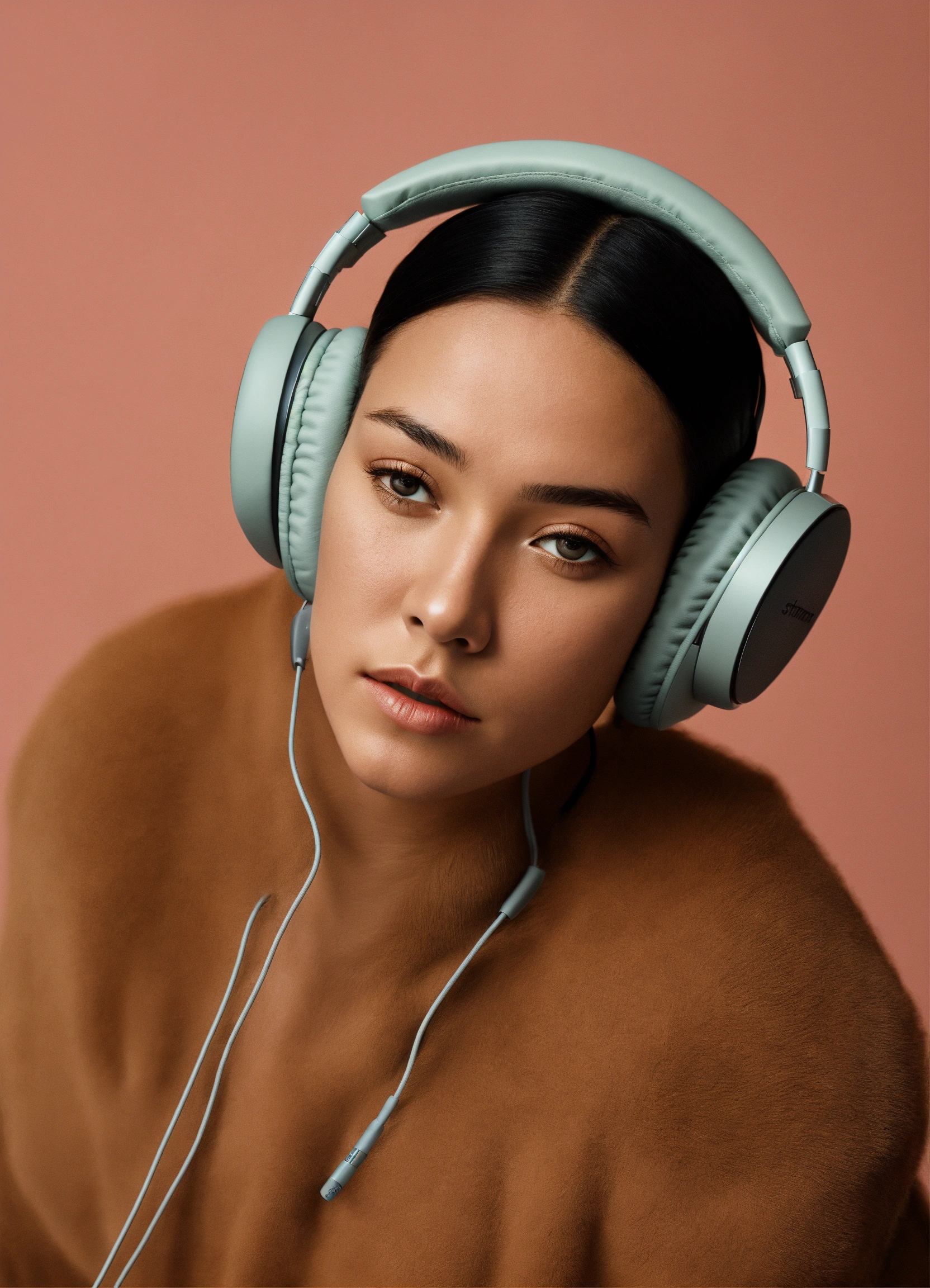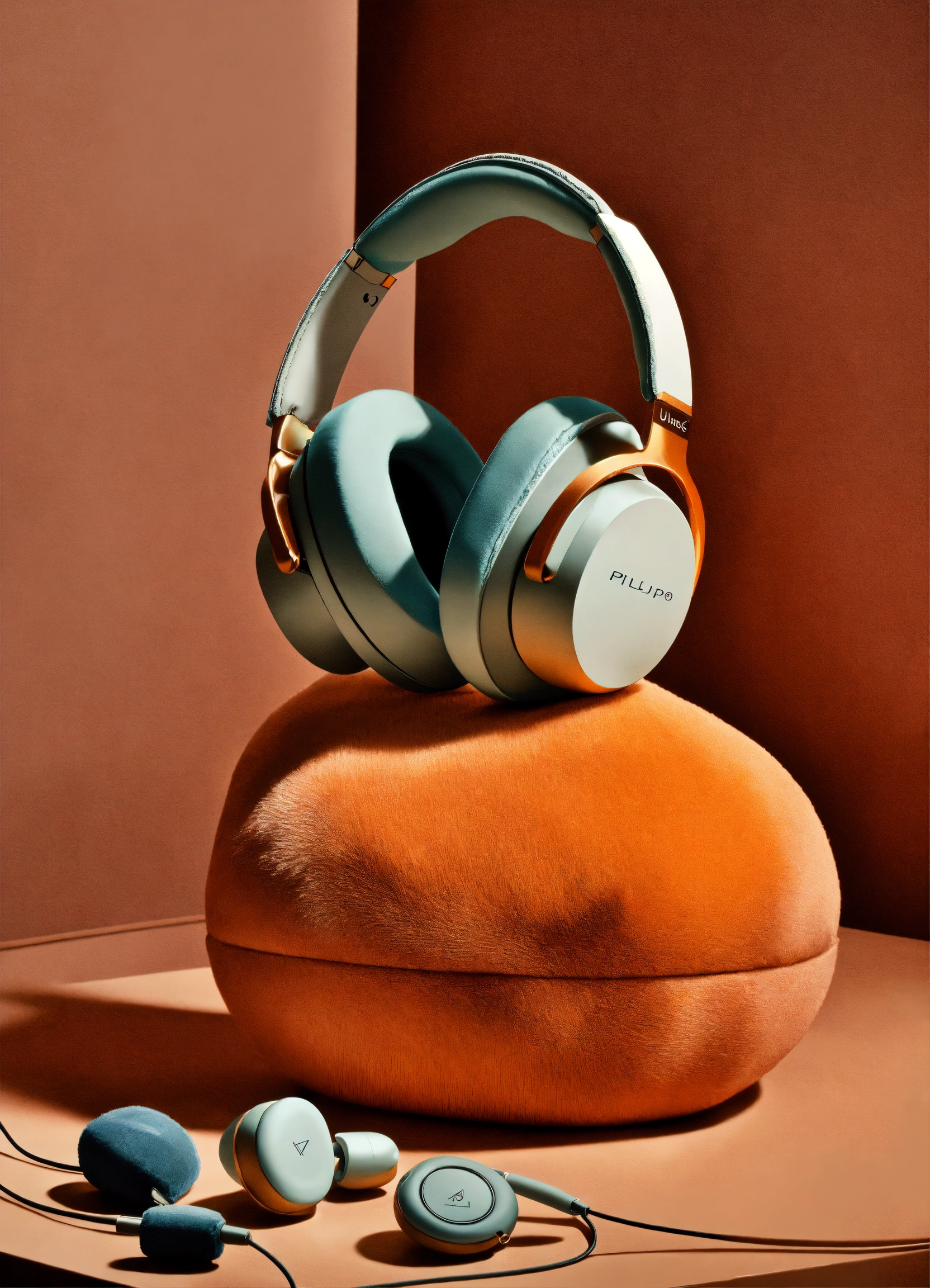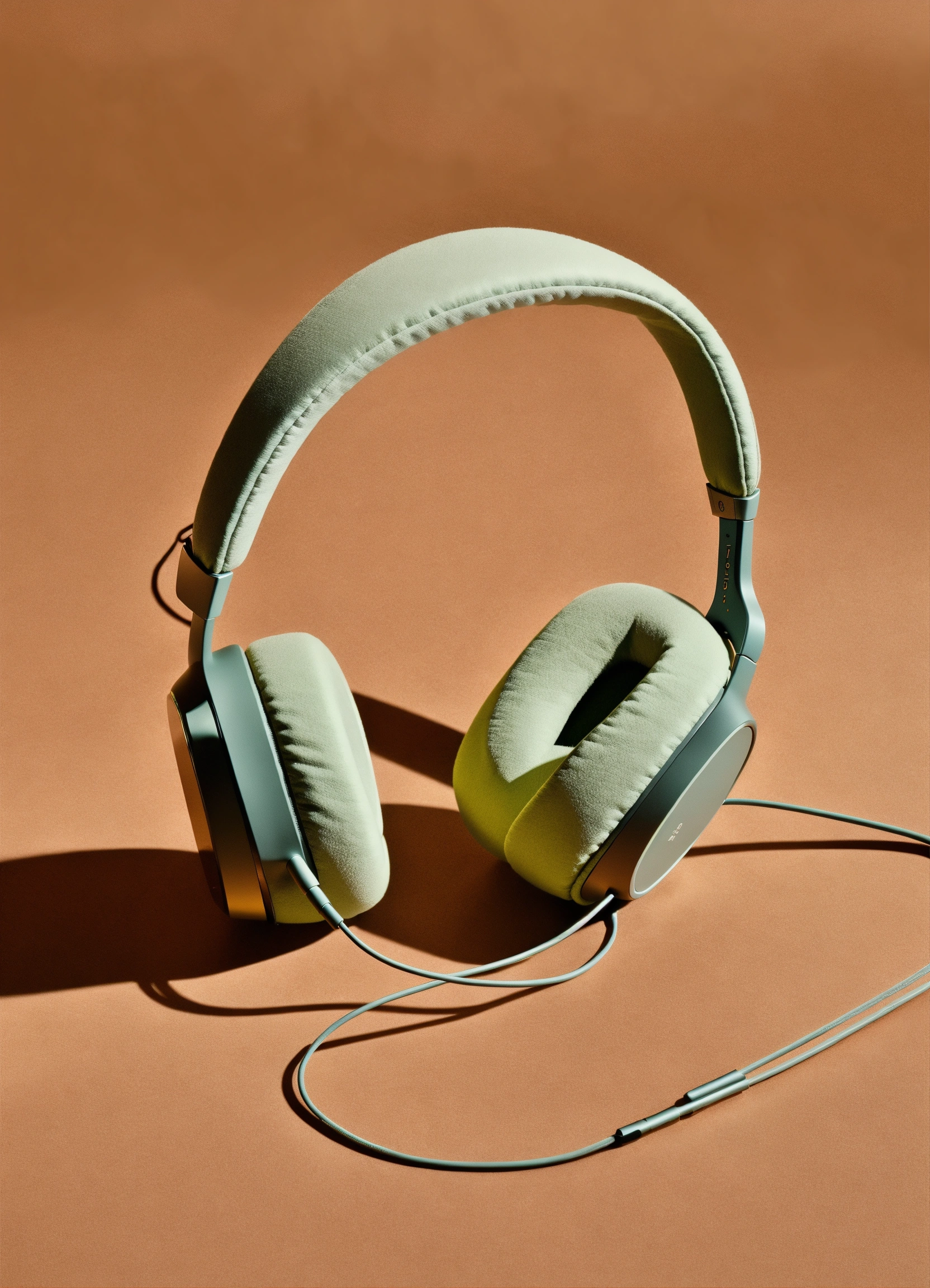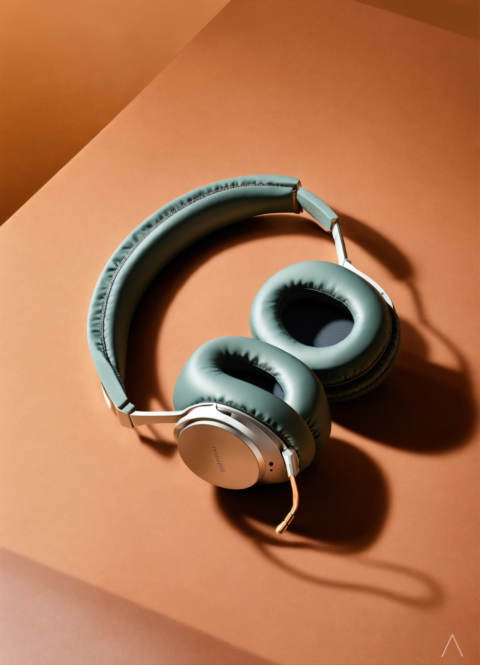 Product placement scene, unbranded headphones2.5, minimalist setup, plush earcups, sleek headband, muted color scheme, ultra high resolution, style of philippe starck