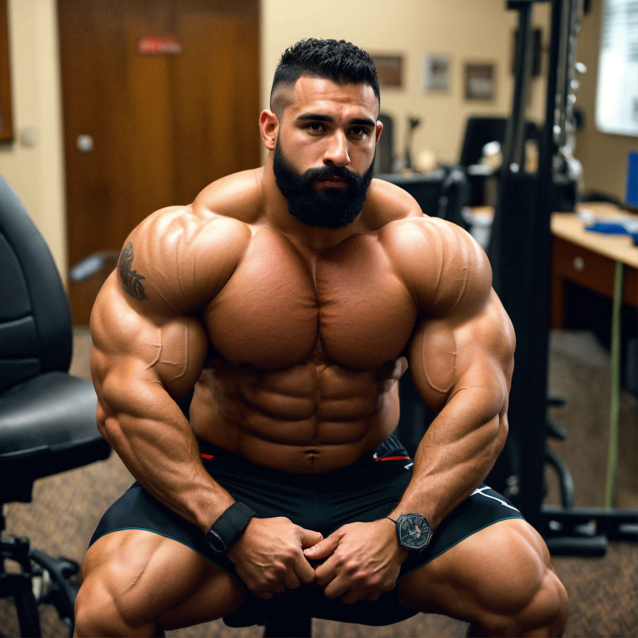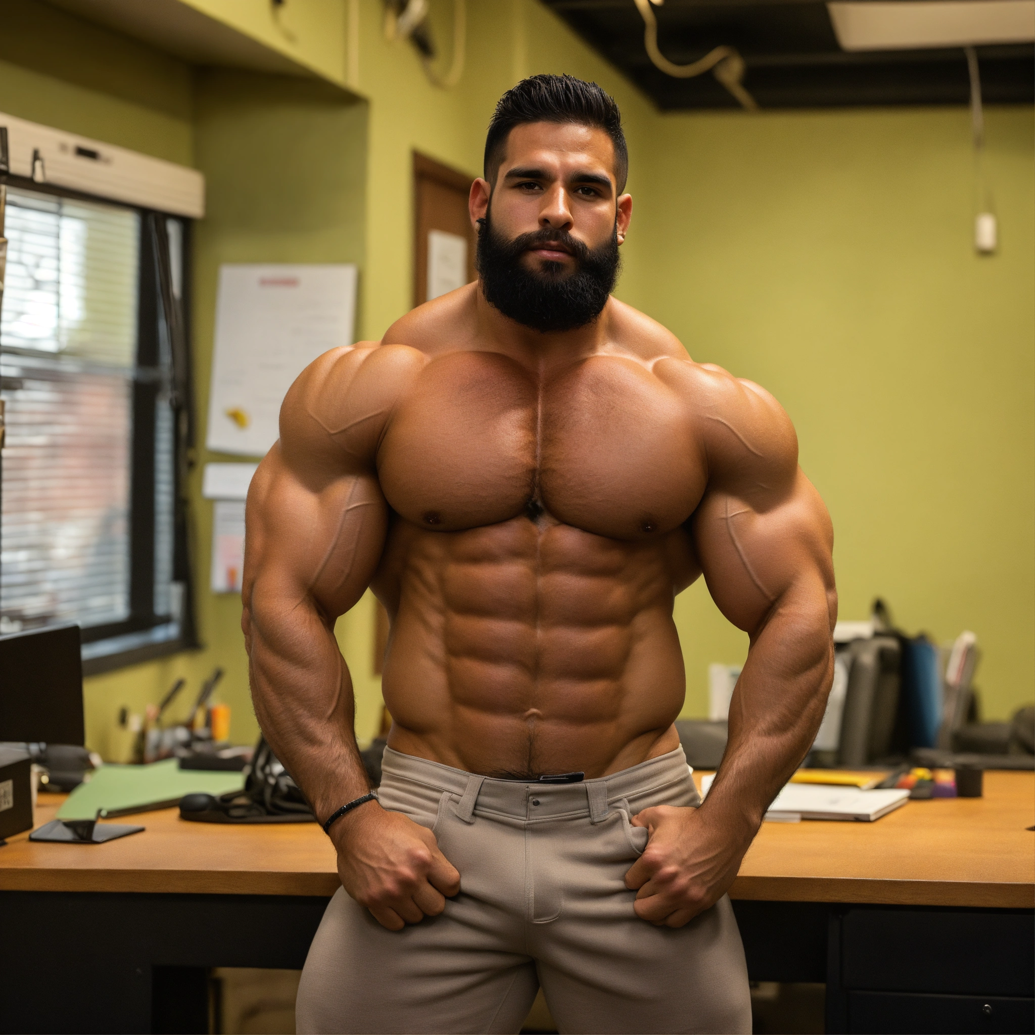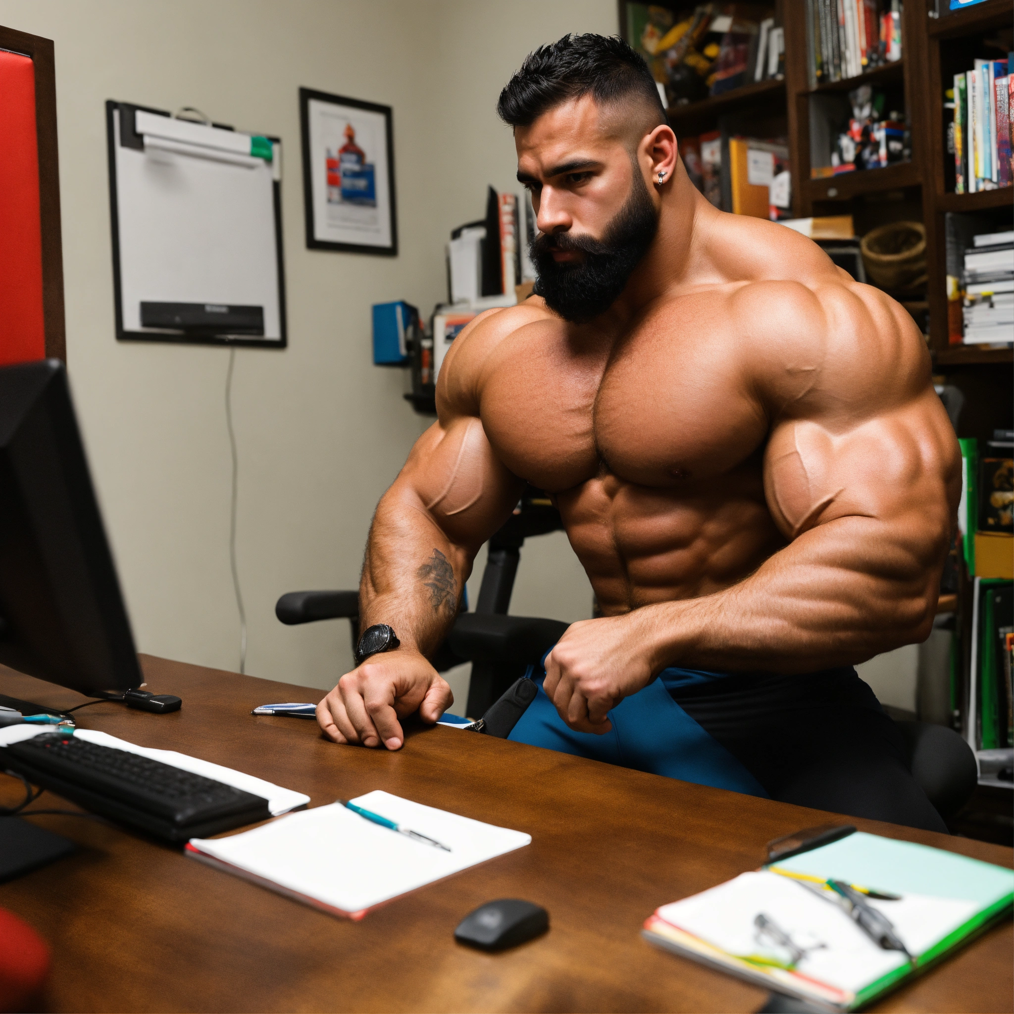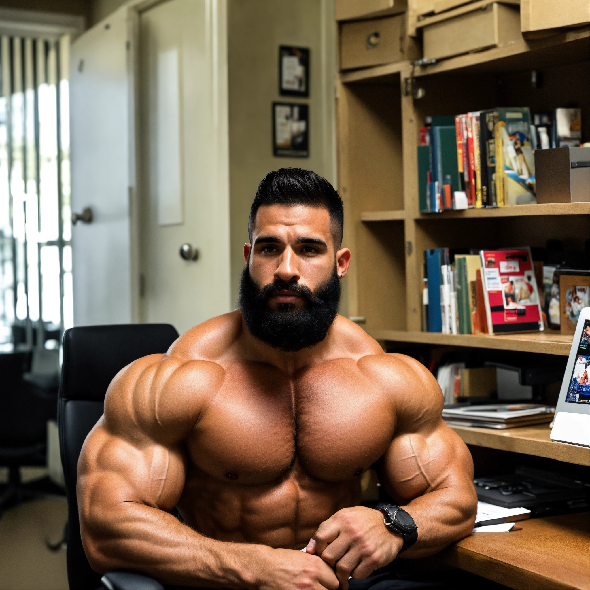 30-year-old hairy puerto rican man with big muscles, big bodybuilder, body like a wrestler, at work in his office