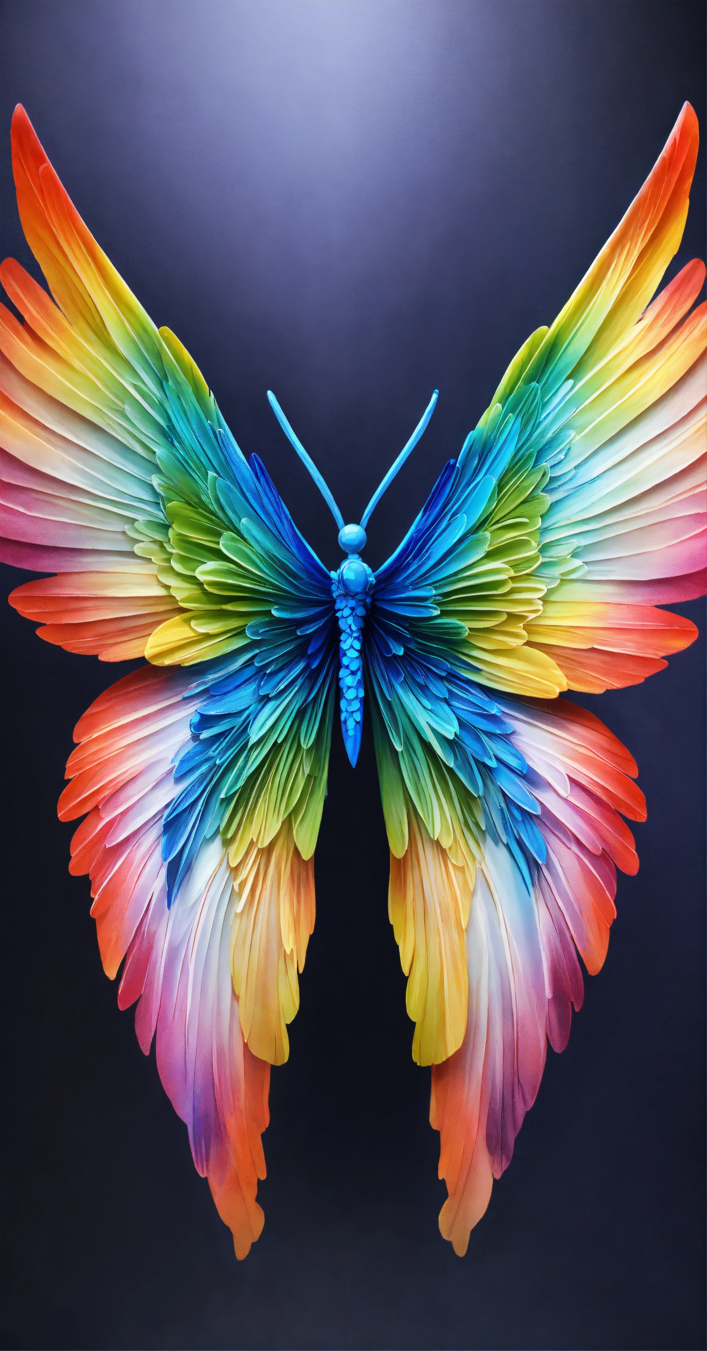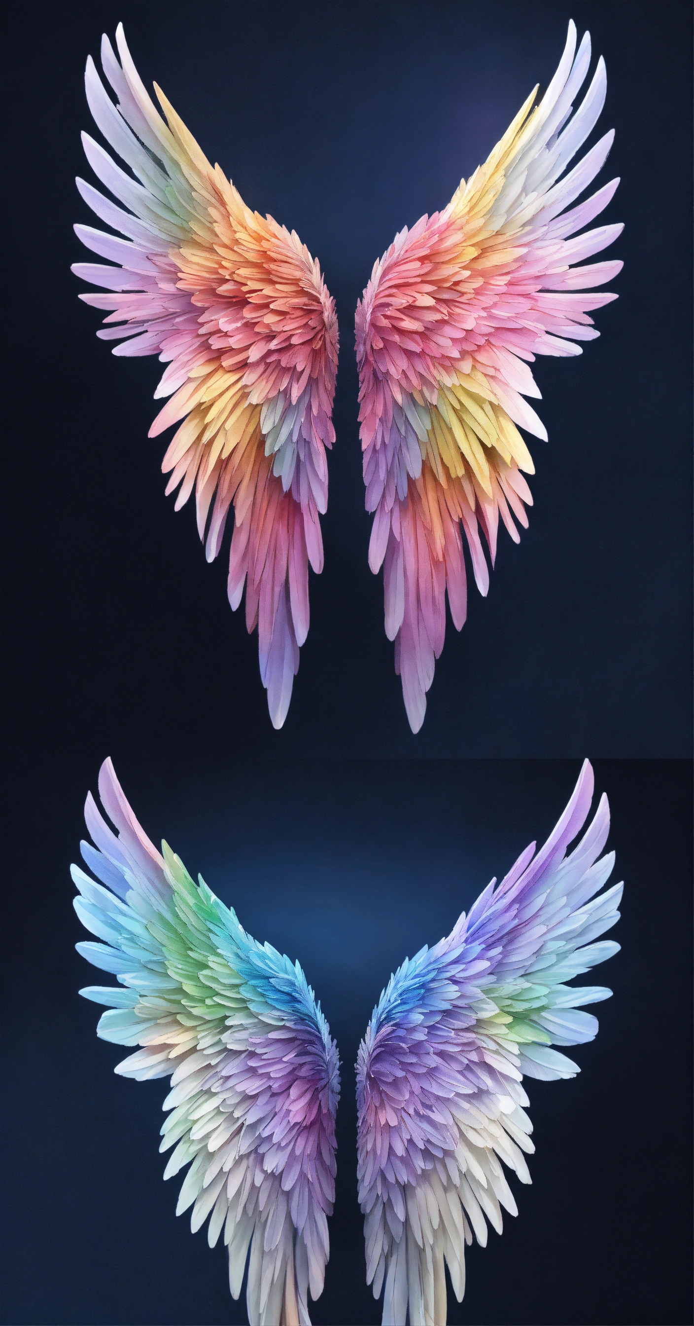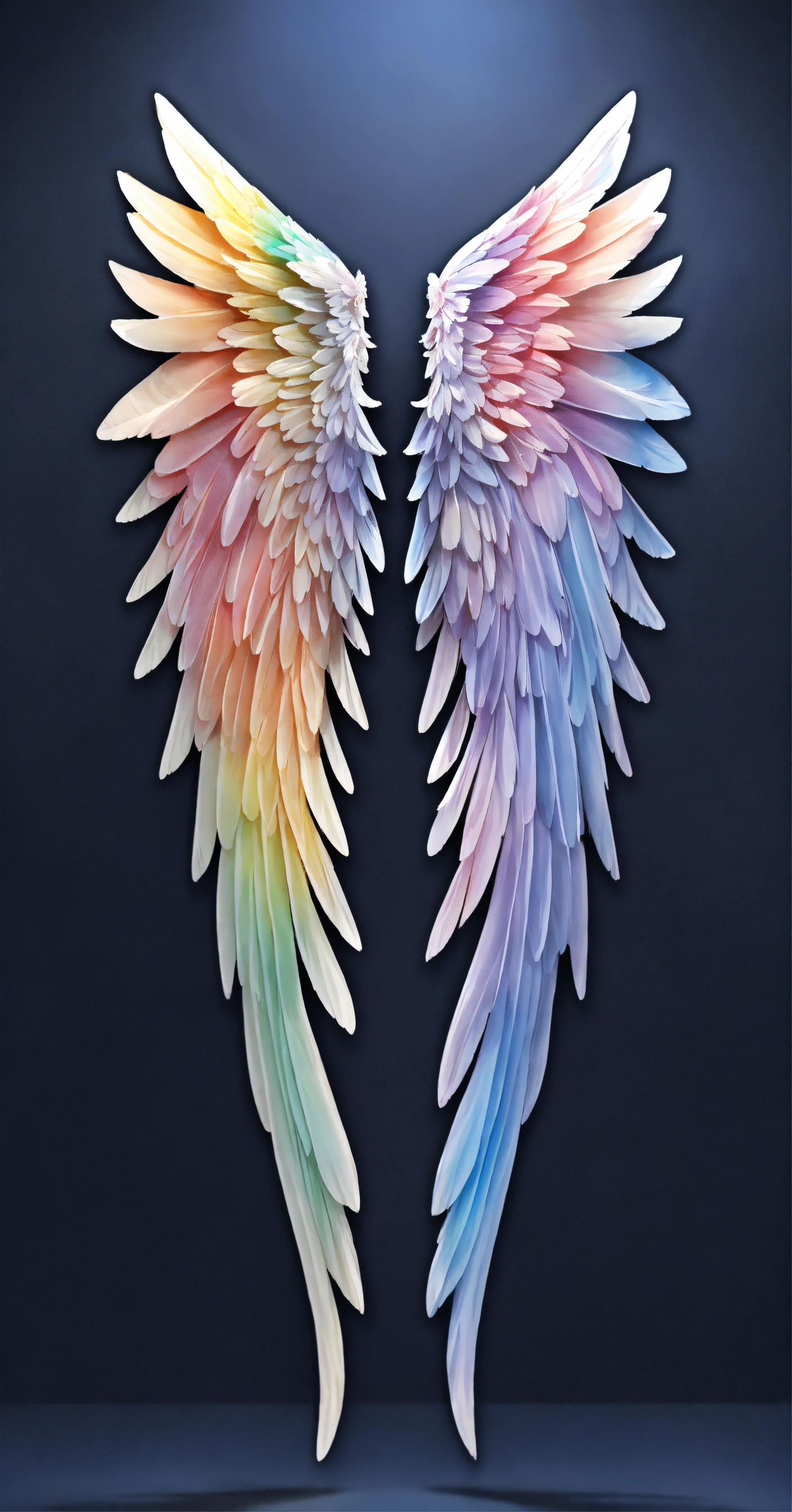 Beautiful and perfect small angel wings in soft rainbow colors, detailed and defined and at the same time some white details. just a pair of small full soft rainbow colored wings and some white details. hyper-detailed and hyper-realistic wings. wings with a slight decoration in soft rainbow tones and white details. small wings complete both the right wing and the left wing, the background is dark blue, 3d, masterpiece. hd. realism. high resolution. high quality. digital art. 8k
