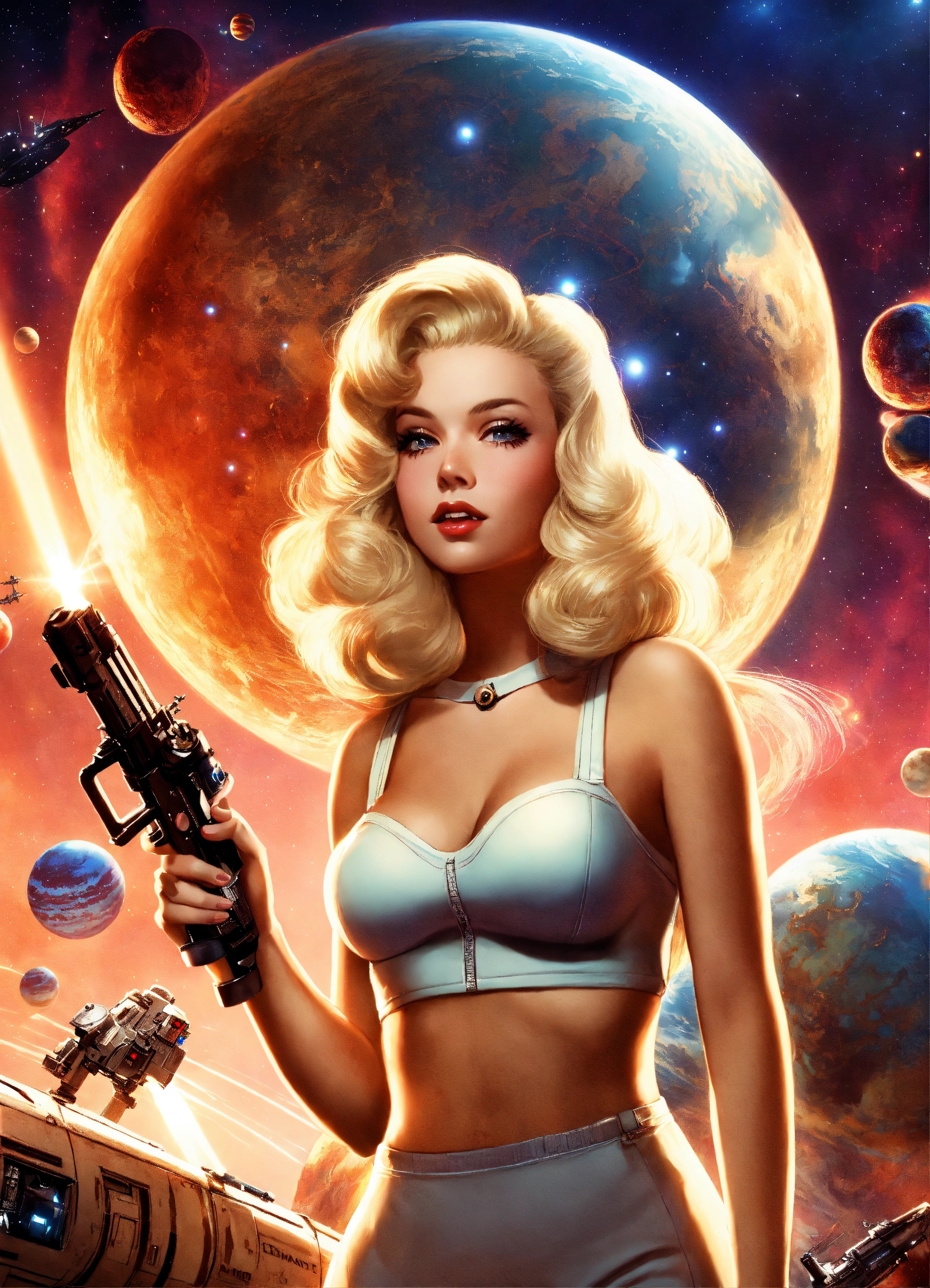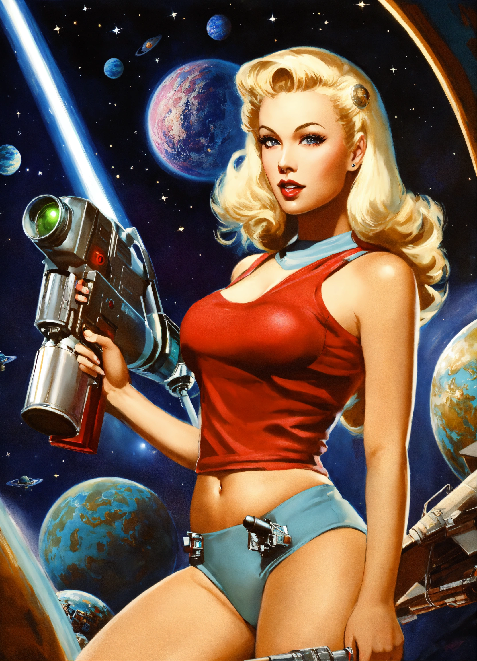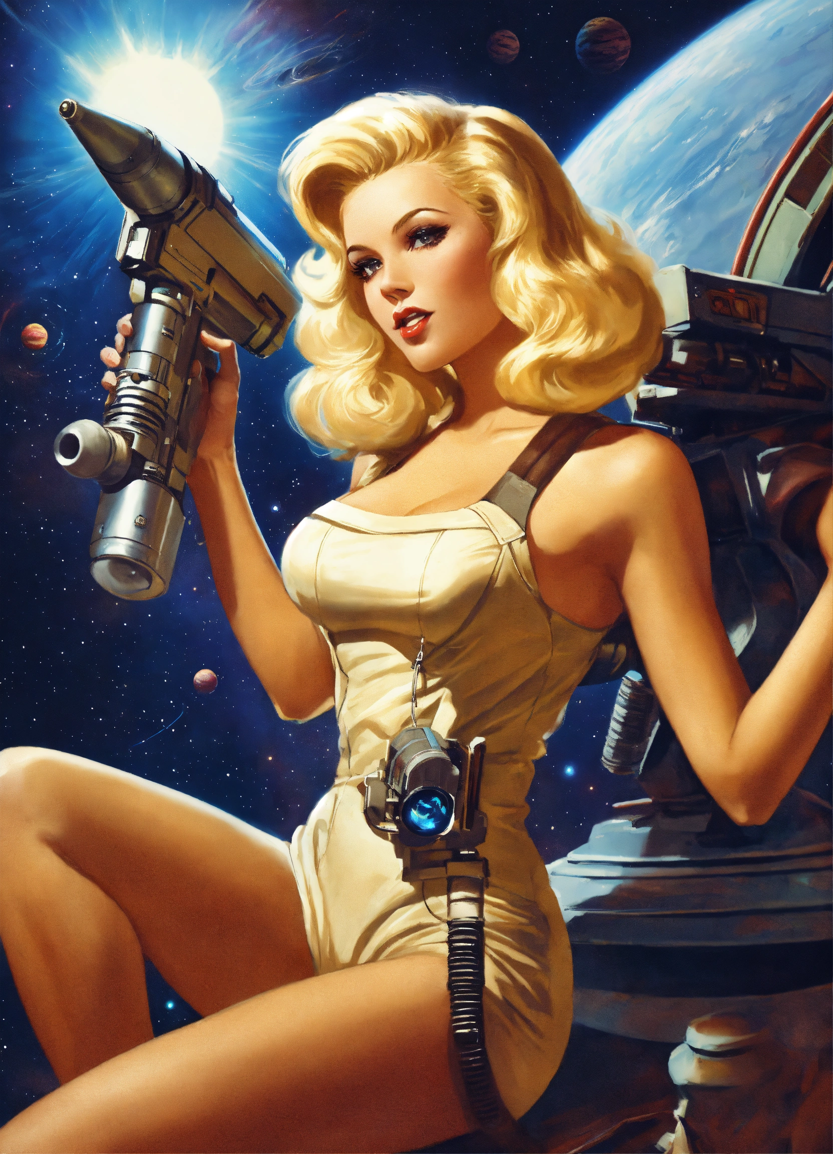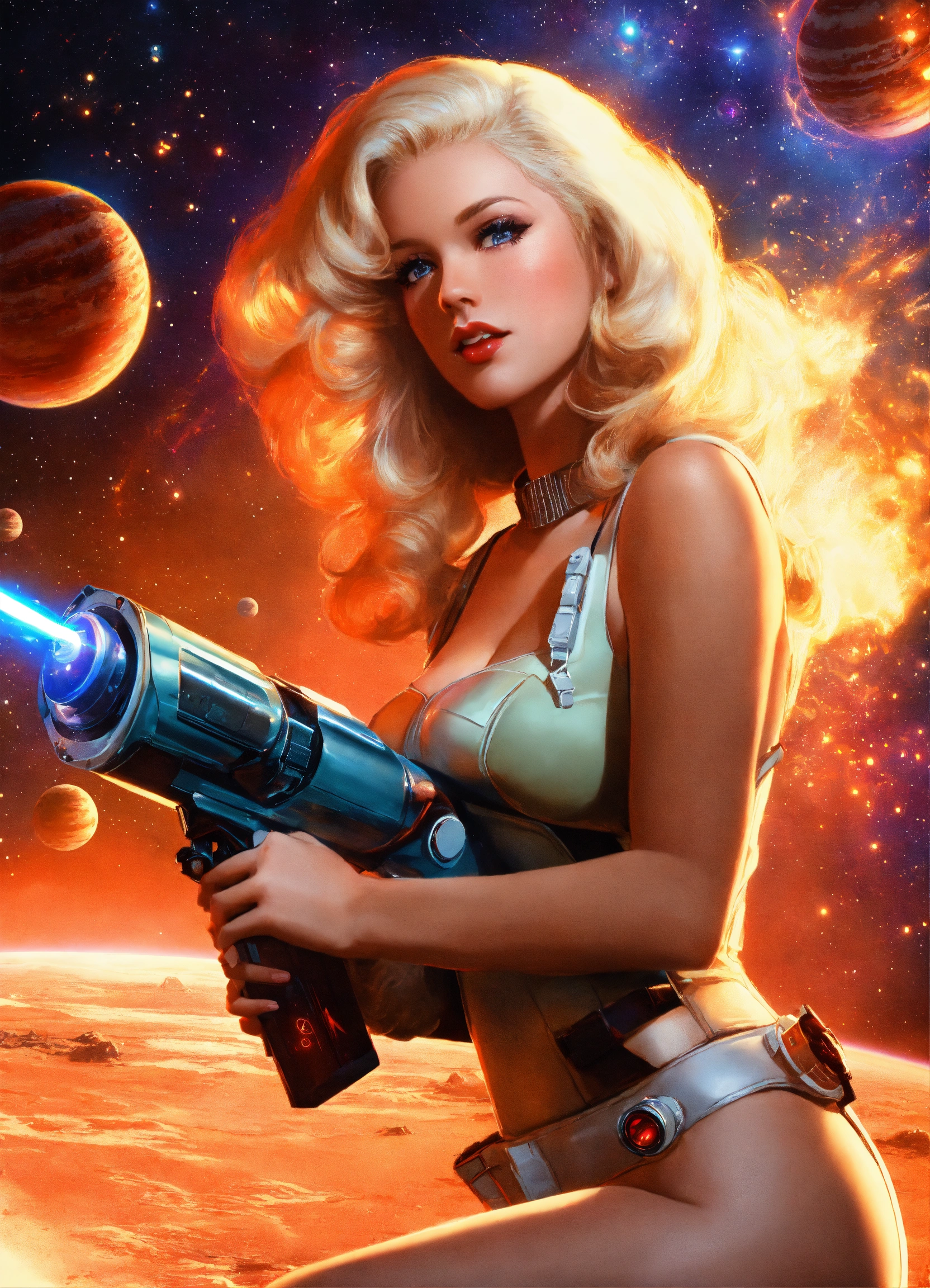 Photo, sci-fi, pinup girl, blonde, long hair, real, flirtatious, bombshell, bimbo, astronaut, aliens, planets, outer space, ray gun, laser gun