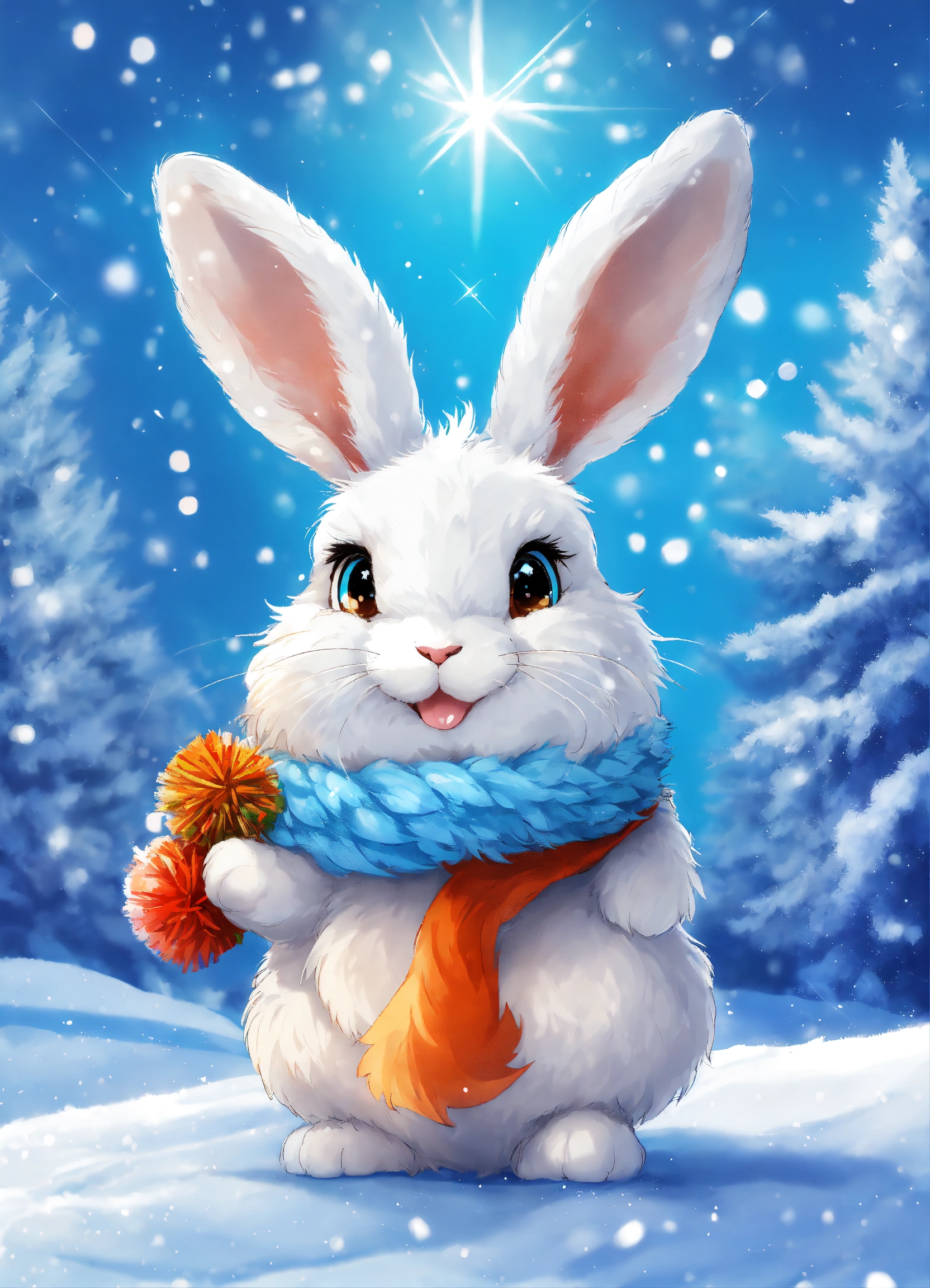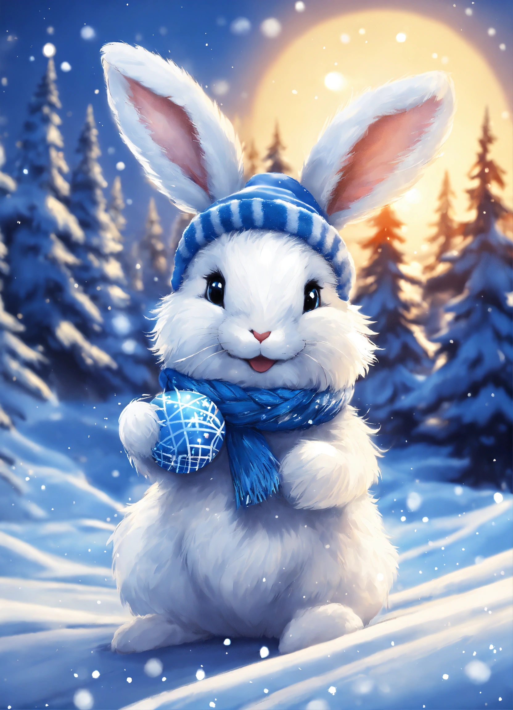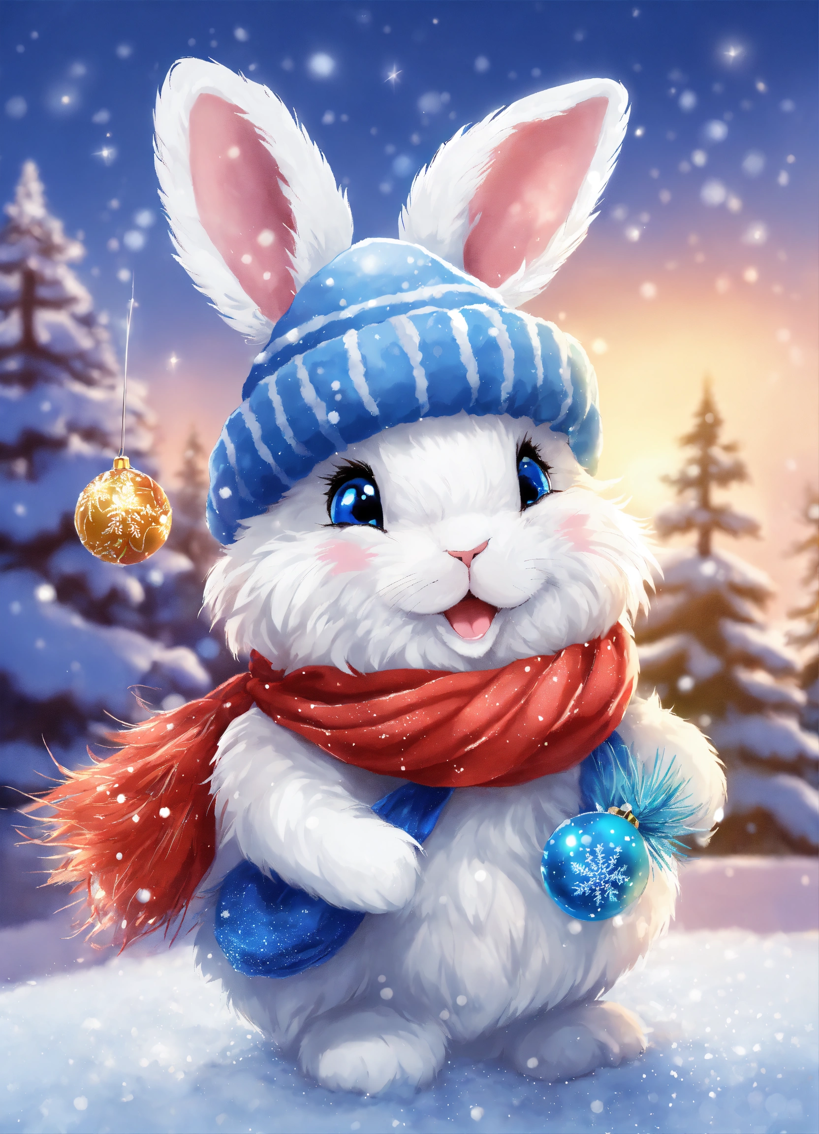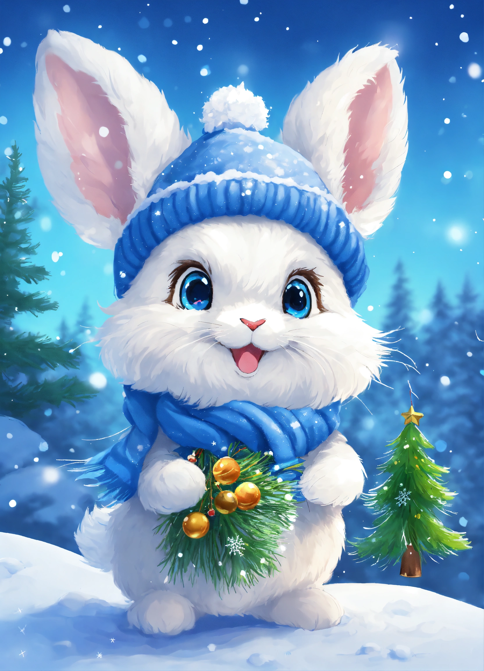 Cartoon white fluffy bunny in a blue fluffy hat with a pom-pom, smiles and holds a christmas tree branch with a toy and serpentine in his paw, around the blue-white snow sparkles in the sun, winter background