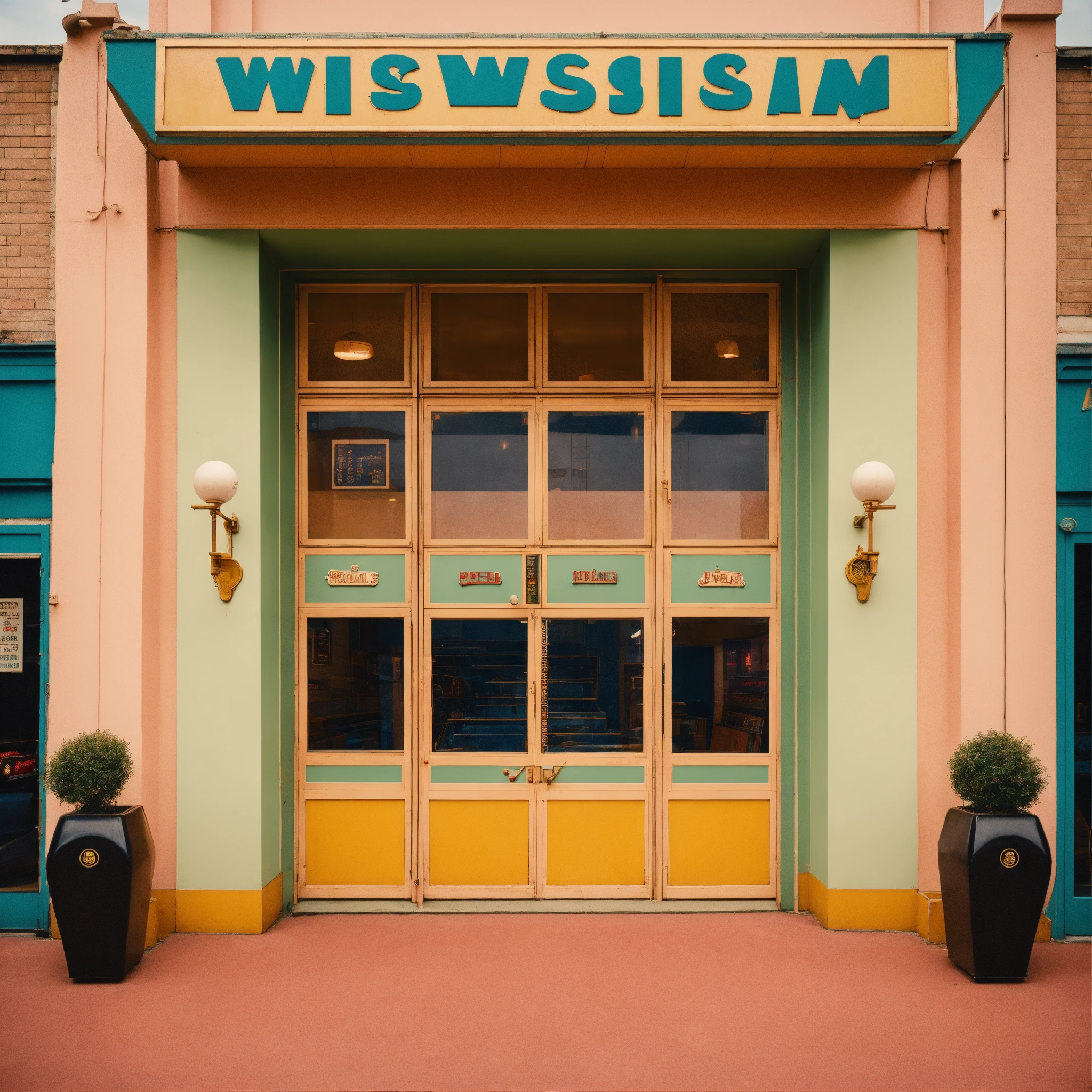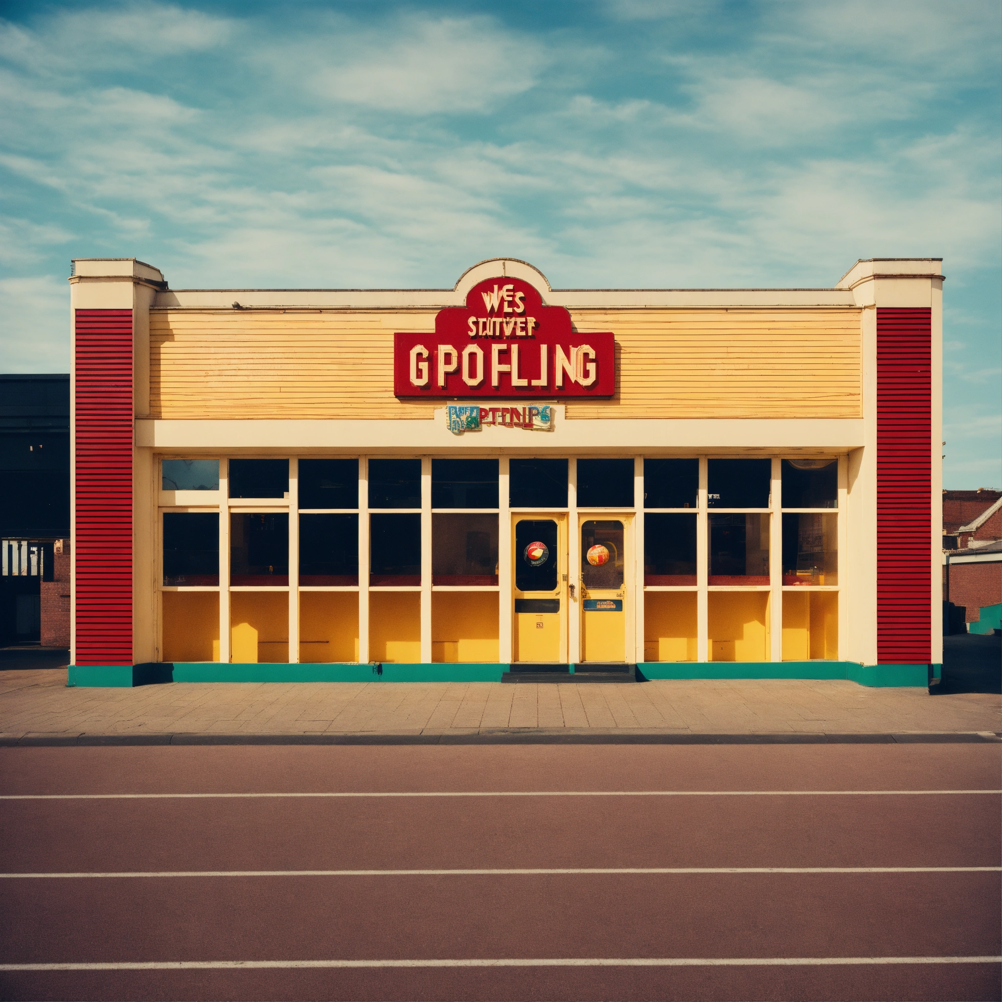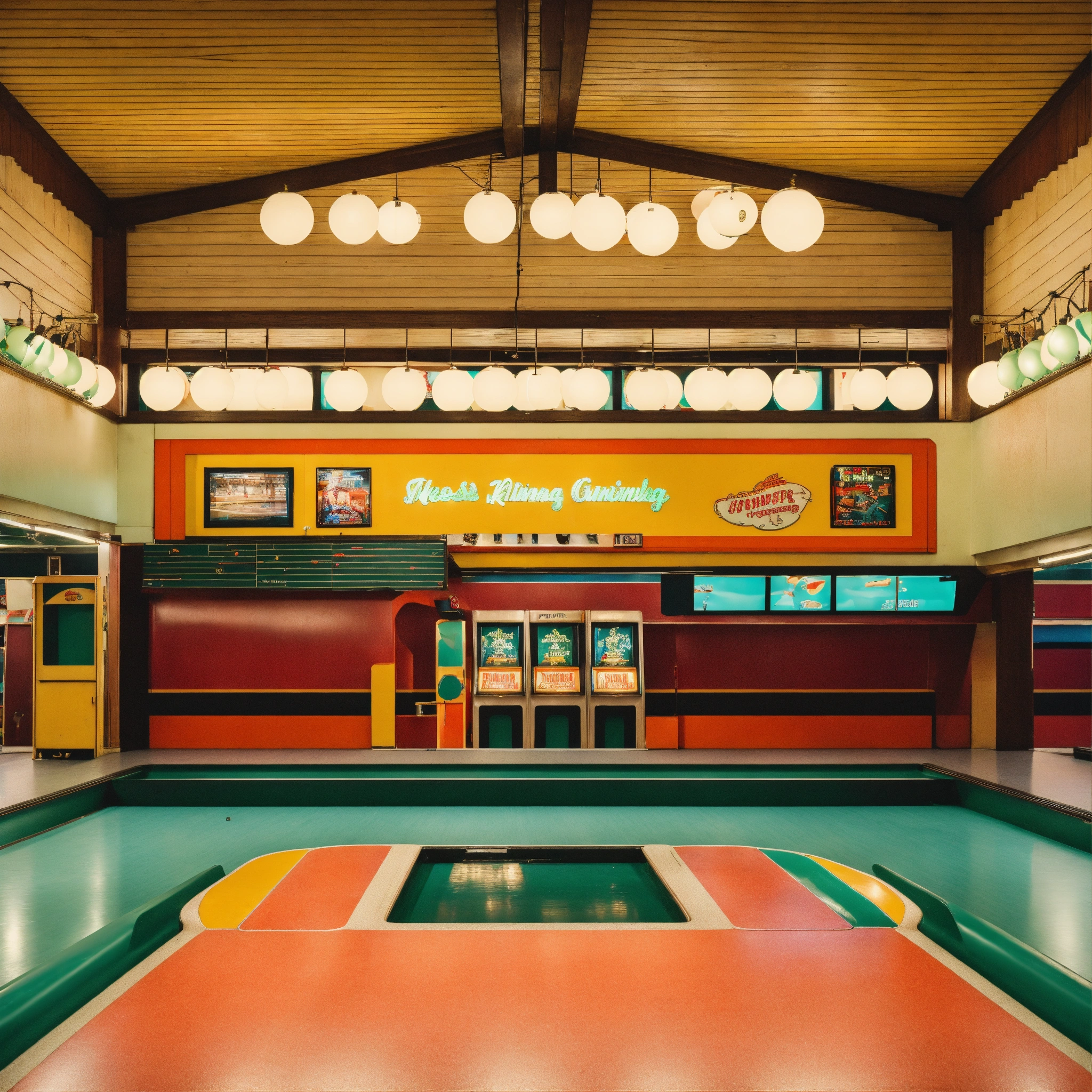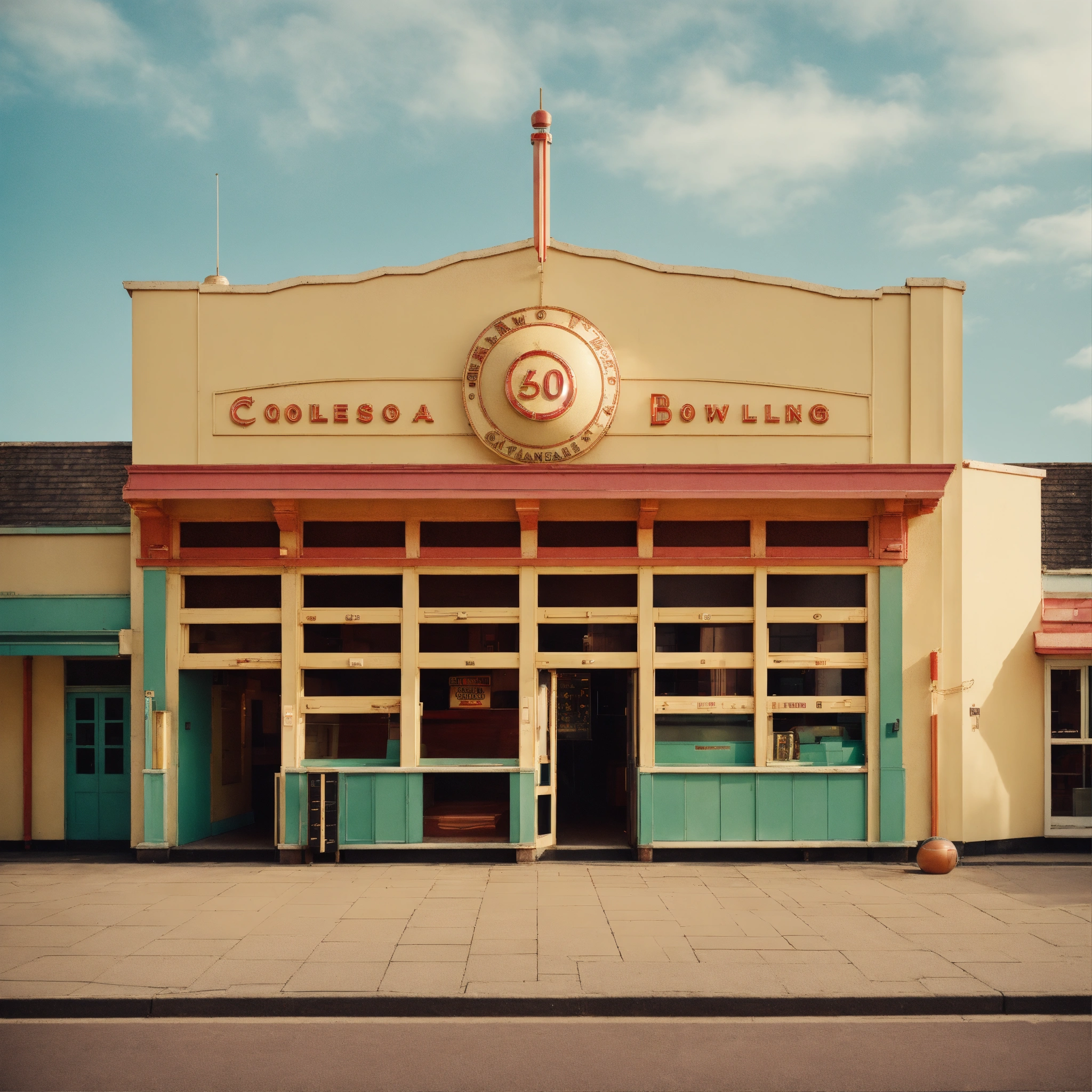 A photograph of a vintage ten pin bowling arcade, building front, wes anderson colour style, wide format