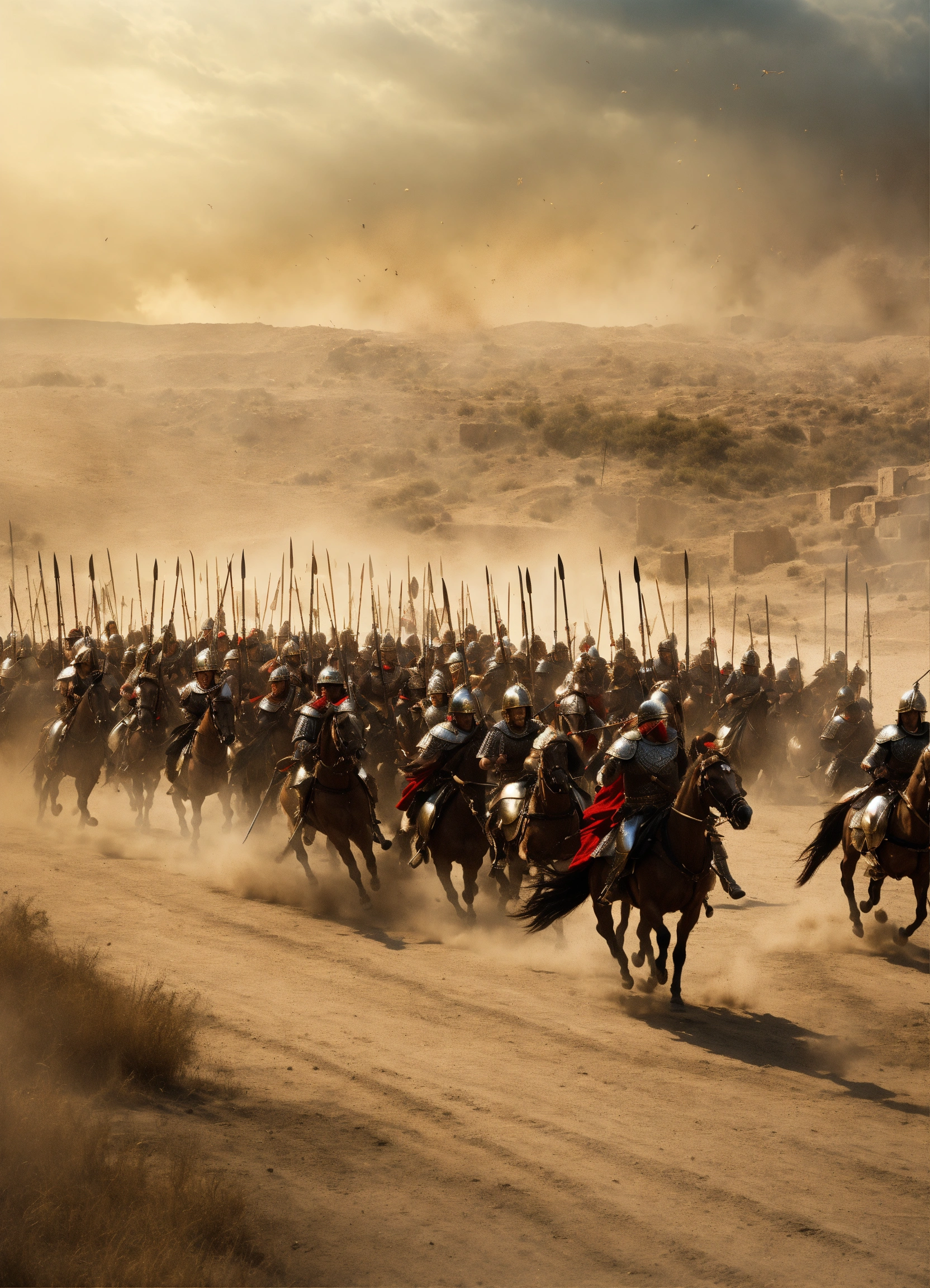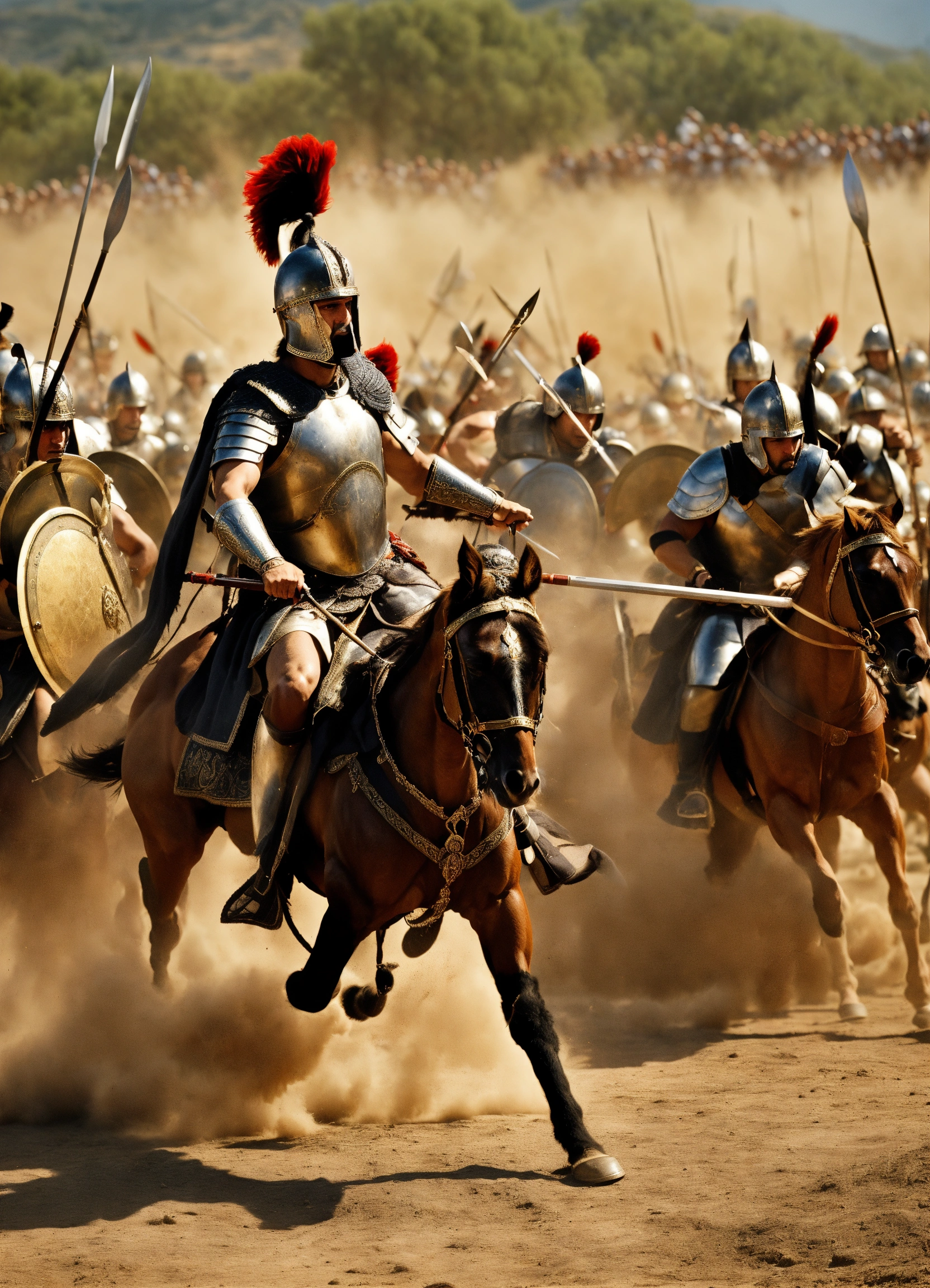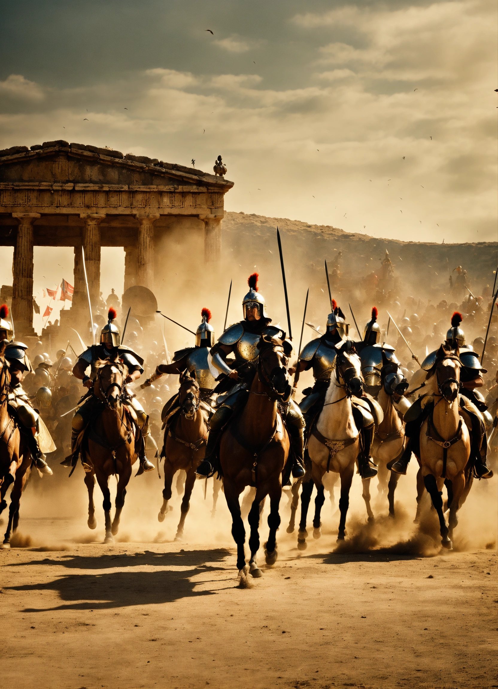 Héctor, aquiles, the moment before the clash, ancient greece, ornate helmets and spears, dusty battlefield, both warriors charging at each other, spectators and soldiers watching in anticipation, wide shot, hyper-realistic, photo realism, cinematography, --ar 916"