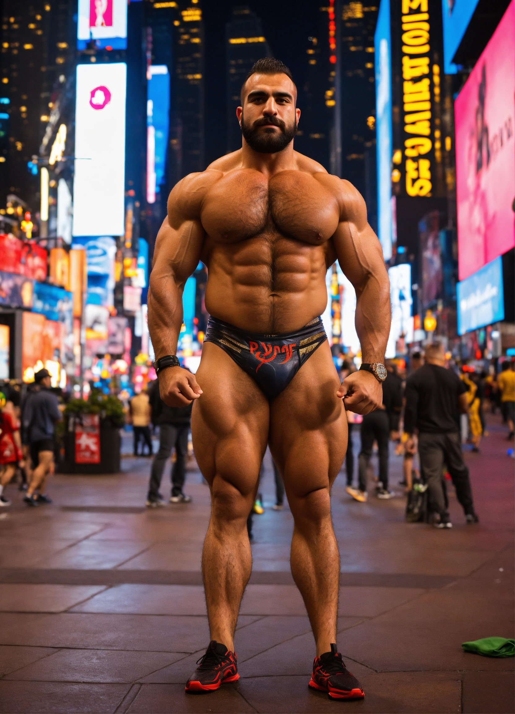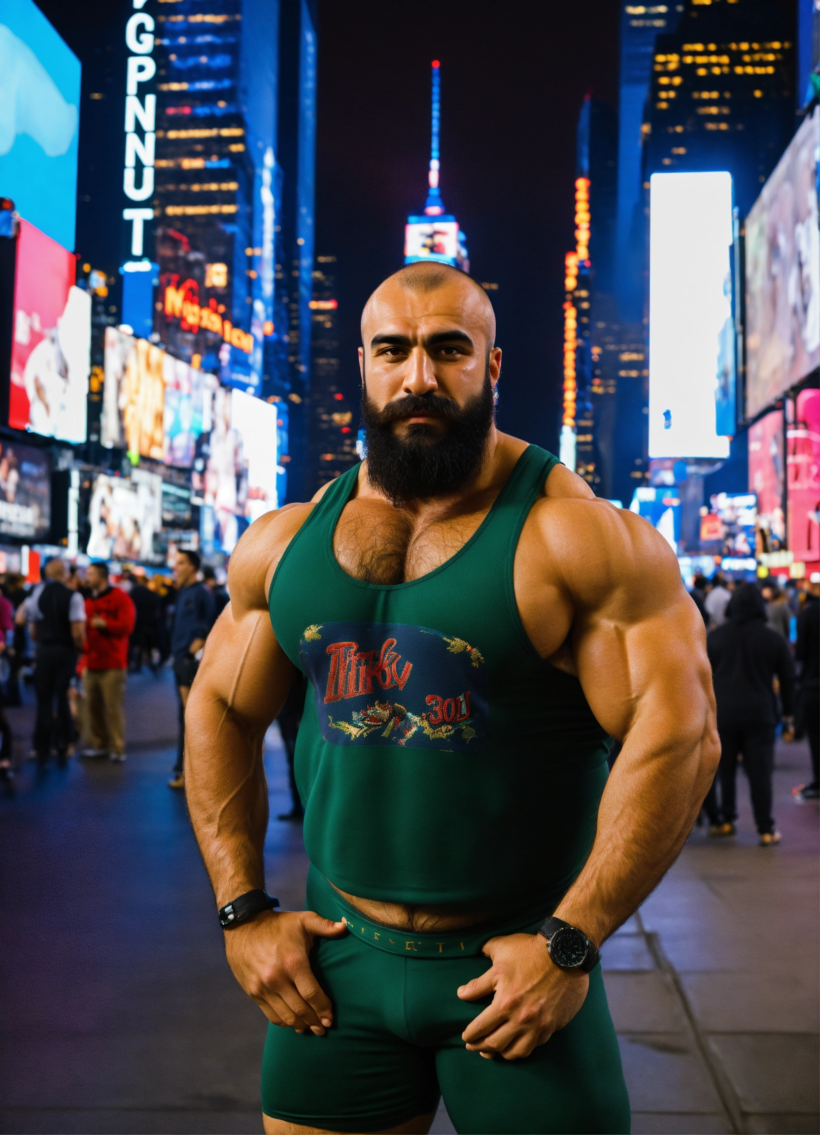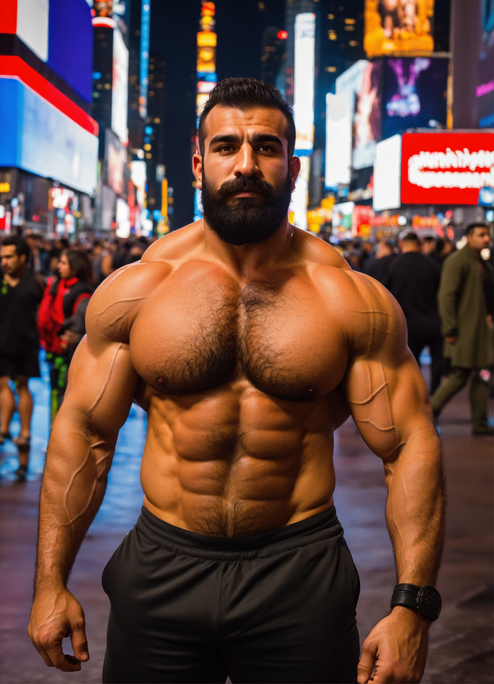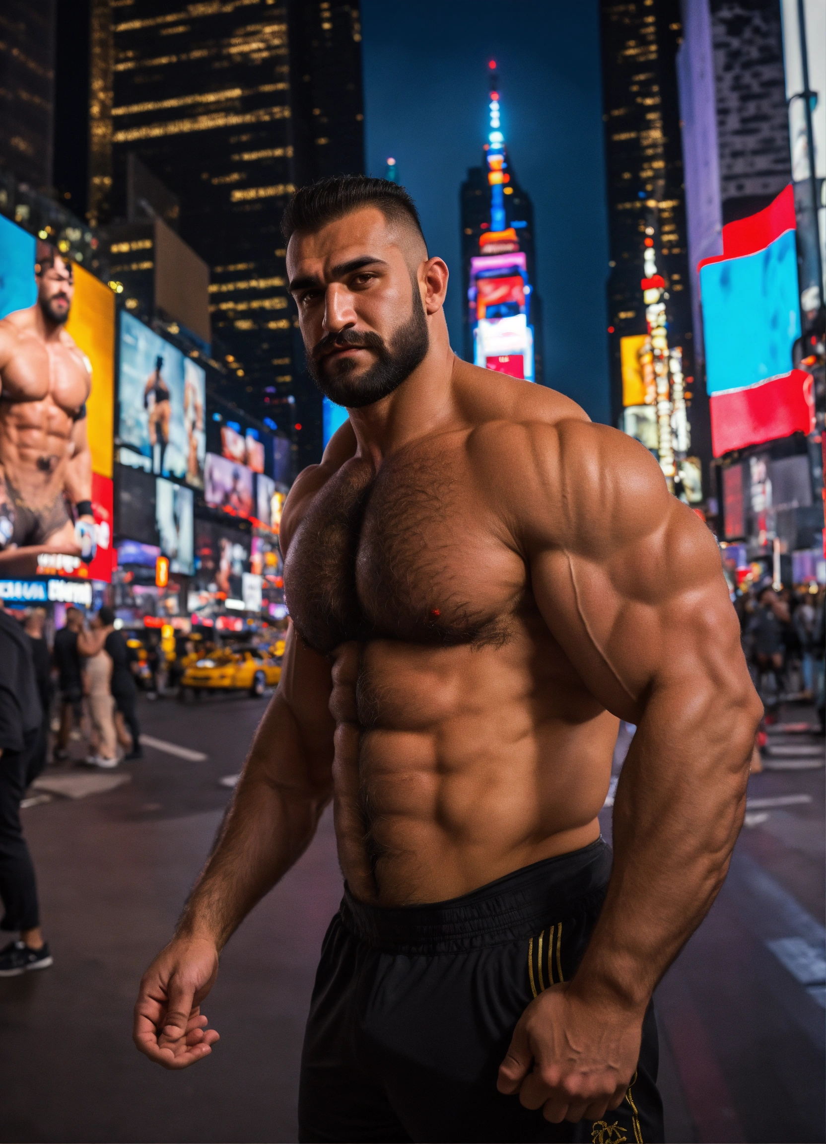 30-year-old hairy turkish man with big muscles, big bodybuilder, body like a wrestler, in times square at night