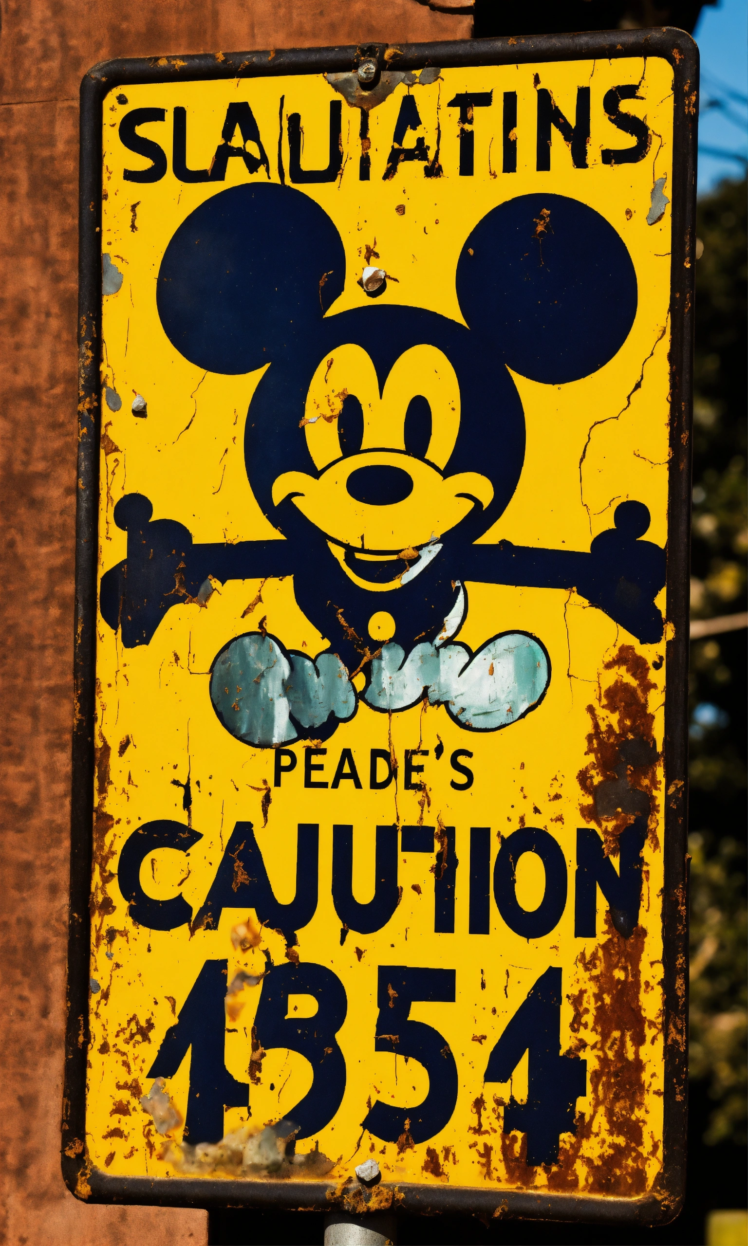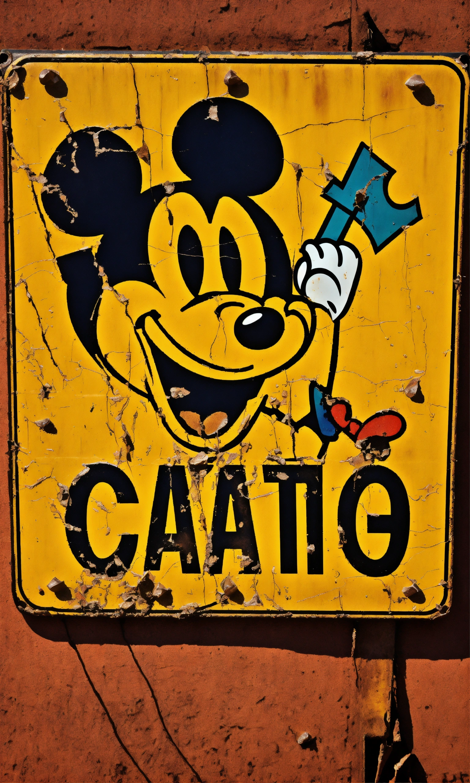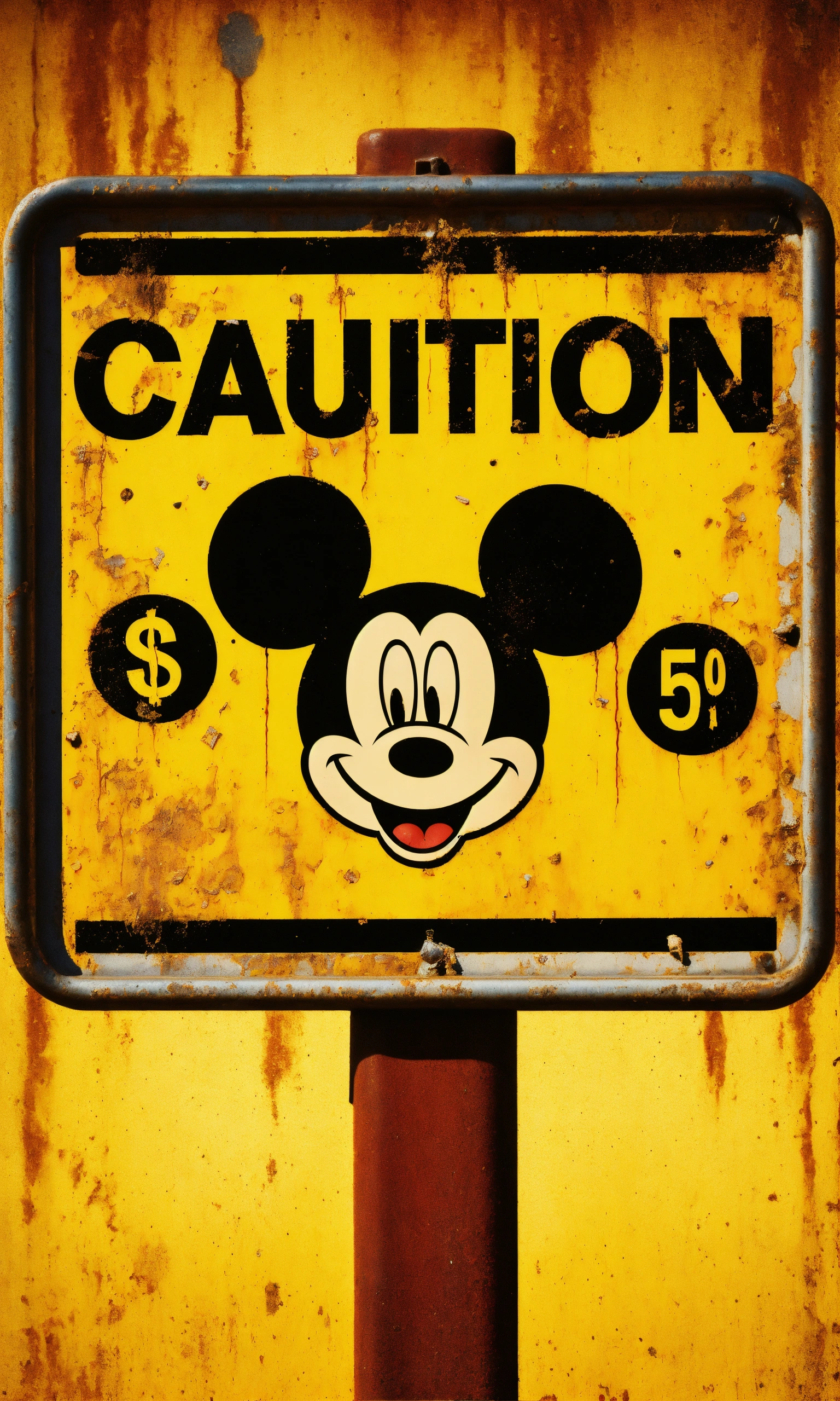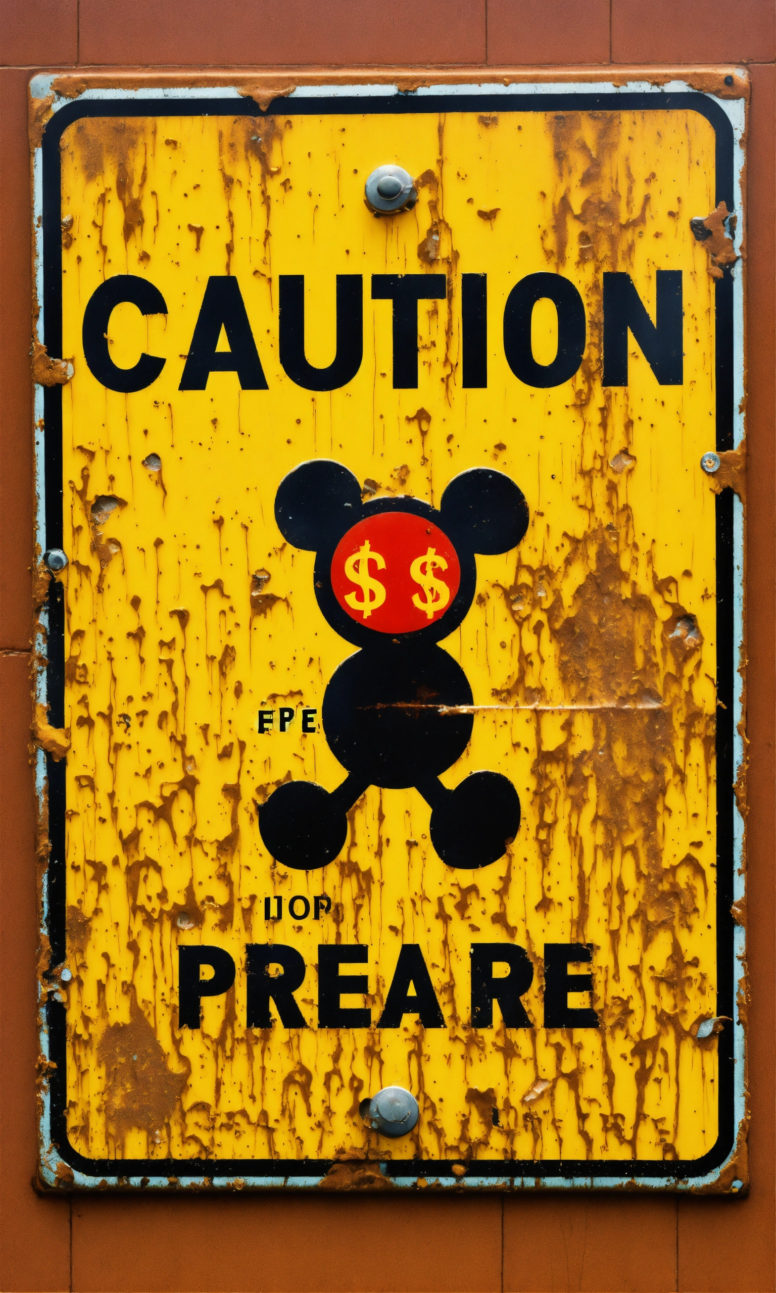 Corroded metal hold road sign showing a rotten dollar bill with mickey's face studio pixar "caution prepare for change" relevant iconography 1950s retro graphics