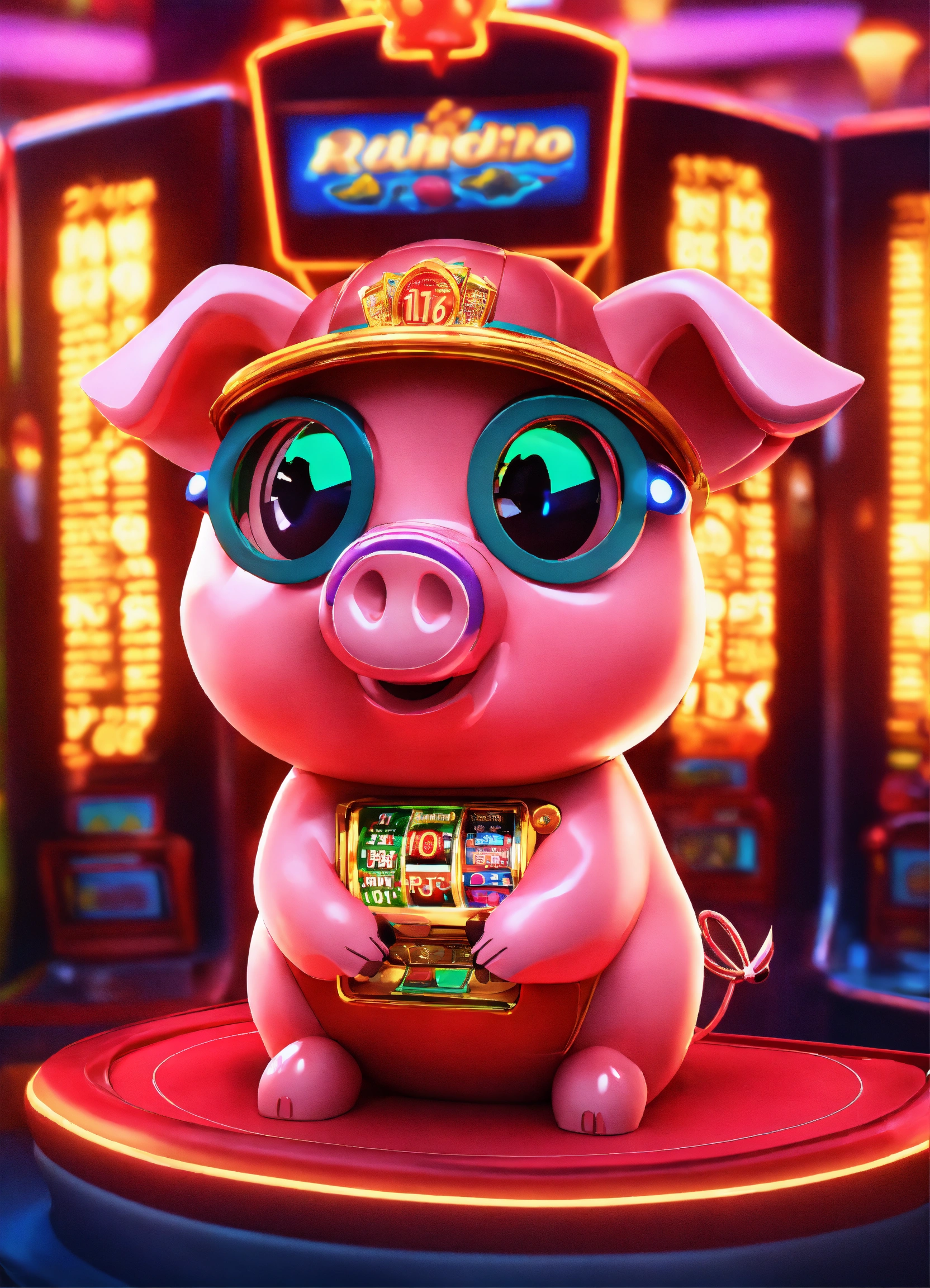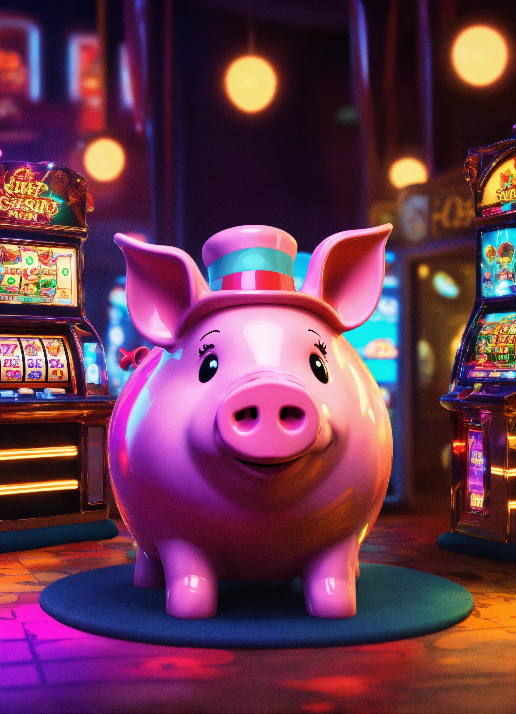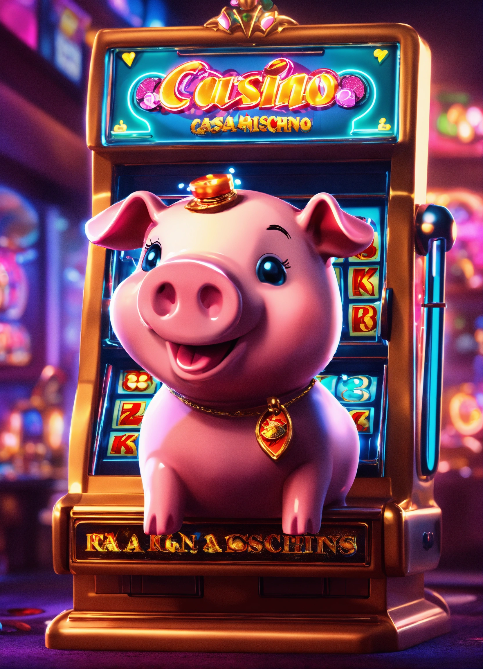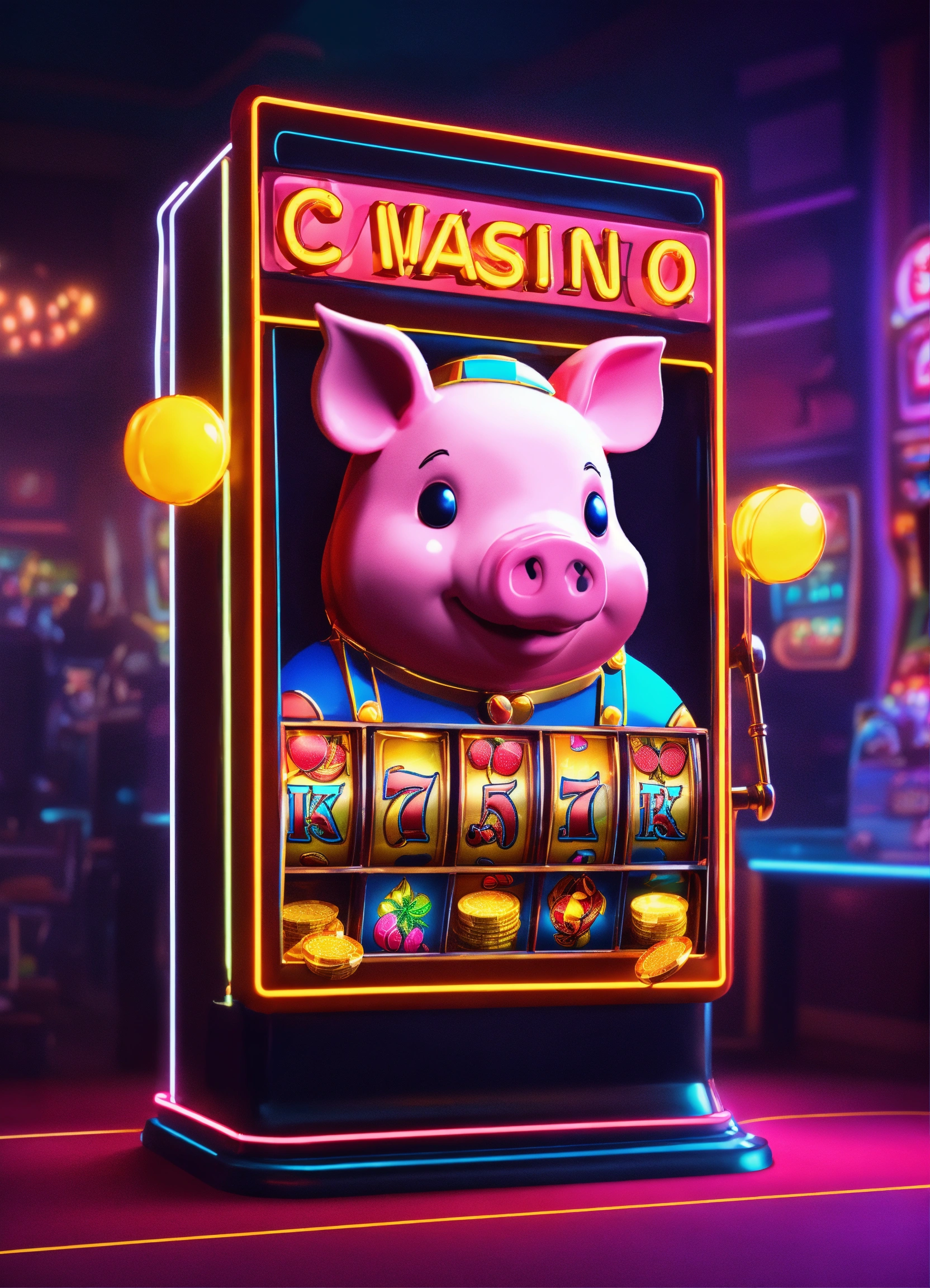 3d real cute cartoon cap pig casino slot machine in the gambling 8k neon lighting