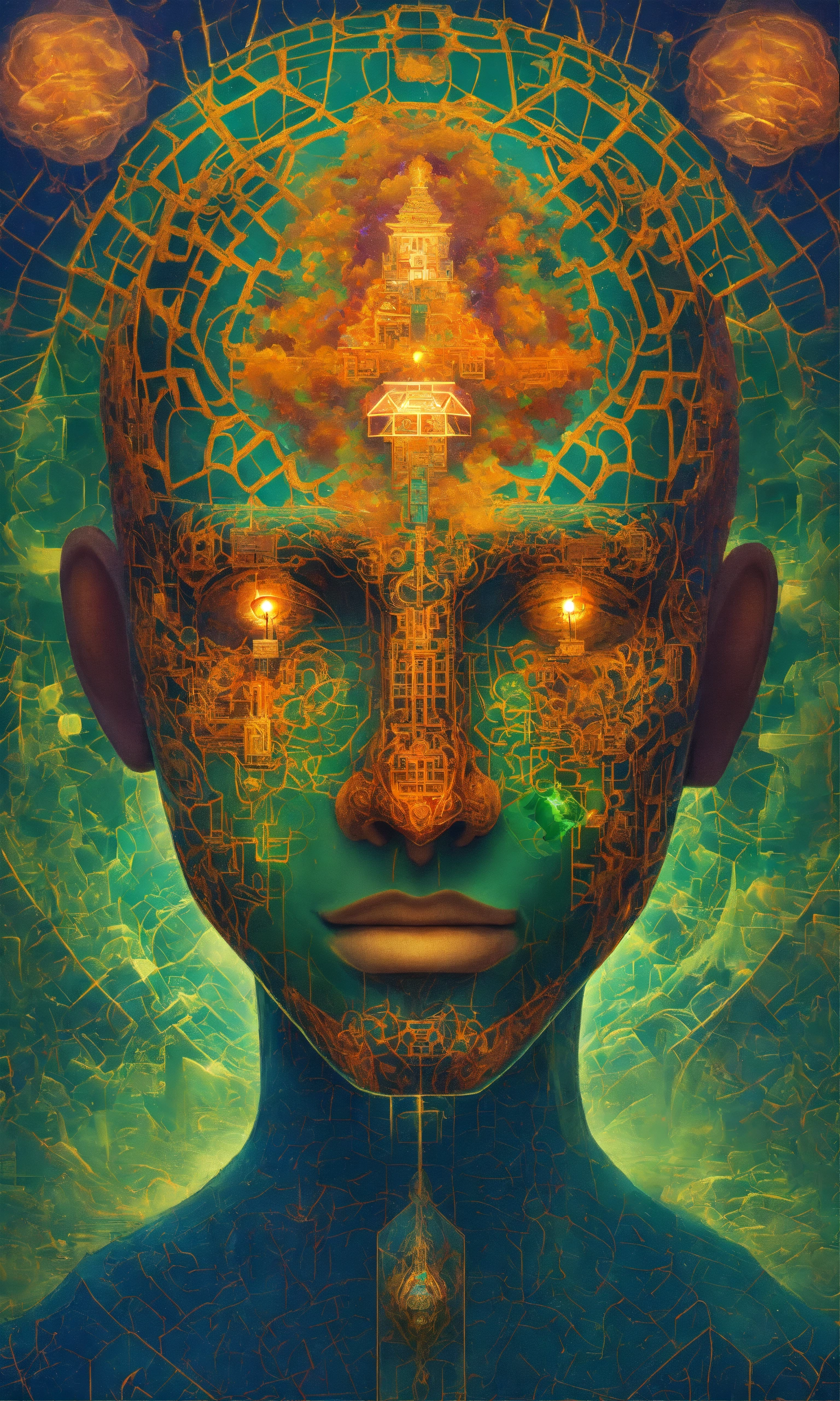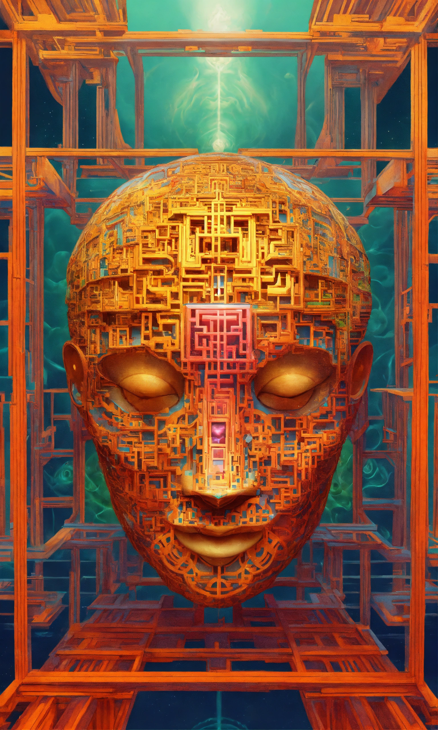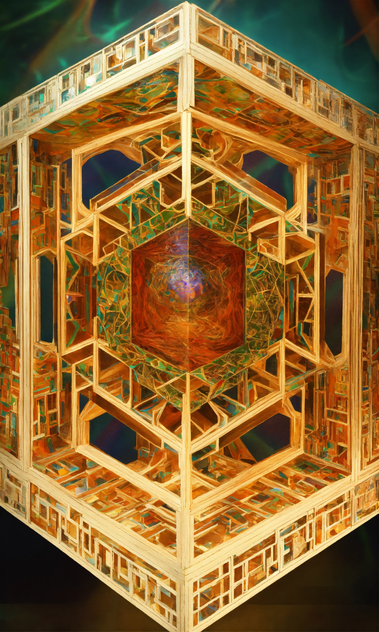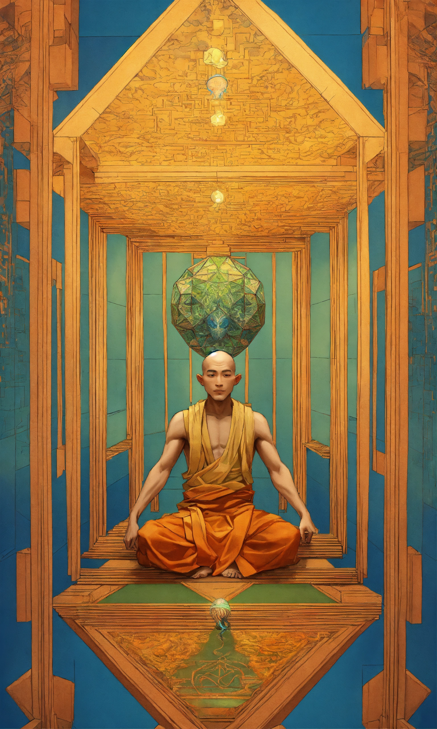 Taoist monk tesseract body fractal three point perspective hypercube mirror zen face brain mayan mantis jellyfish face