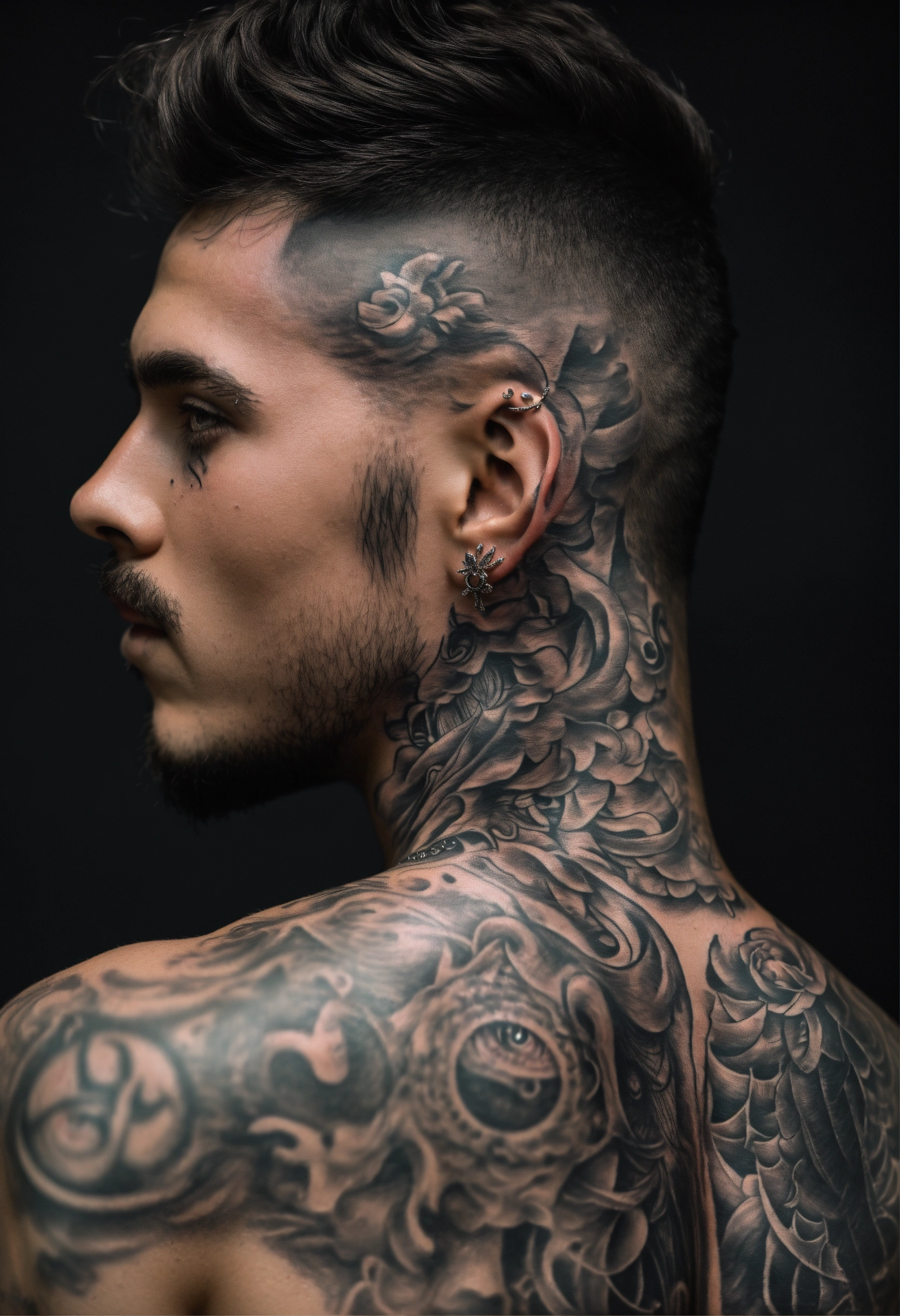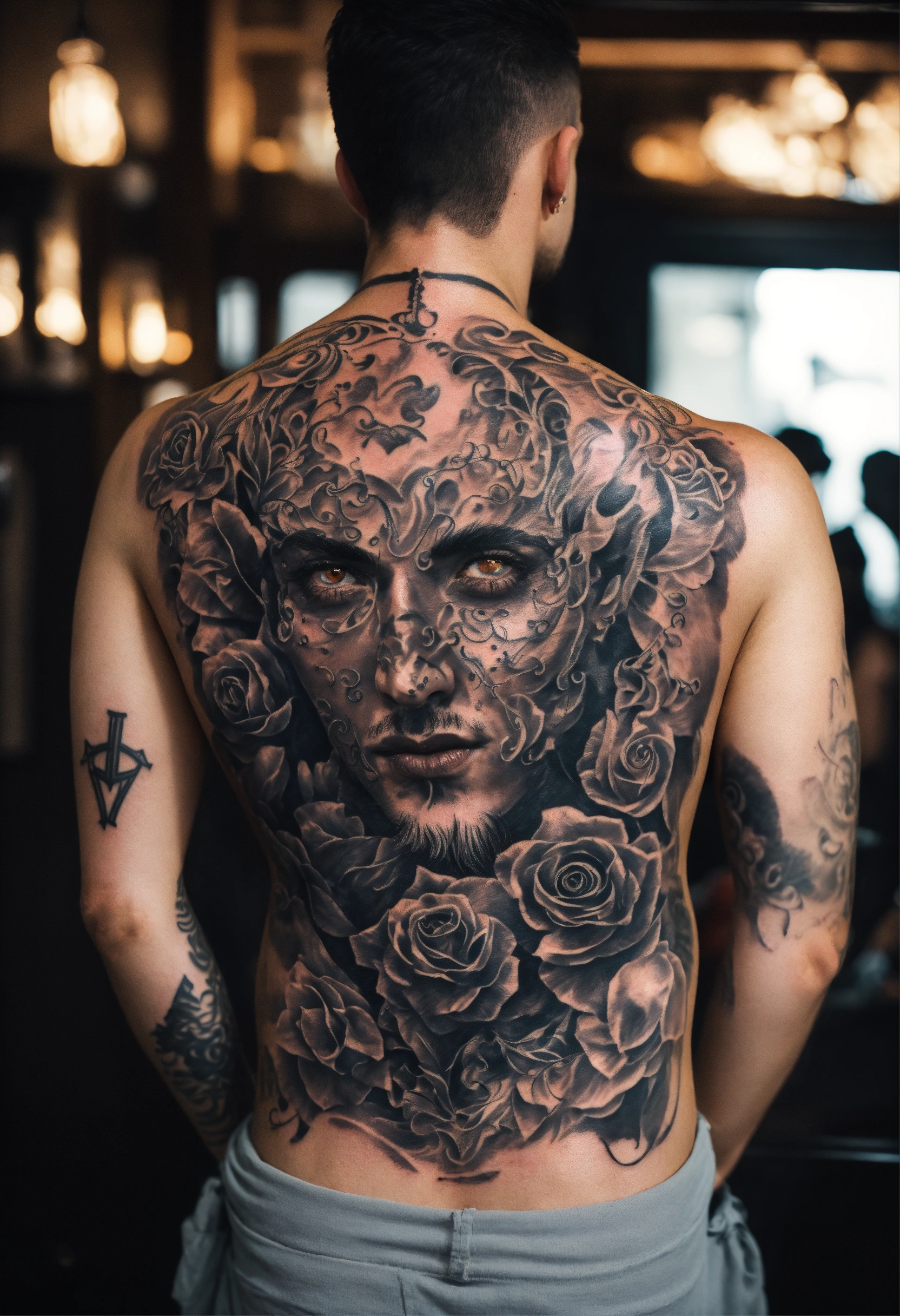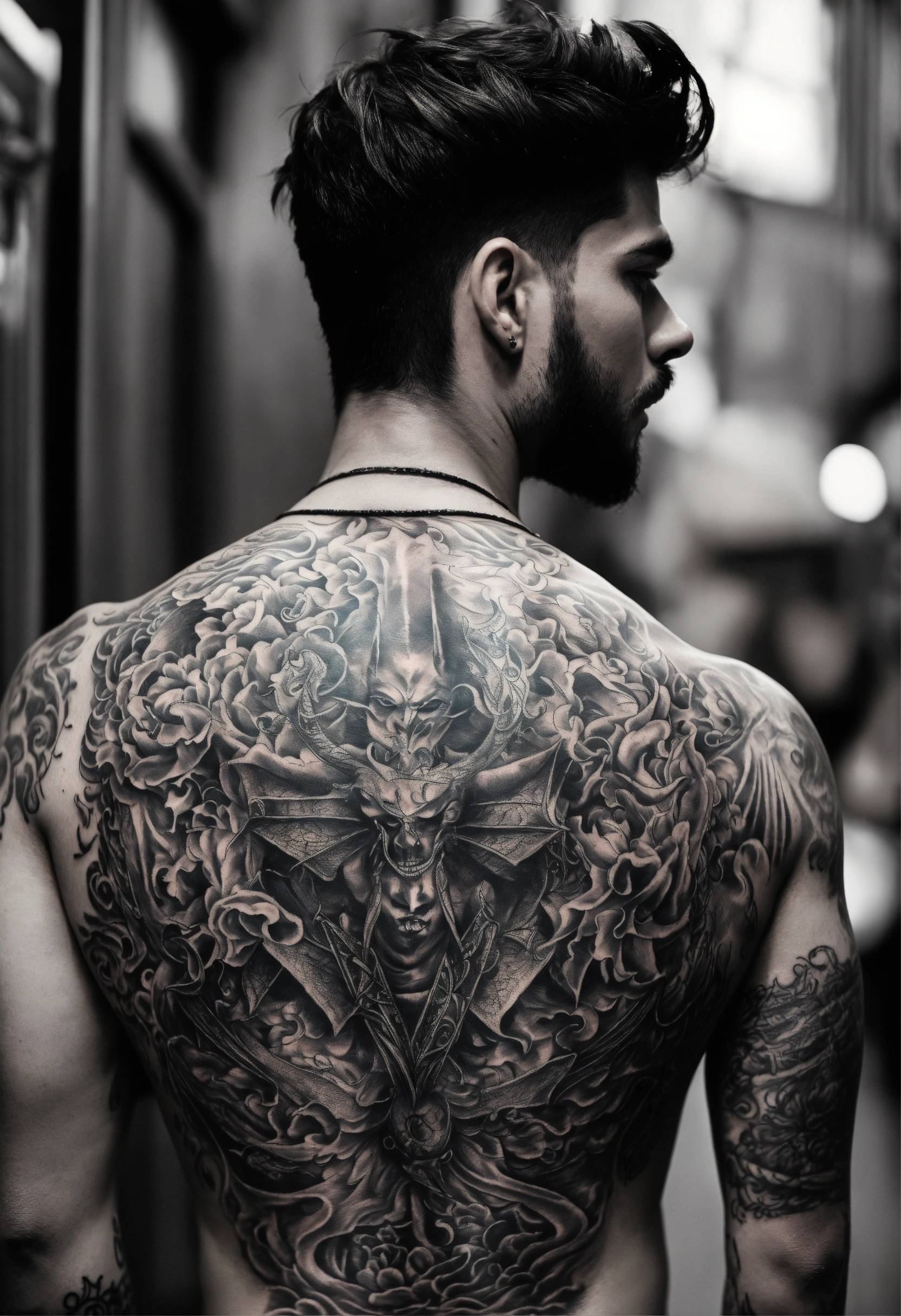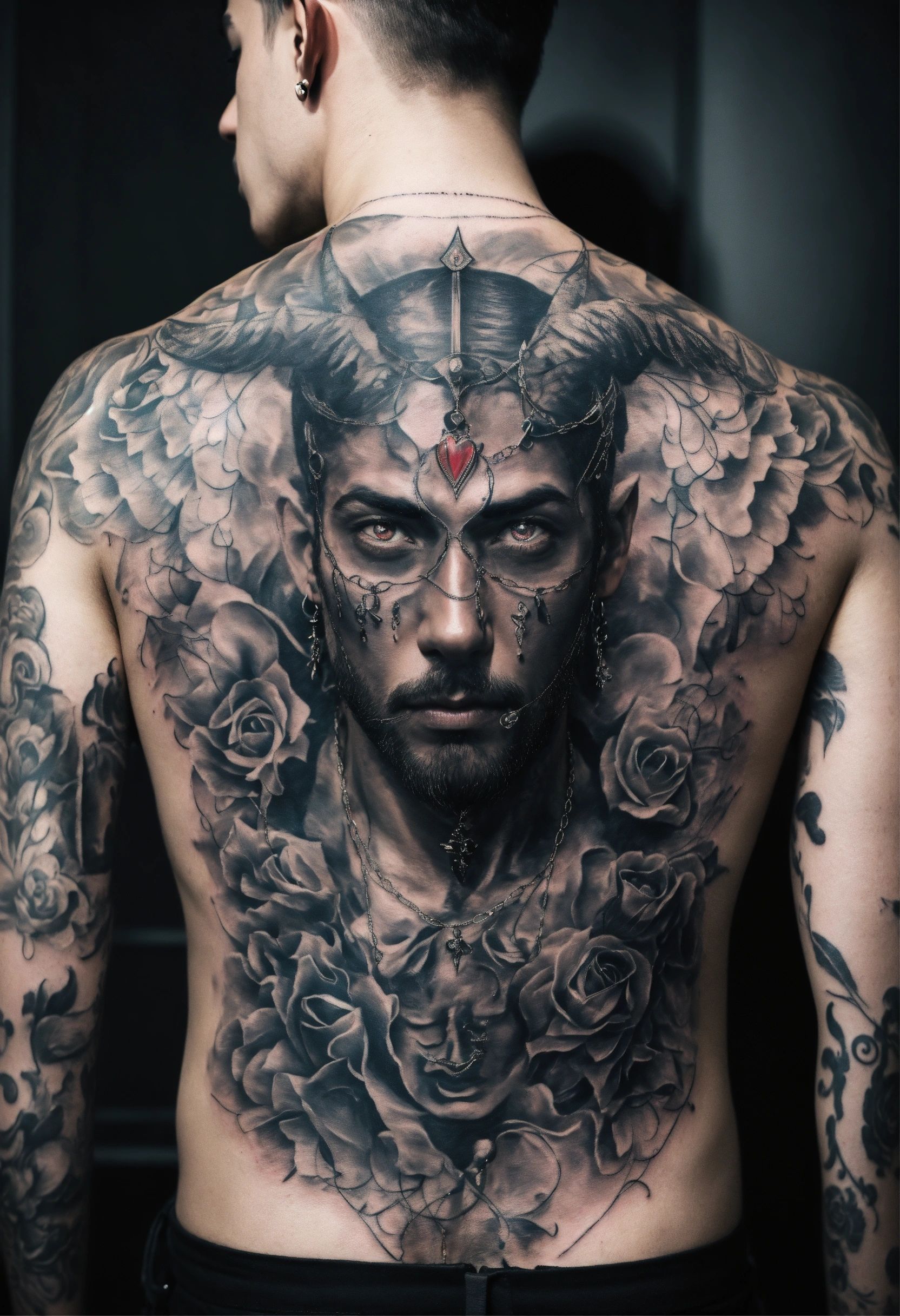 Men back tattoo all over the back, of satan with beautiful eyes full lips and small nose. black and white tattoo all over a mans back.