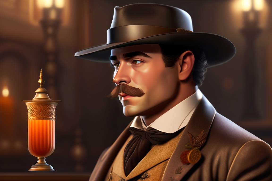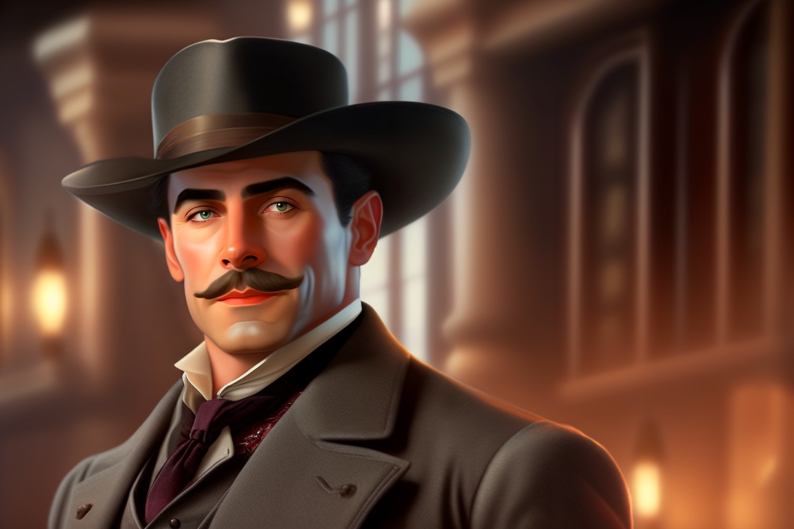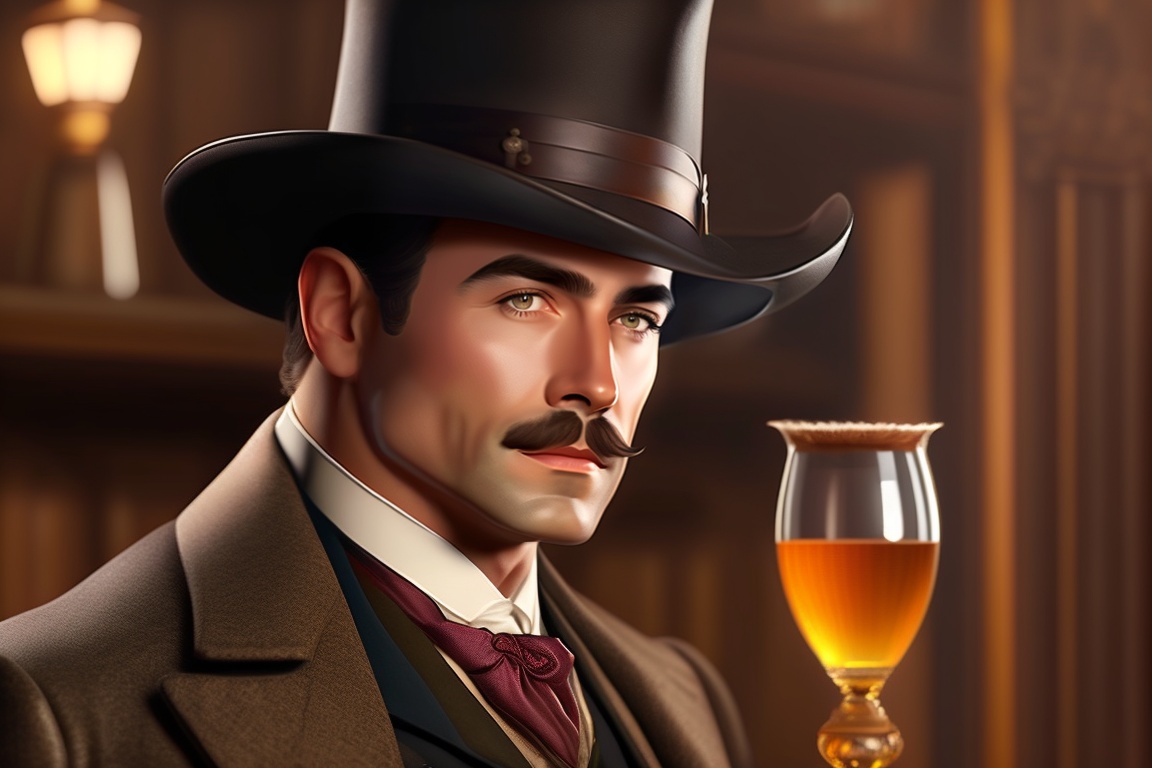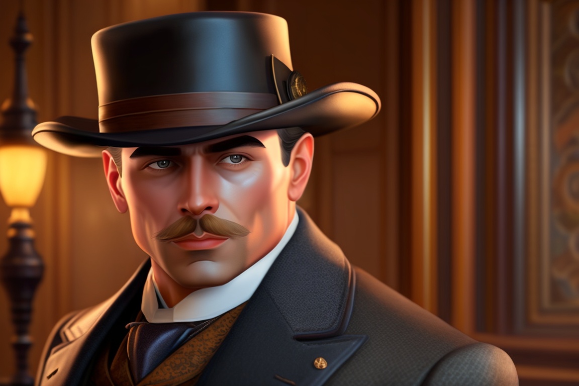 Bat masterson (no mustache) - bowler hat - talk to a gunslinger in the saloon, near the counter, with drinks