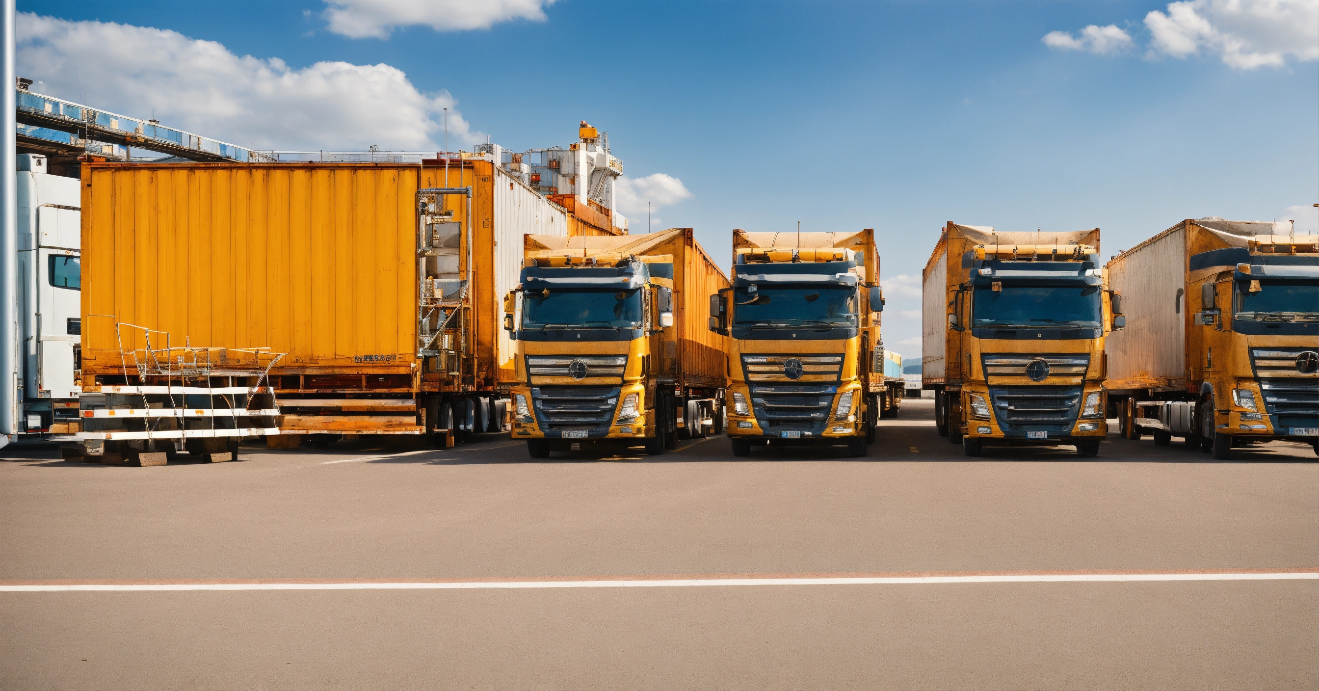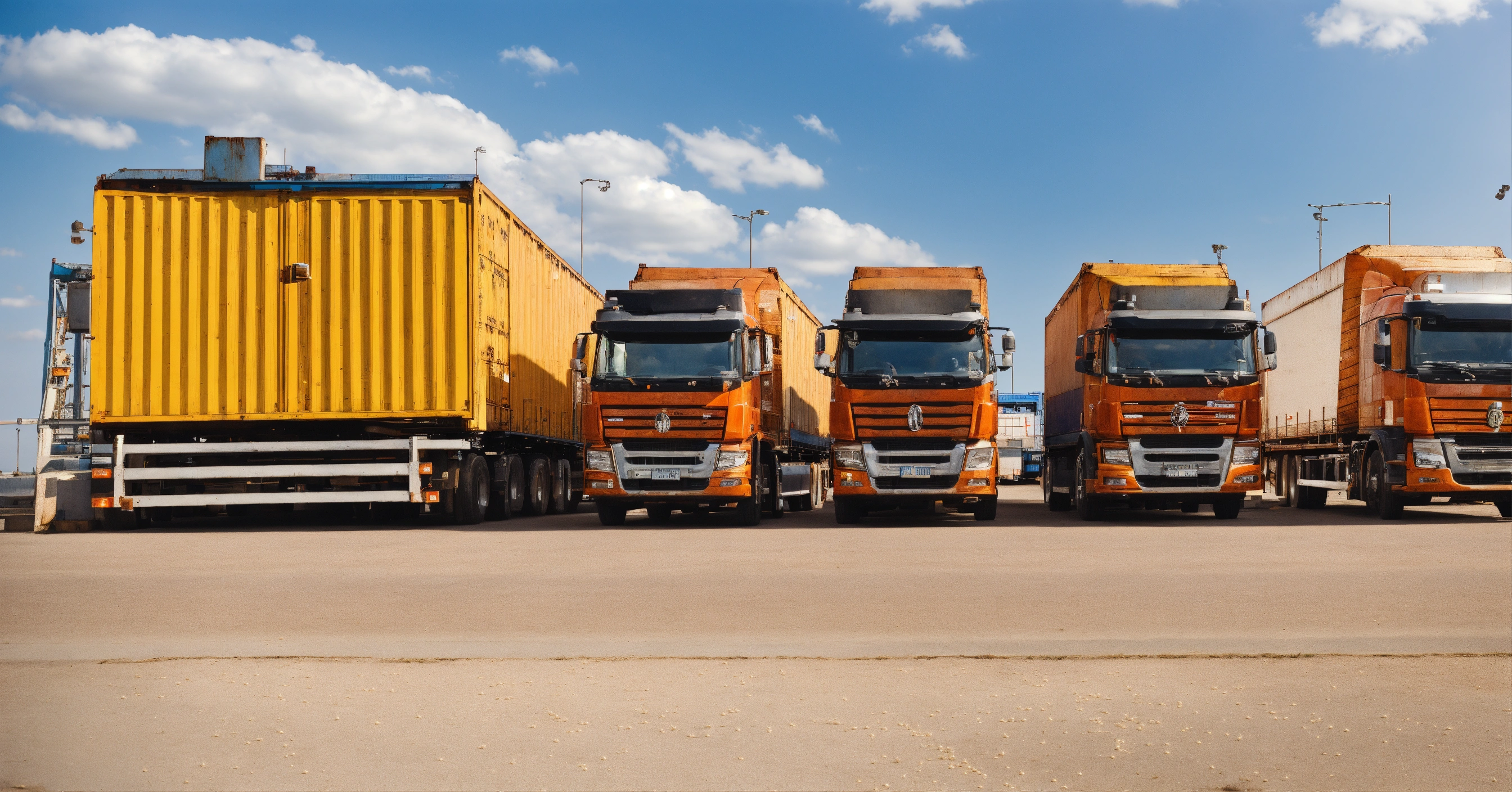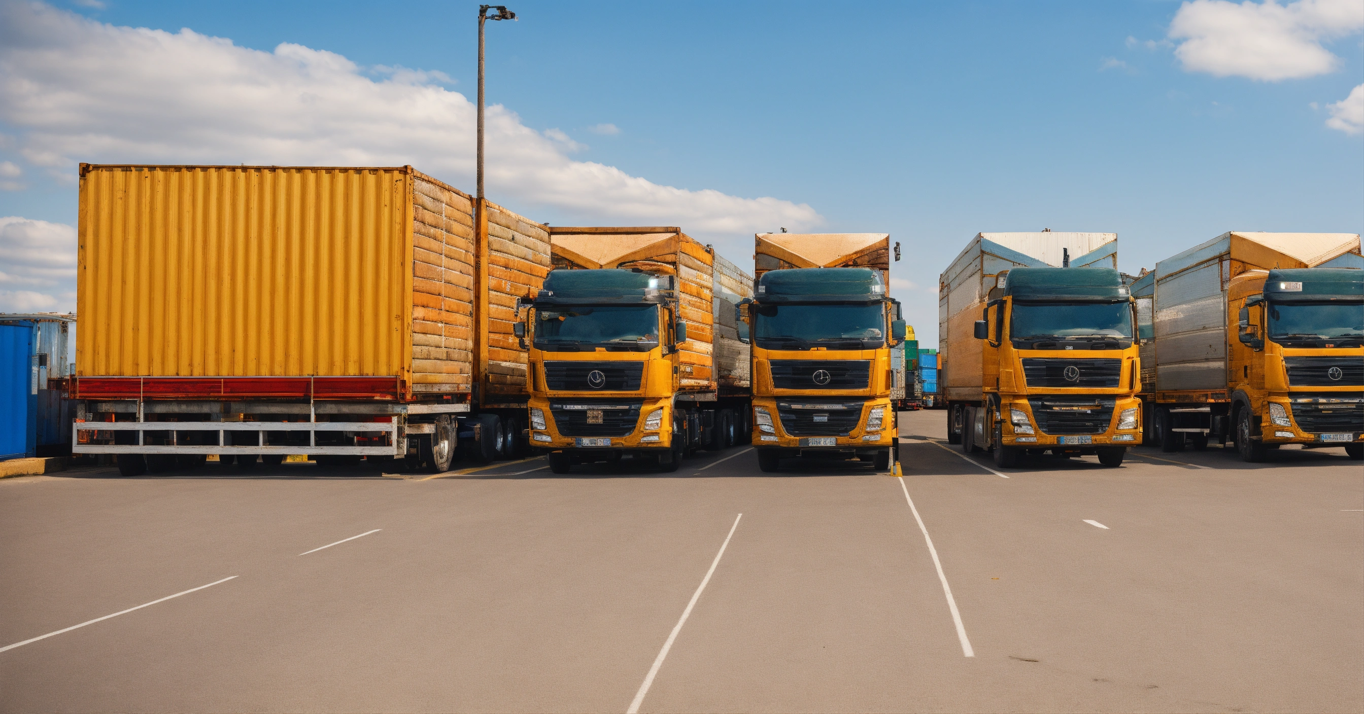 Trucks with grain at a checkpoint of a customs terminal in sunny day