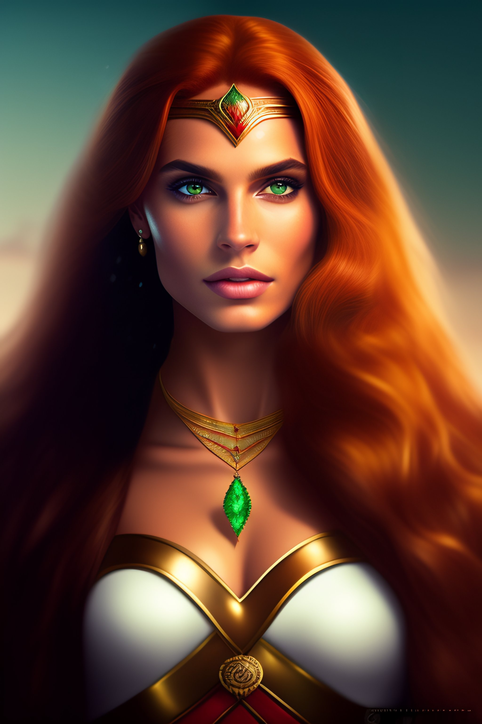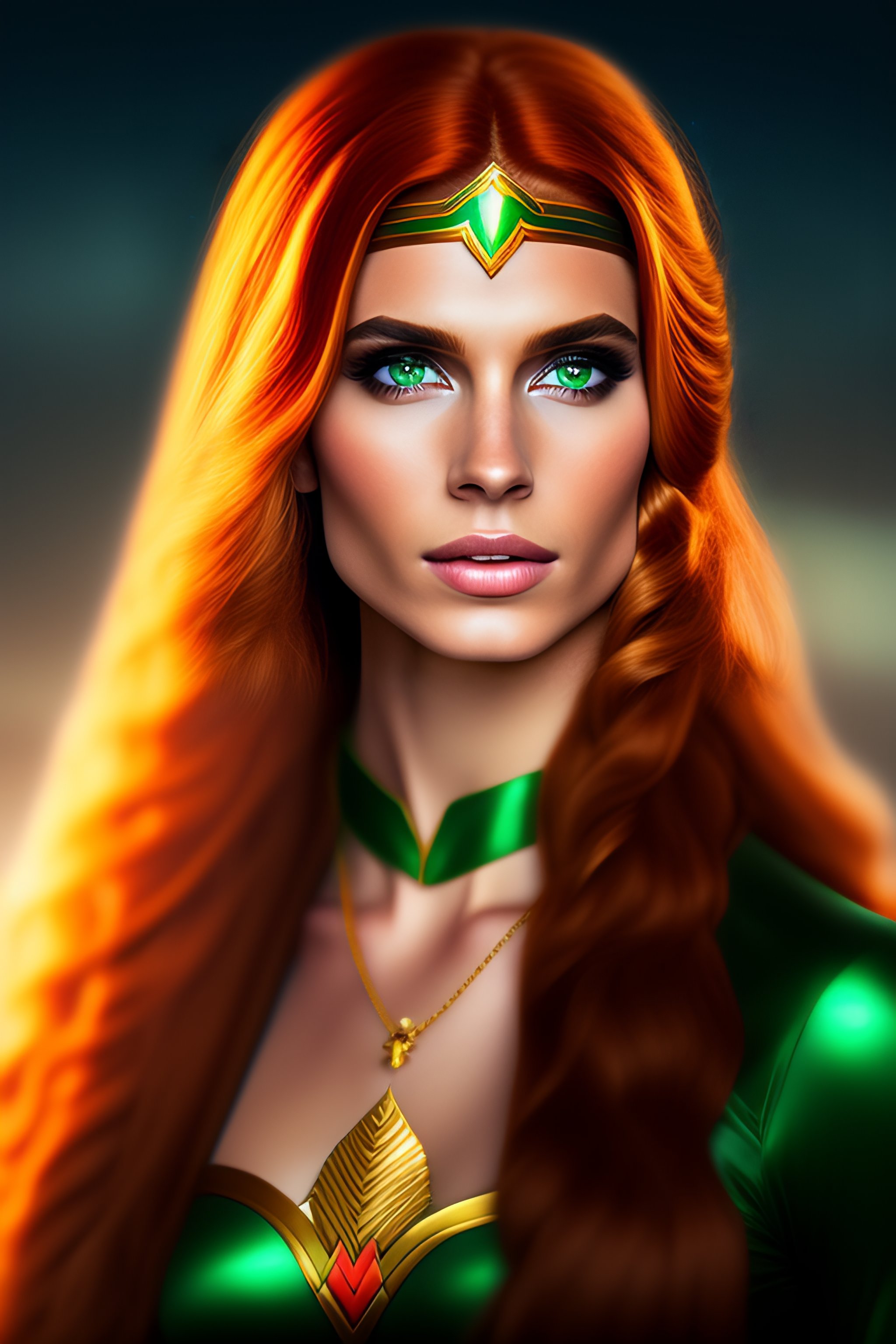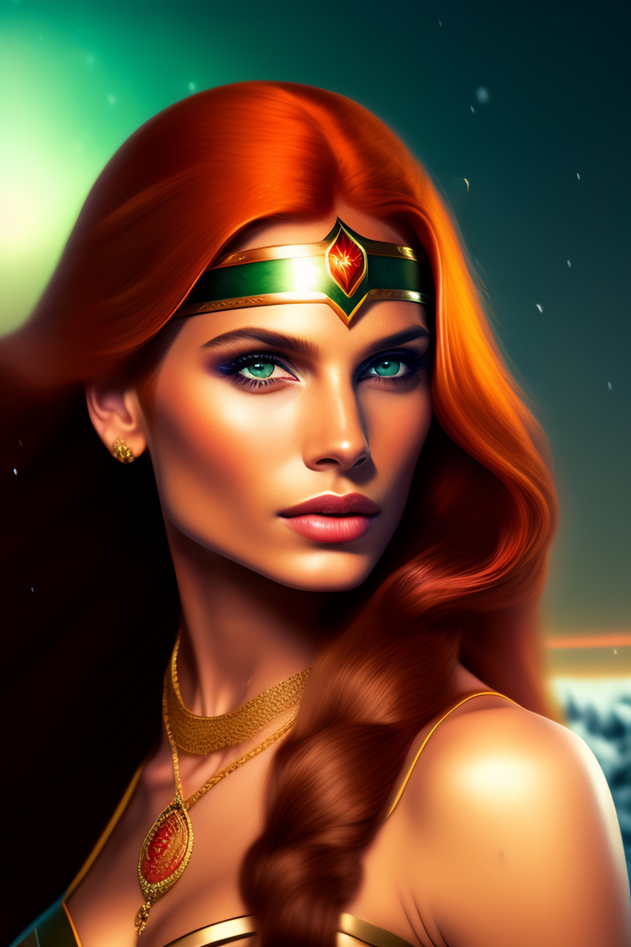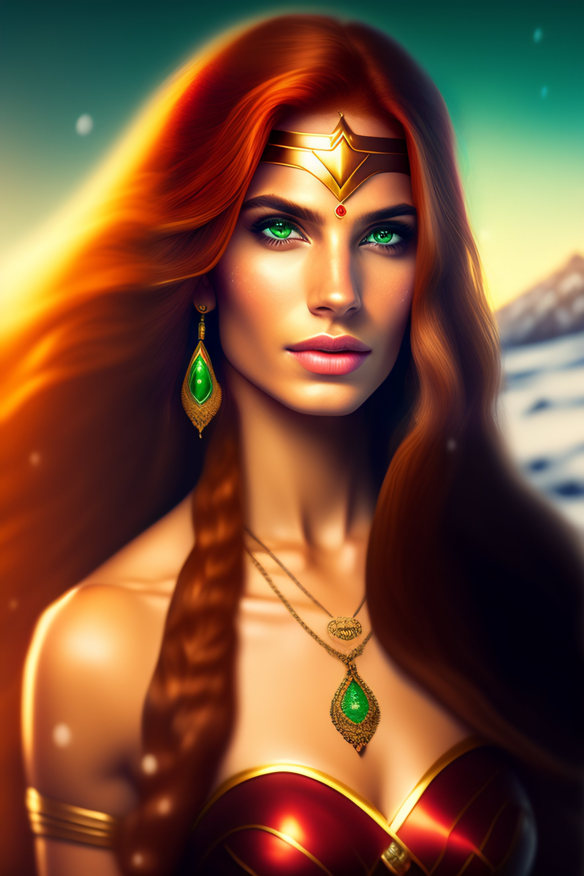 Long ginger hair, indian tanned man as wonder woman, green eyes, fang necklace, hair tied in a ponytail, soft lighting, night scene, anime style. 1boy, solo. girly, androgynous, adult. ambiguous face. winter clothe. snow.