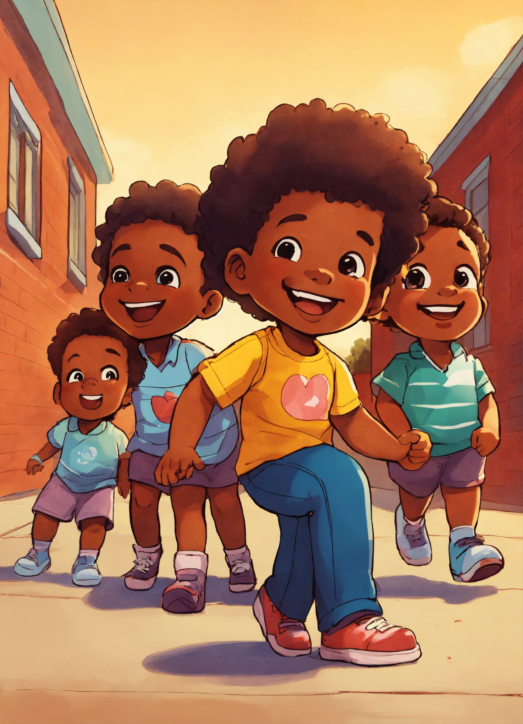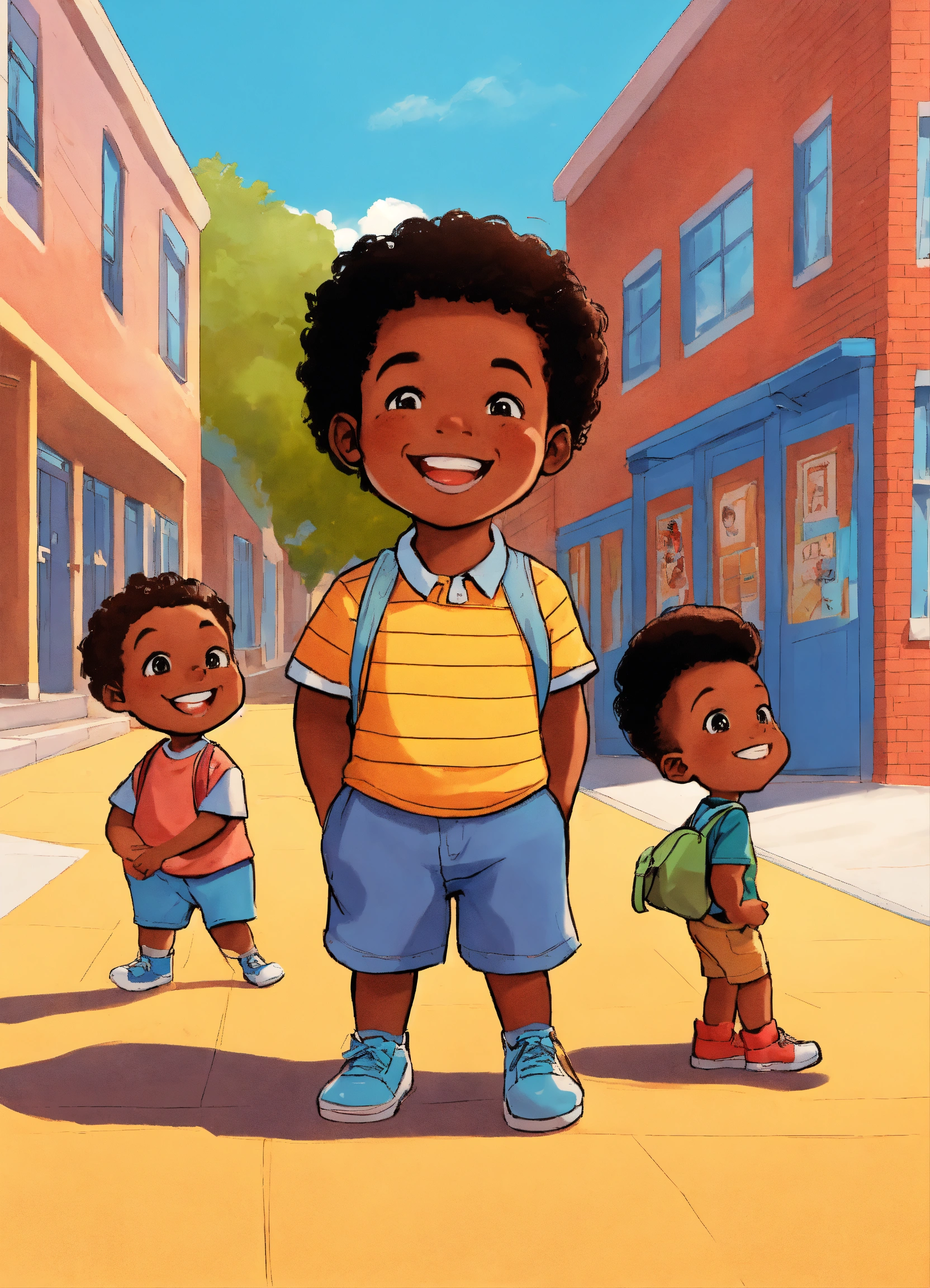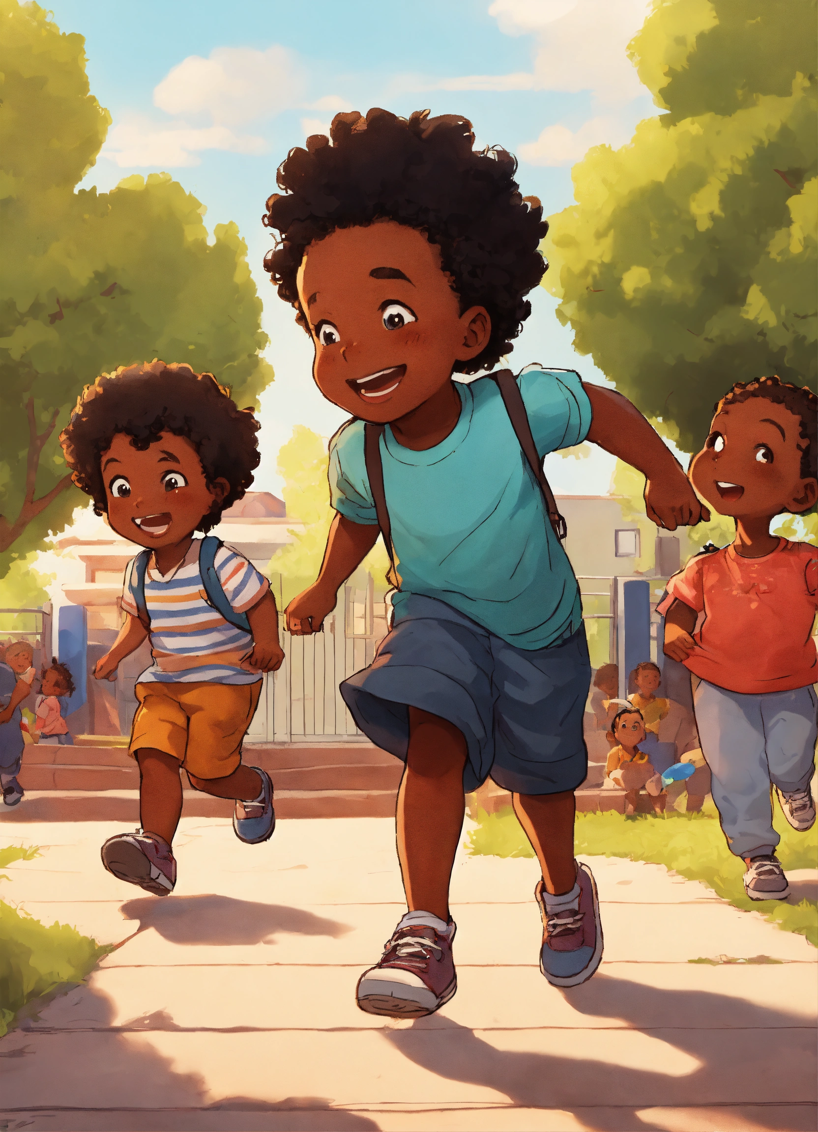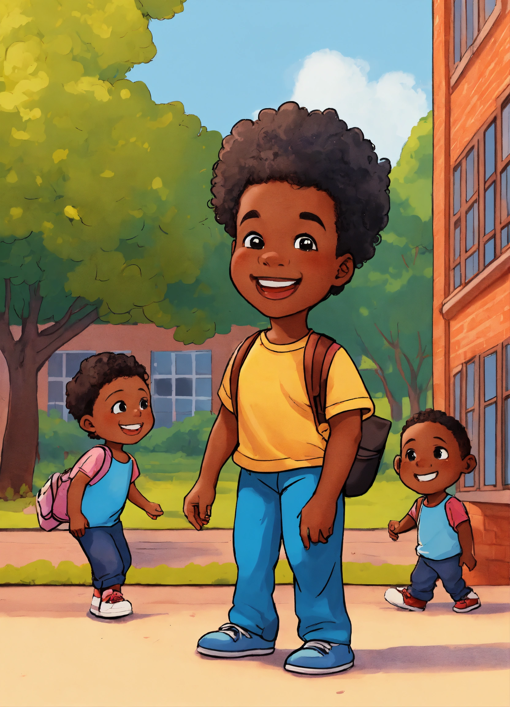 Cartoon, colorful, illustrate a black toddler boy playing outside with his friends at school. show black mom watching with a proud smile from a distance.