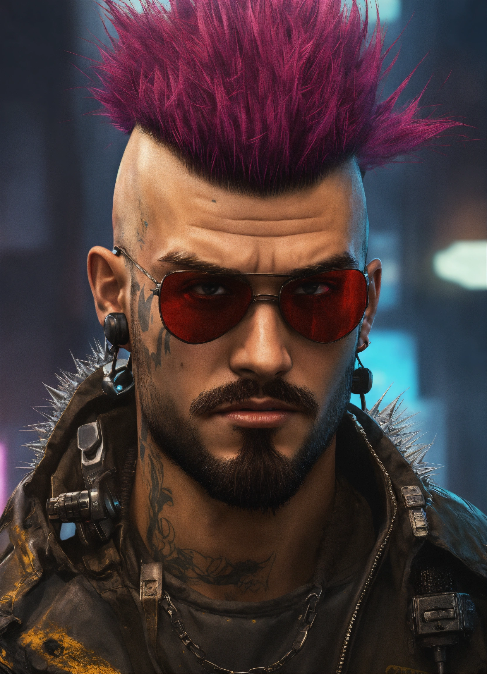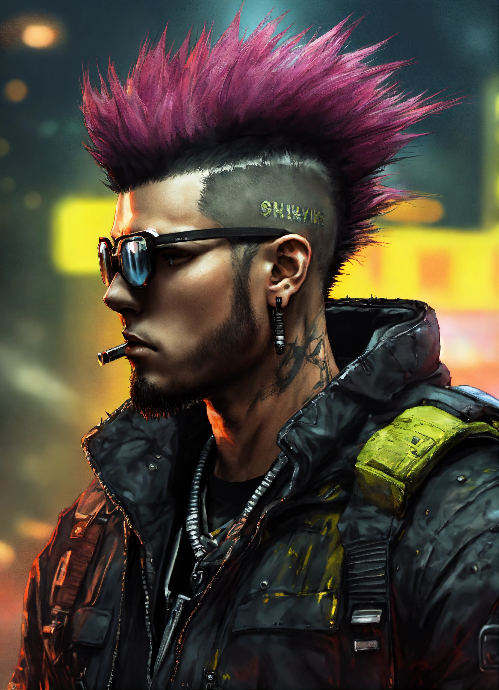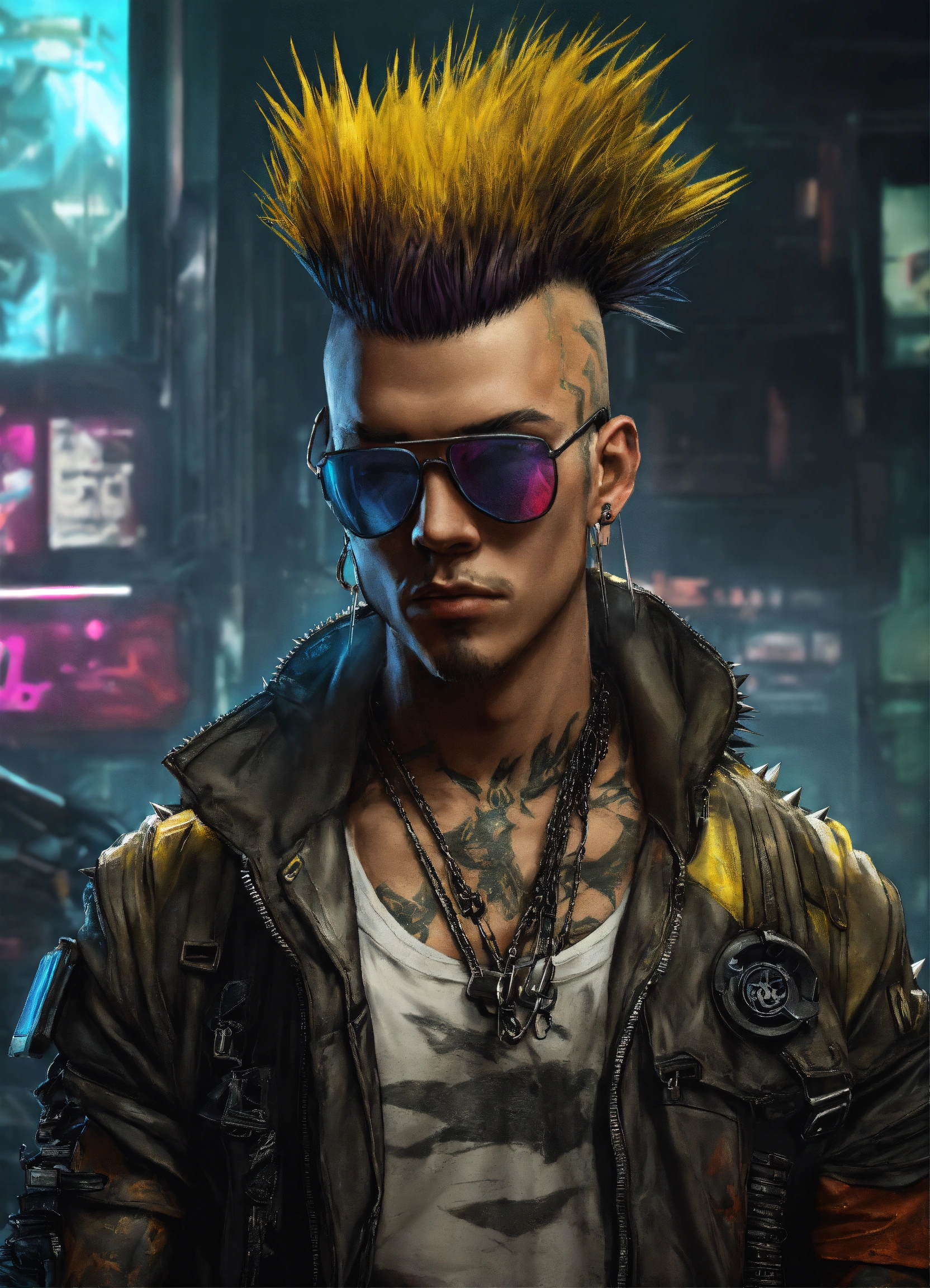Cyberpunk mean gang member with spikey mohawk hair wearhouse gritty realistic comic book style