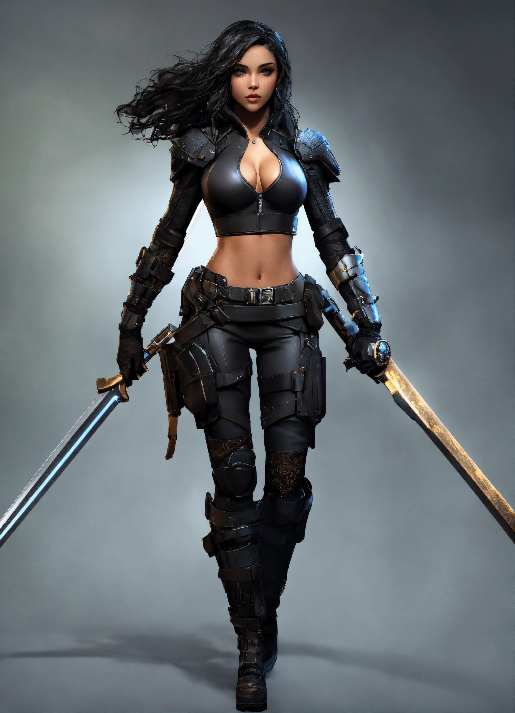 Full body of a beautilful, shapely dominican female assassin with long hair, perfect cruel face, most beautiful woman in the world, shapely hour-glass figure, a hero wearing a black stealth suit, fully covered, in gray background, full body, 8k resolution concept art portrait dynamic lighting hyperdetailed intricately detailed splash art trending on artstation unreal engine 5 volumetric lighting