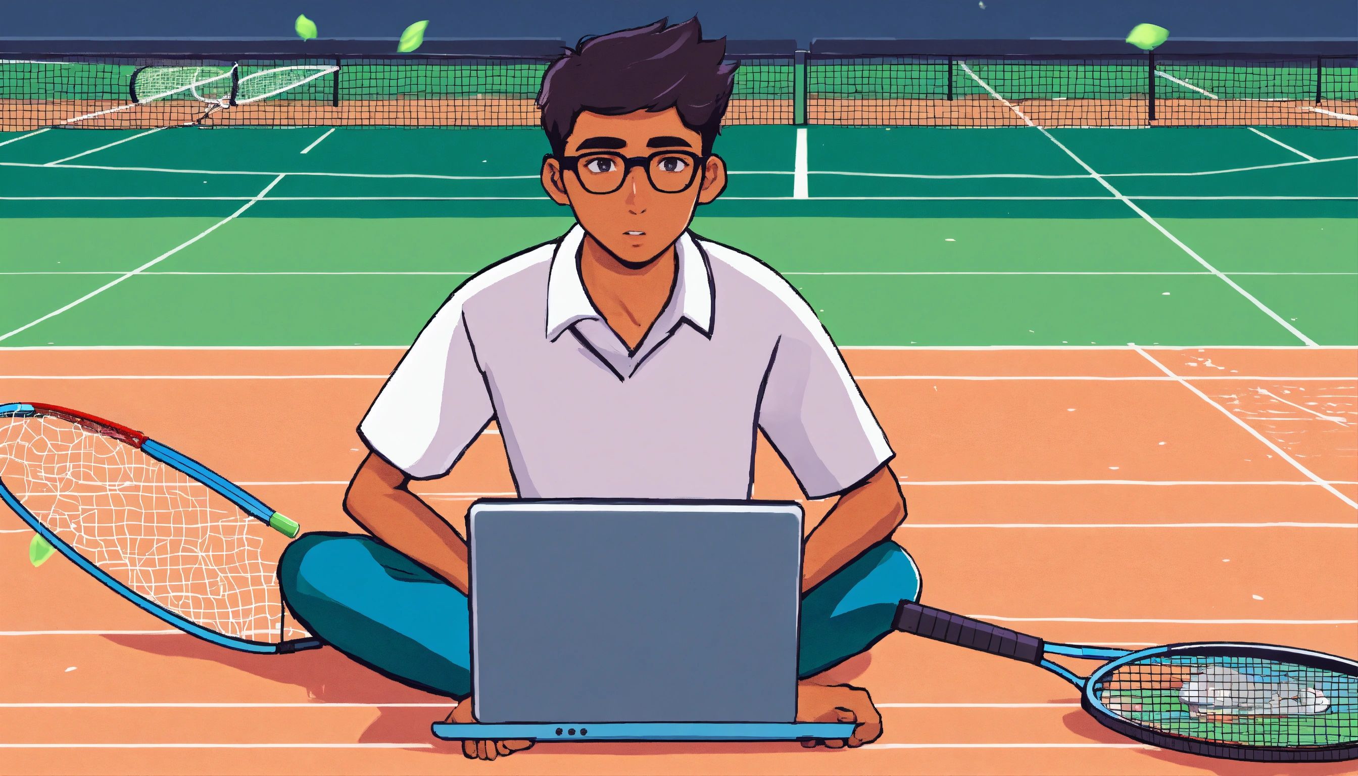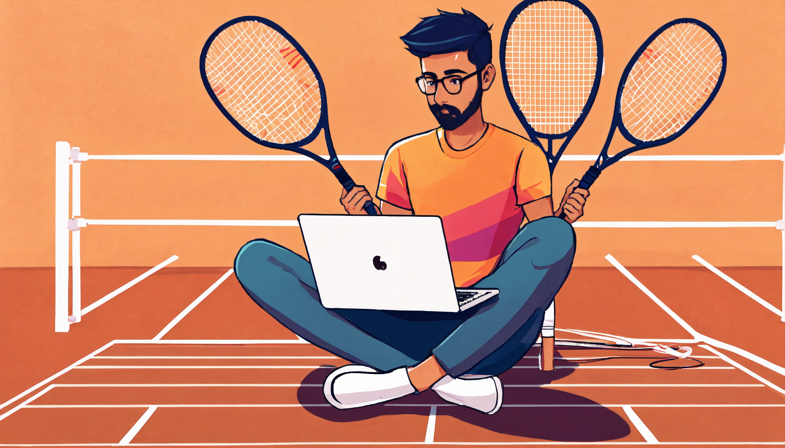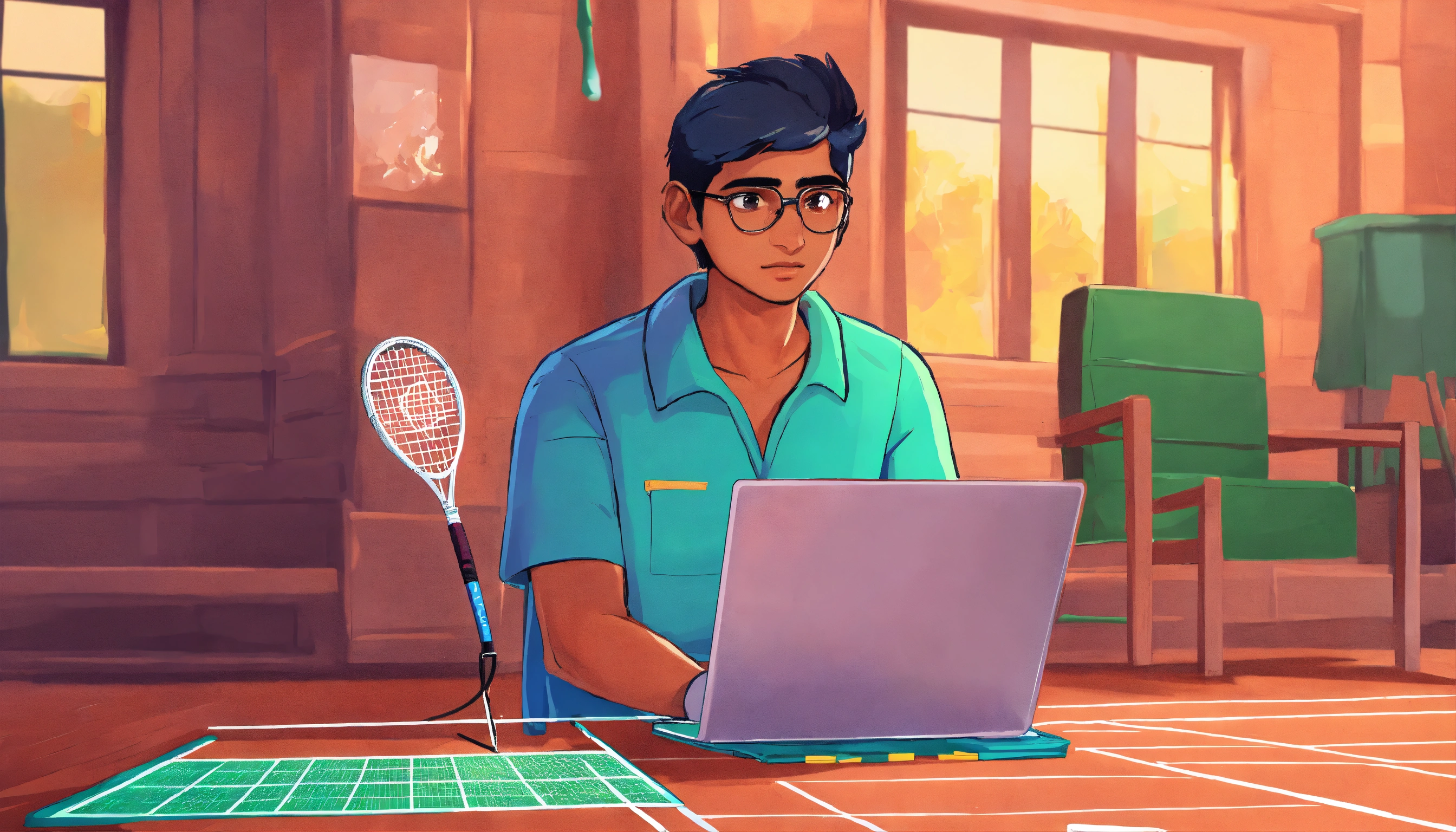 Young indian man coding on a laptop holding badminton racquet on a badminton court in the style of a cartoon