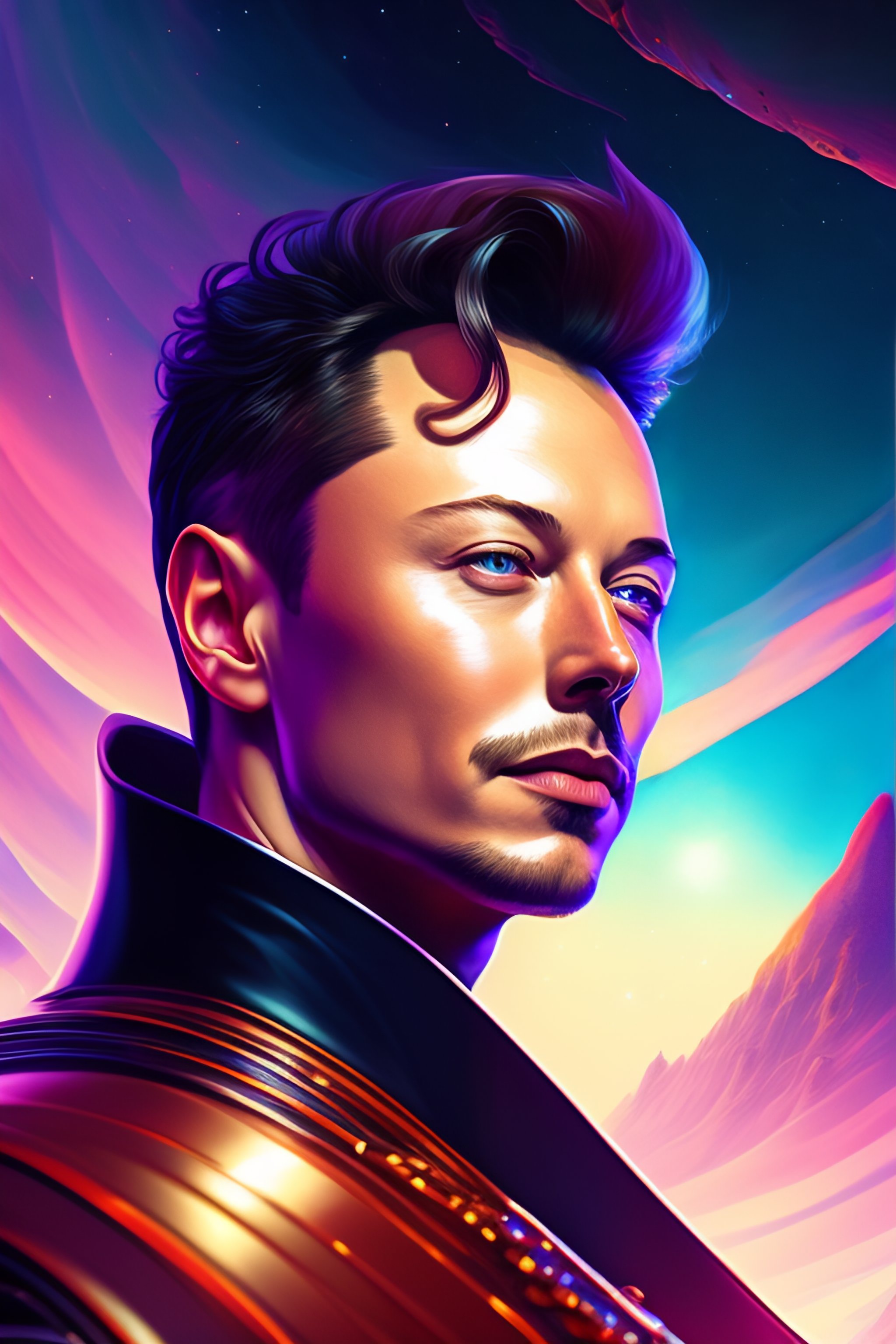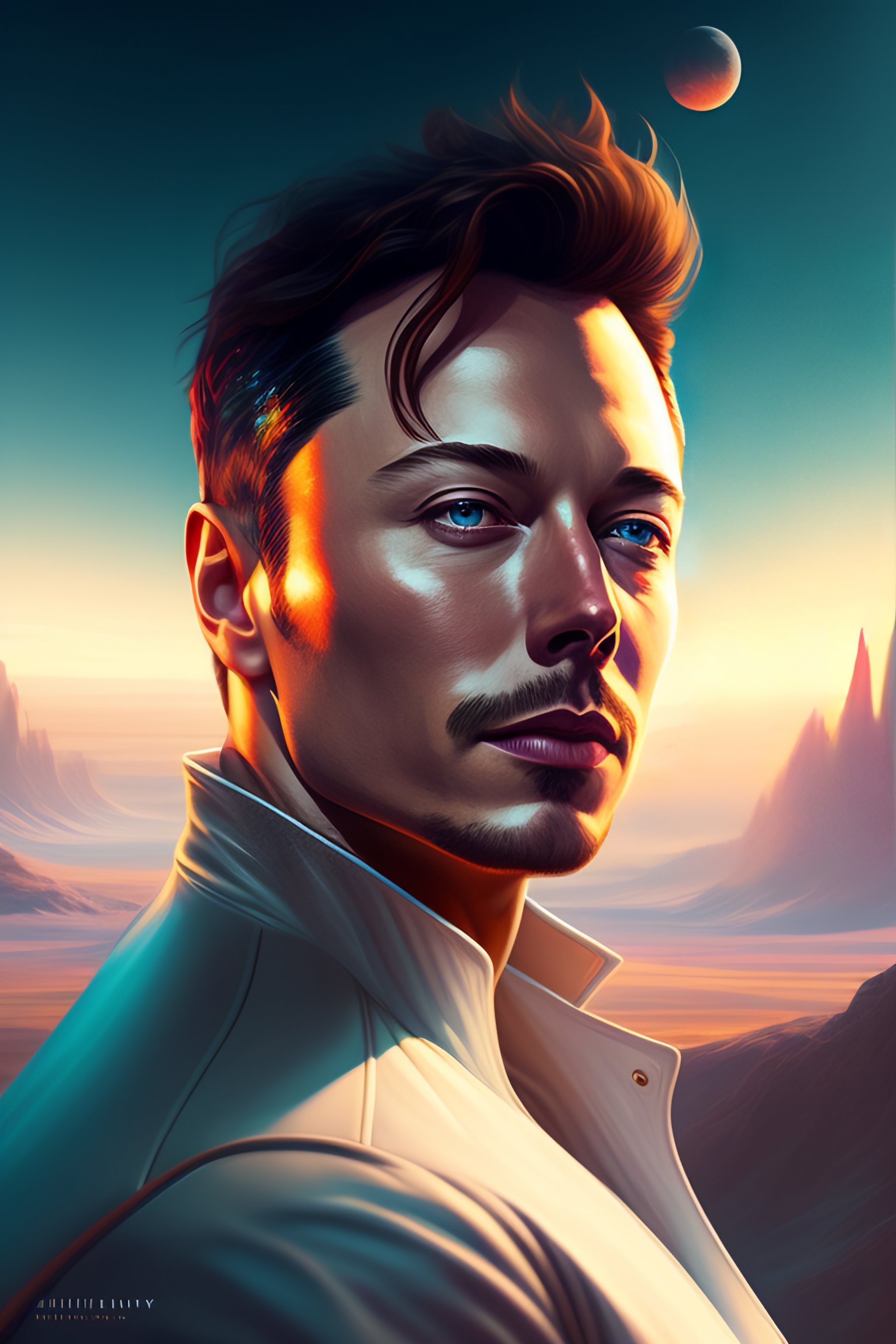 Portrait of elon musk in a desolate space colony, by anna dittmann and ilya kuvshinov, nikolay makovsky, fantasy, high detail, elegant, digital painting, wlop, natural light, vibrant, intricate, textured skin, highly detailed, artstation, sharp, focus, illustration, nikolay makovsky