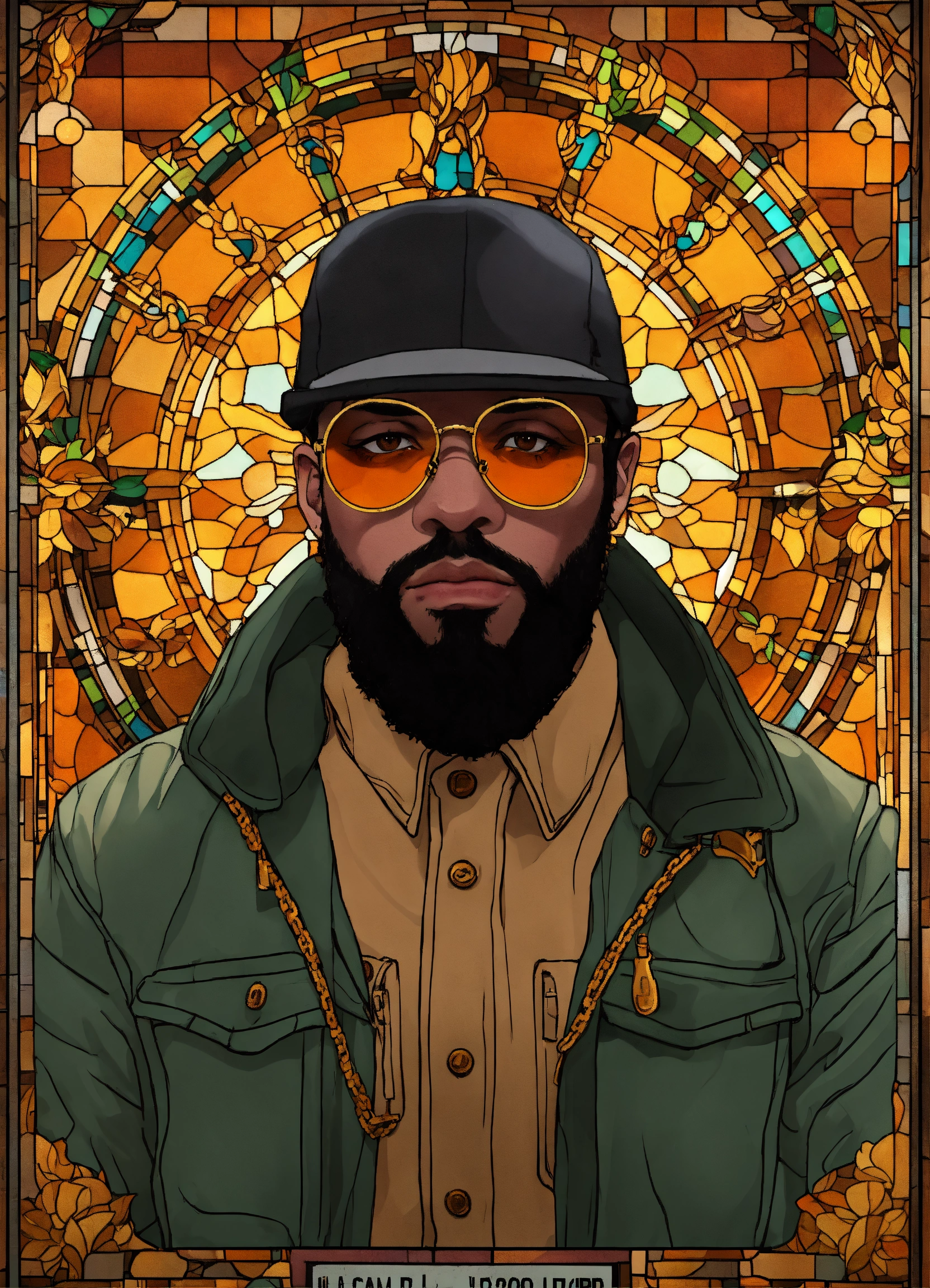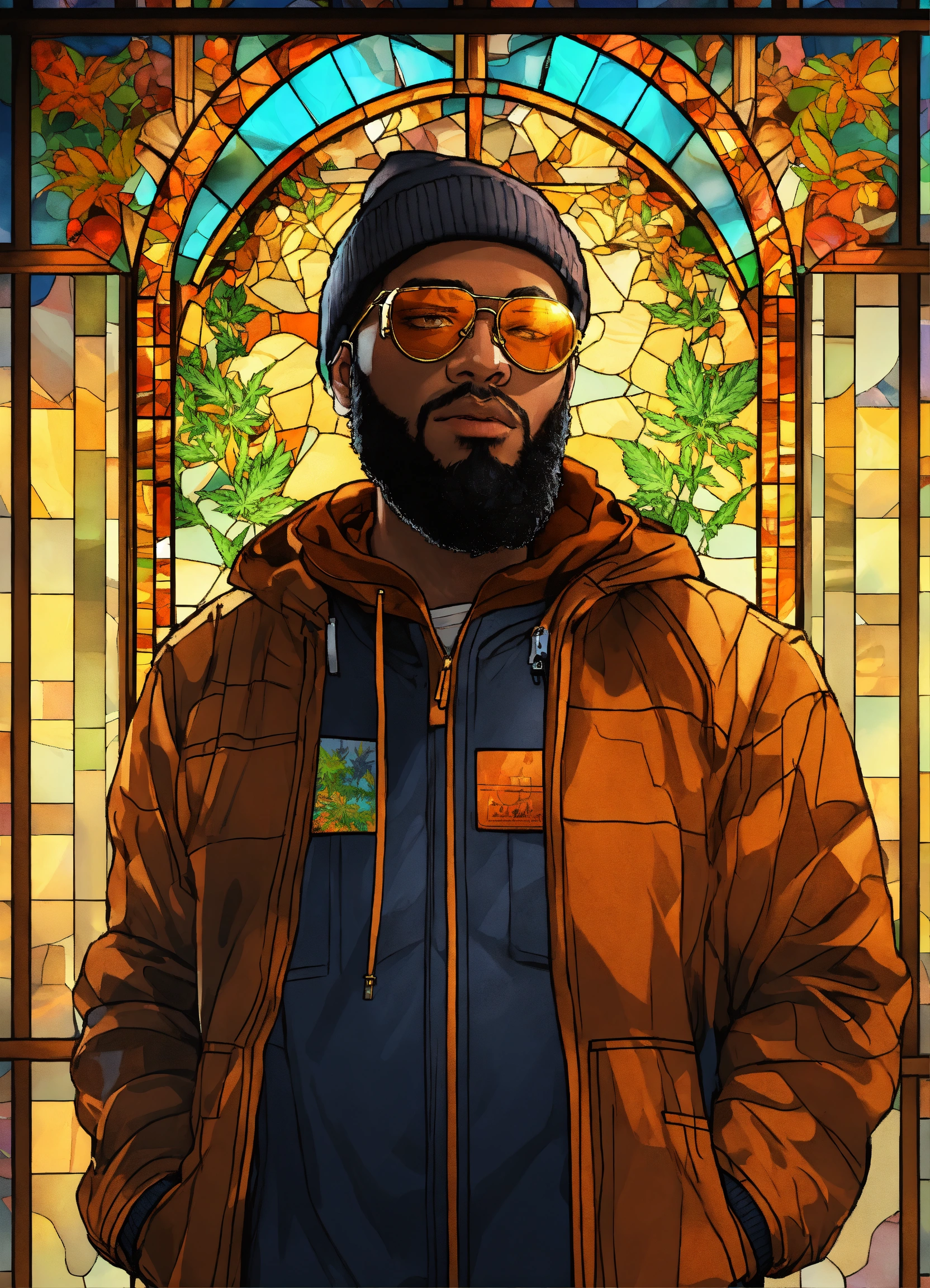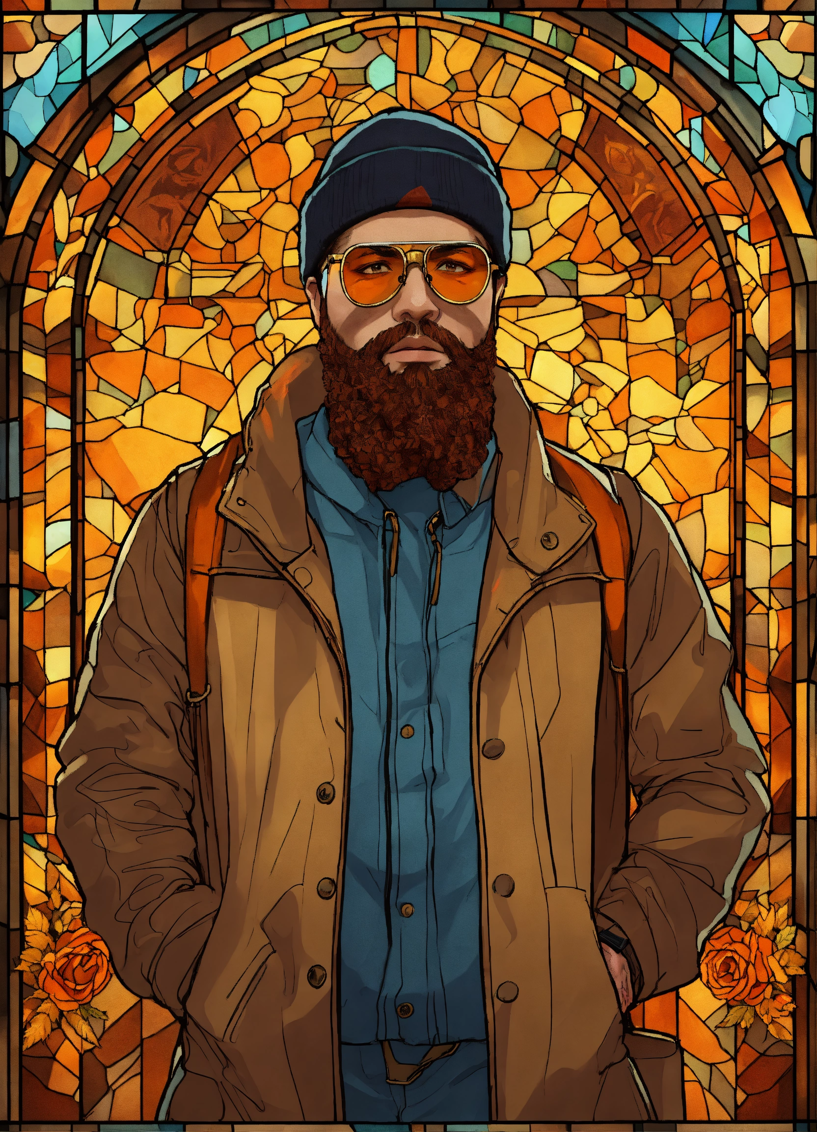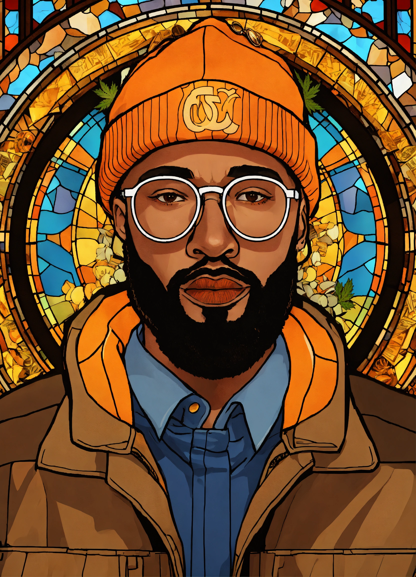 Hd, 4k, background is a stained glass with images in the stained glass of tap rapper type images (guns & bullets, cough syrup, cash, weed, etc), the rapper os a caucasian man with a short orange colored beard. black beanie on his head. gold framed glasses with clear lenses. light brown peacoat on.