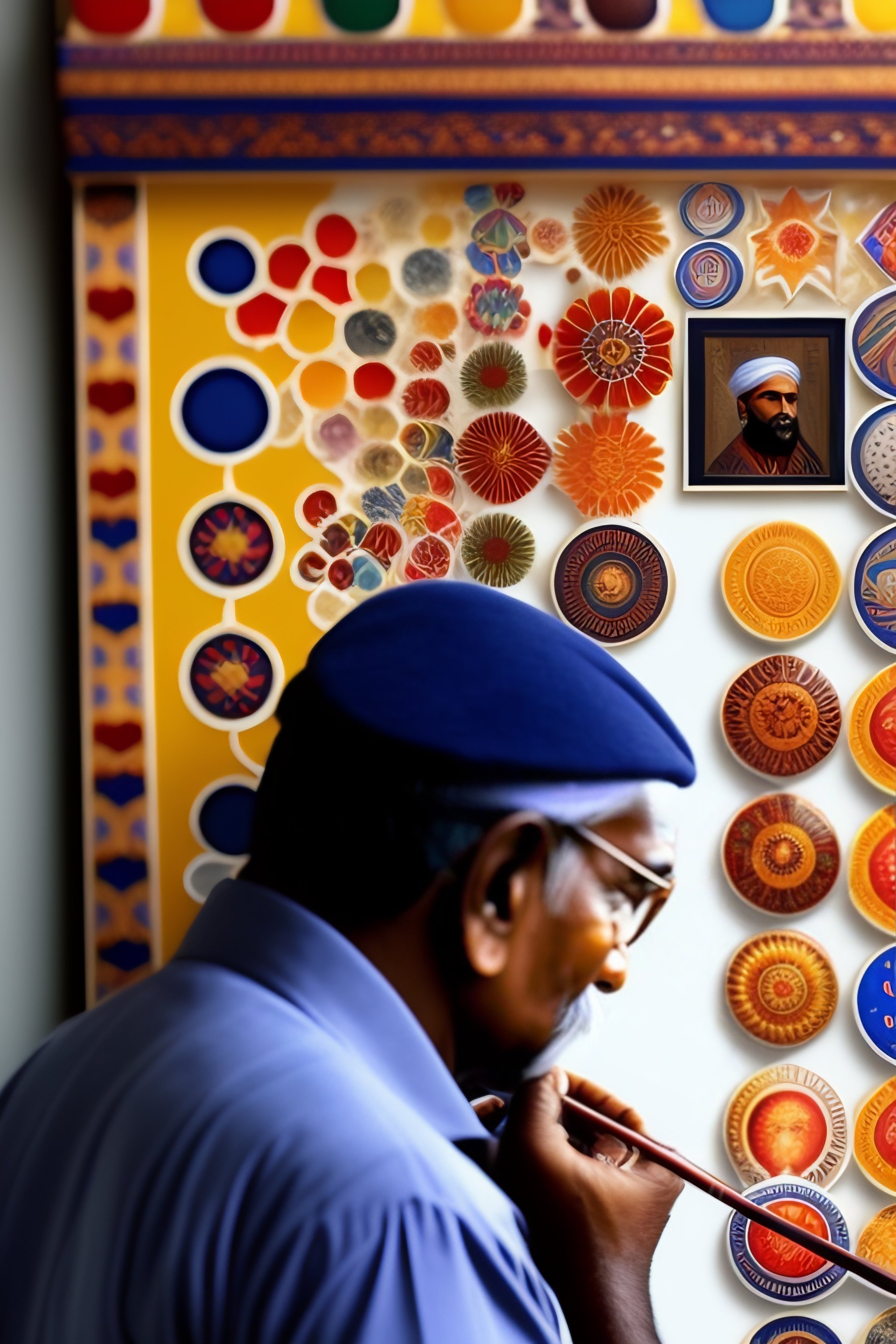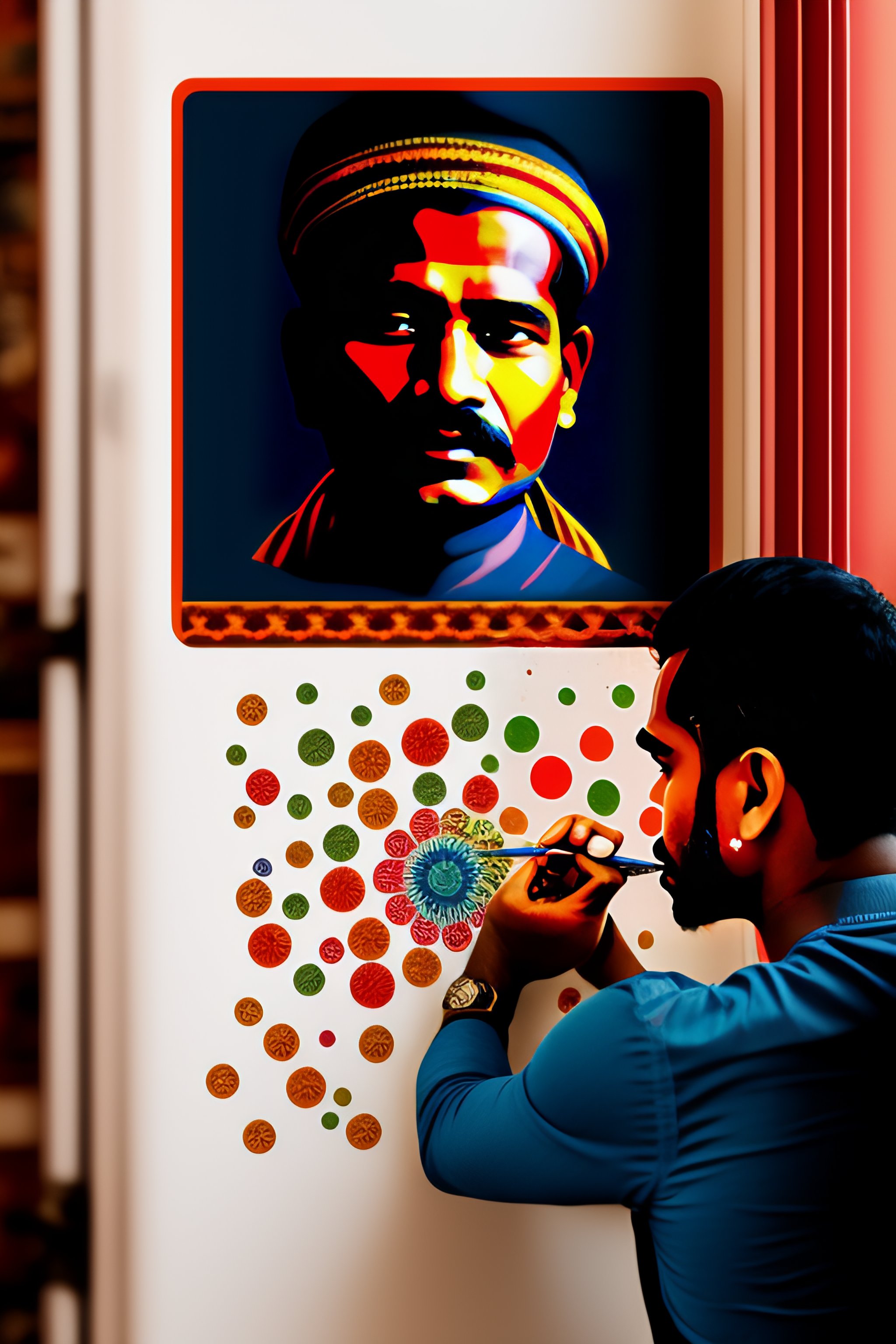 Indian man sticking artist collection stickers on the wall