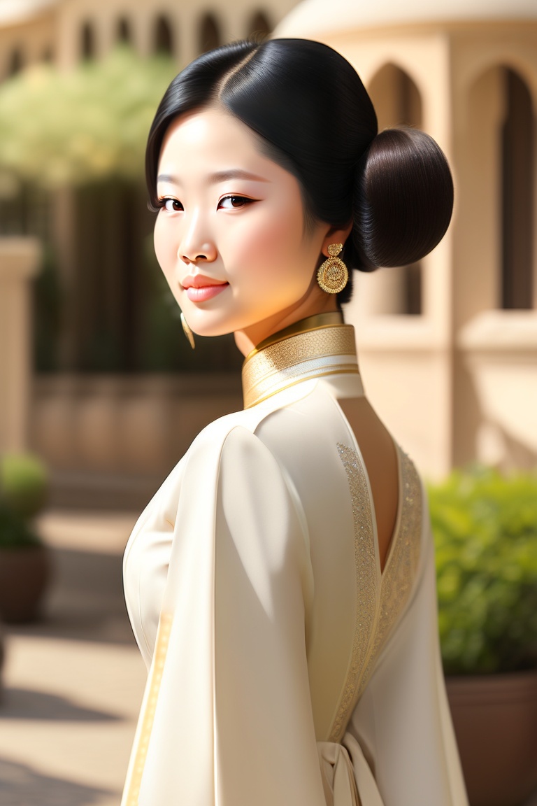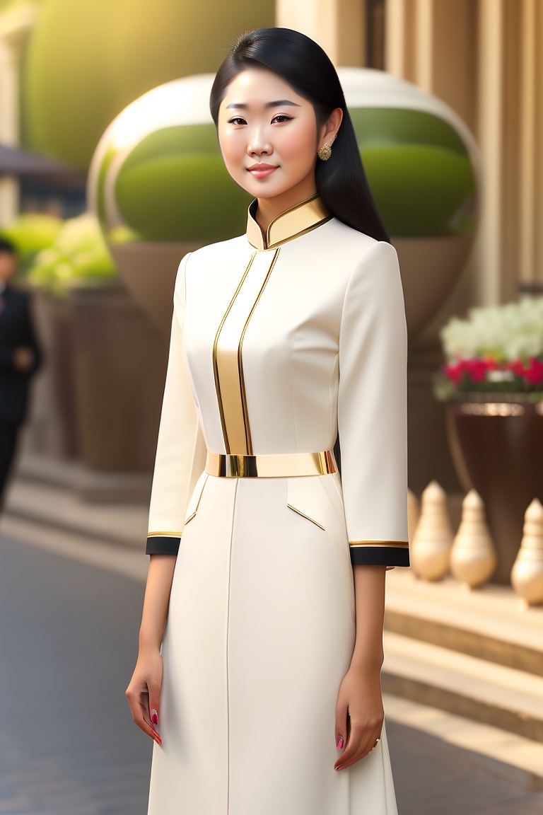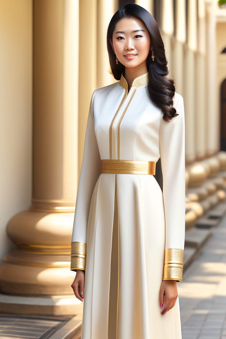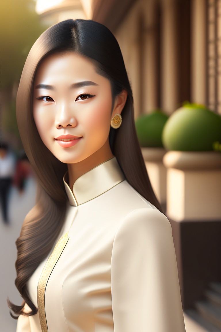 Full body portrait of a half afghan half vietnamese young woman, with straight black hair, looking at the center of the screen, white cream ao dai, cream beige and white color, a slight smile, symmetrical and diffused natural sunlight, spring lights, sharp focus and very detailed, 4k resolution, hanoi city background, photorealistic