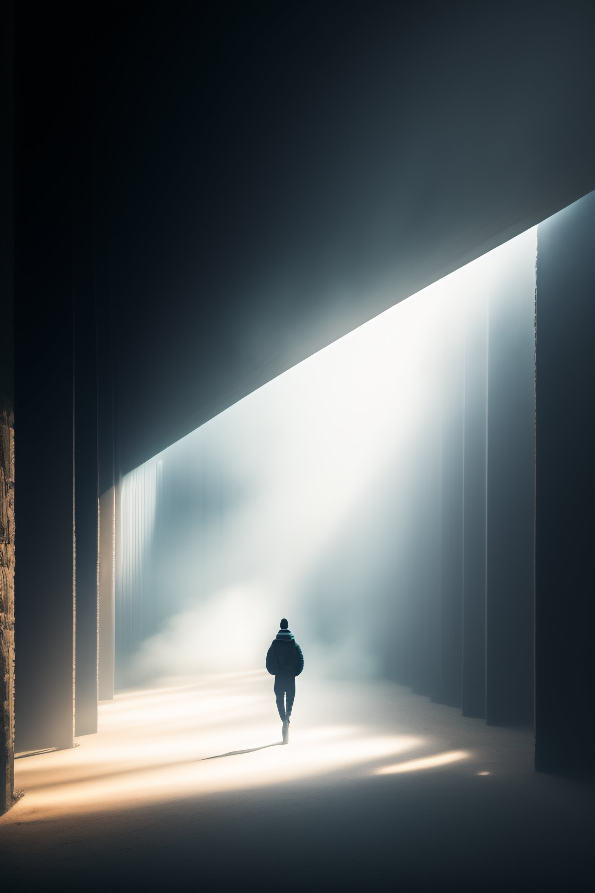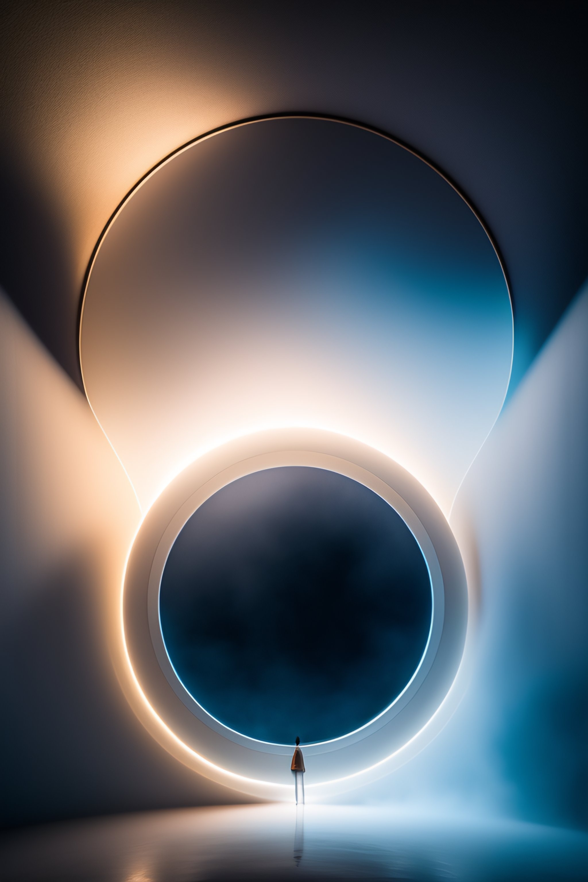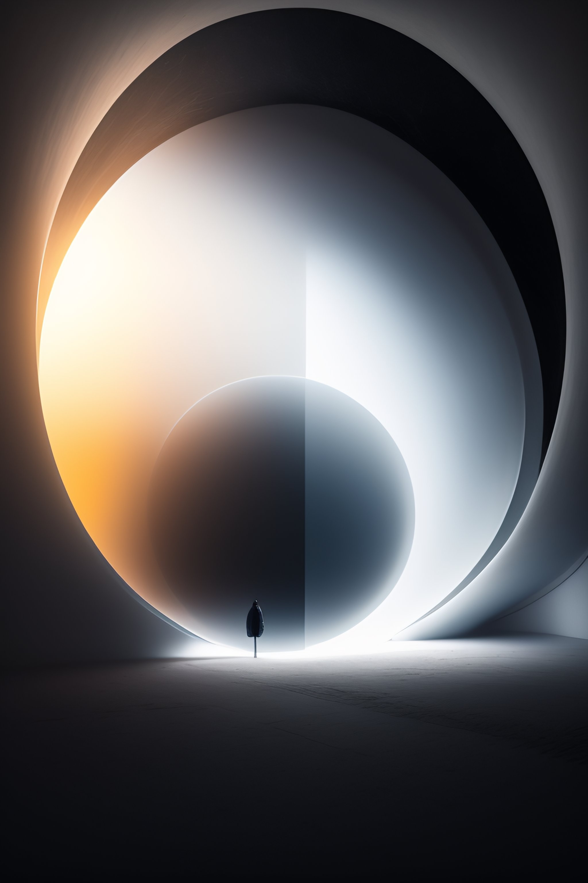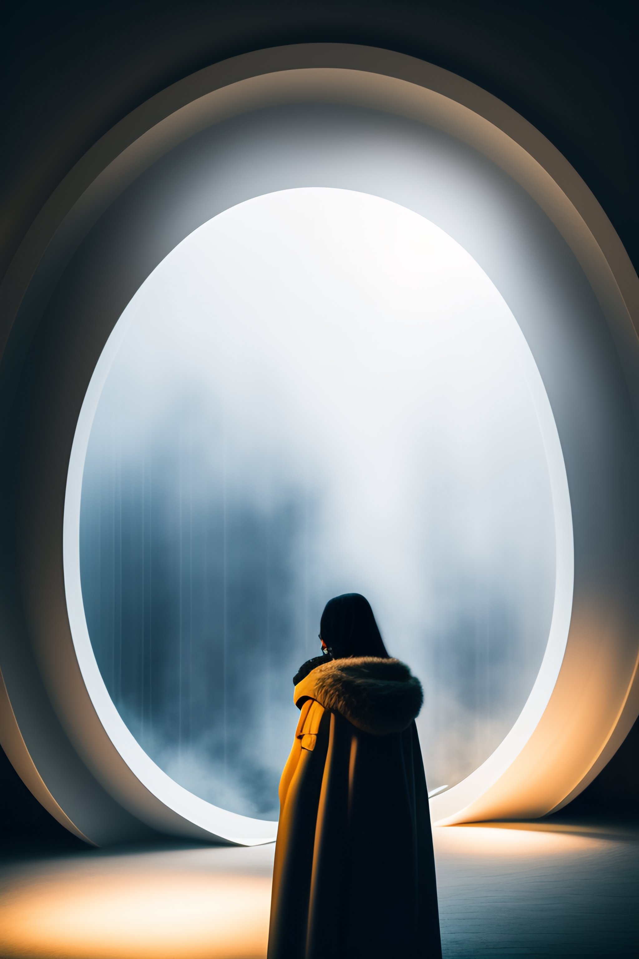 Human inside the white foggy circle cocoons, nostalgic lighting, in a huge space, with dark colors, unrealistic